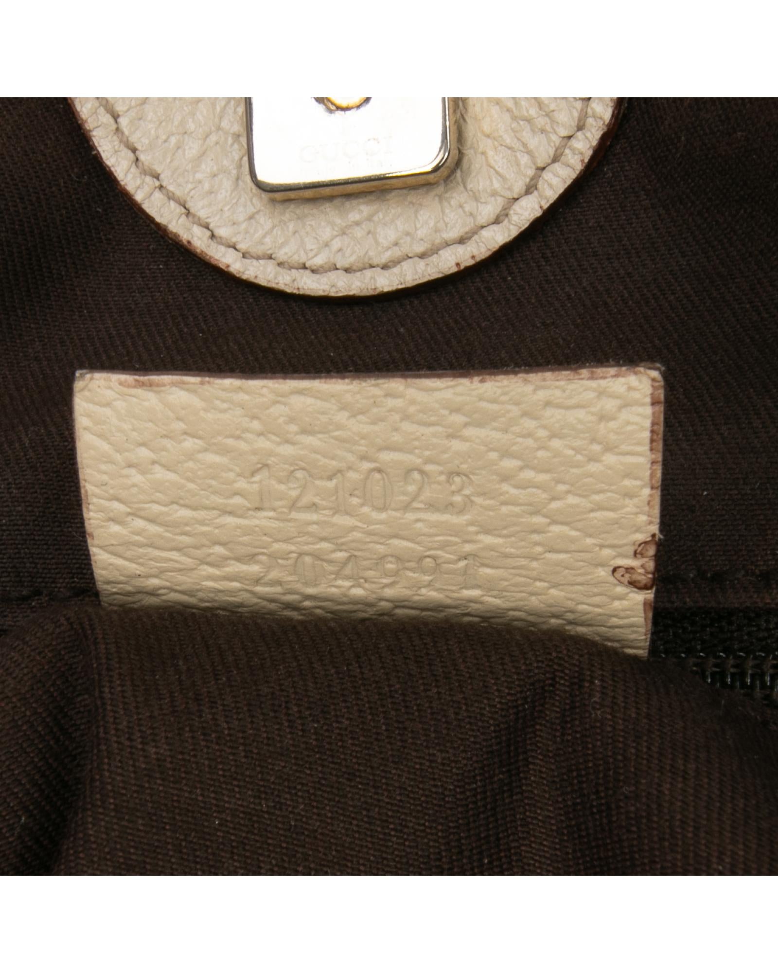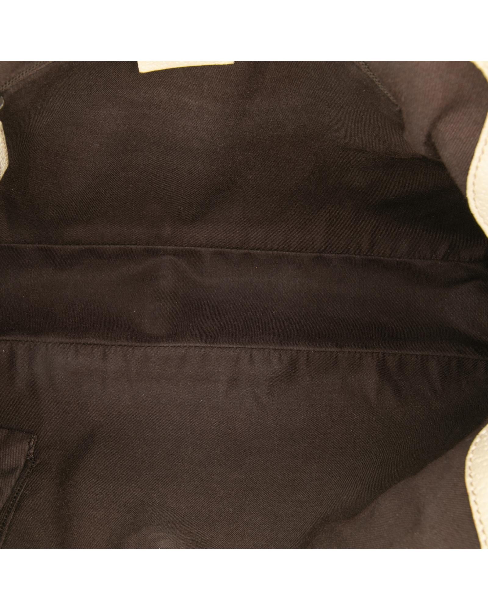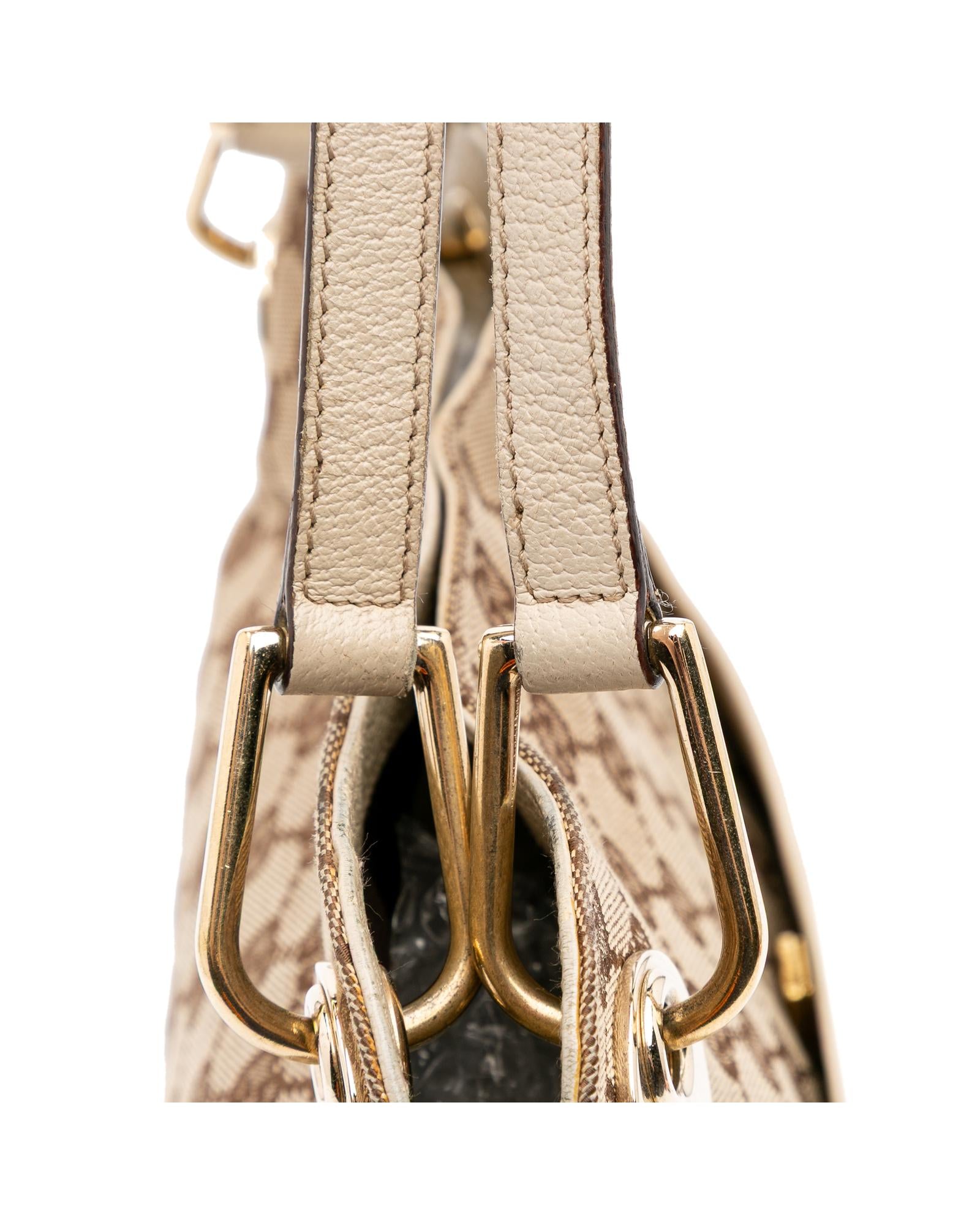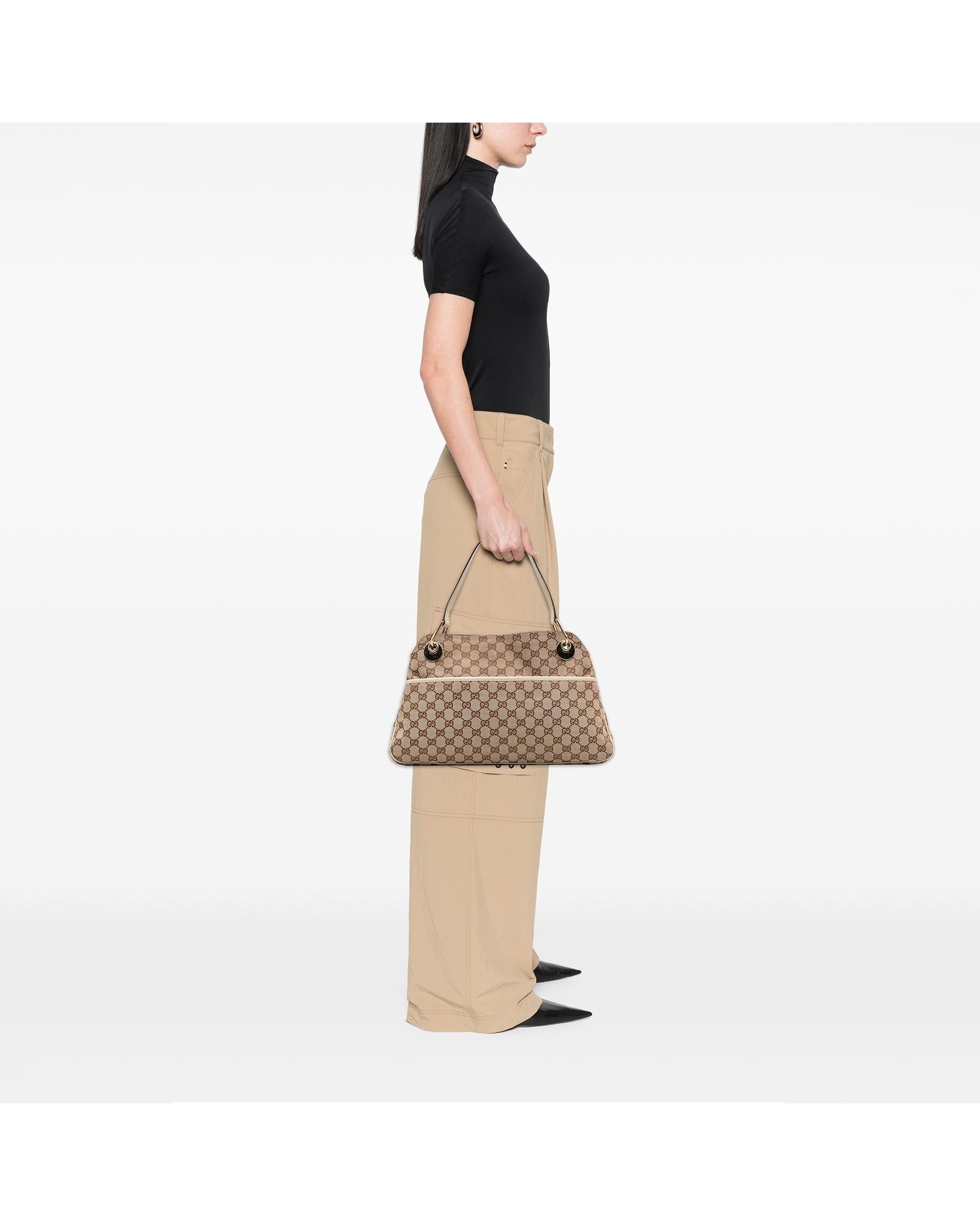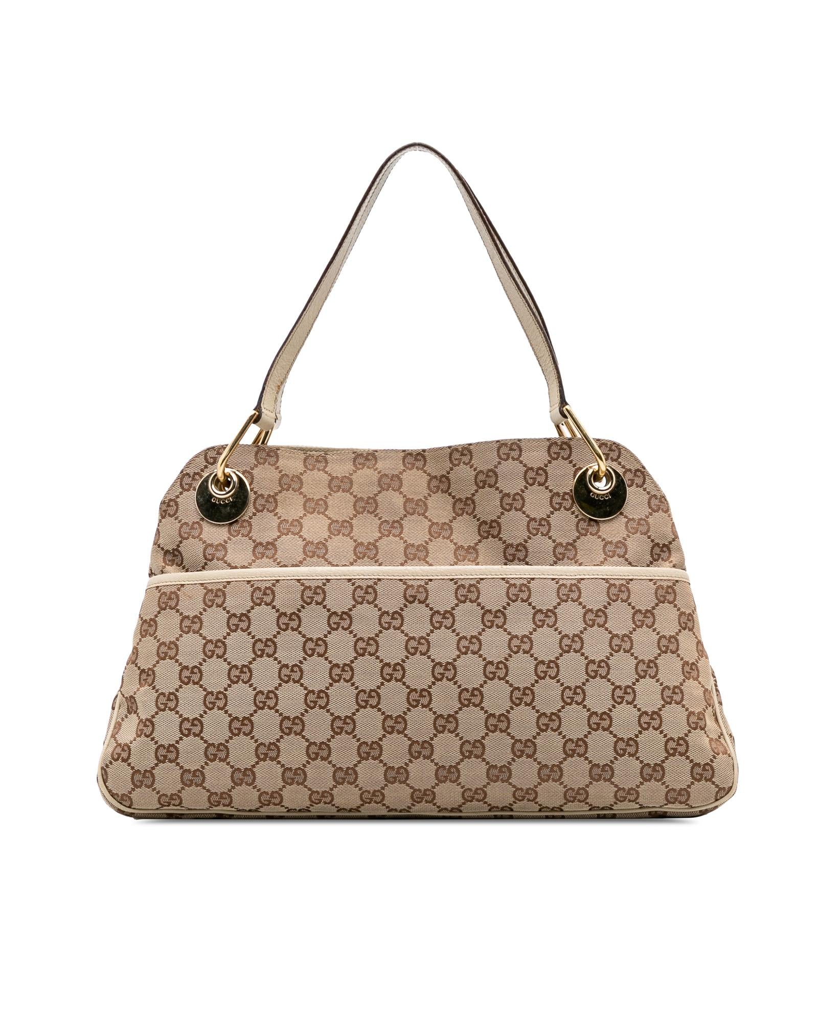 This shoulder bag features a canvas body with leather trim flat leather straps an open top with a magnetic closure an exterior front slip pocket and interior zip and slip pockets.Brand: Gucci Vintage