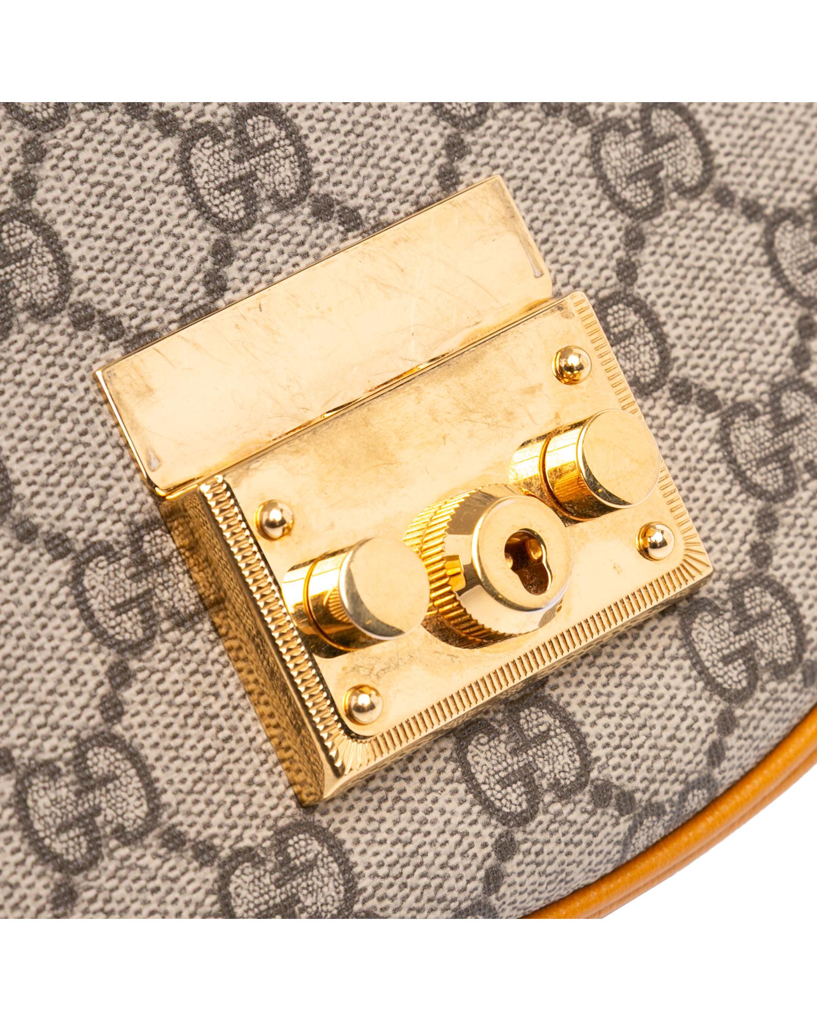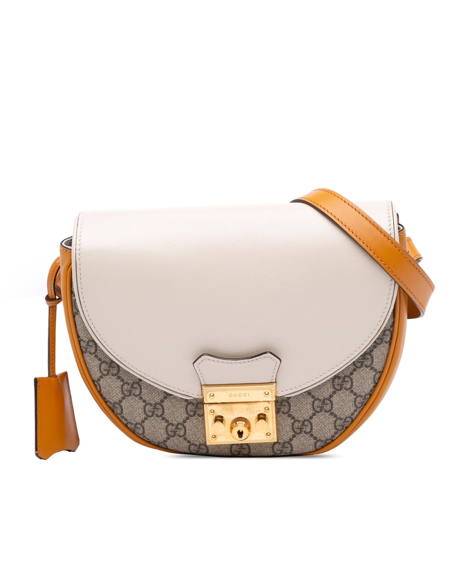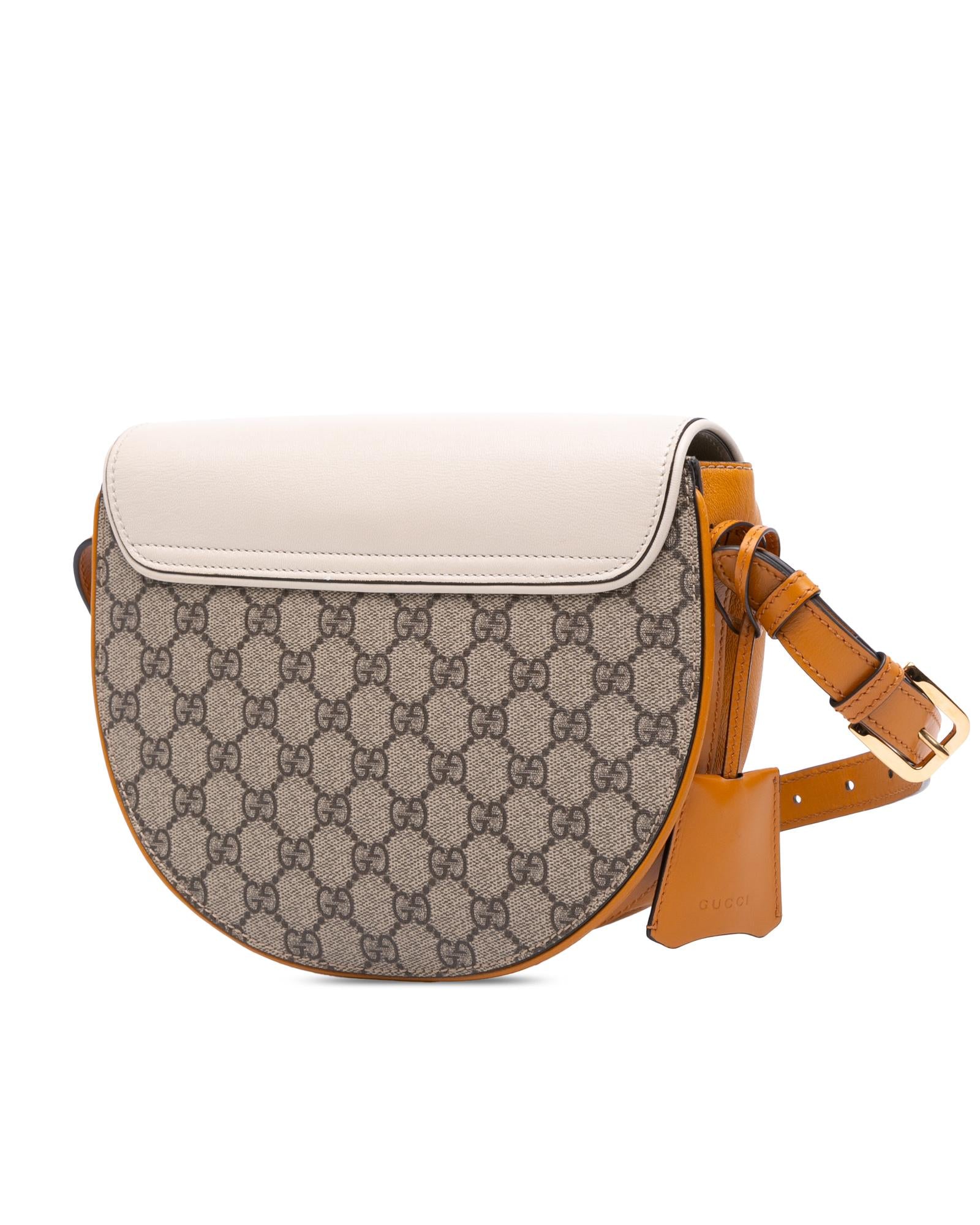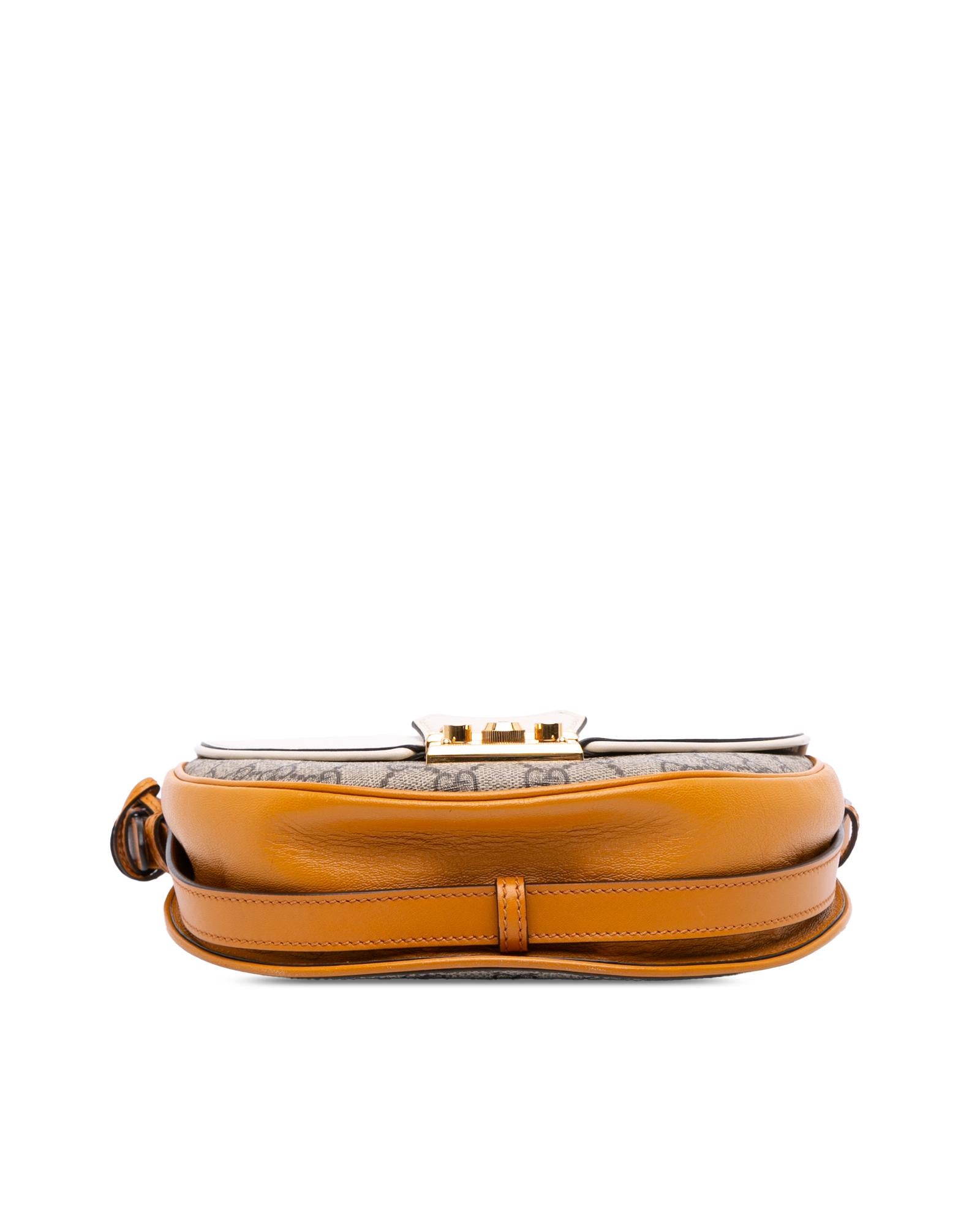 This crossbody bag features a coated canvas body with leather trim a flat shoulder strap a leather flap with push lock closure and interior zip and slip pockets.Brand: Gucci Vintage