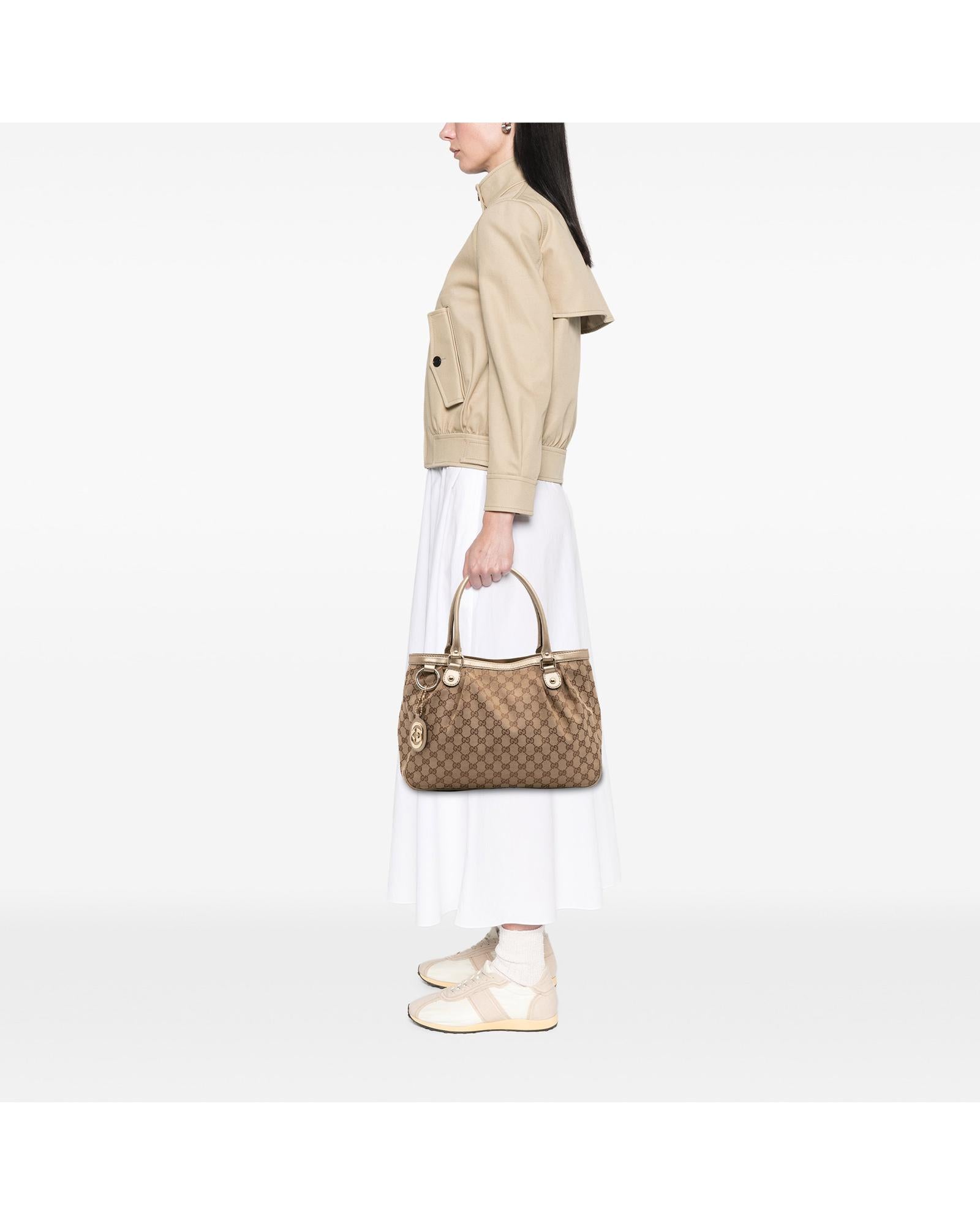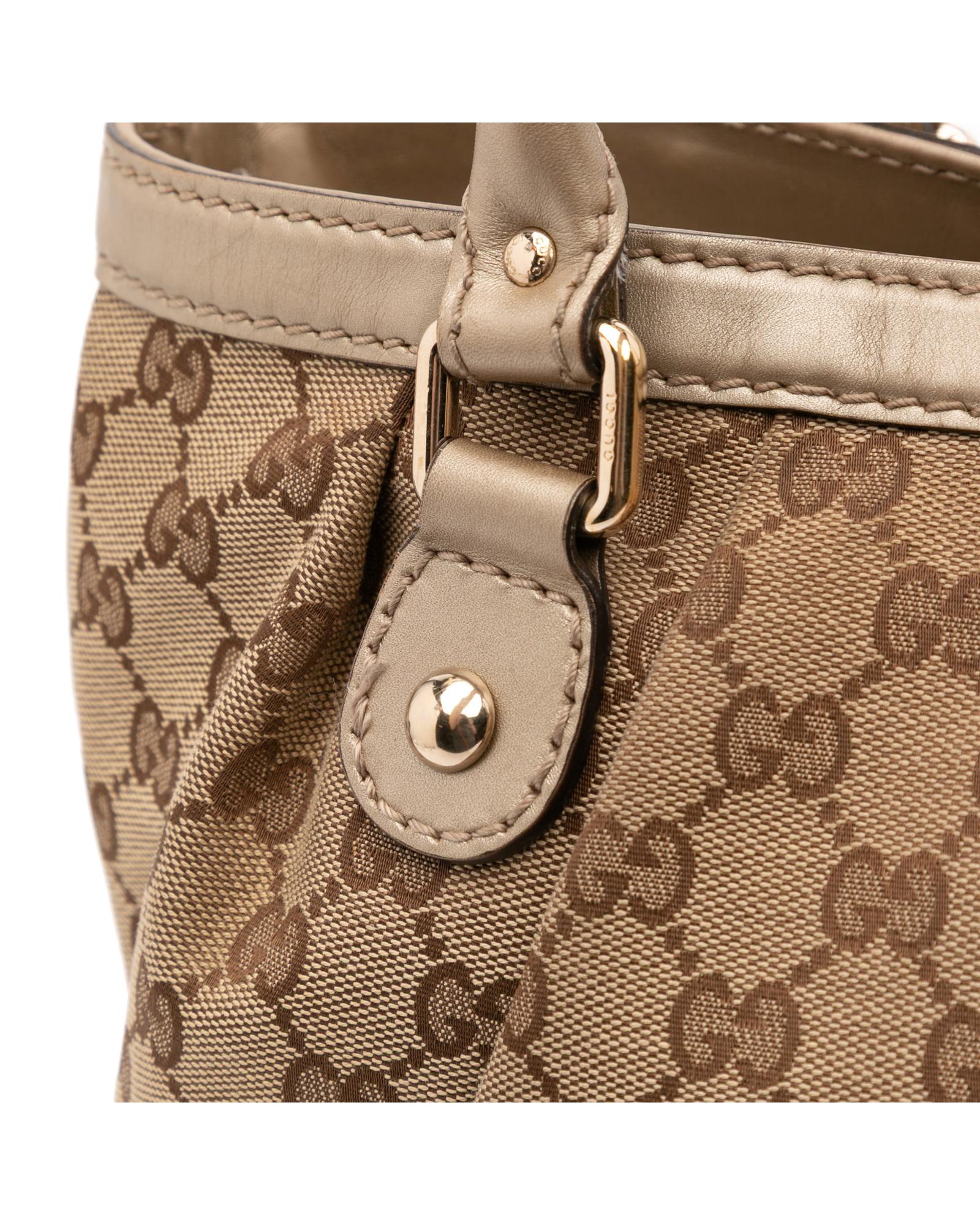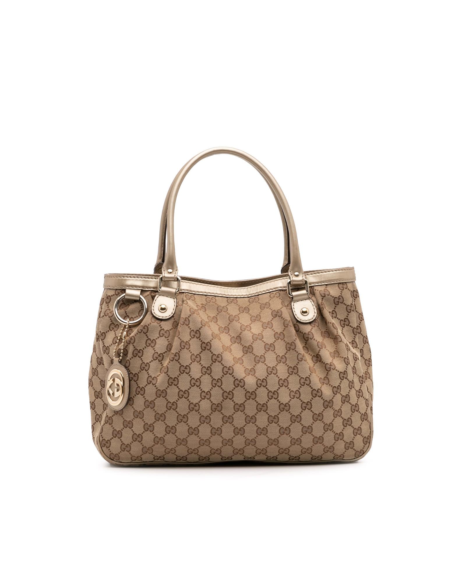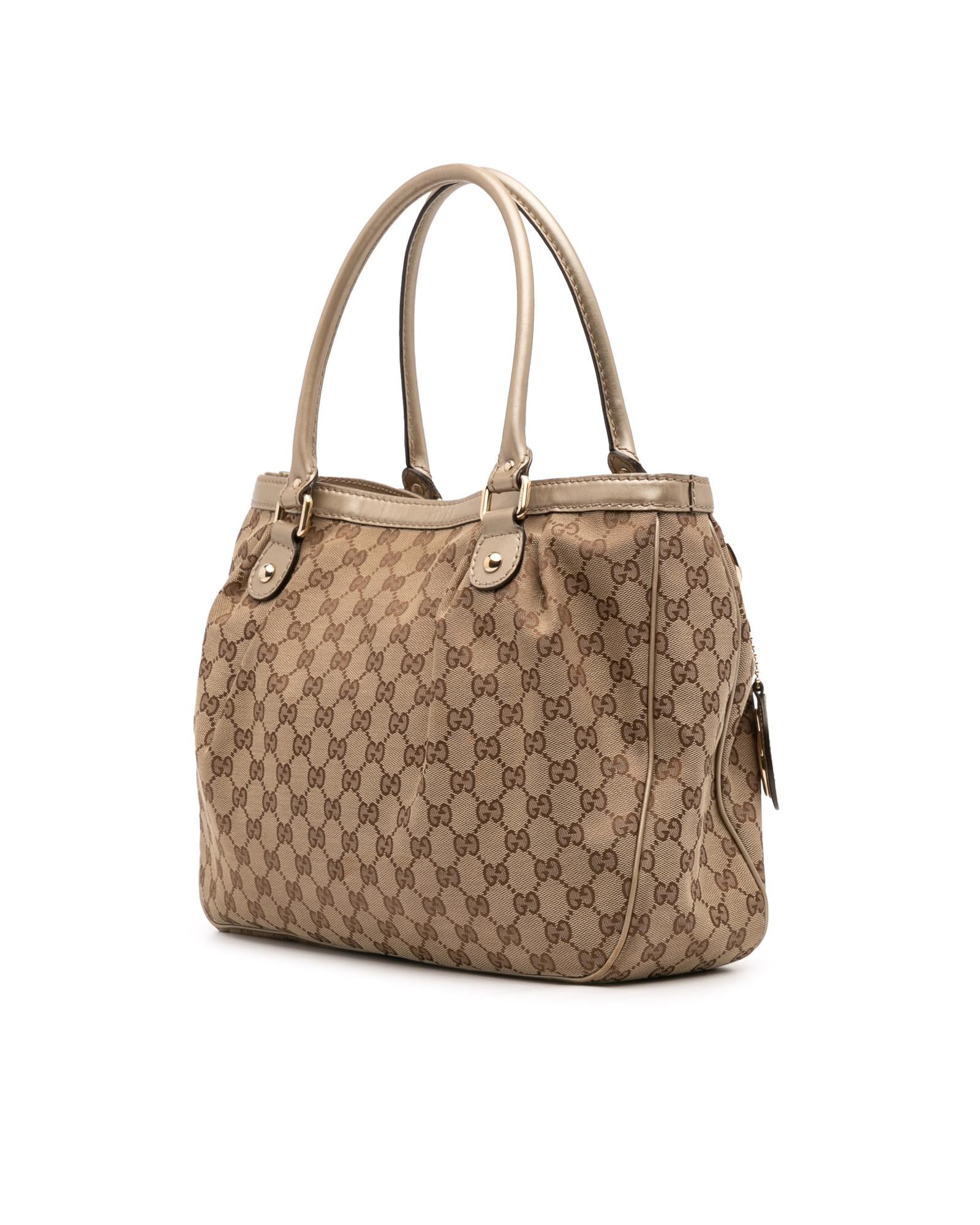 The Sukey tote bag features a canvas body with leather trim rolled leather handles an open top with magnetic snap button closure an interior zip compartment and interior zip and slip pockets.Brand: Gucci Vintage
