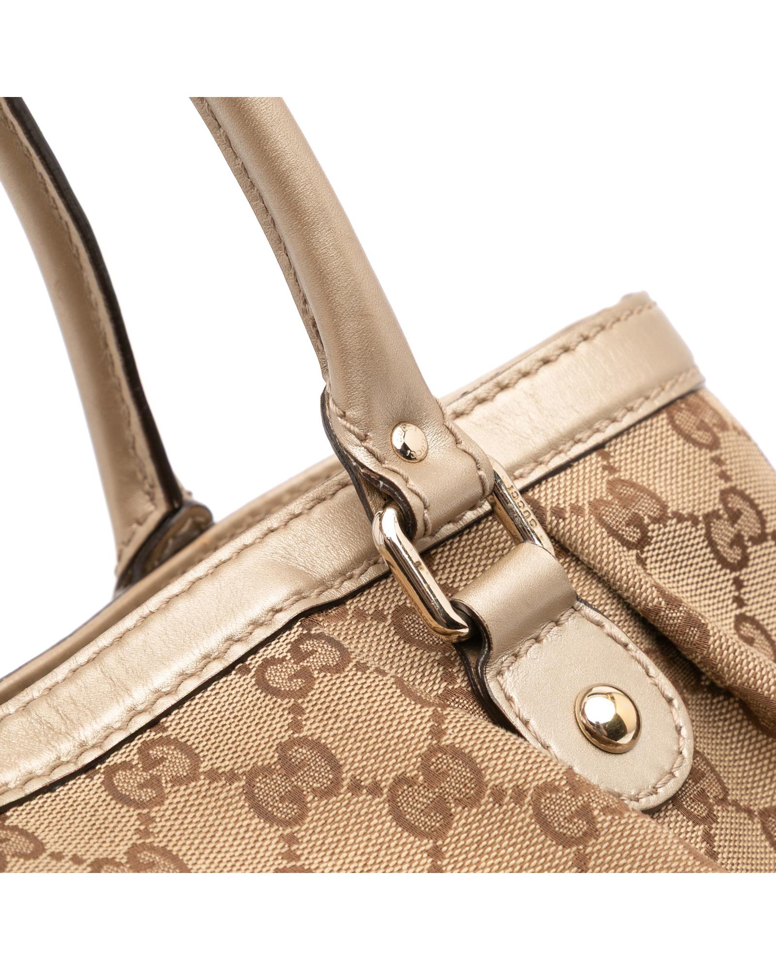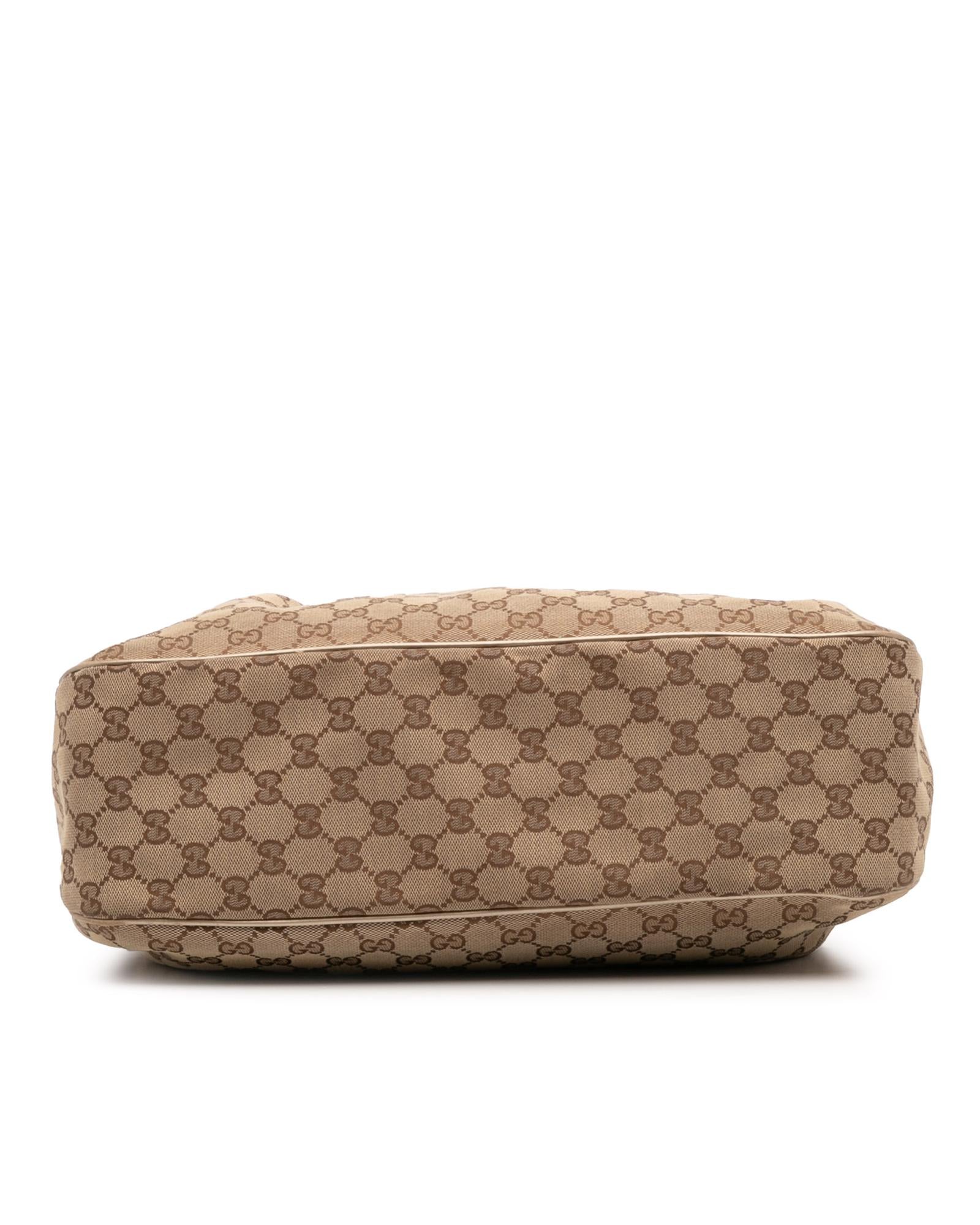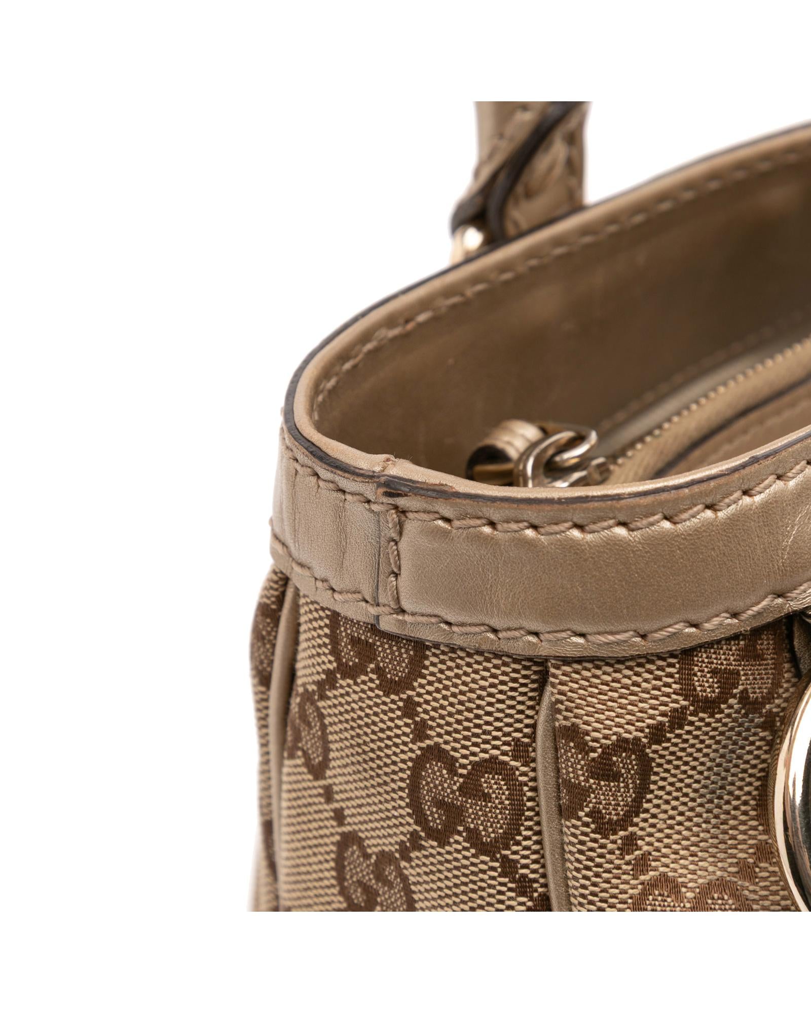 The Sukey tote bag features a canvas body with leather trim rolled leather handles an open top with magnetic snap button closure an interior zip compartment and interior zip and slip pockets.Brand: Gucci Vintage