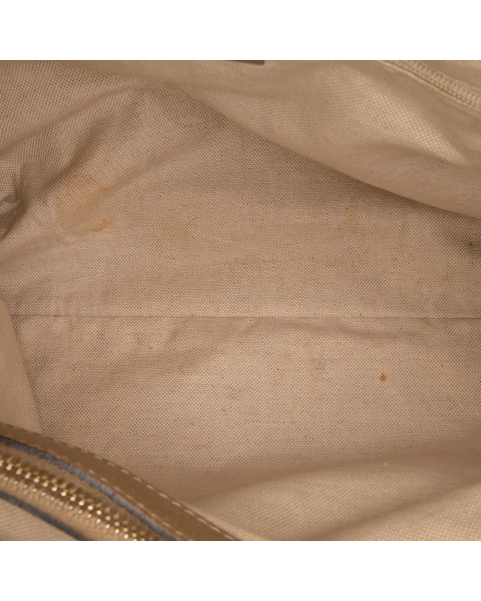 Exterior Back stained with Other. Exterior Corners Worn. Embellishment Scratched. Exterior Front stained with Transfer Of Color. Exterior Handle Cracked Split Worn. Interior Pocket stained with Other. Interior Lining Split. Interior Lining stained with Other. Practical Attachment Scratched. Exterior Top Worn. Zipper Scratched.