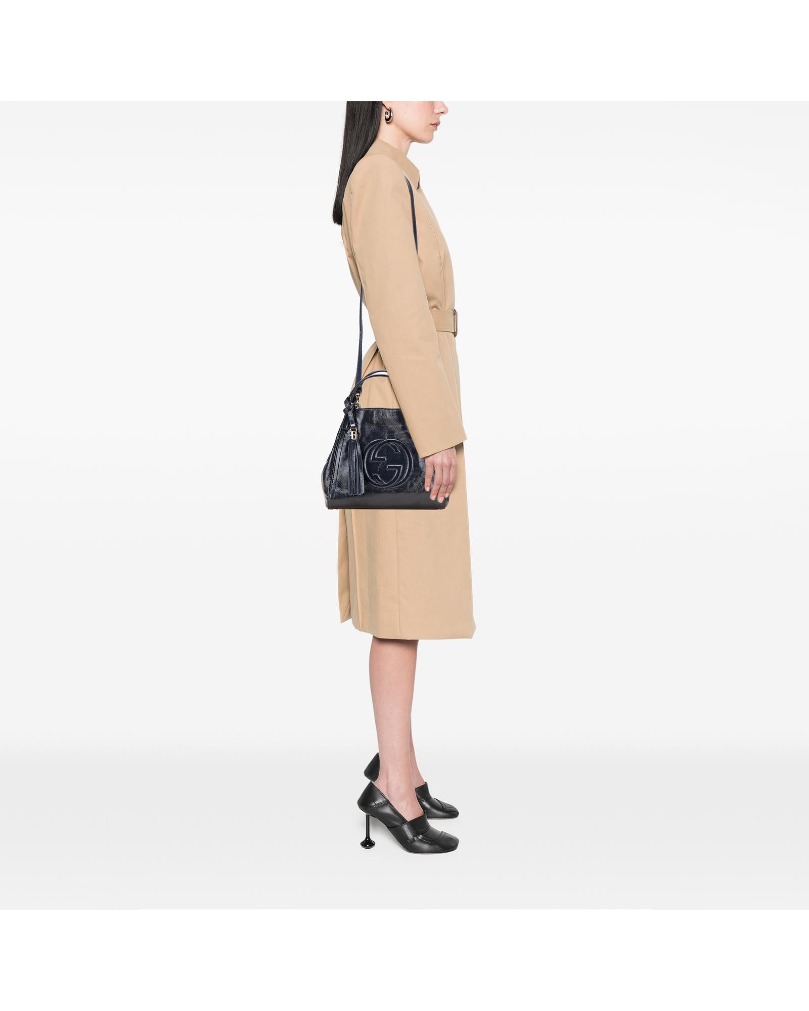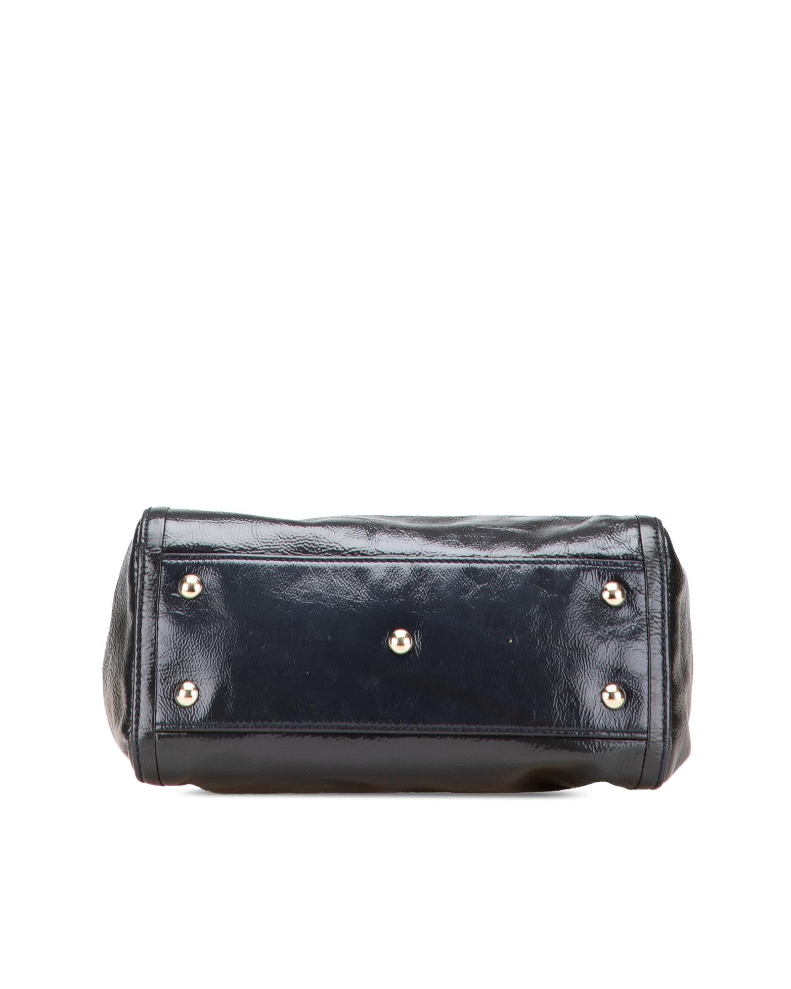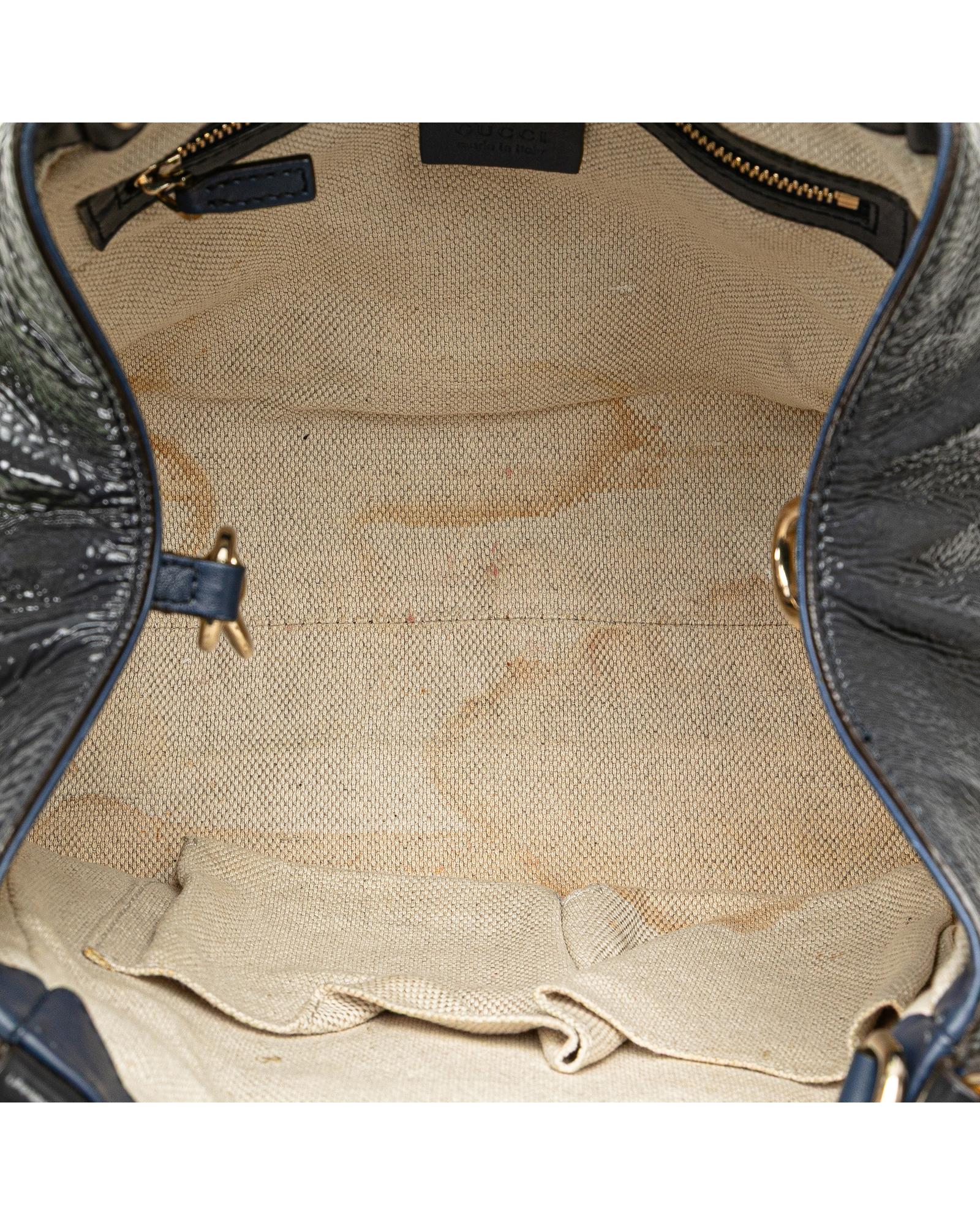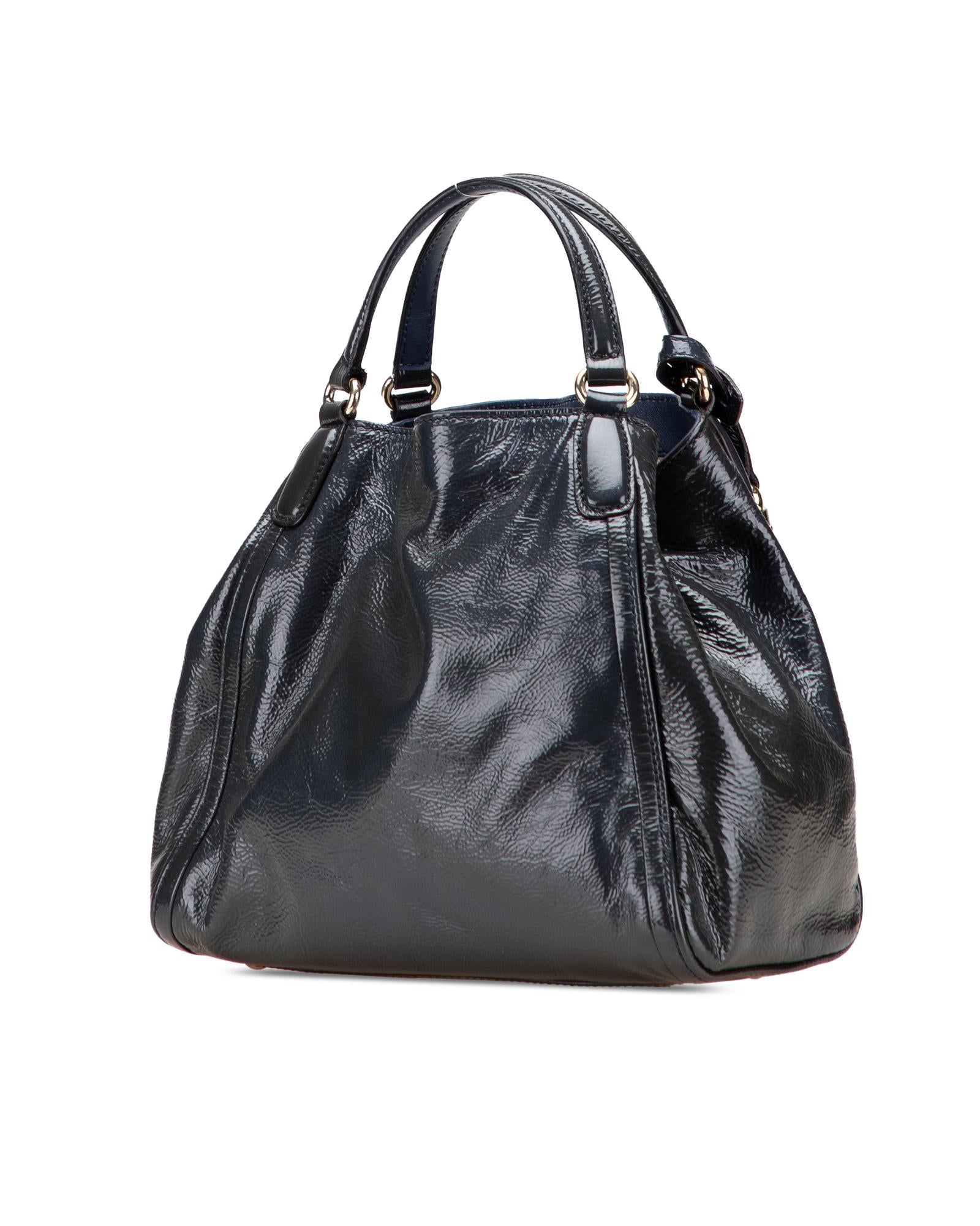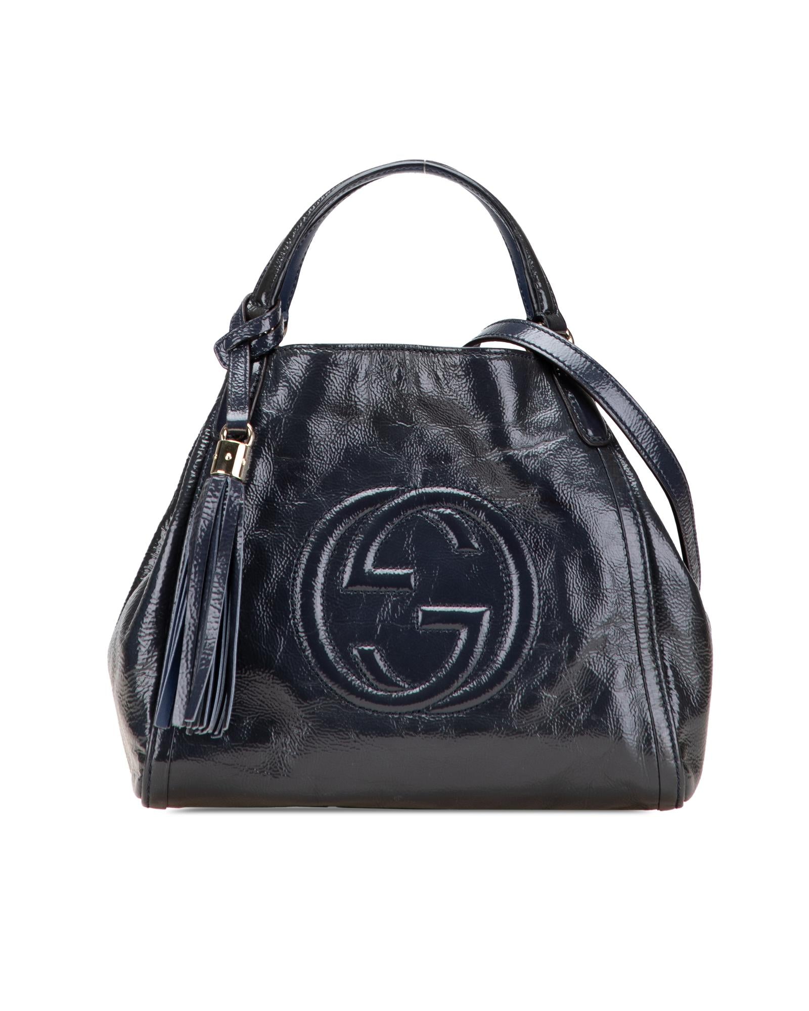The Soho features a patent leather body flat leather handles with tassel details a detachable flat strap an open top with lobster clasp closure and interior zip and slip pockets.Brand: Gucci Vintage