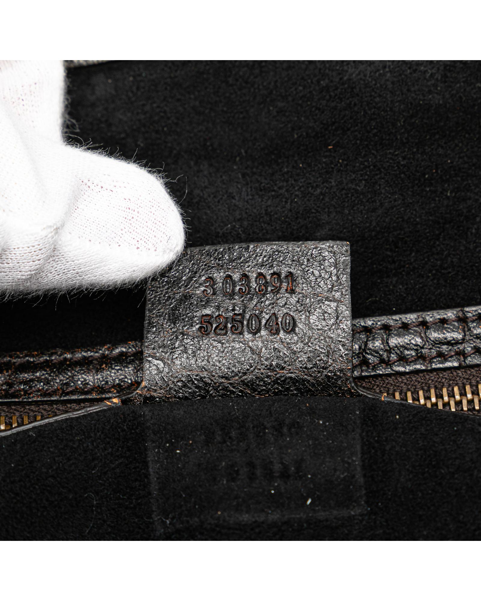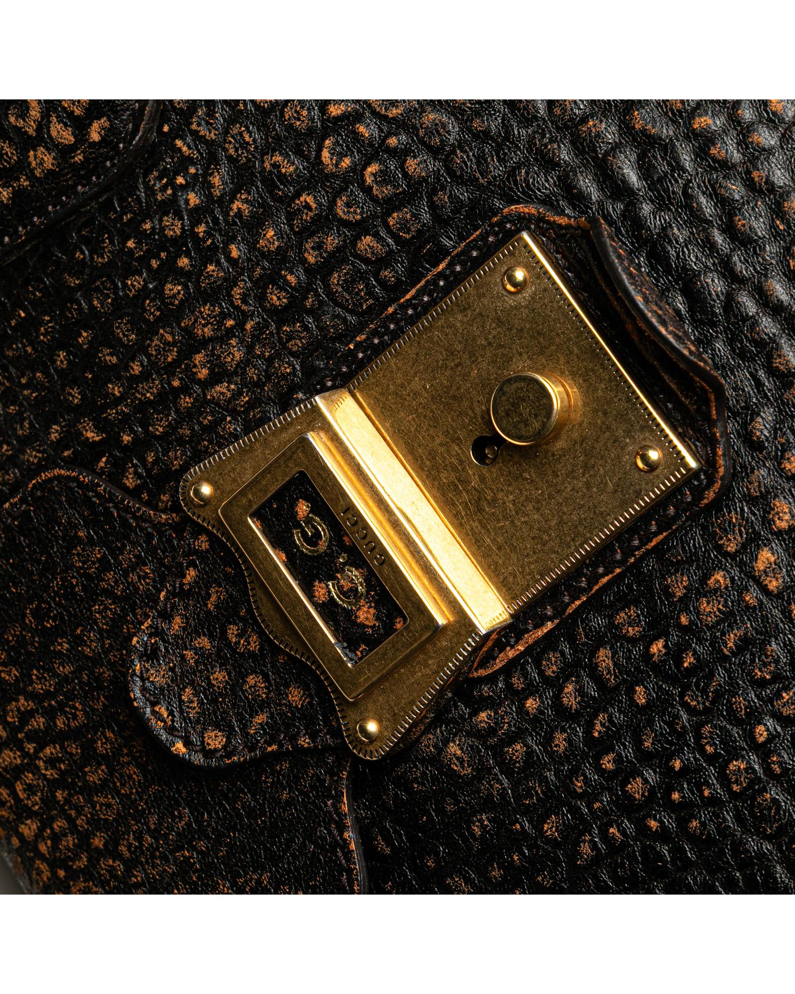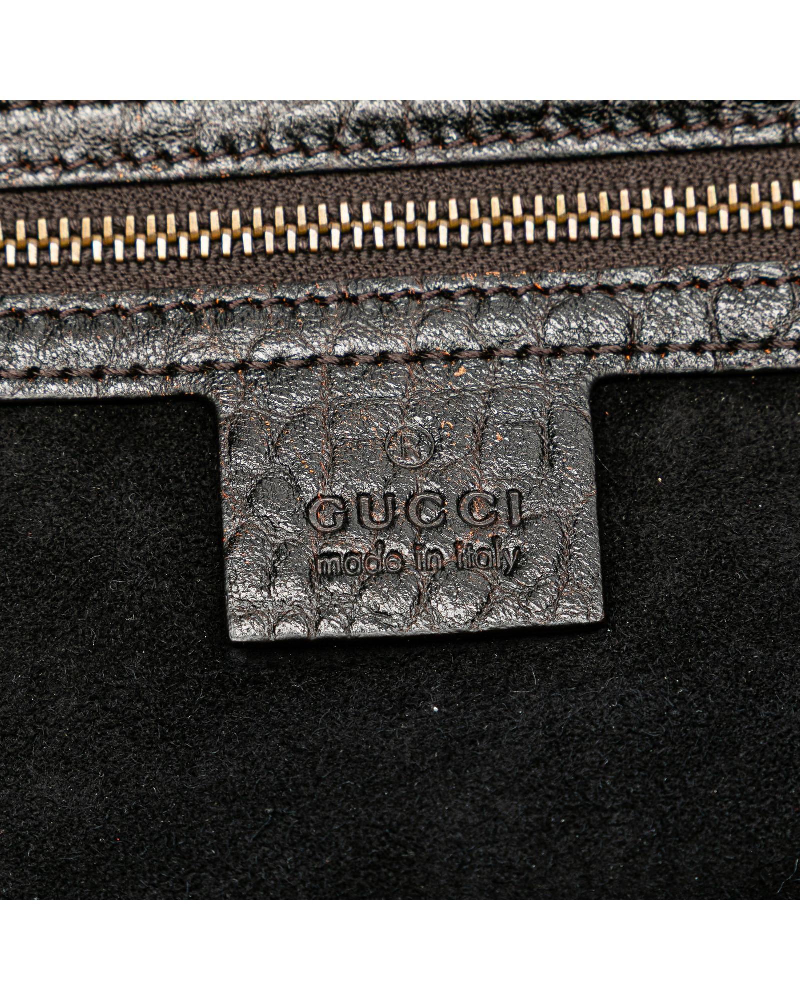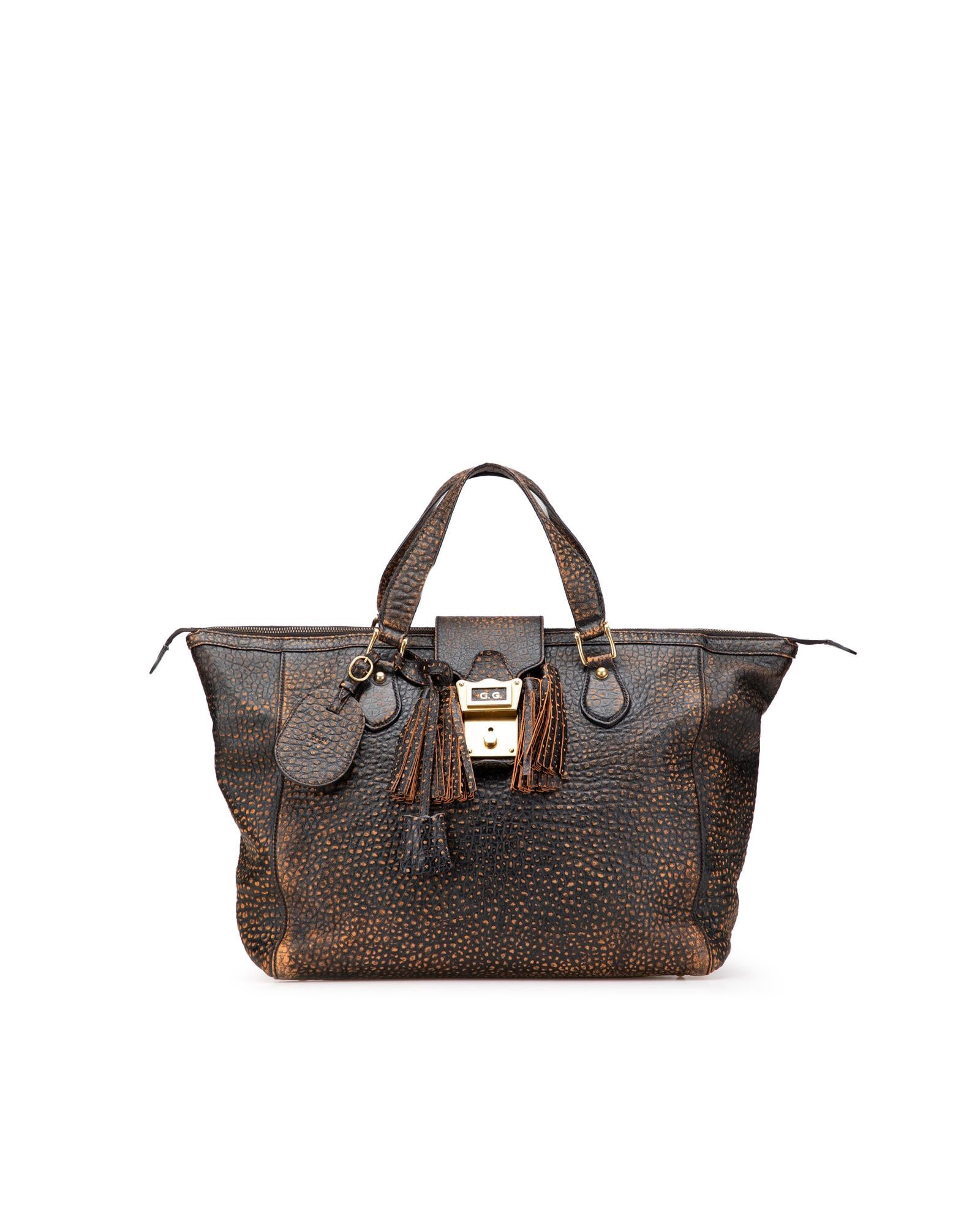 This tote bag features an embossed leather body flat leather handles a top strap with push lock closure with tassel details a top zip closure and interior zip and slip pockets.Brand: Gucci Vintage