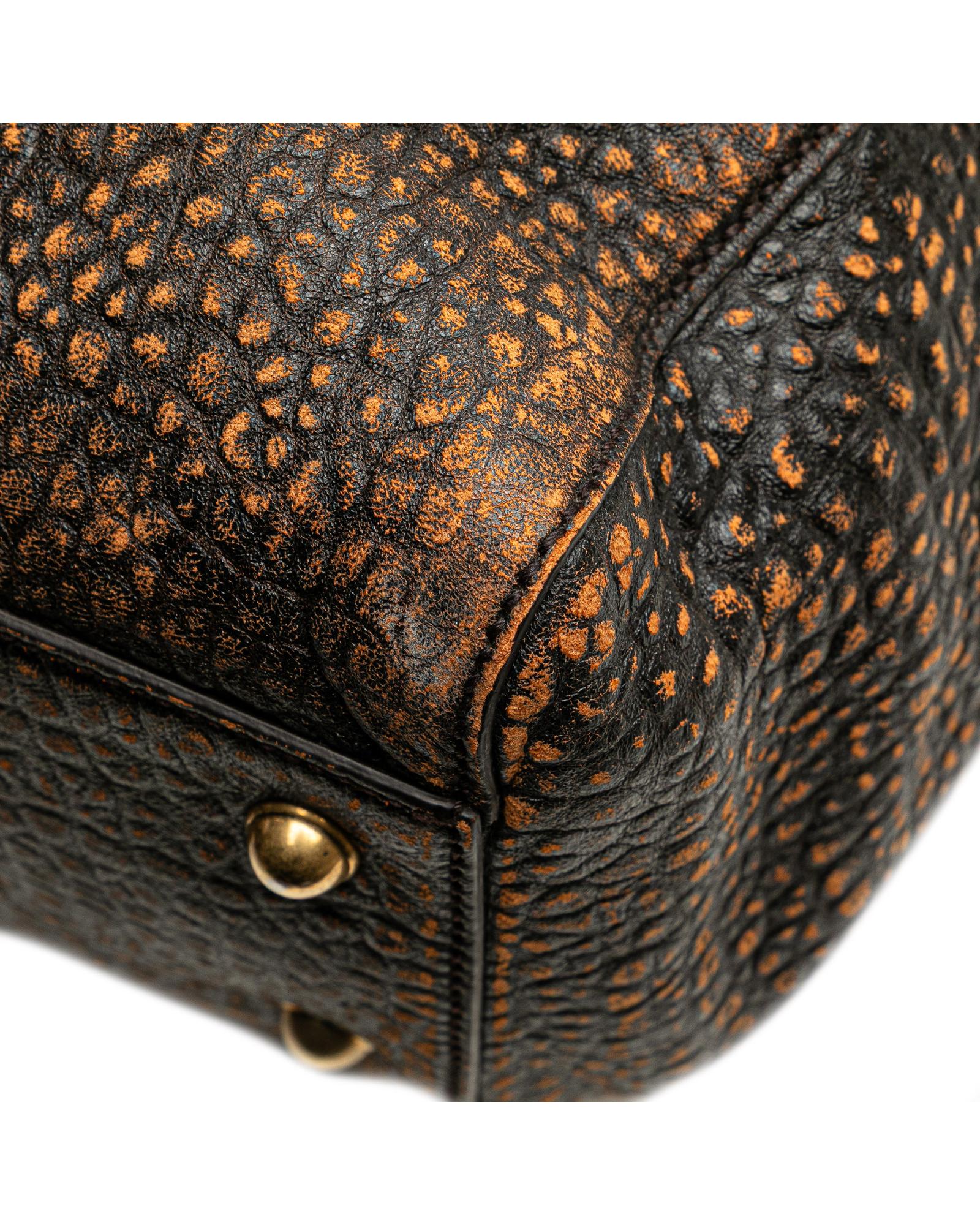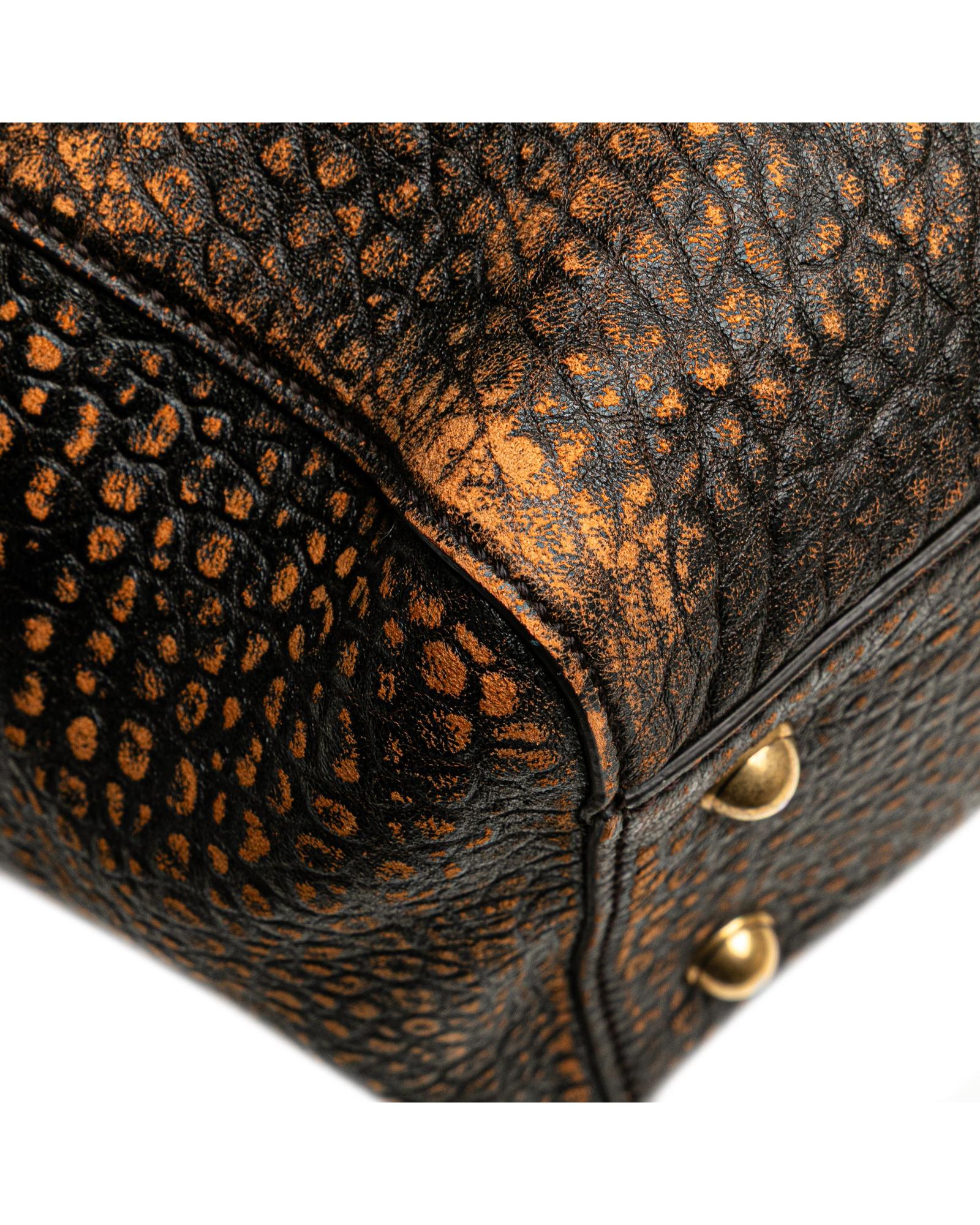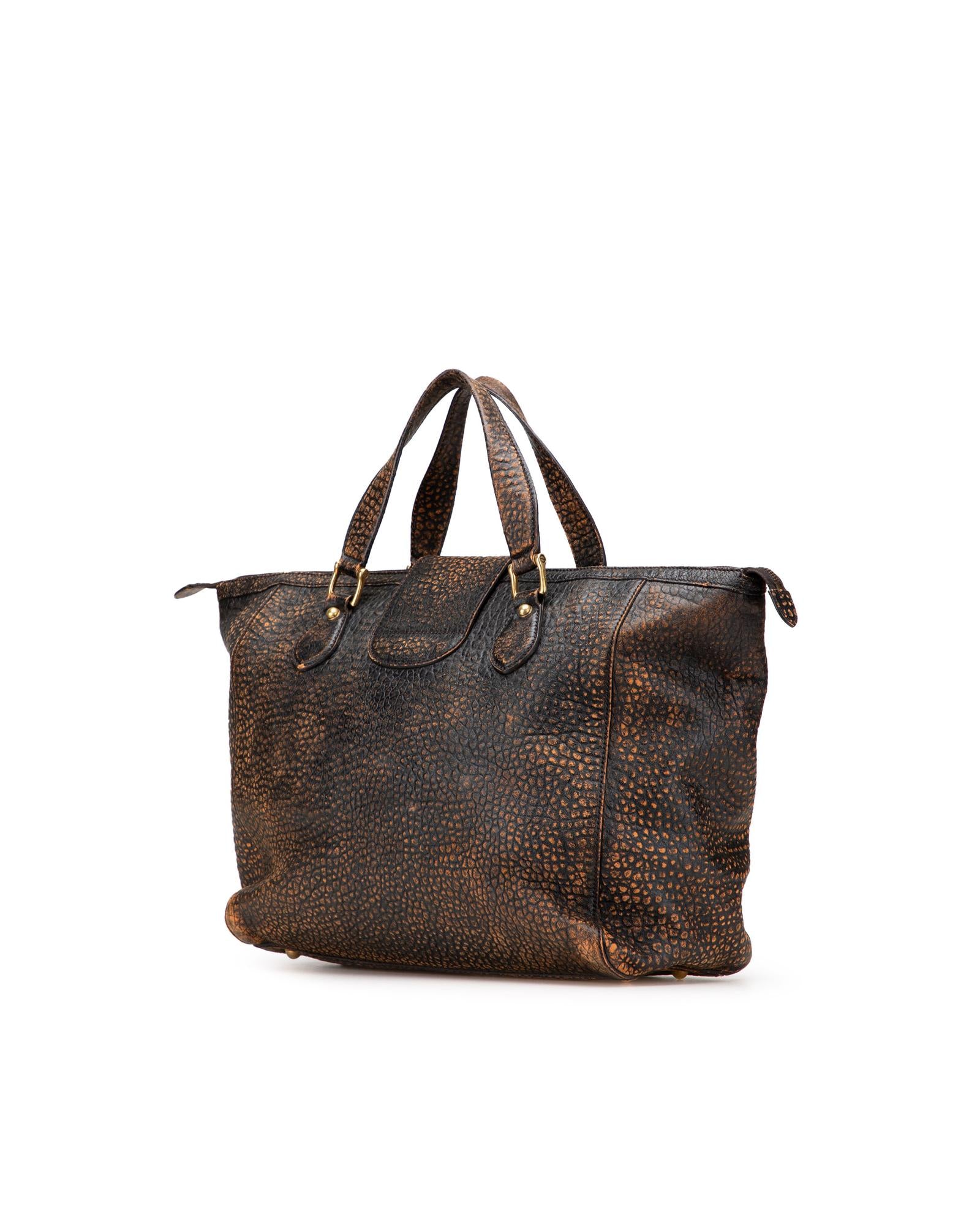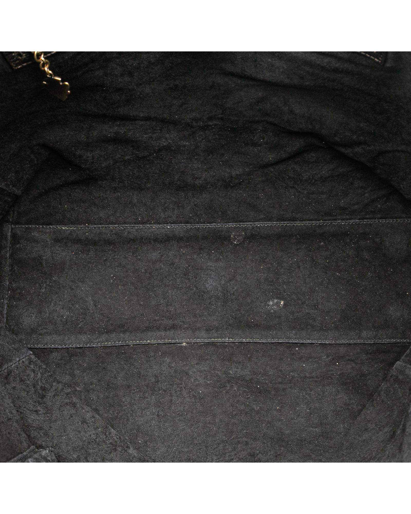 This tote bag features an embossed leather body flat leather handles a top strap with push lock closure with tassel details a top zip closure and interior zip and slip pockets.Brand: Gucci Vintage