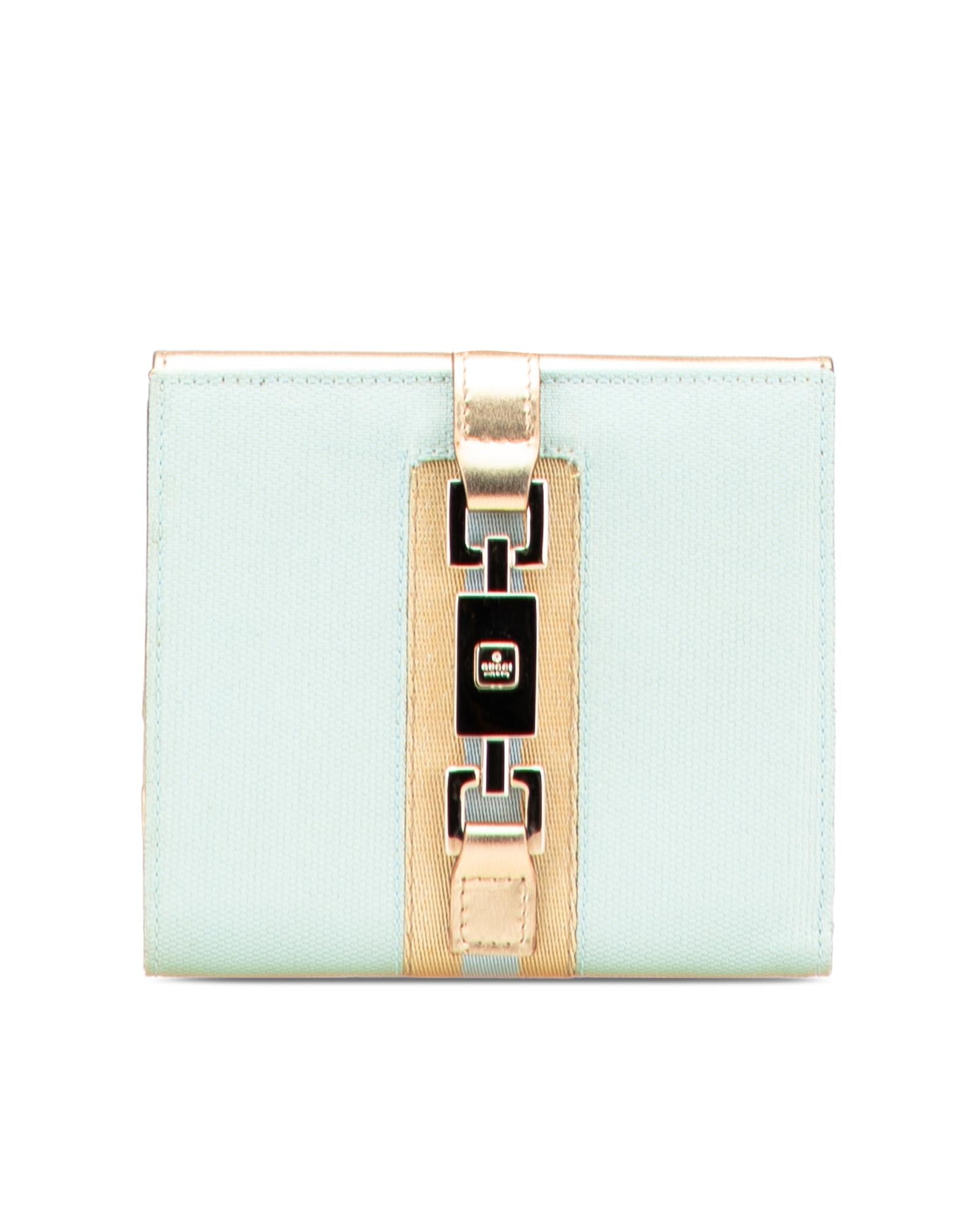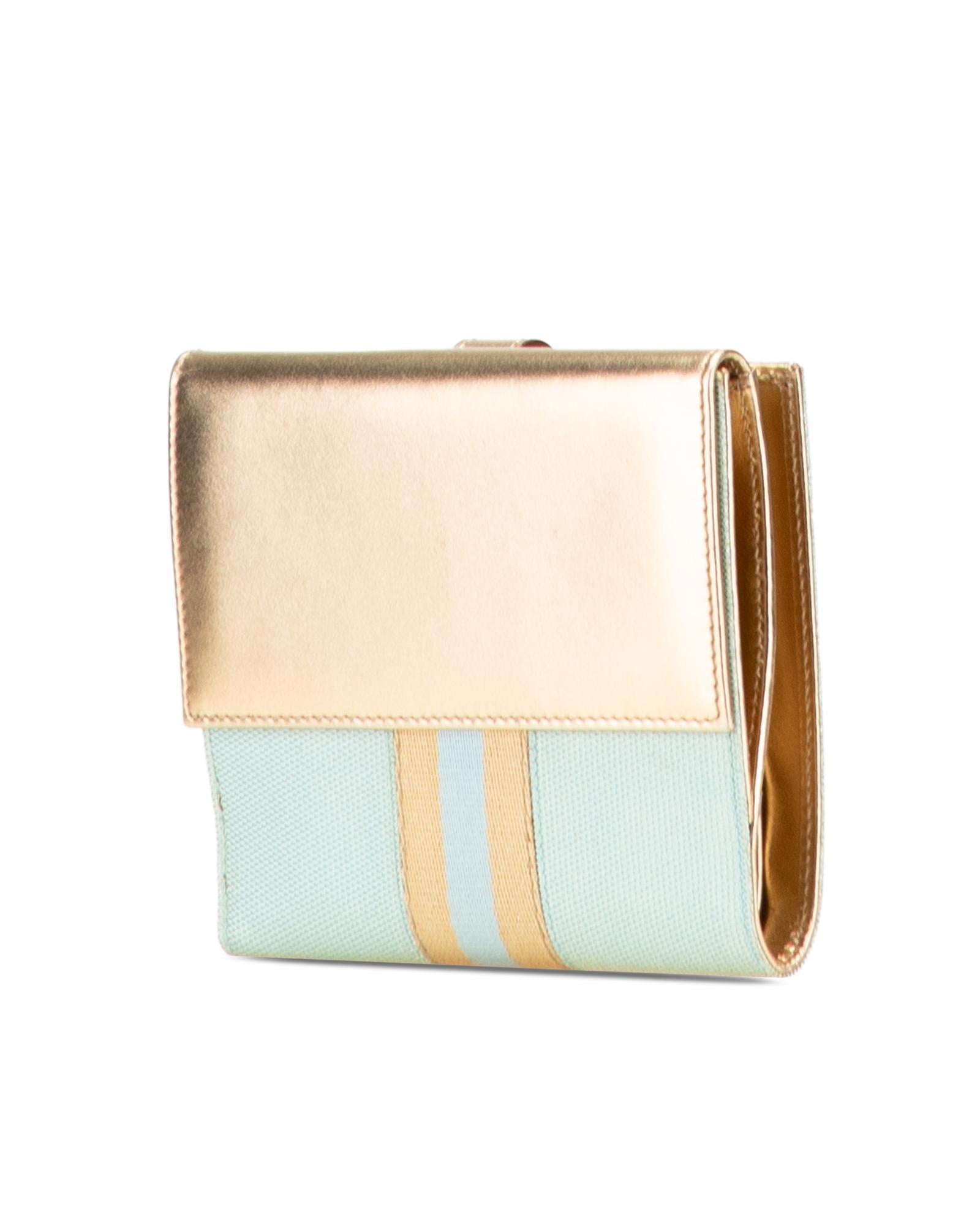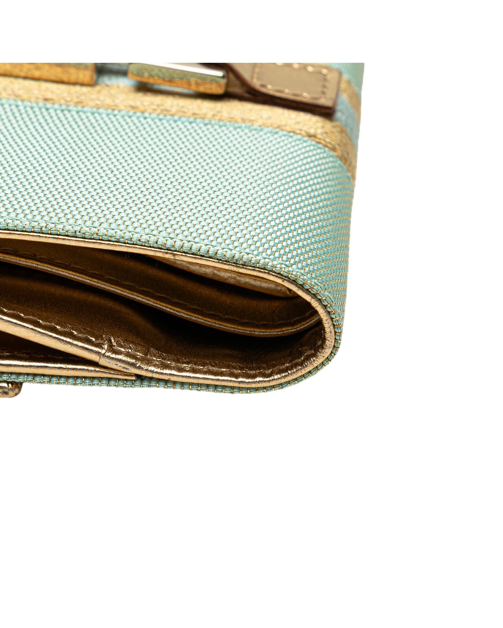This wallet features a canvas body with leather trim a front flap and interior slip pockets.