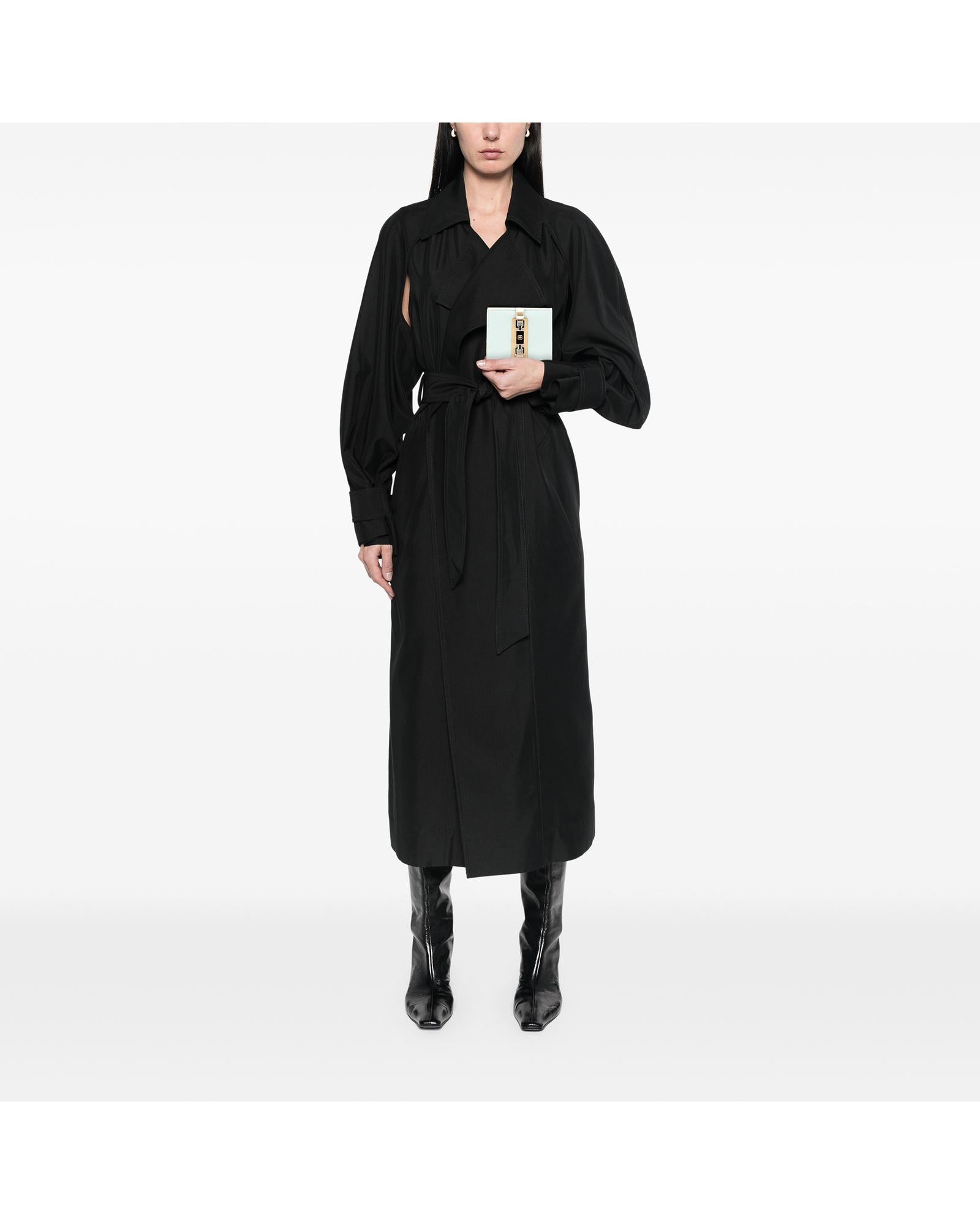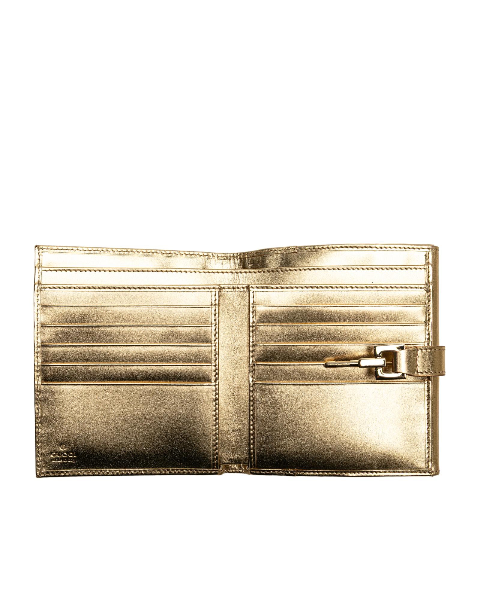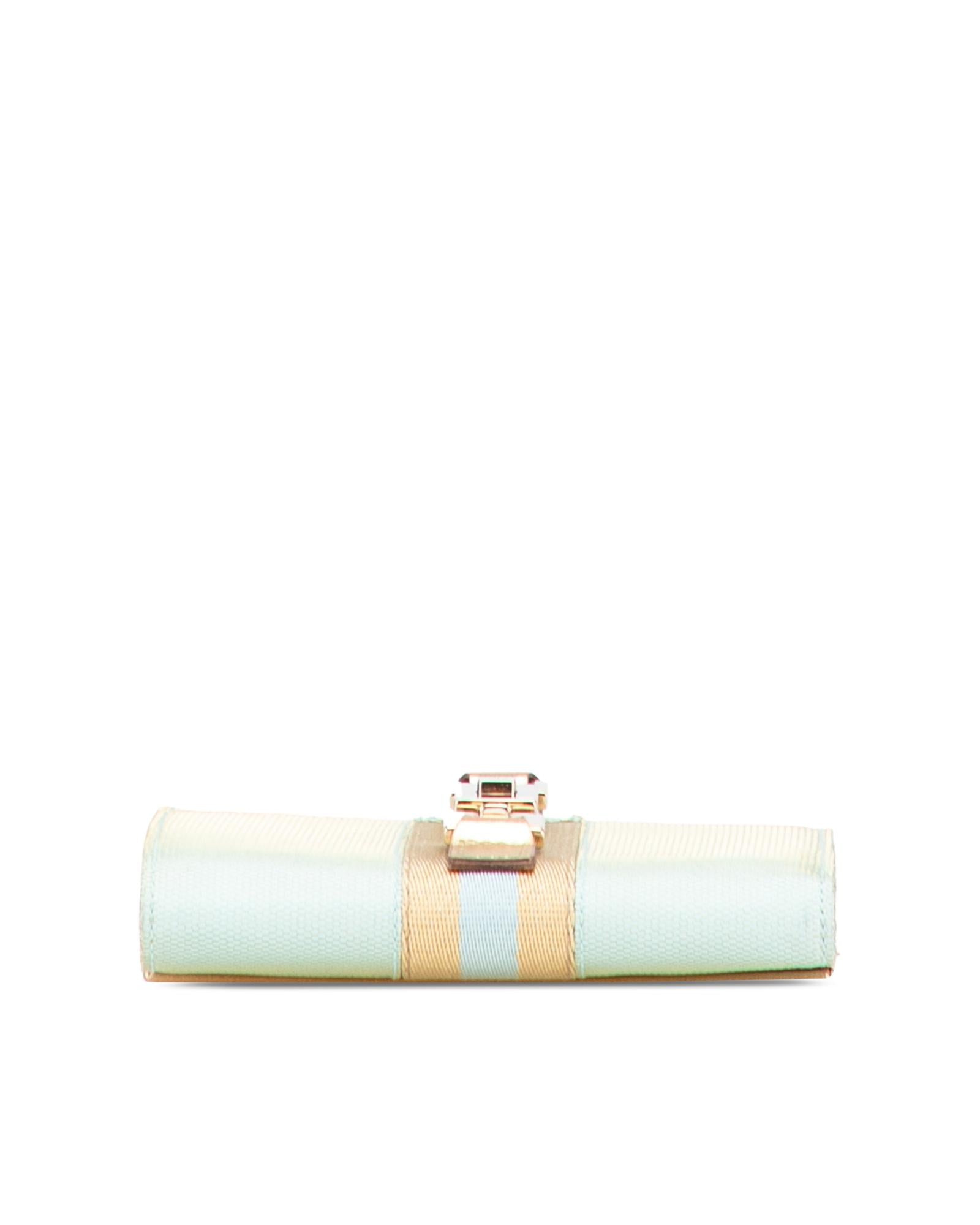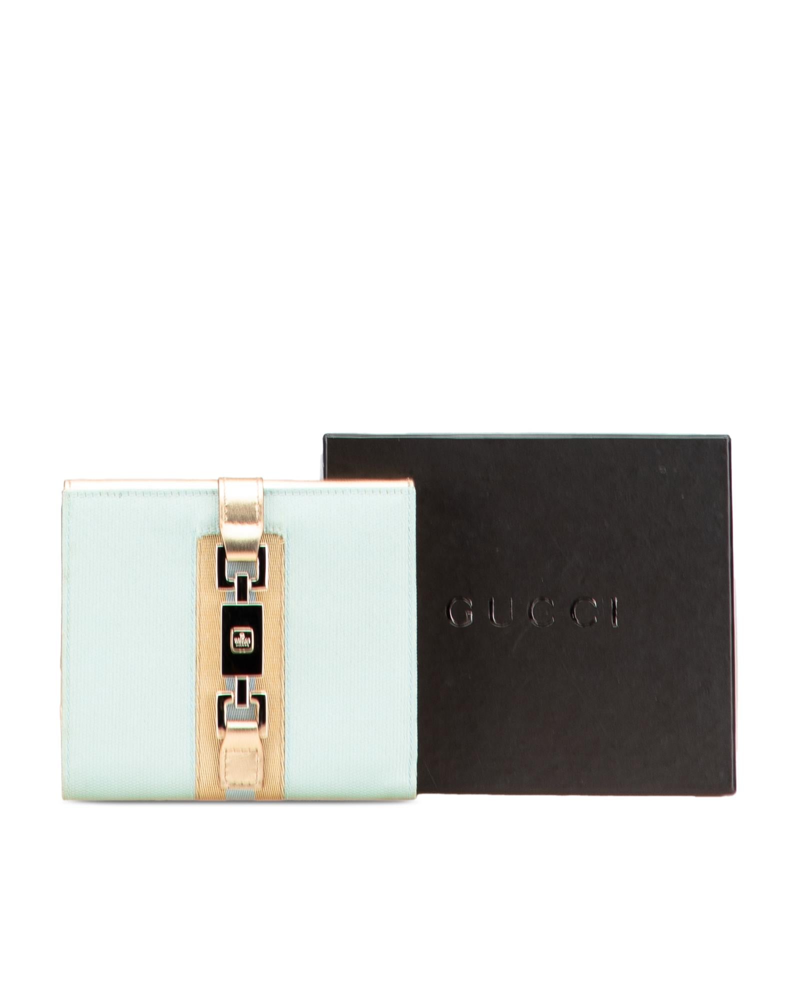 This wallet features a canvas body with leather trim a front flap and interior slip pockets.