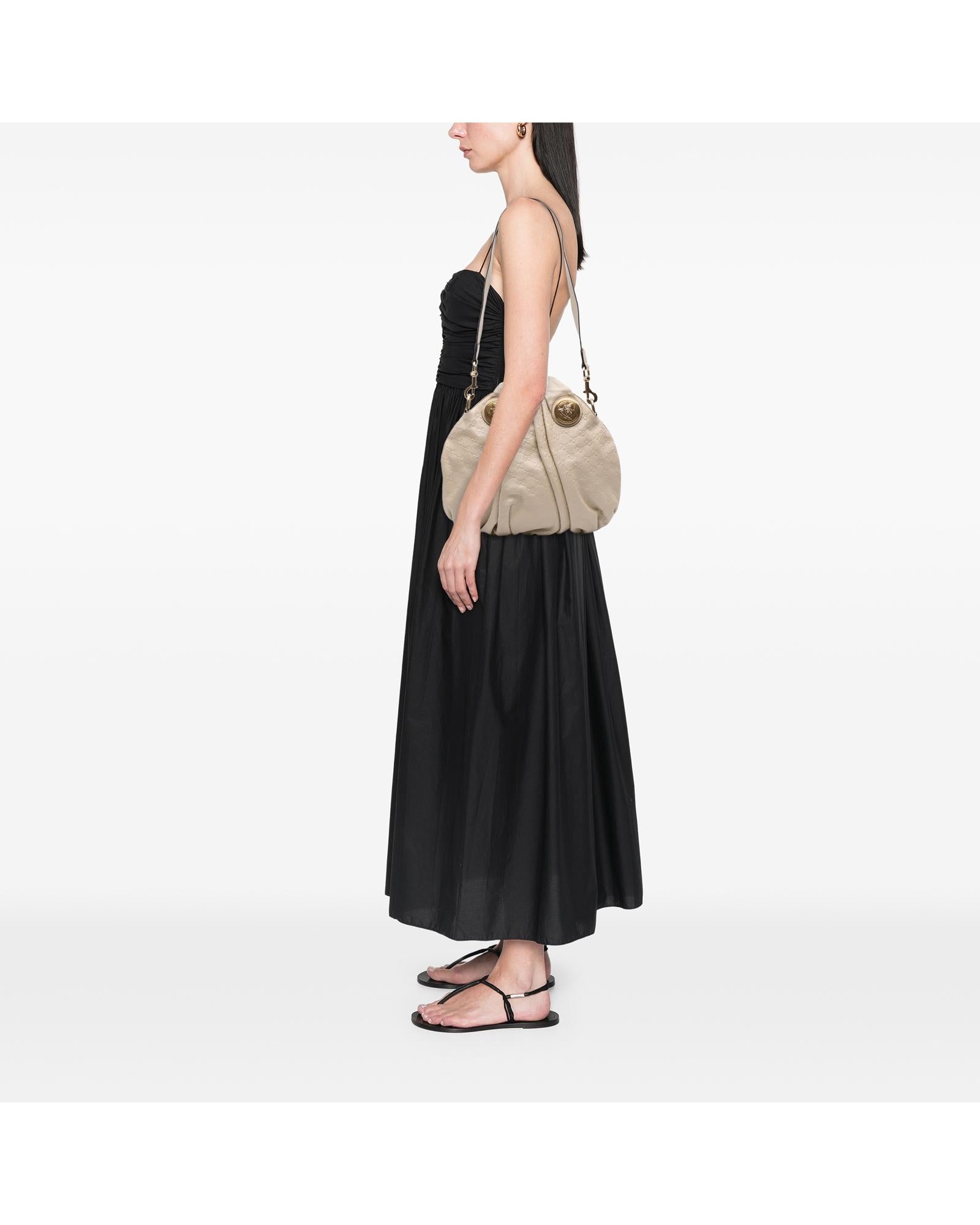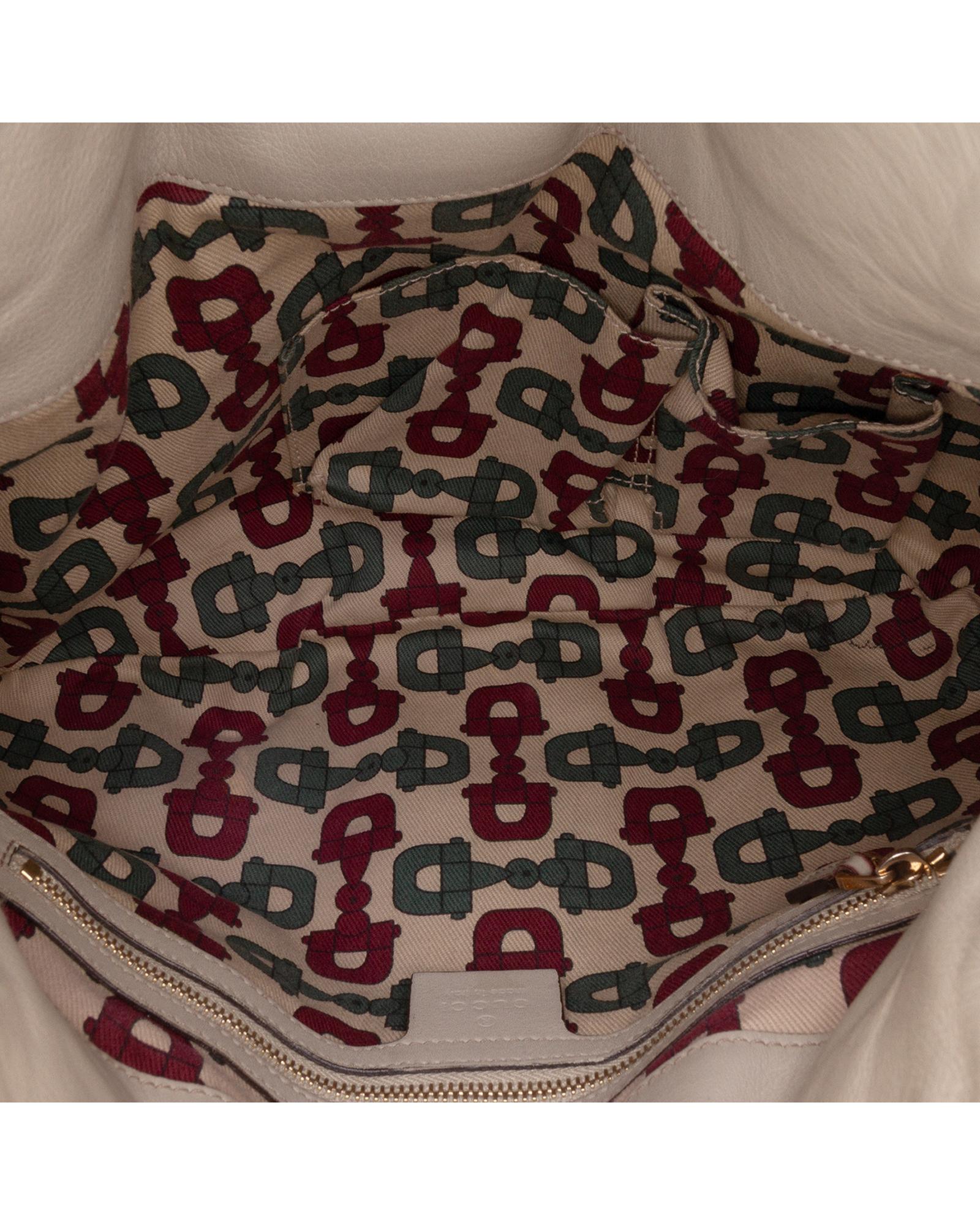 The Hysteria features a leather body flat handles open top with magnetic closure and interior zip and slip pockets.