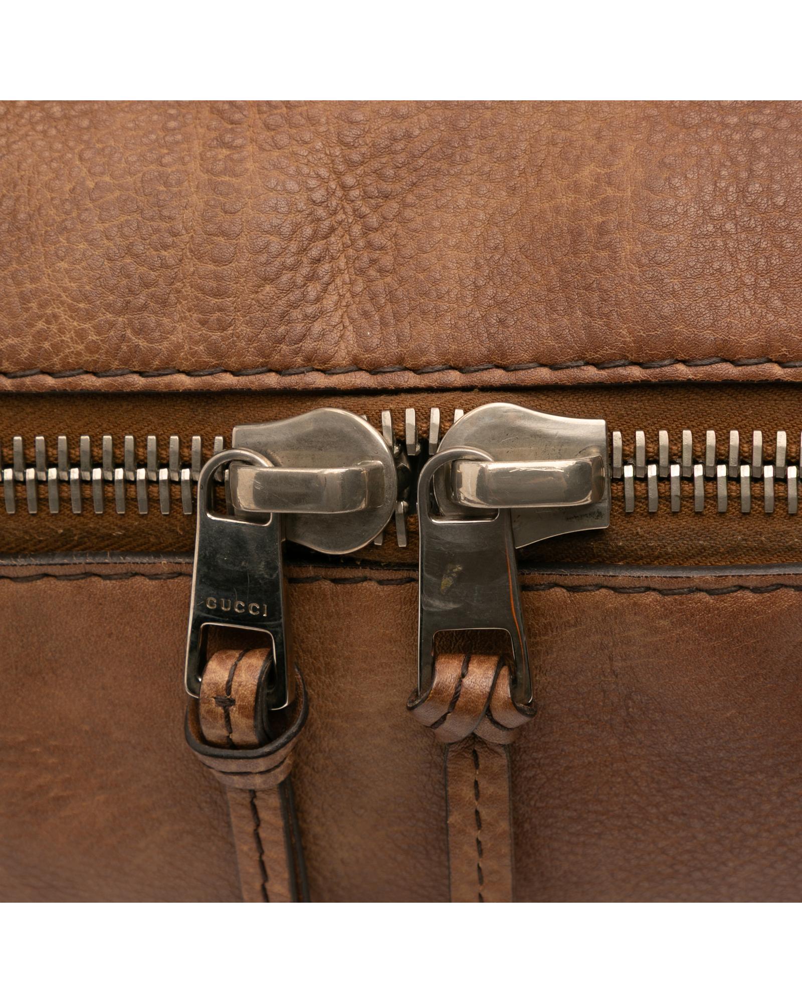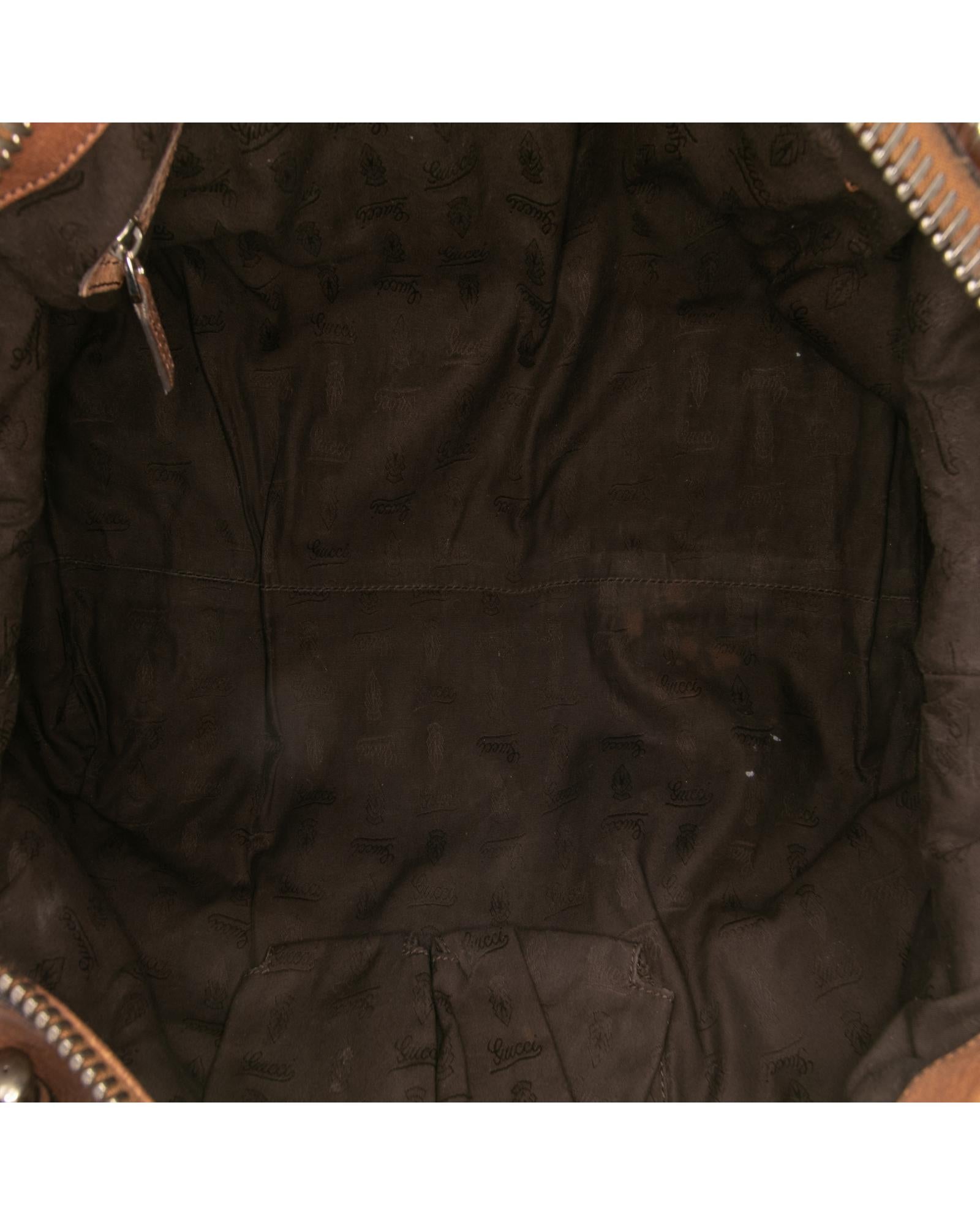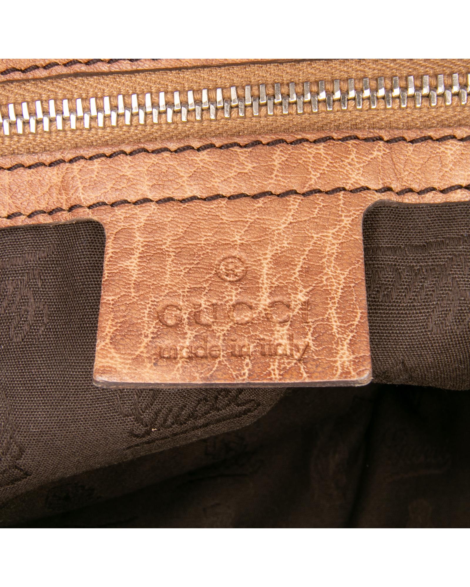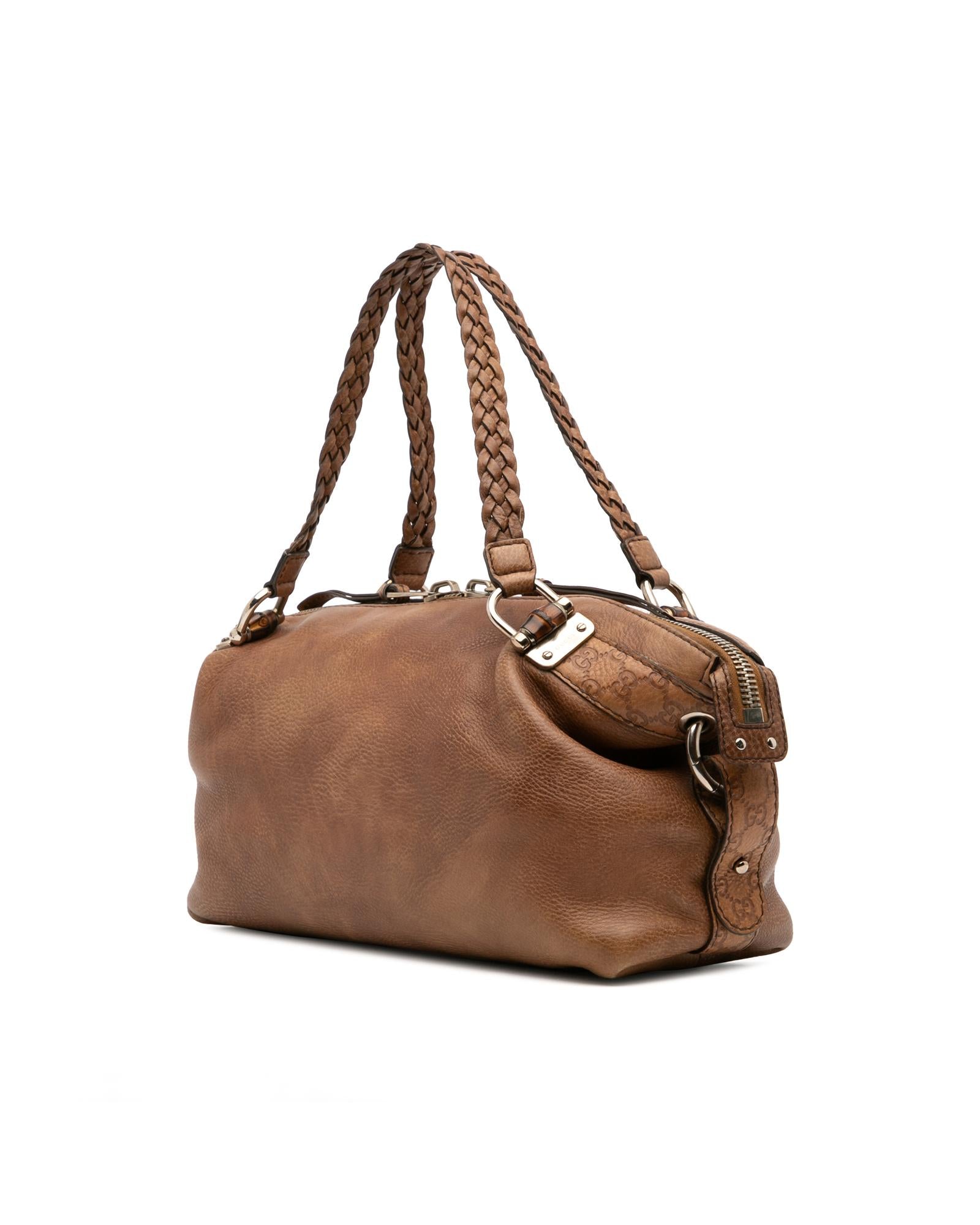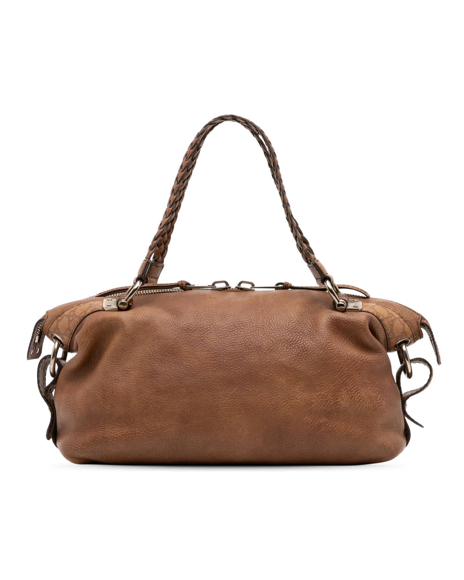 This tote features a leather body braided leather straps a top zip closure and interior zip and slip pockets.Brand: Gucci Vintage