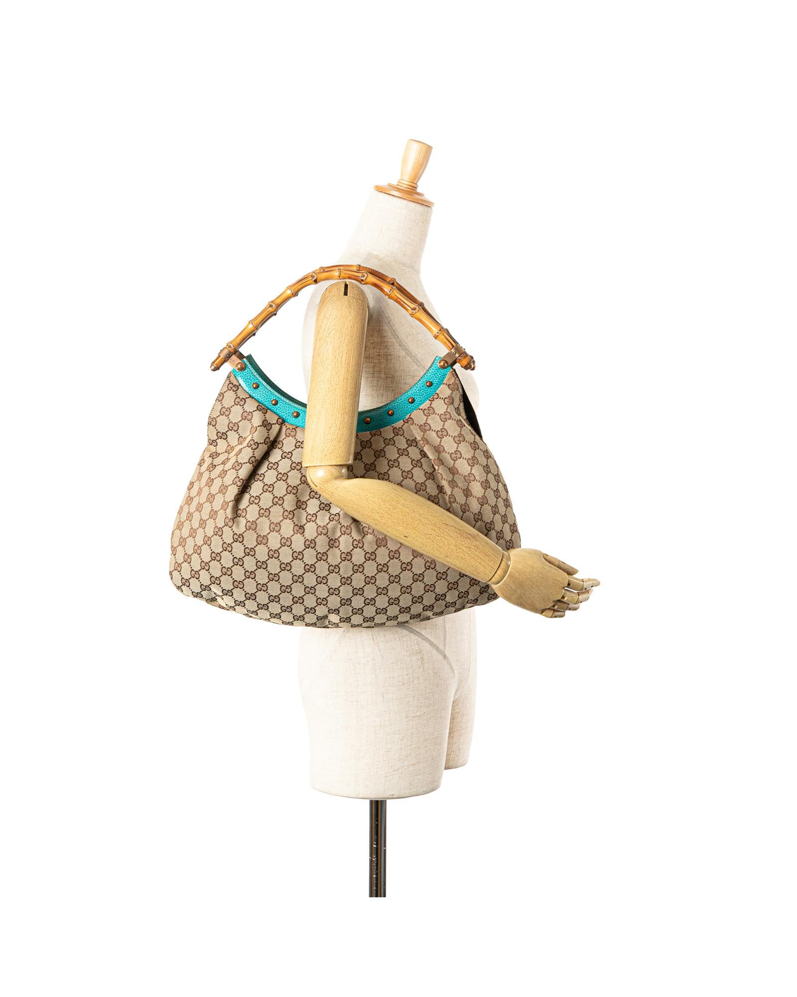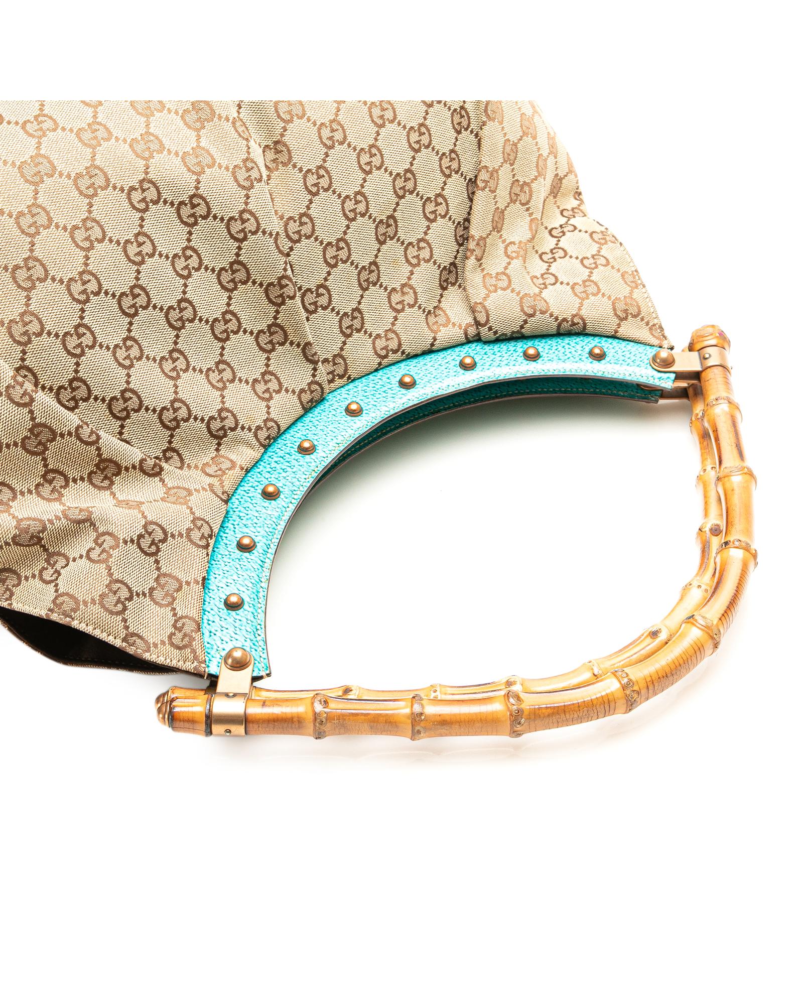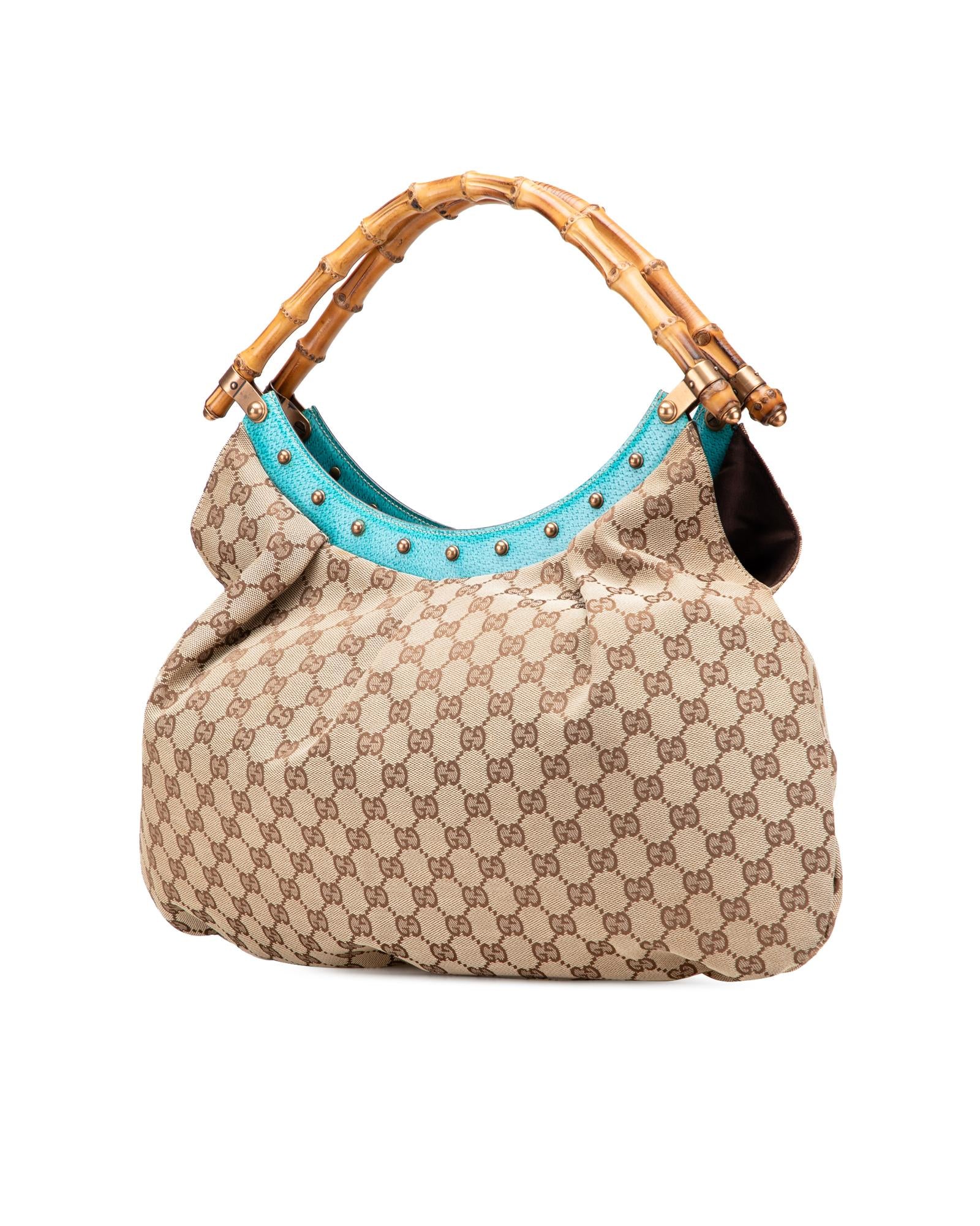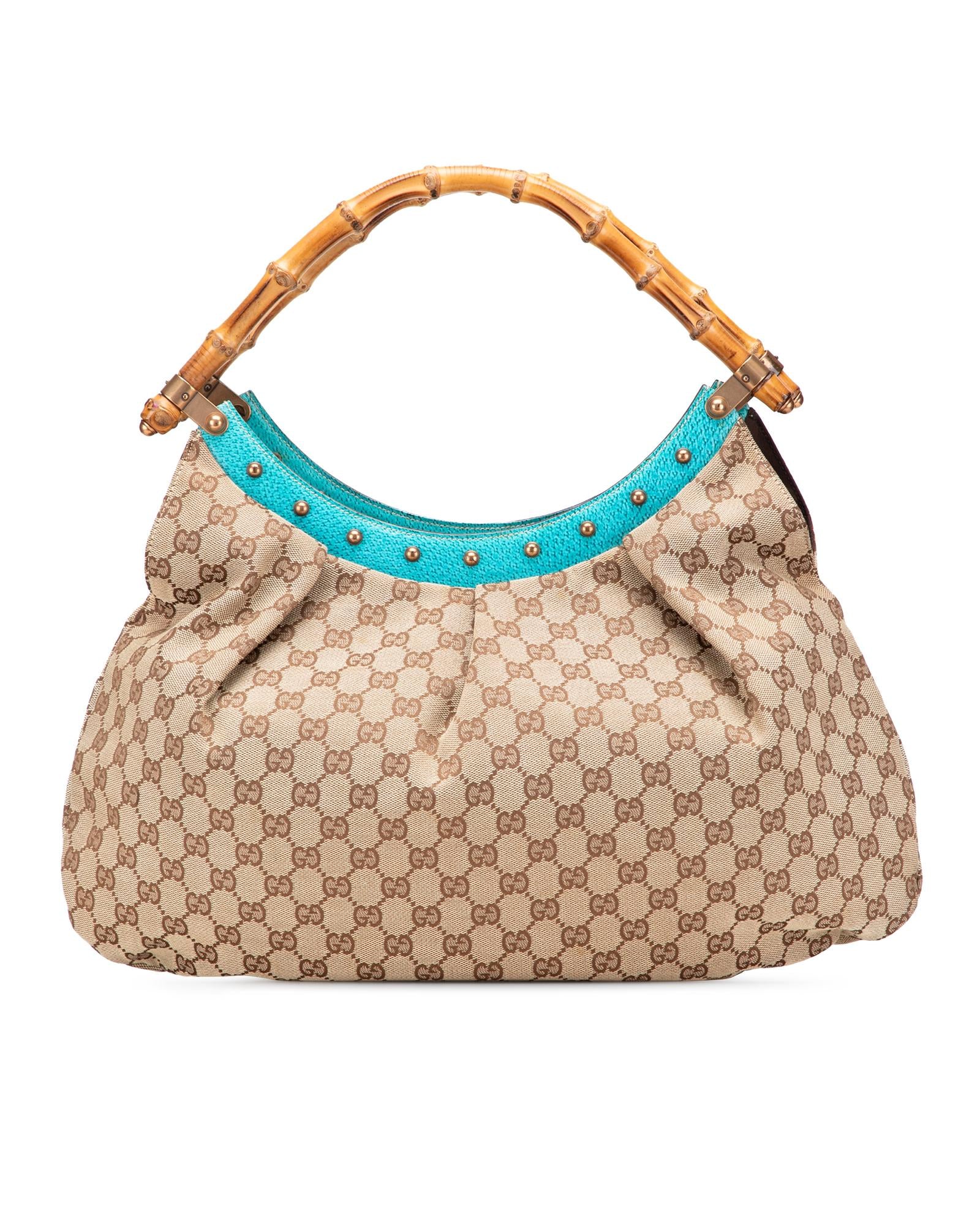 This handbag features a canvas body with studded leather trim bamboo top handles an open top and an interior zip pocket.