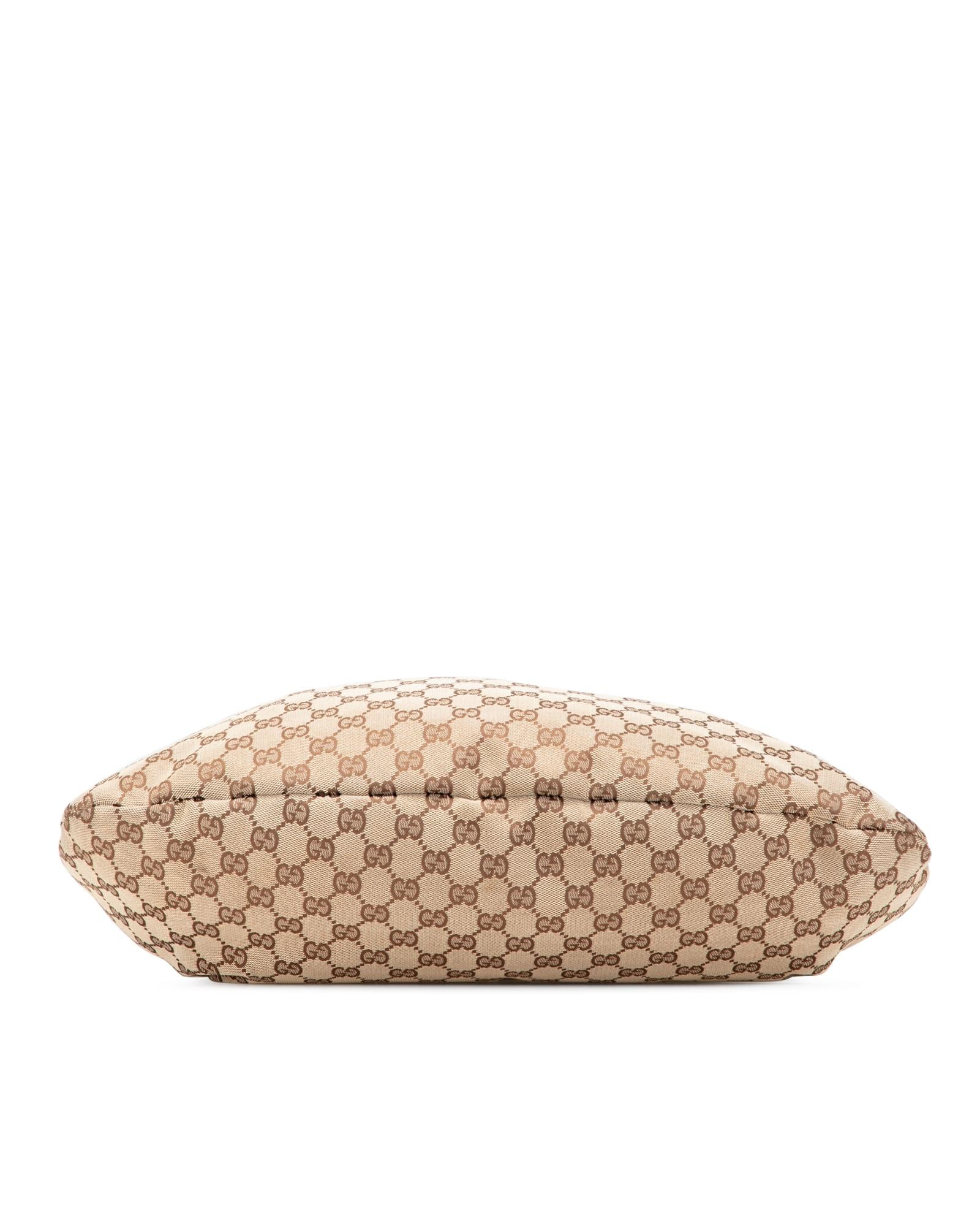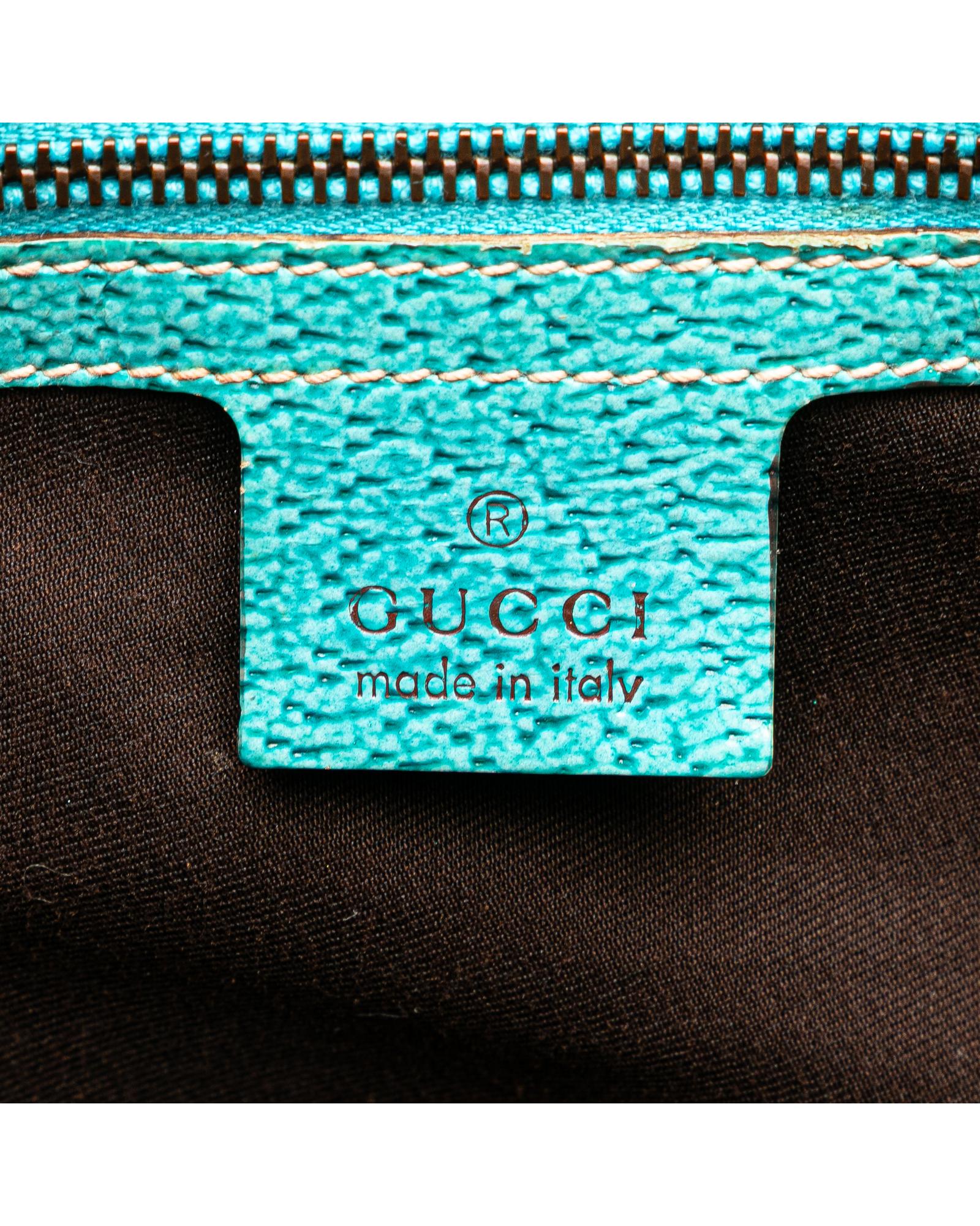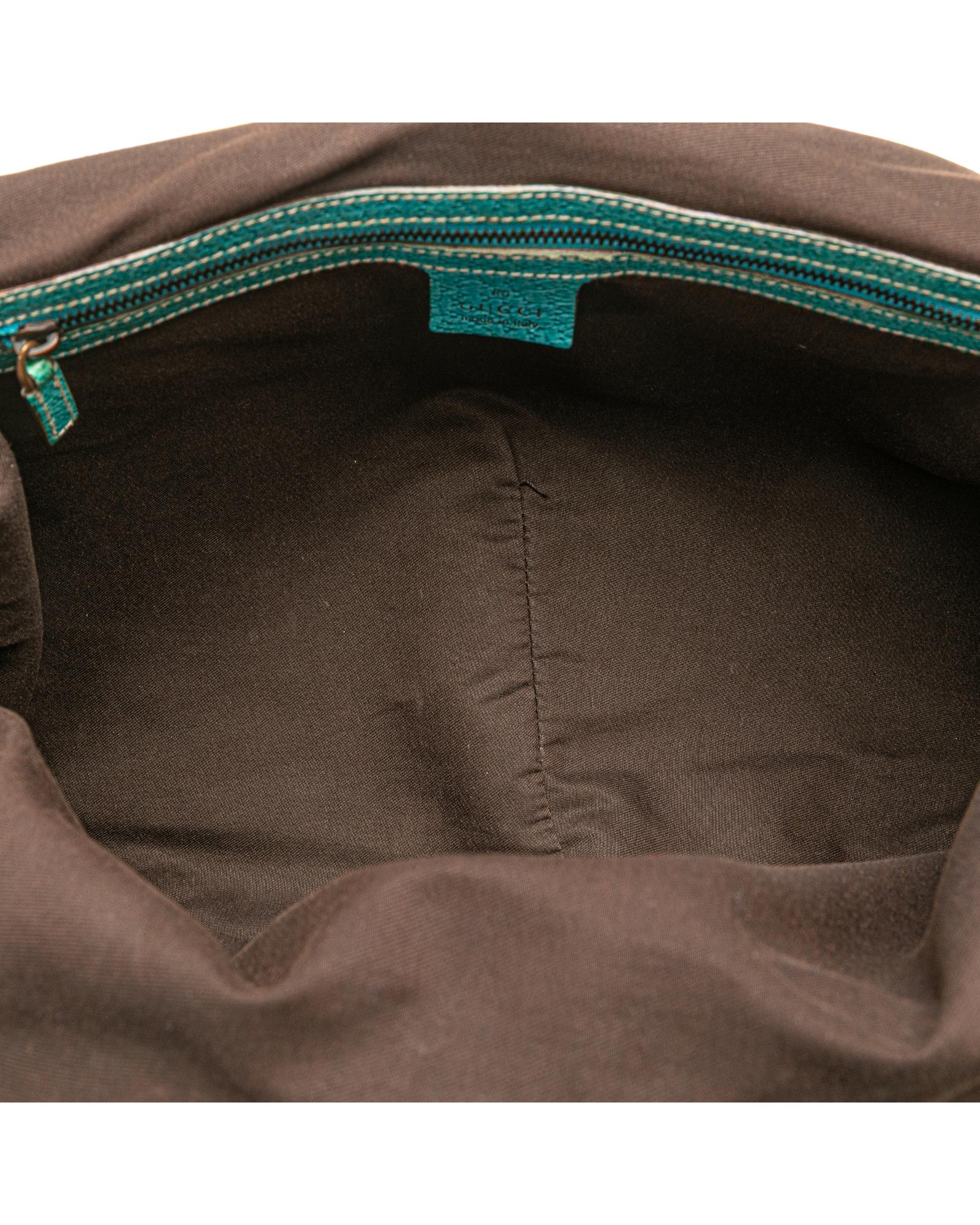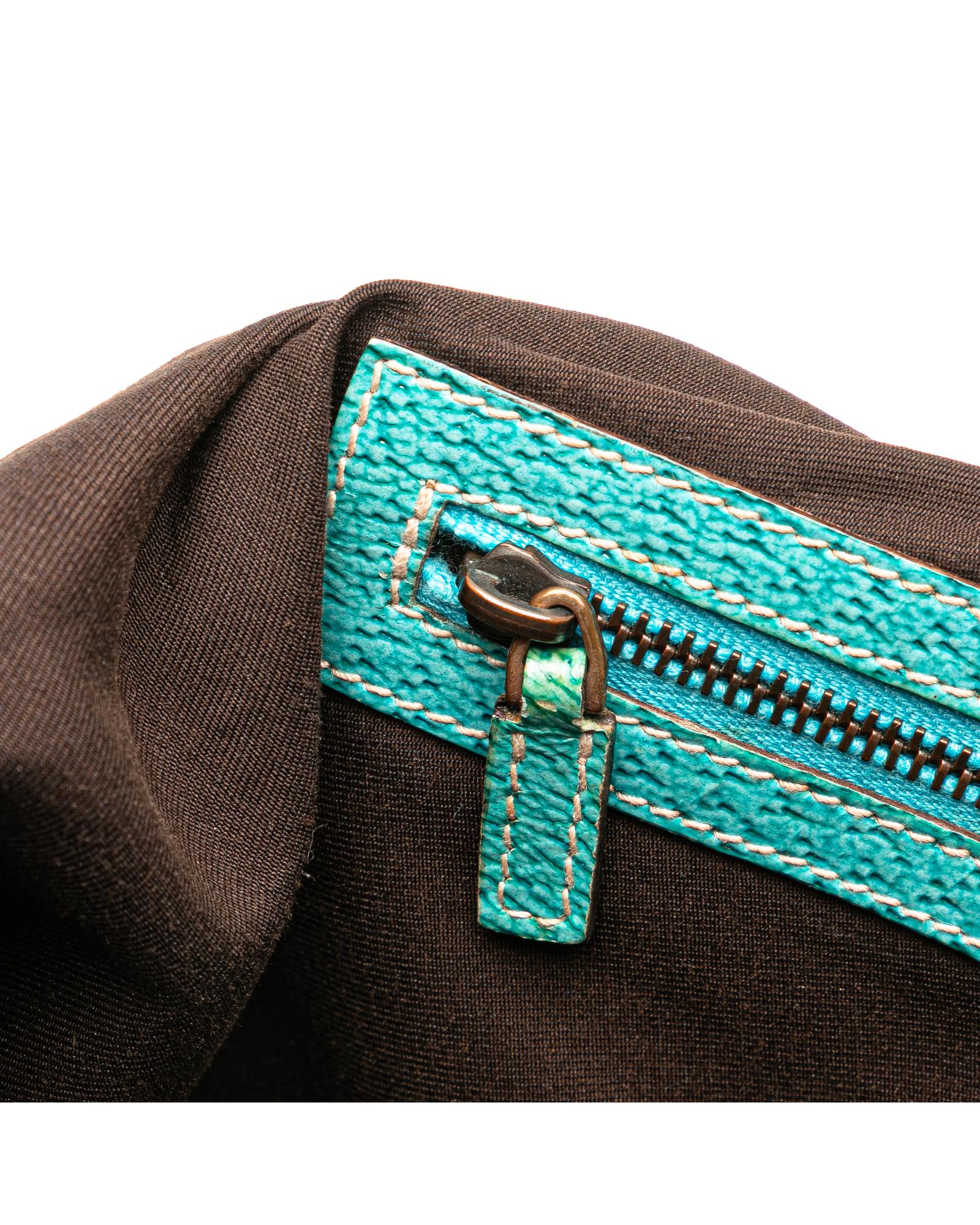This handbag features a canvas body with studded leather trim bamboo top handles an open top and an interior zip pocket.