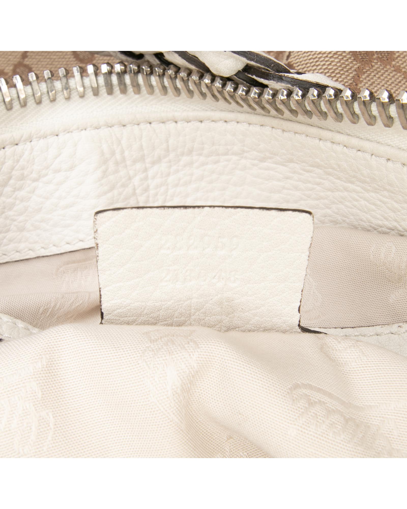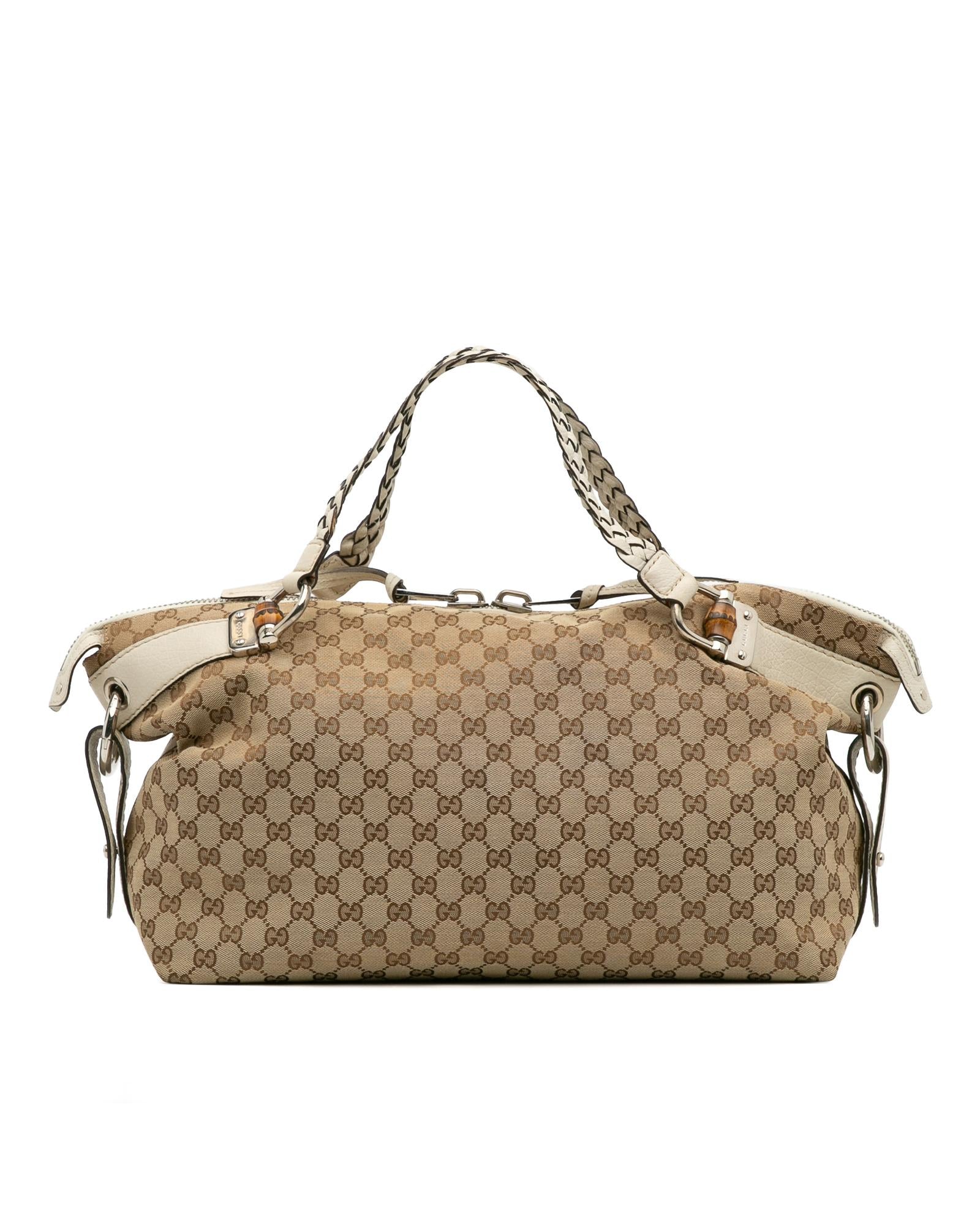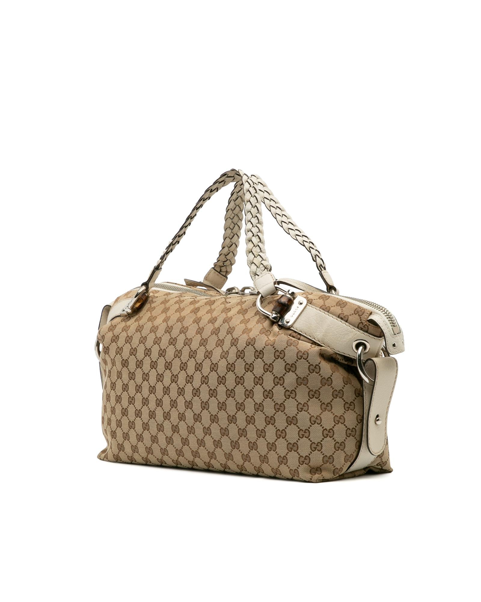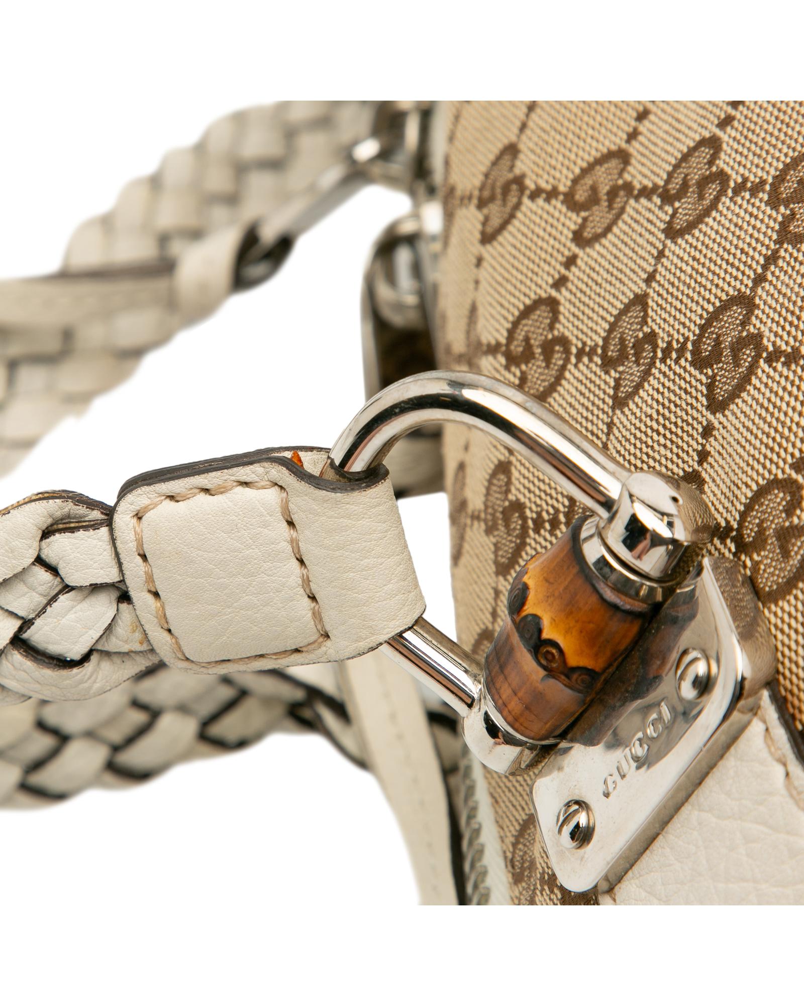 This tote features a canvas body with leather trim braided leather straps a top zip closure and interior zip and slip pockets.Brand: Gucci Vintage