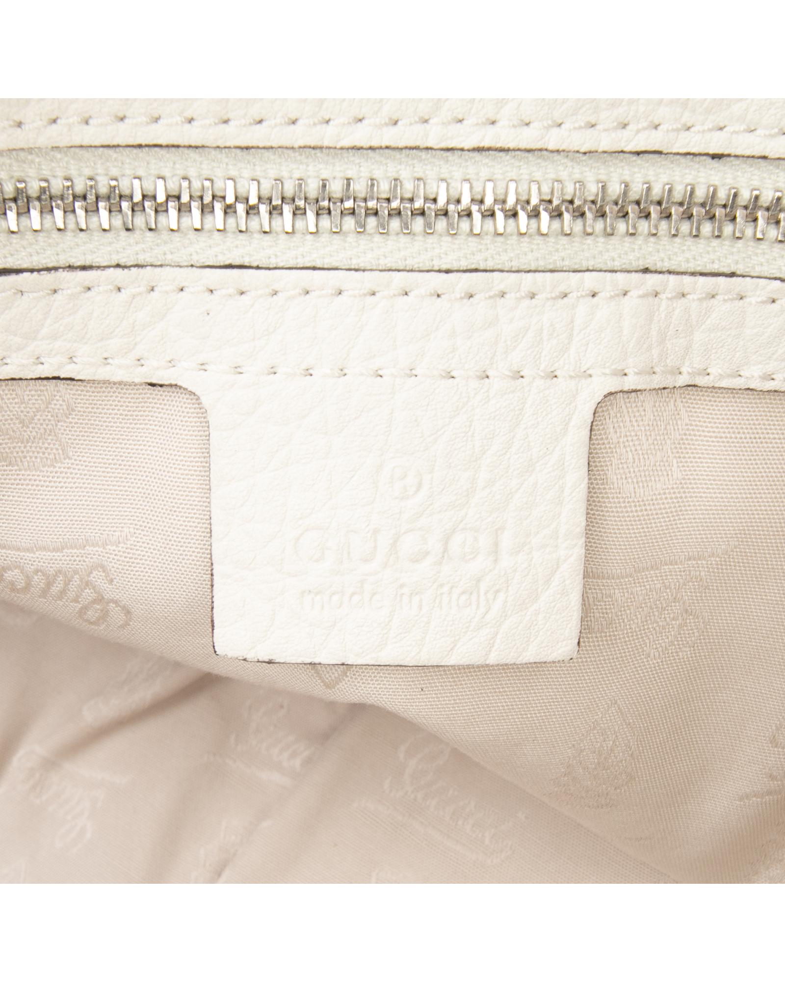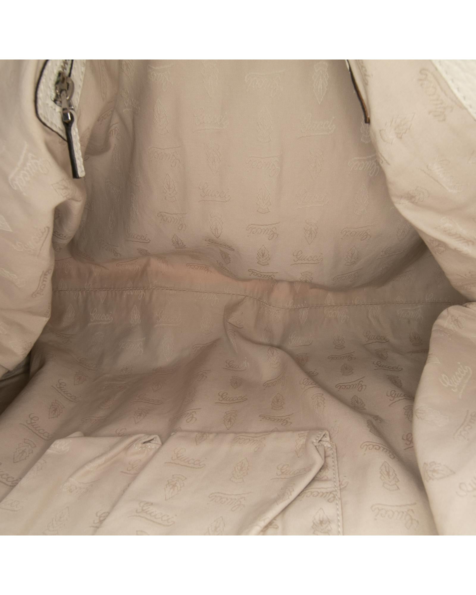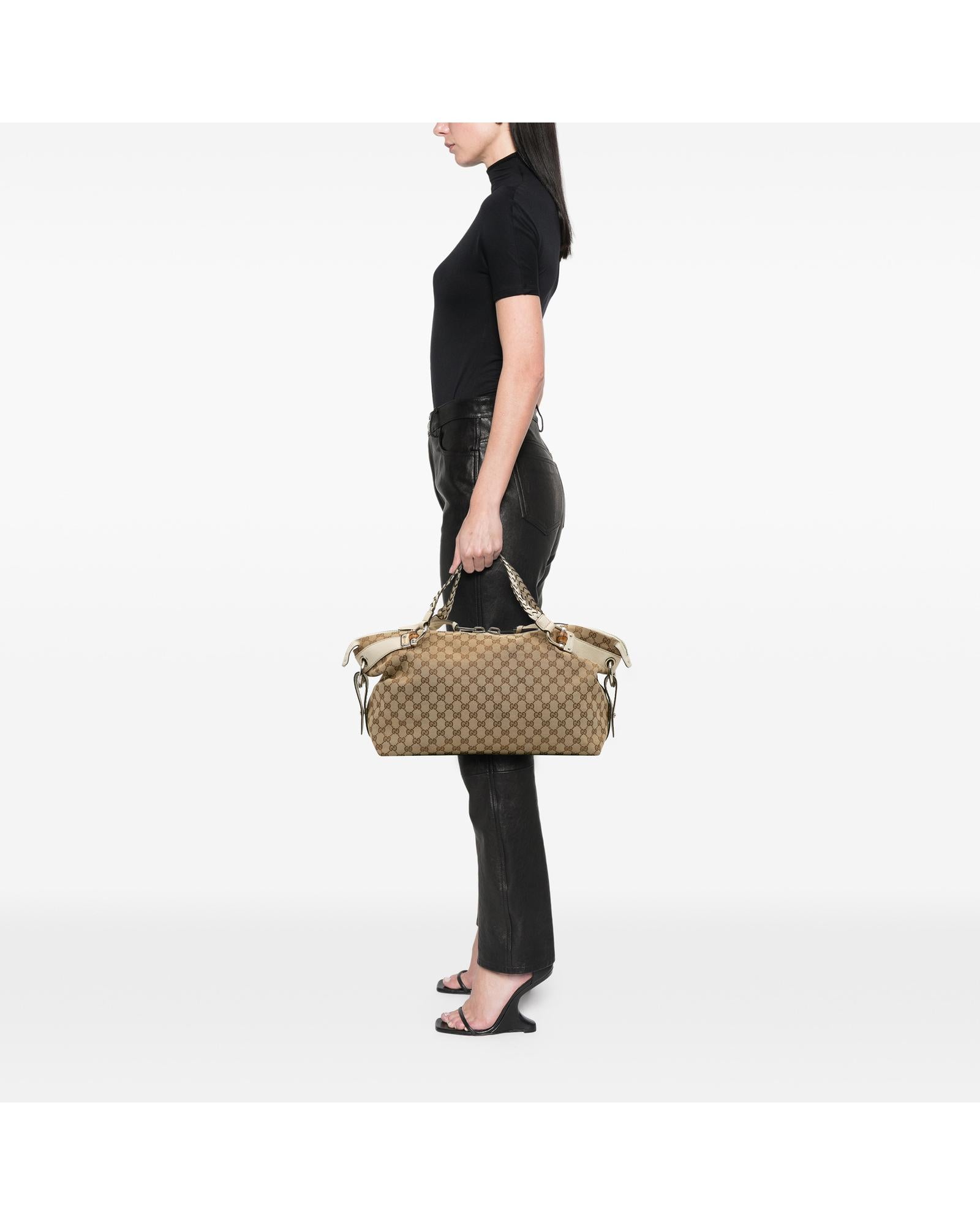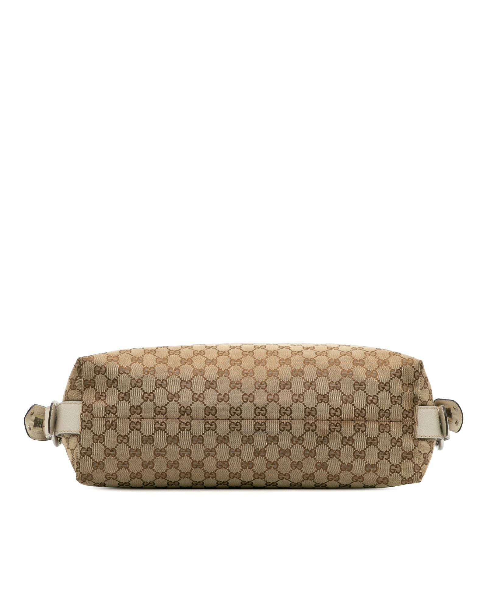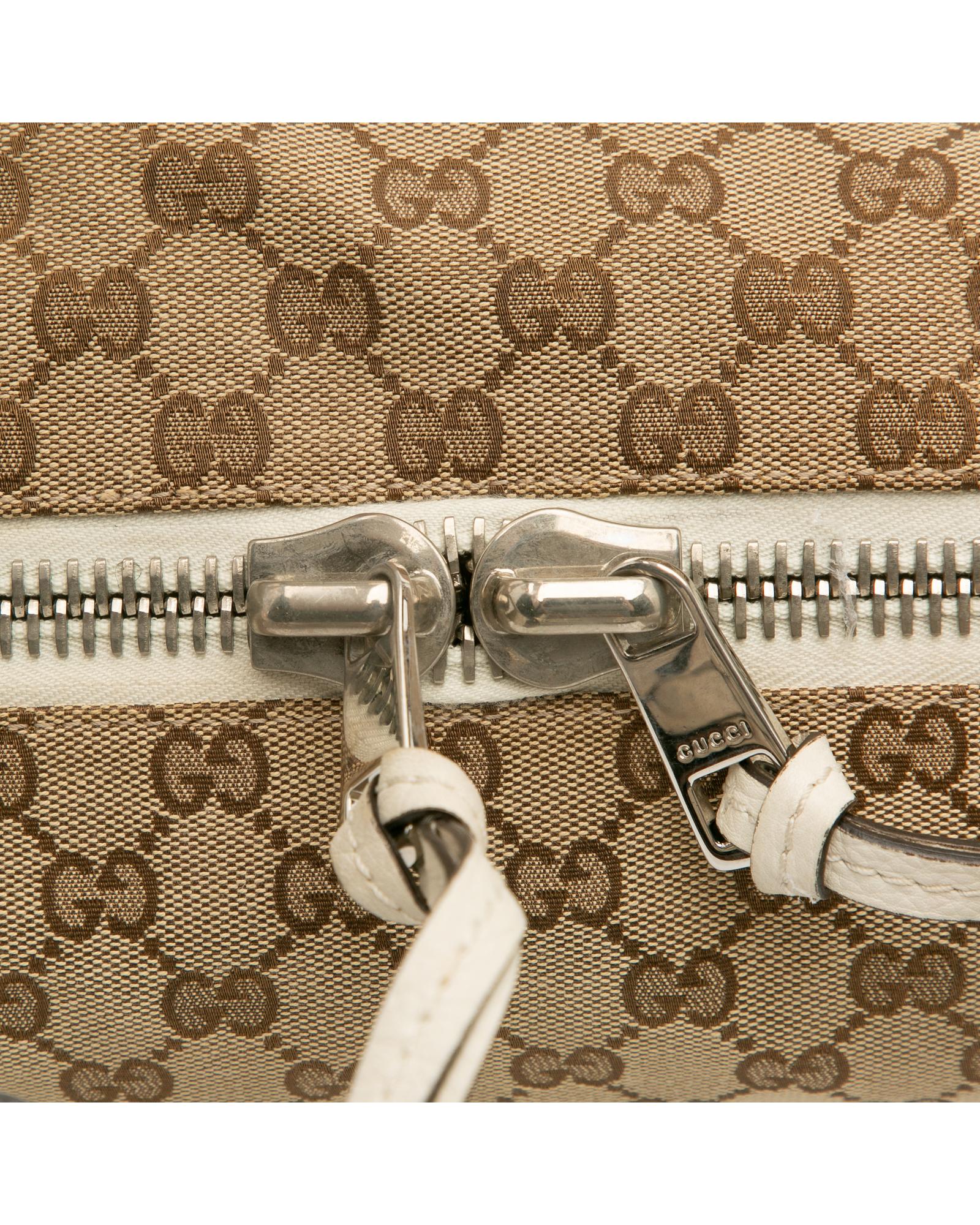 This tote features a canvas body with leather trim braided leather straps a top zip closure and interior zip and slip pockets.Brand: Gucci Vintage