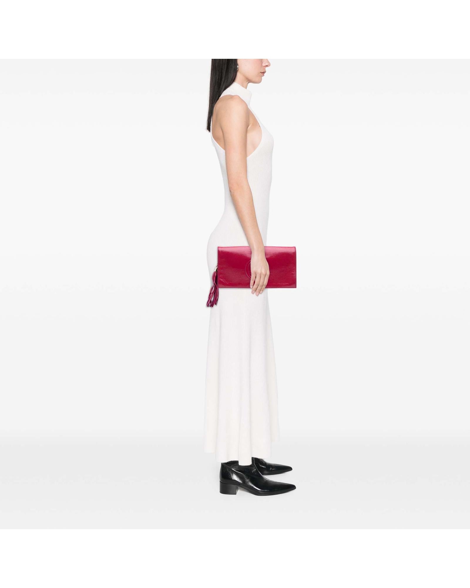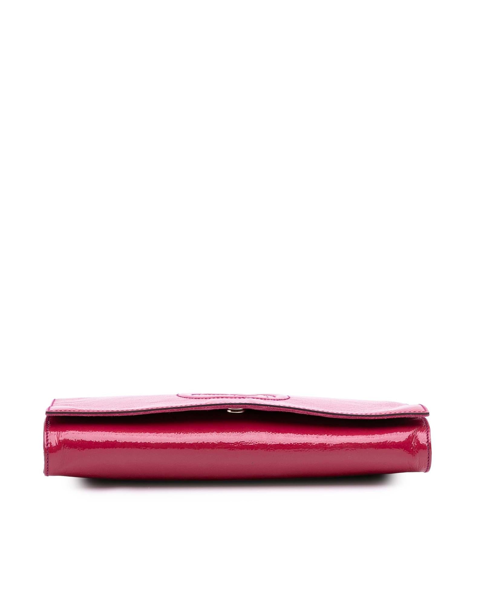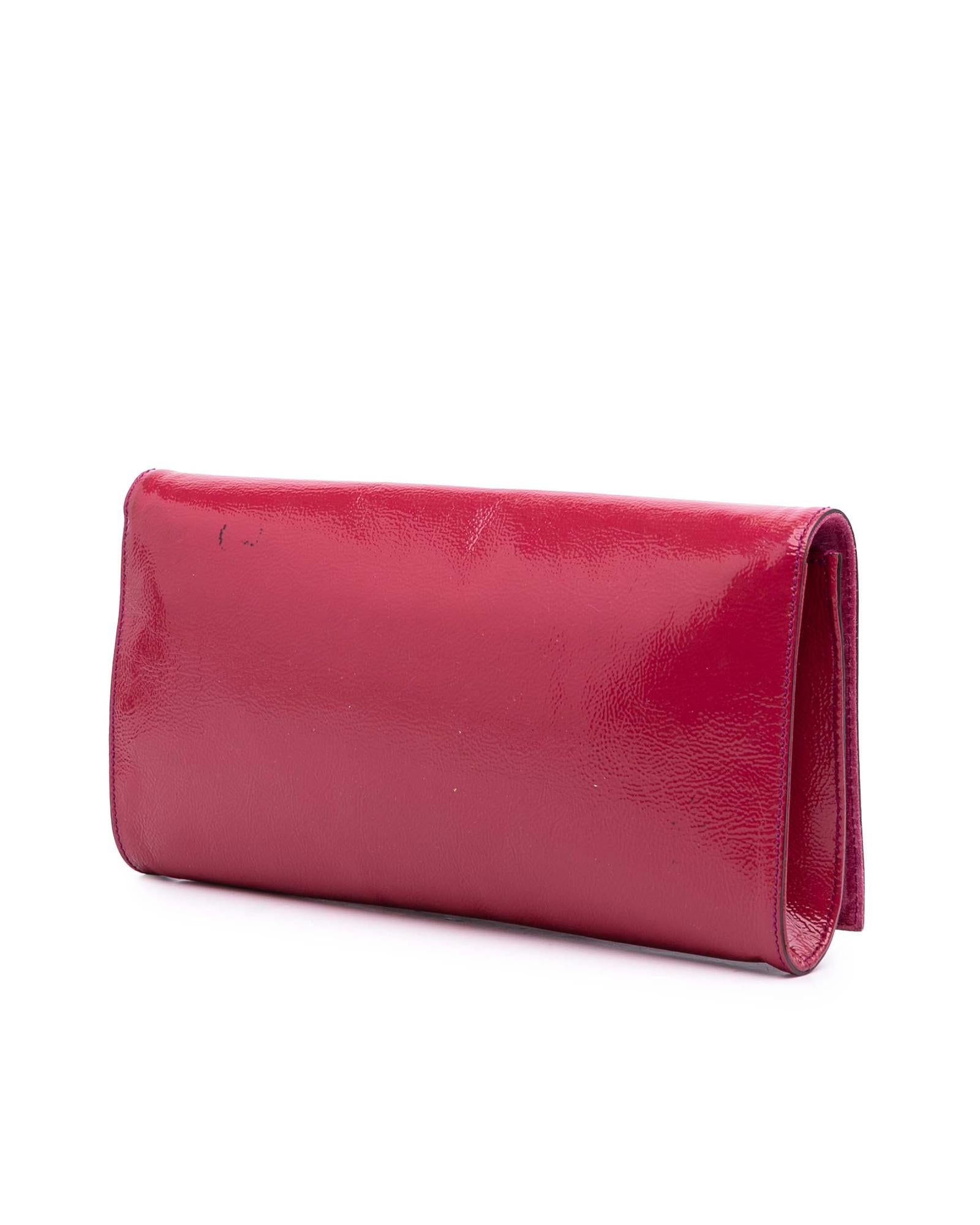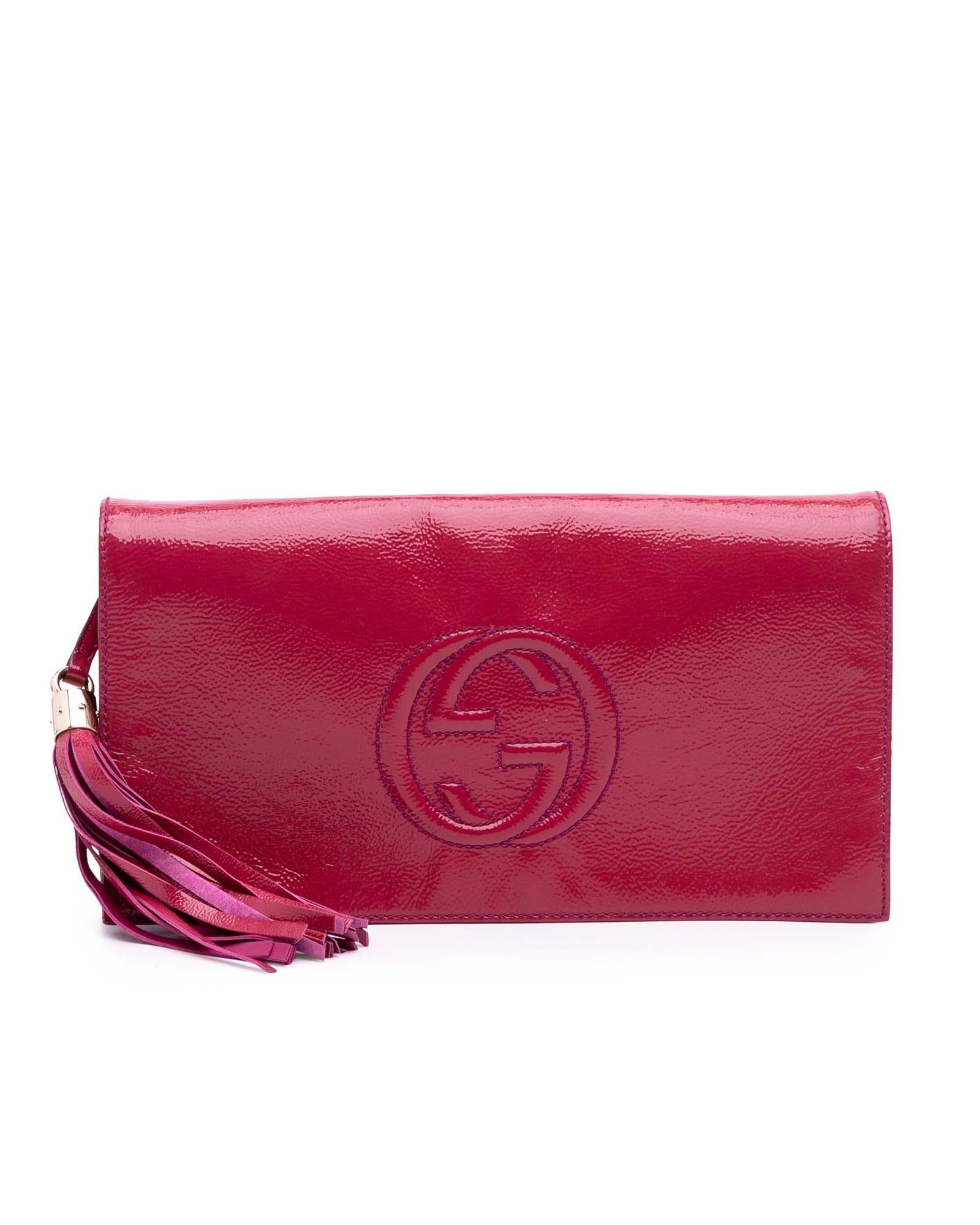 This clutch bag features a soft patent leather body a tassel detail a front flap with magnetic snap closure and interior zip and slip pockets.Brand: Gucci Vintage