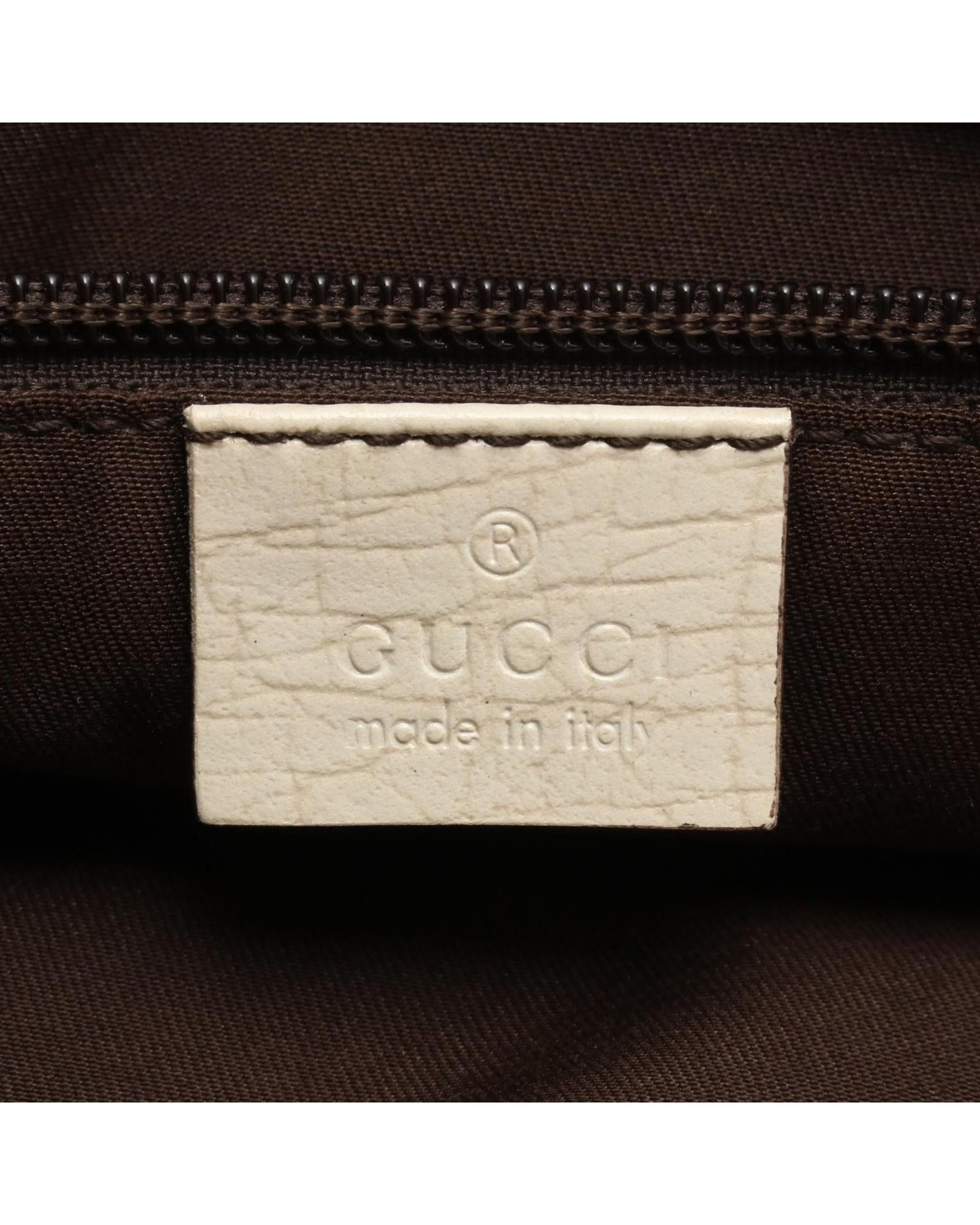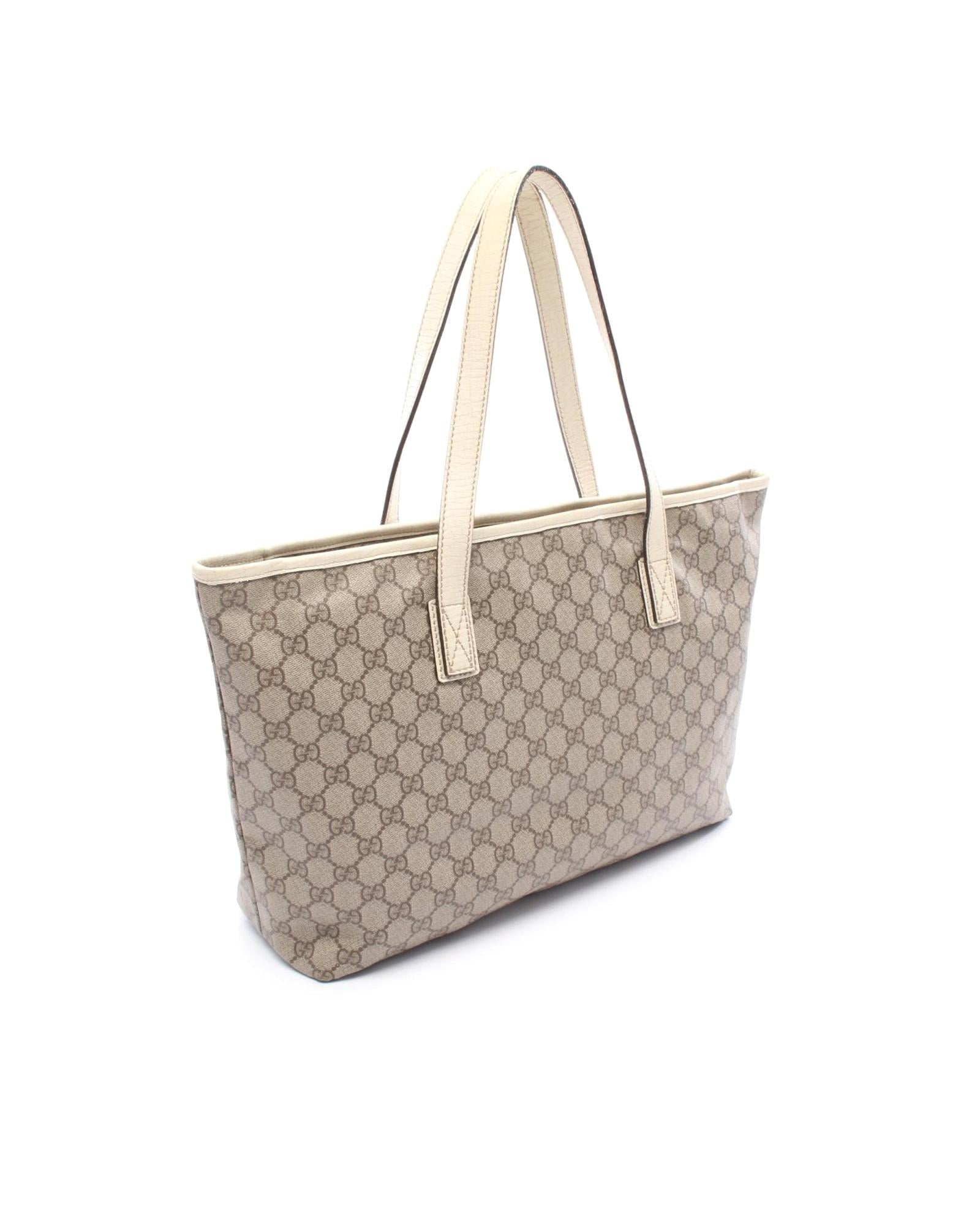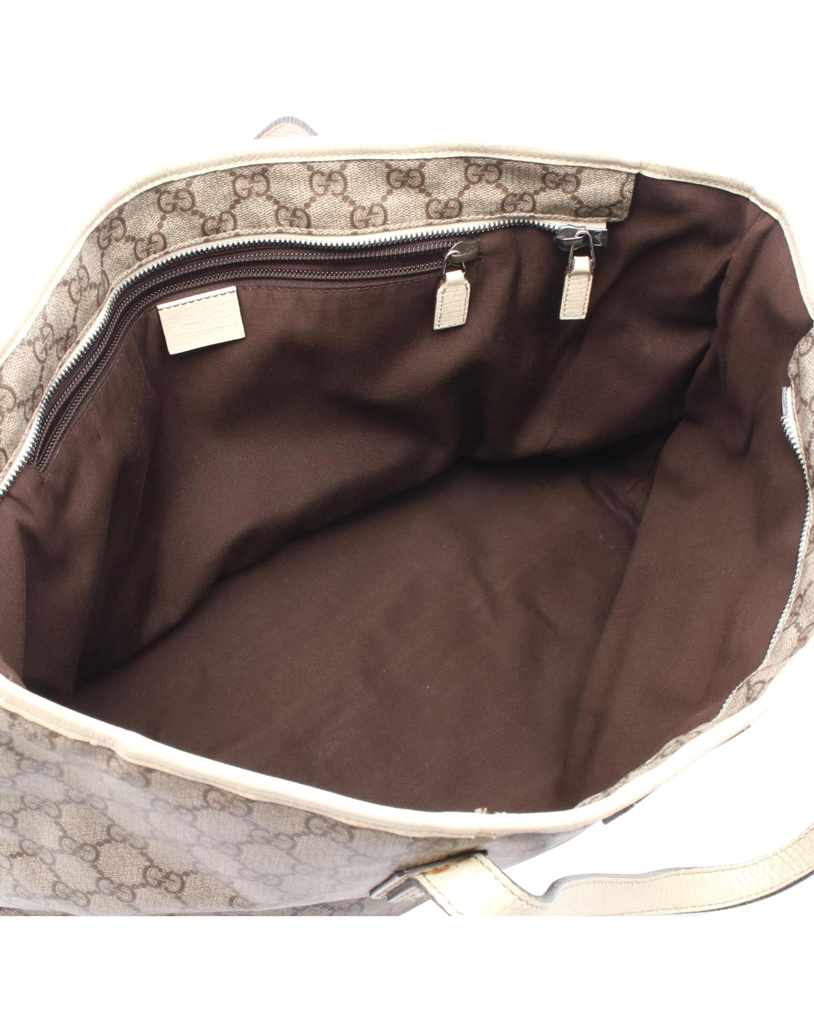 This tote bag features a coated canvas body with leather trim flat leather straps a top zip closure and interior zip and slip pockets.Brand: Gucci Vintage