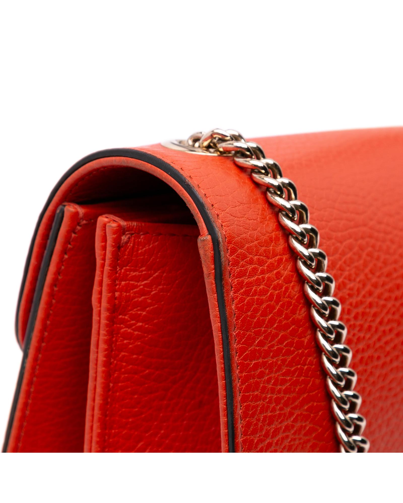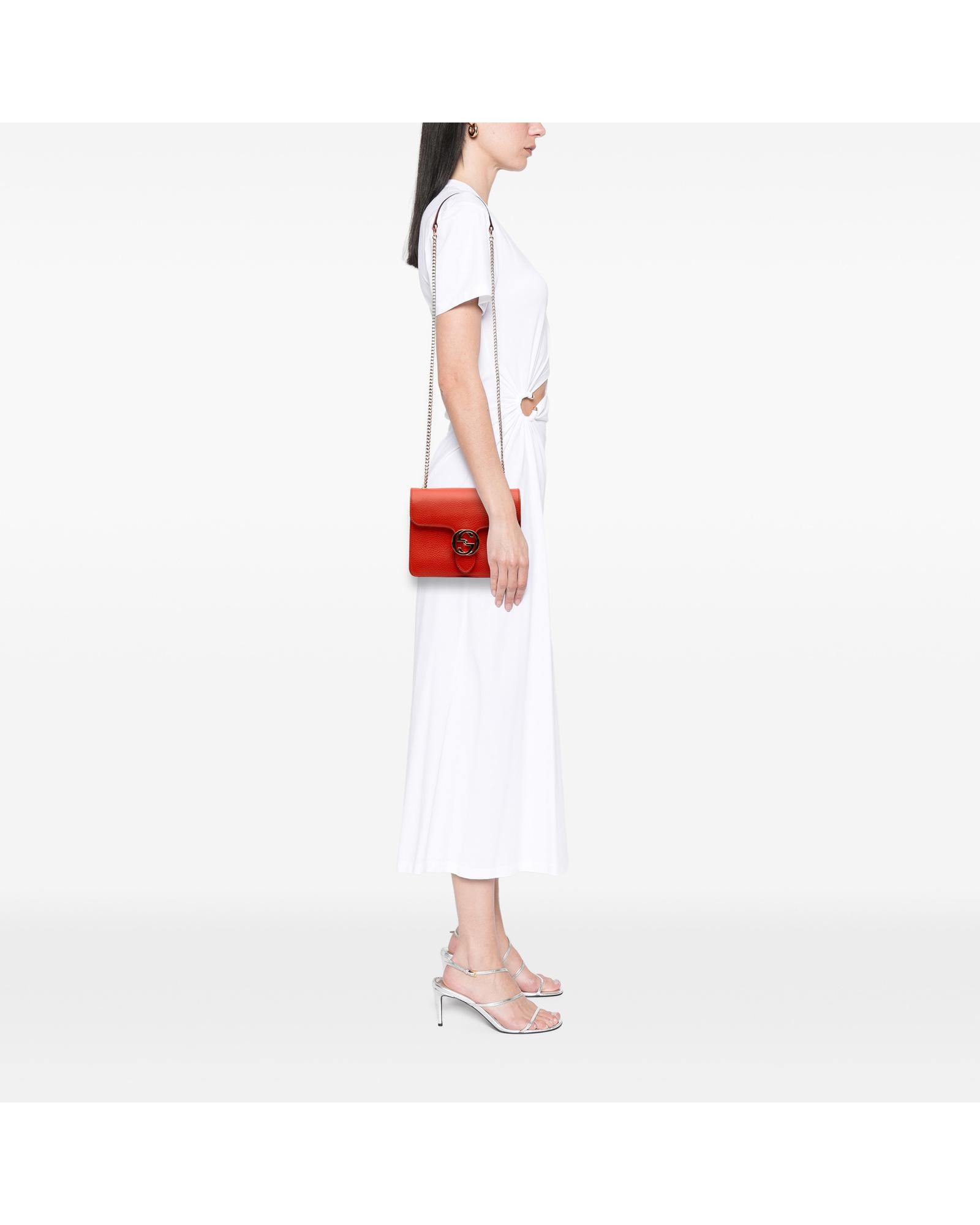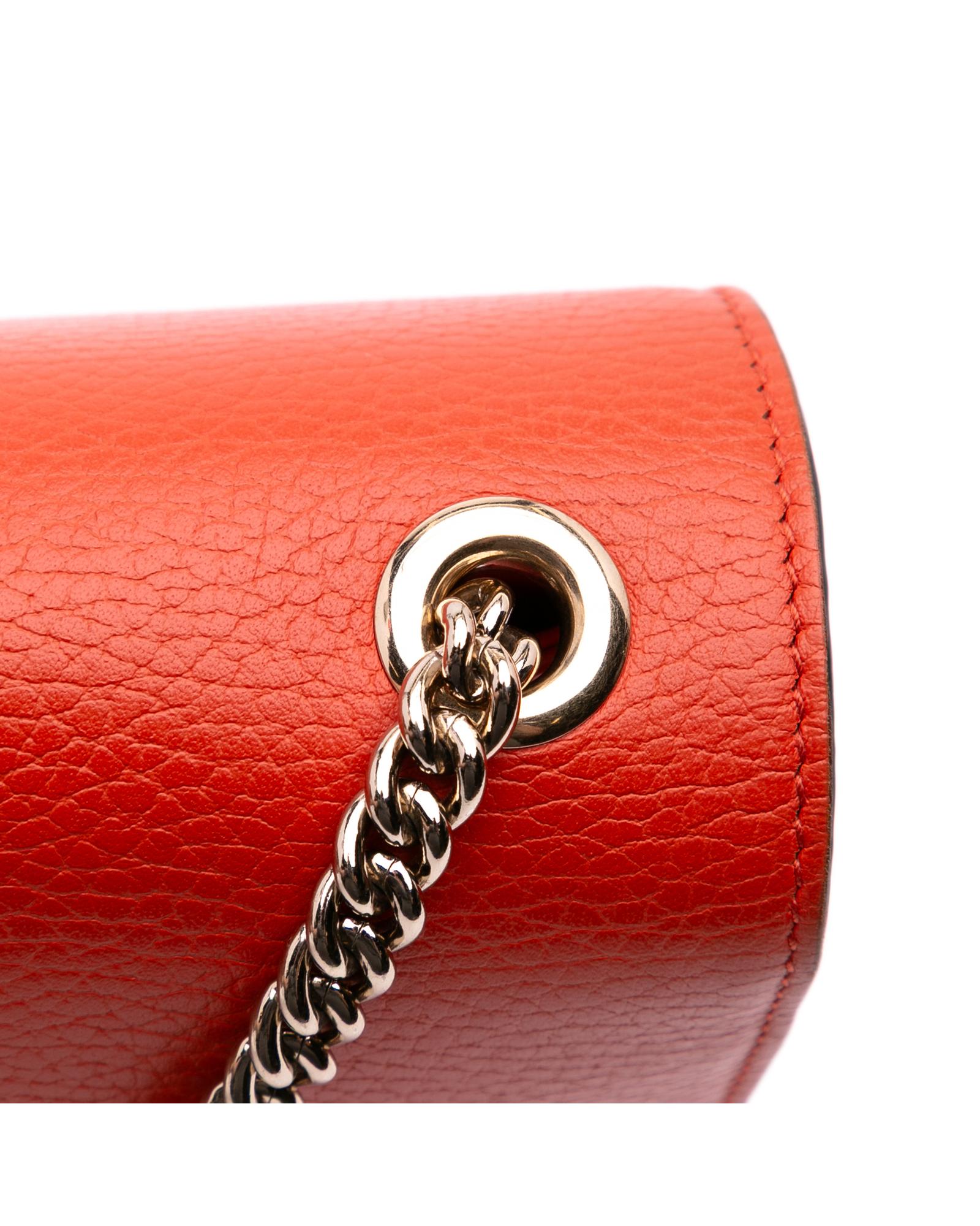 This crossbody bag features a leather body a chain-link shoulder strap with leather shoulder guard a front flap with silver-tone interlocking GG flip-lock closure interior compartments and an interior slip pocket.