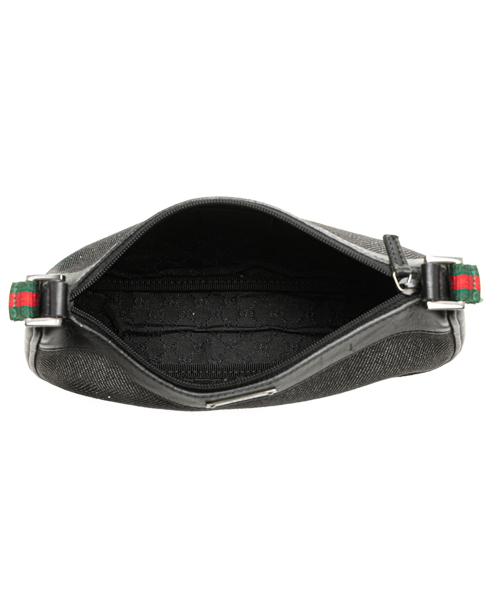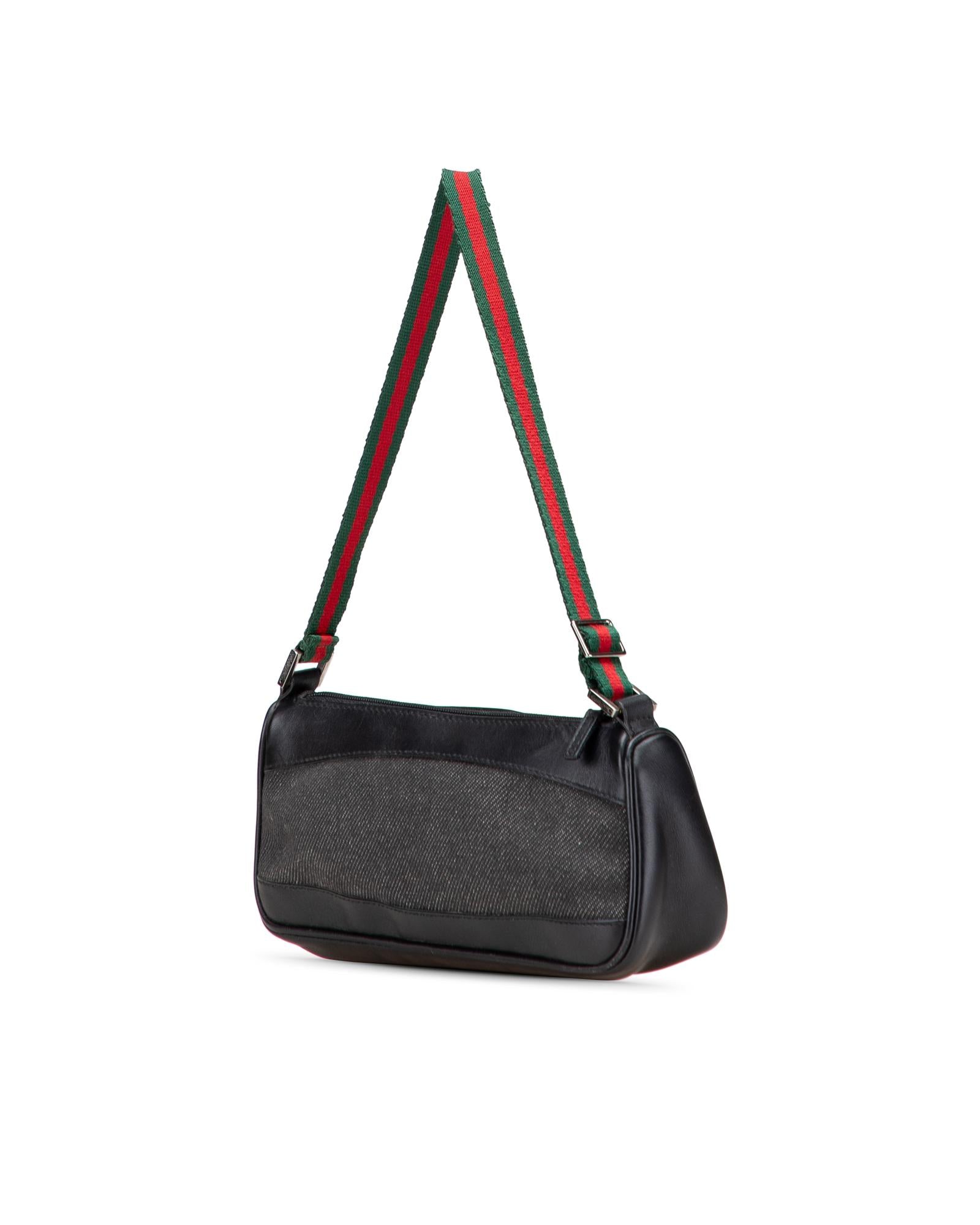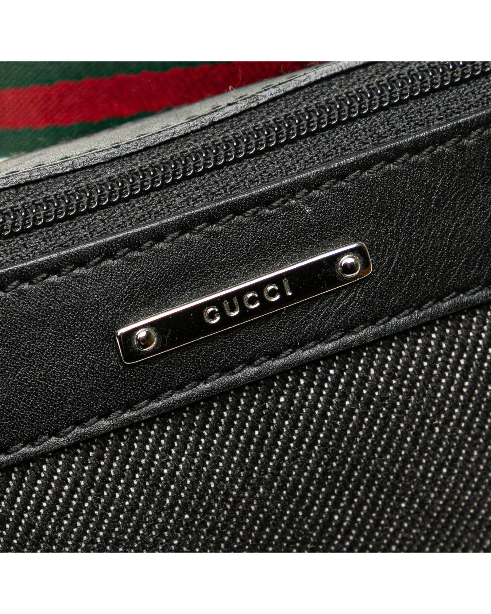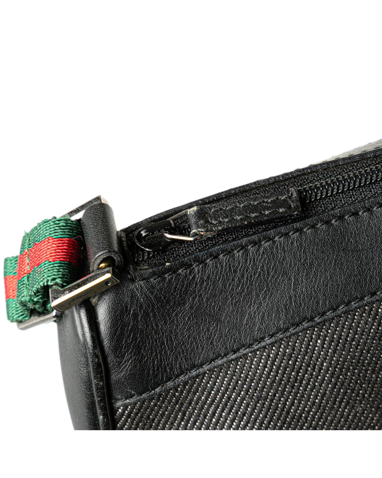 This shoulder bag features a denim body with leather trim an adjustable flat canvas strap with web detail and a top zip closure.Brand: Gucci Vintage