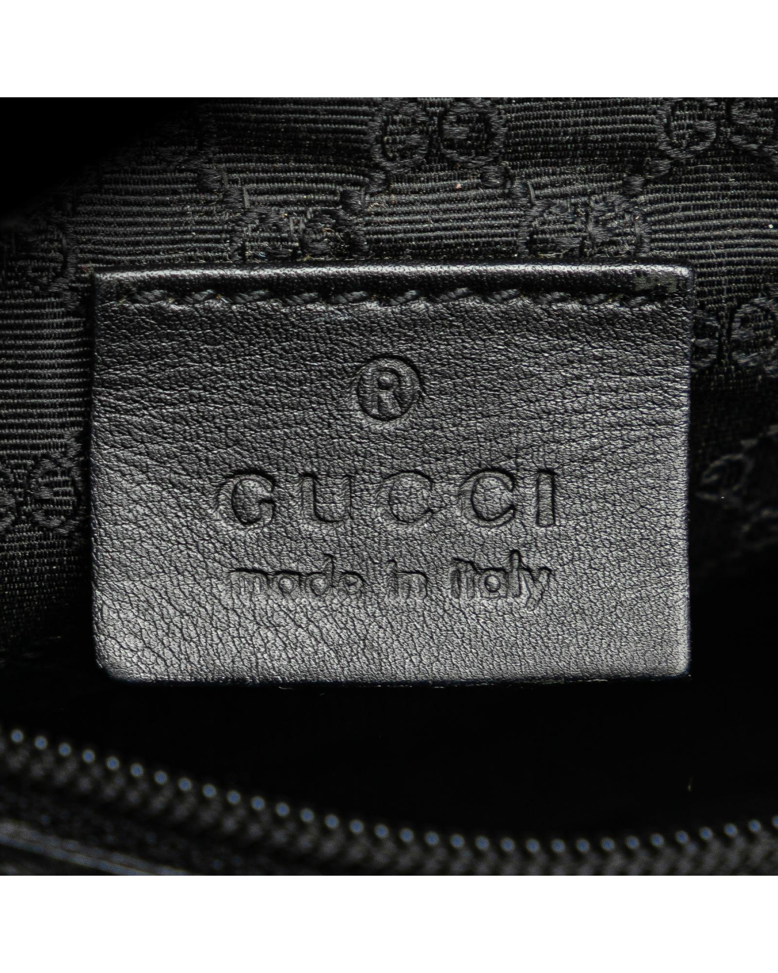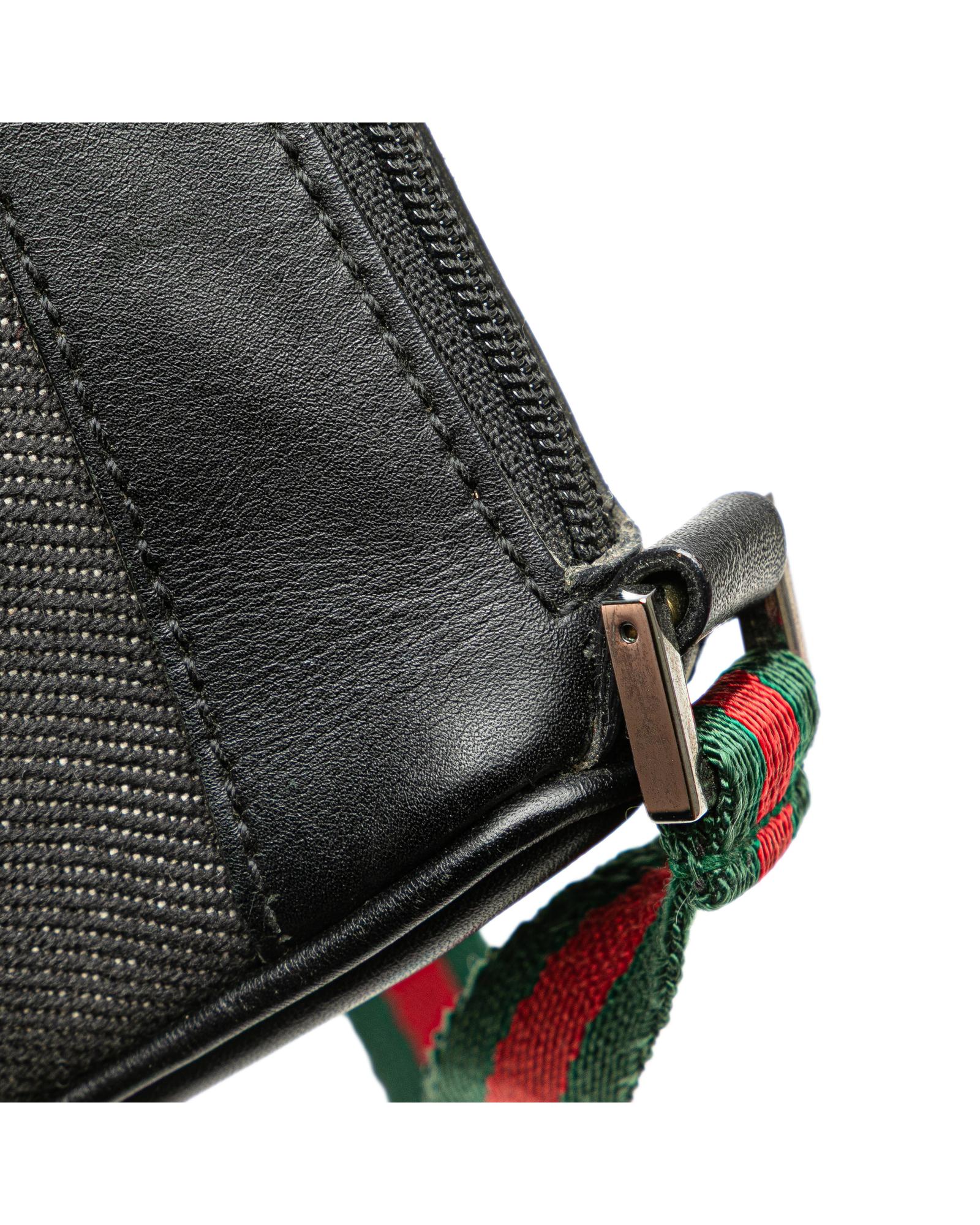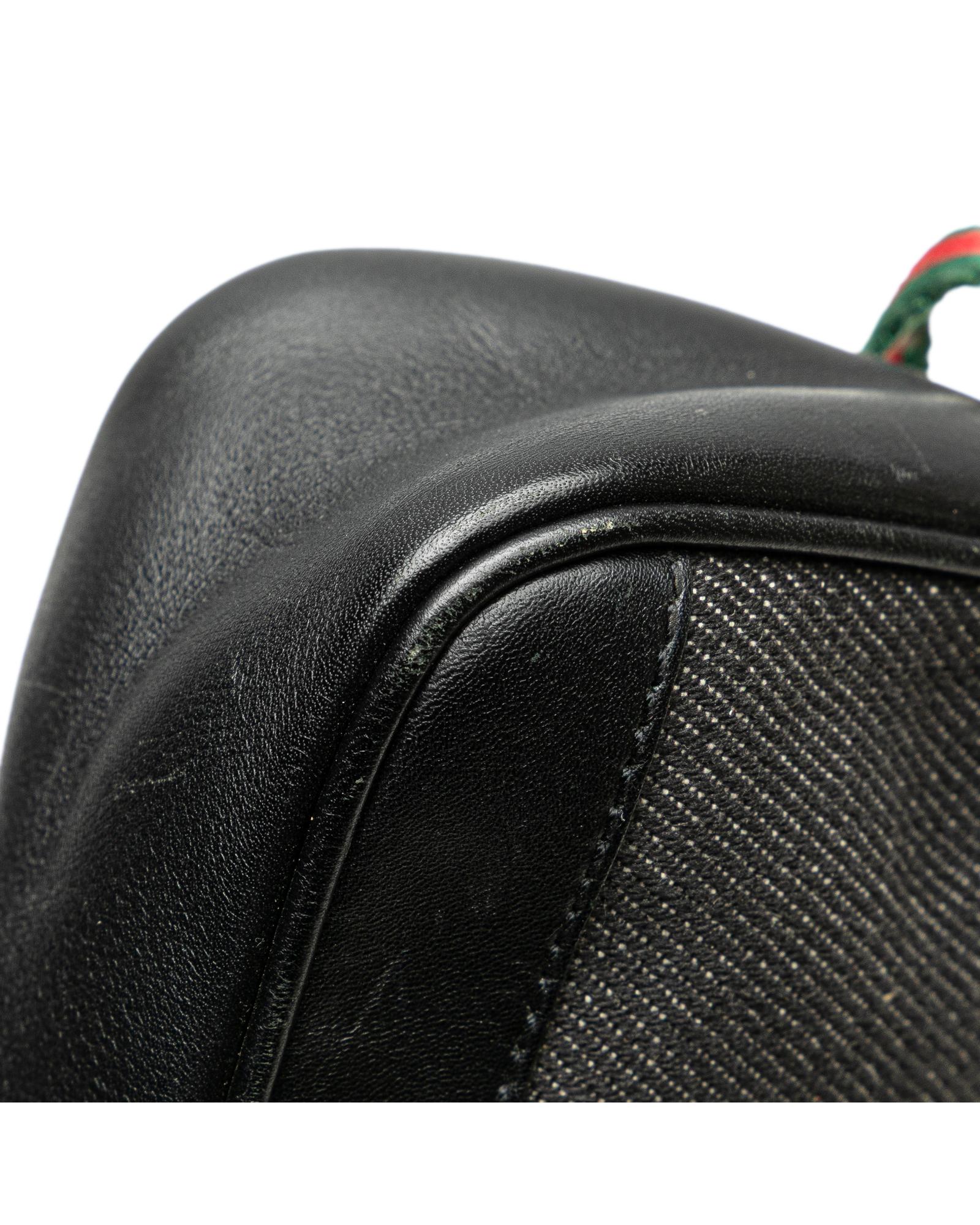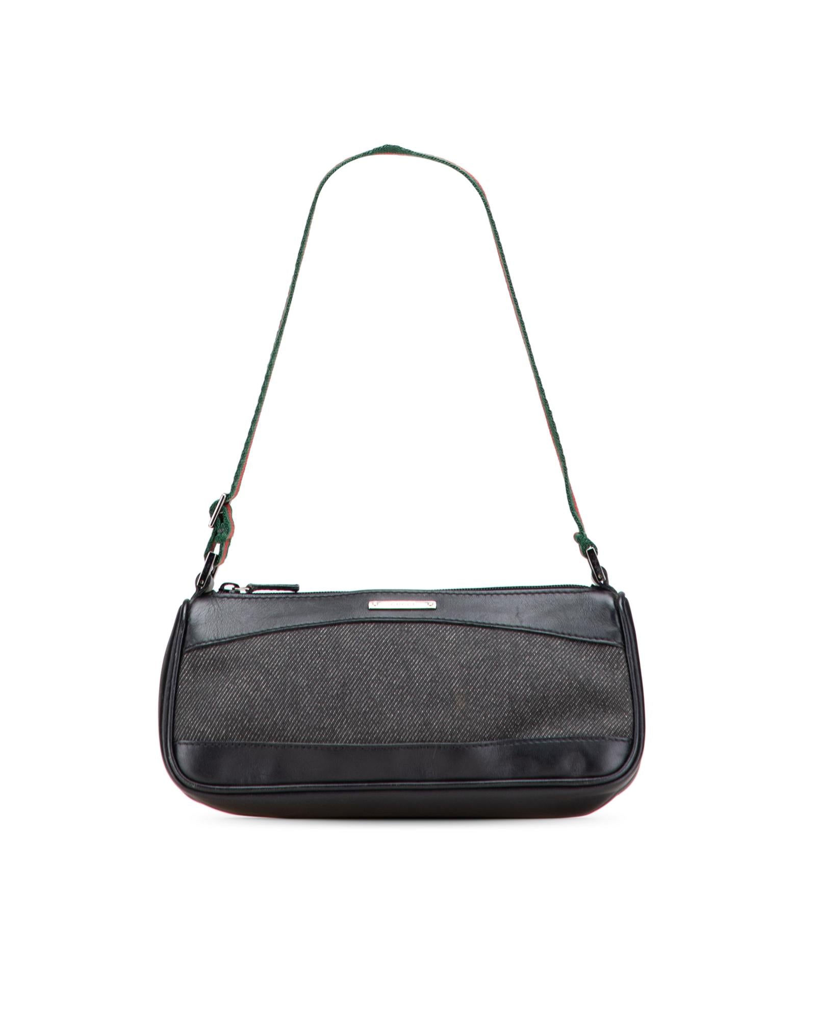 This shoulder bag features a denim body with leather trim an adjustable flat canvas strap with web detail and a top zip closure.Brand: Gucci Vintage