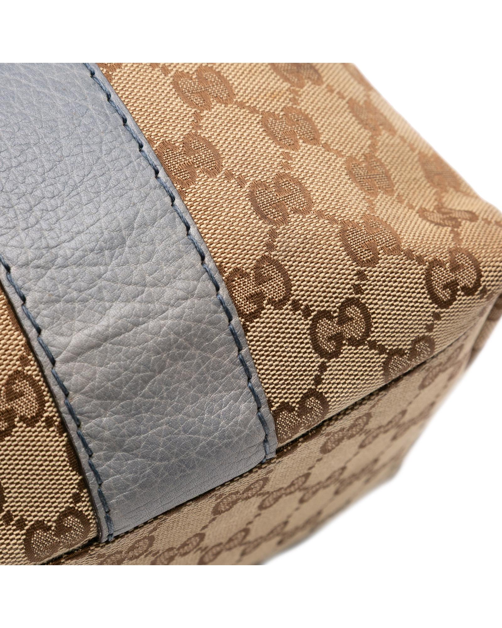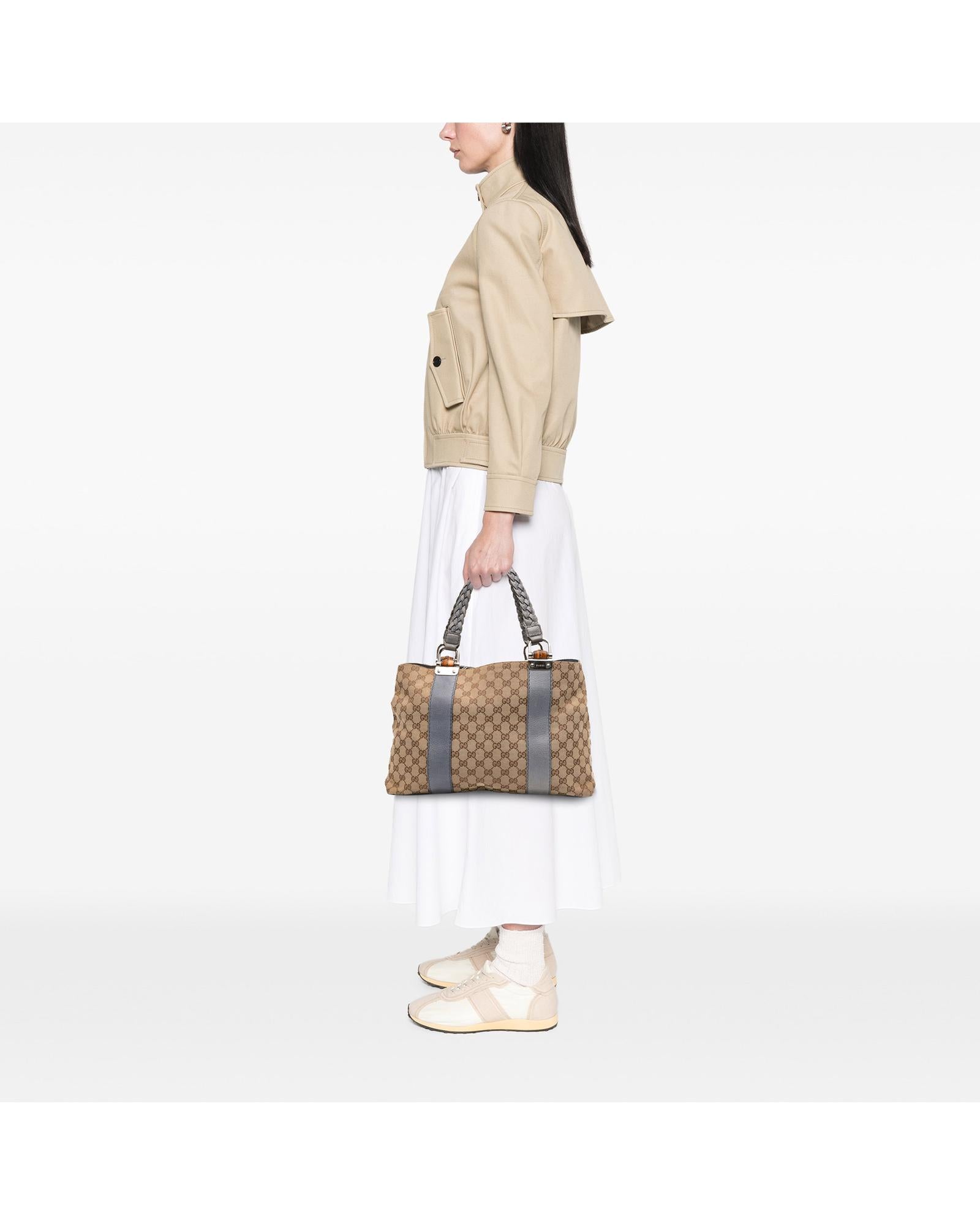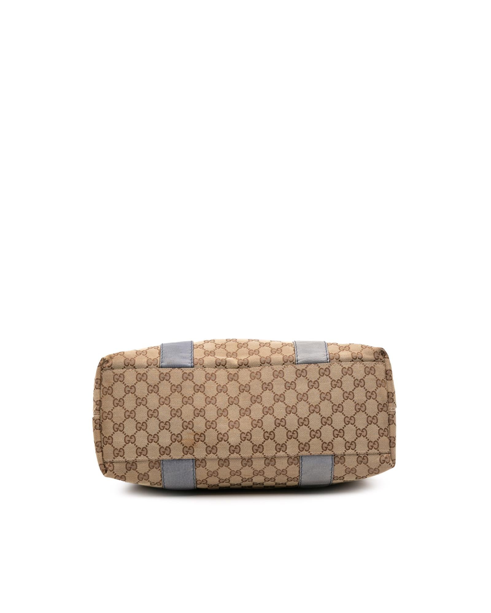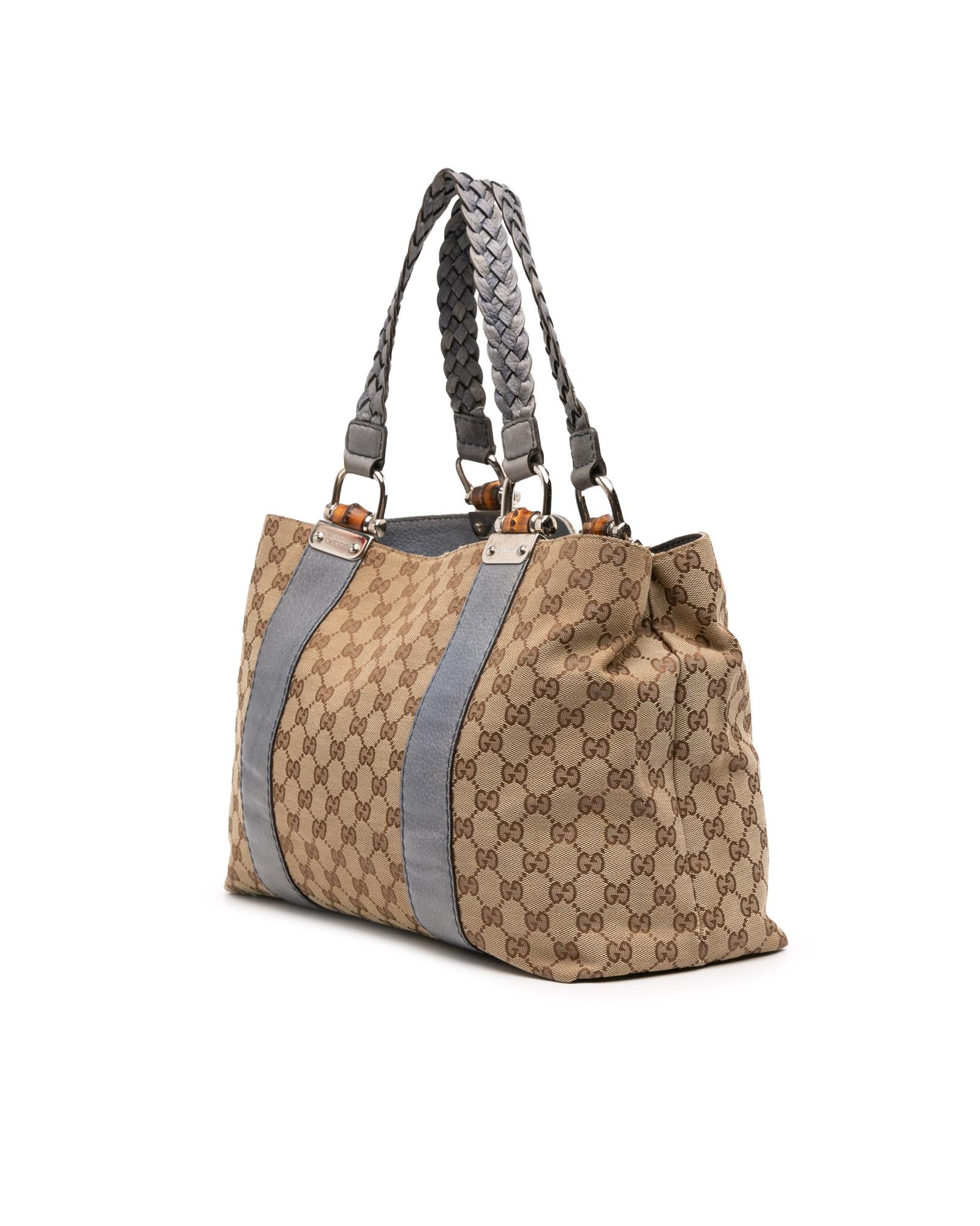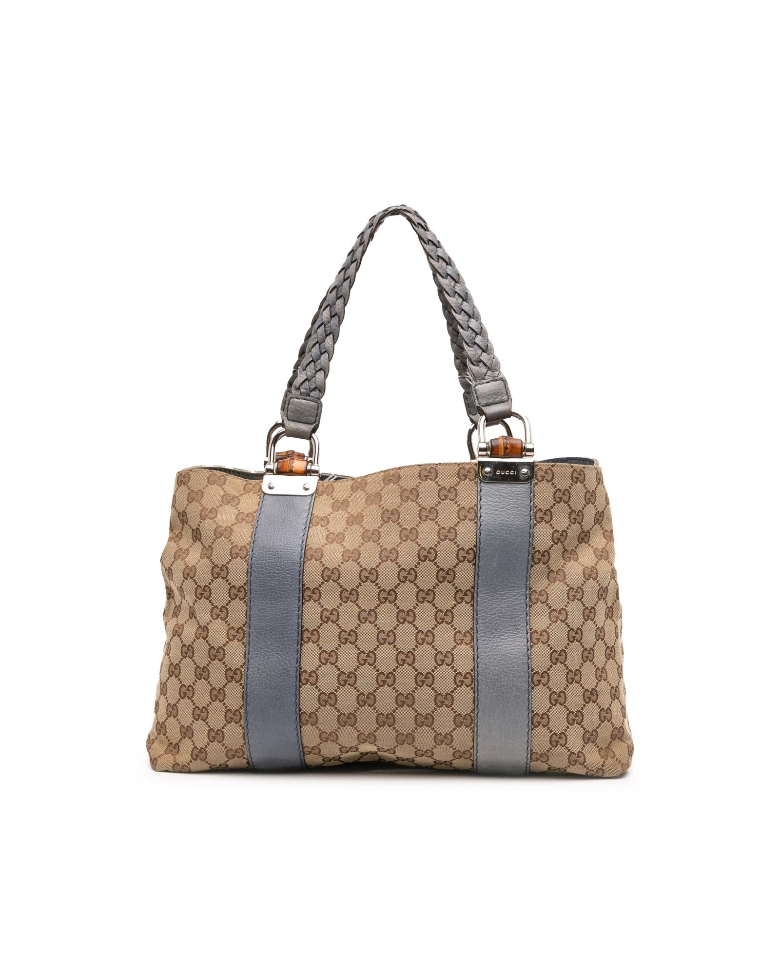 This tote bag features a canvas body with leather trim flat braided straps an open top an interior zip compartment and interior zip and slip pockets.Brand: Gucci Vintage