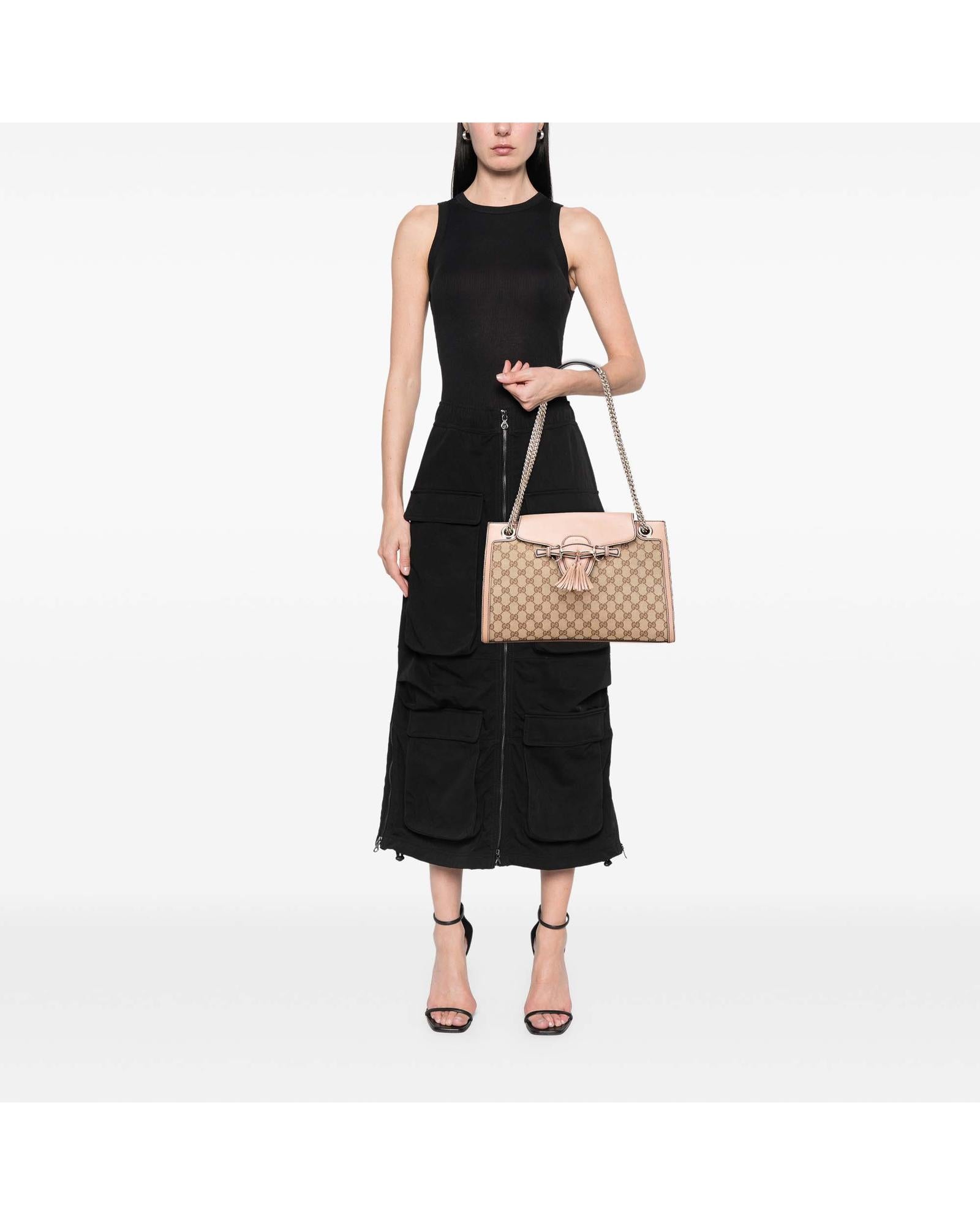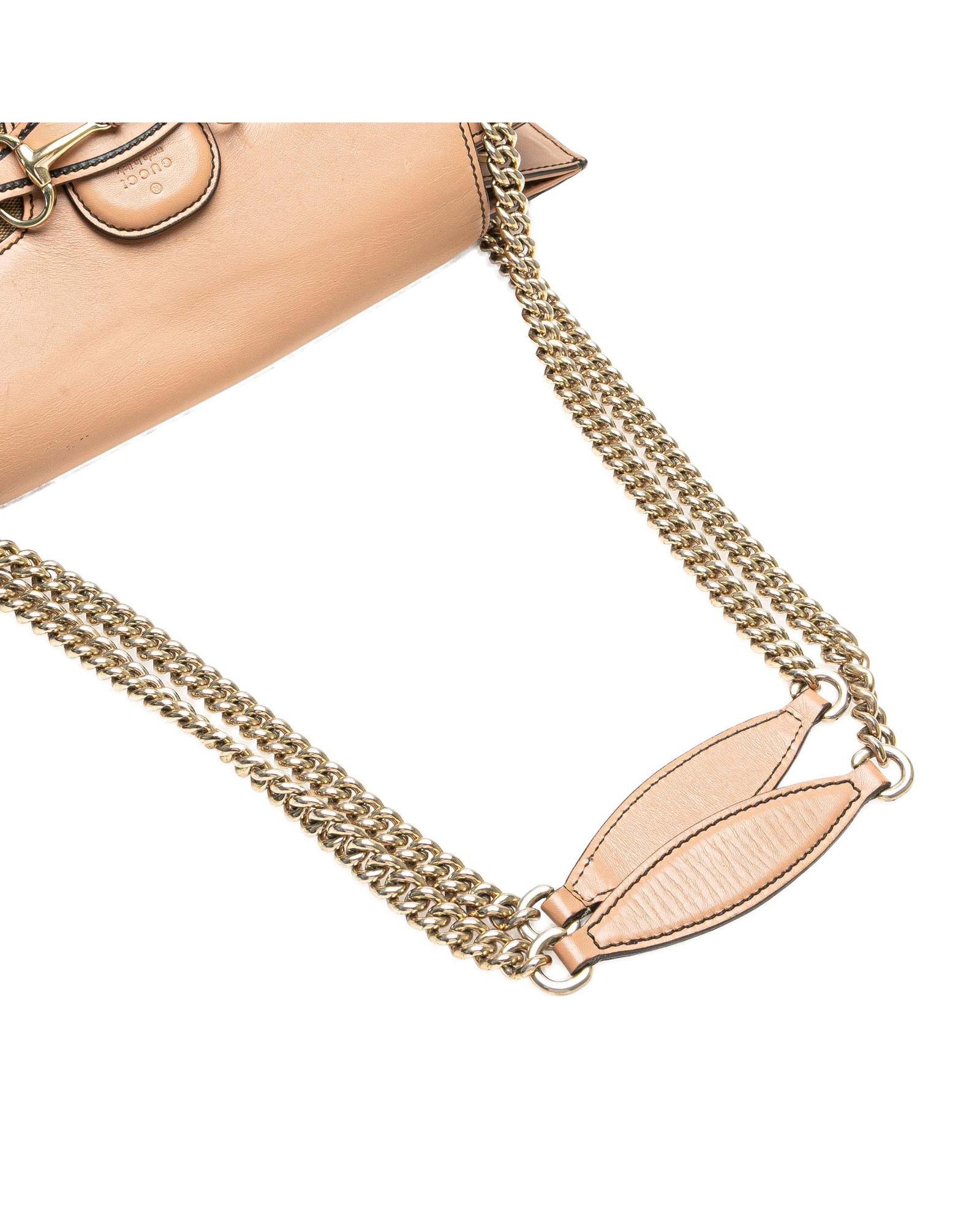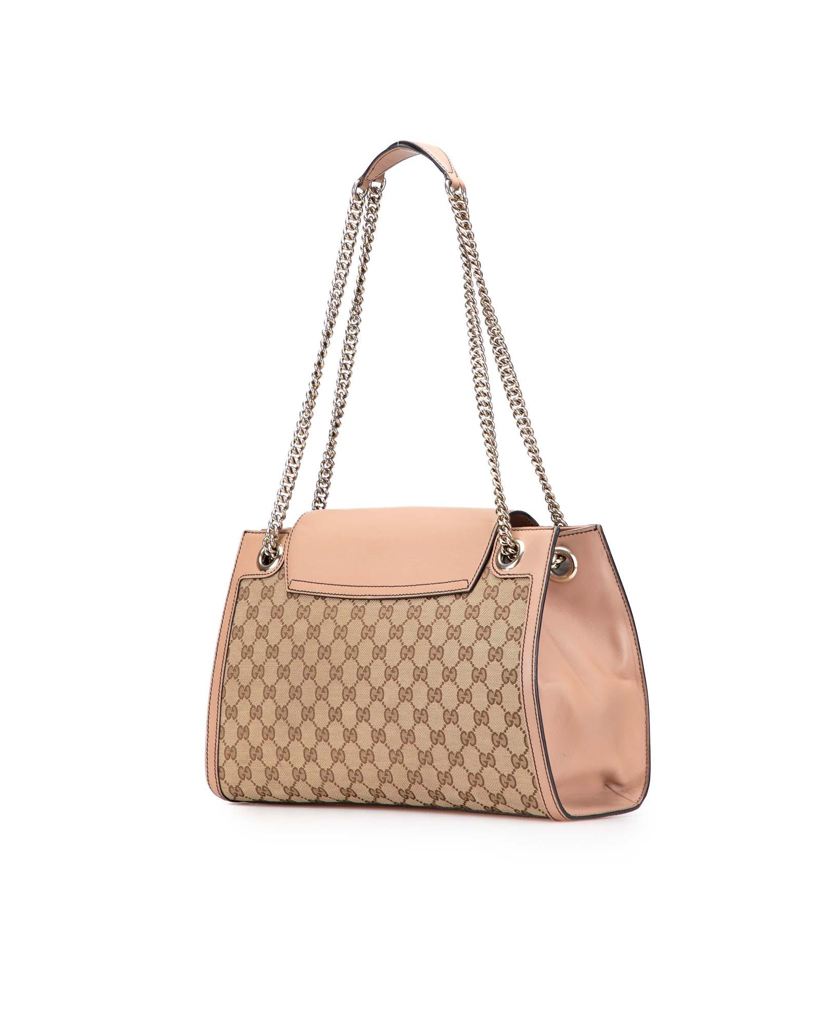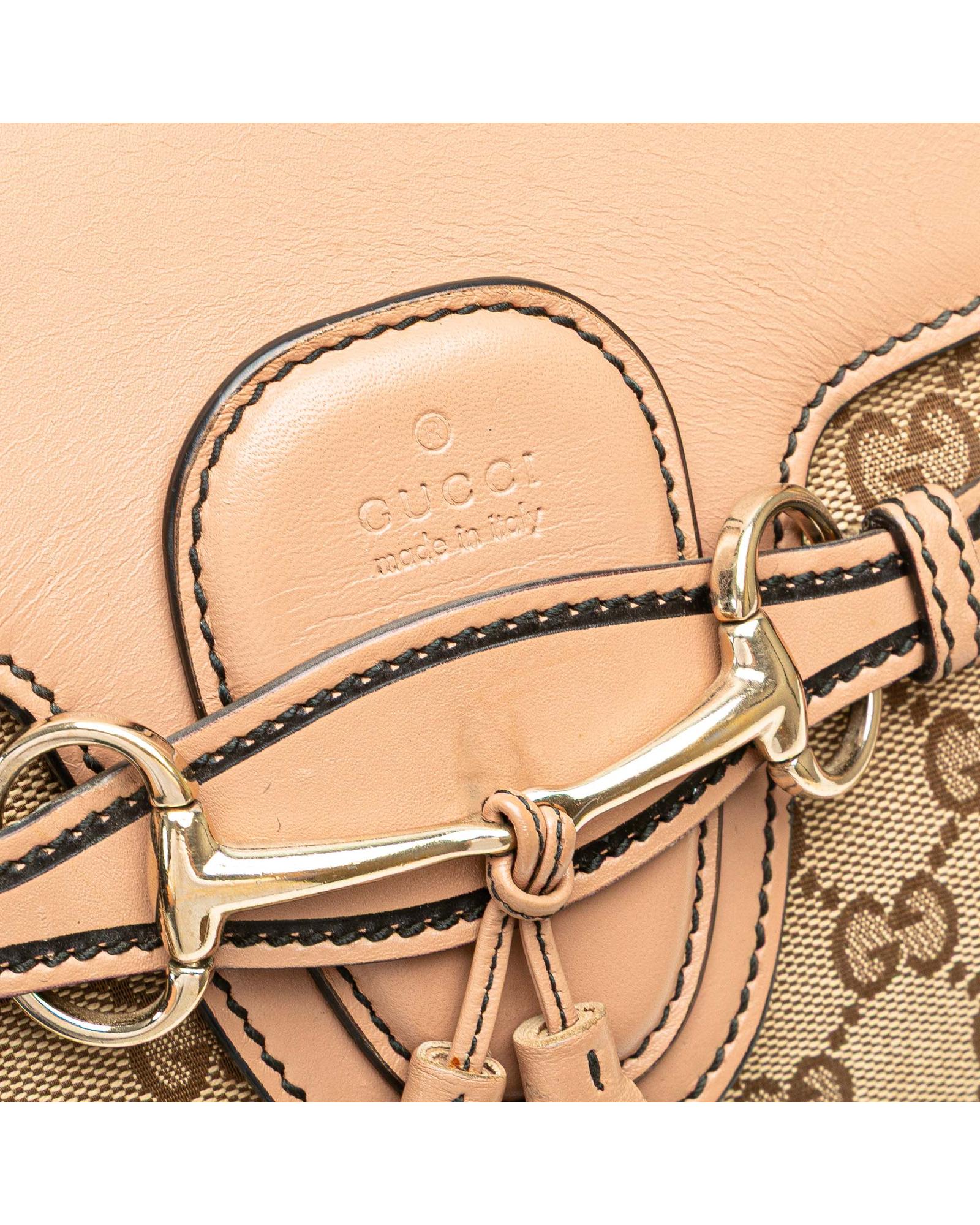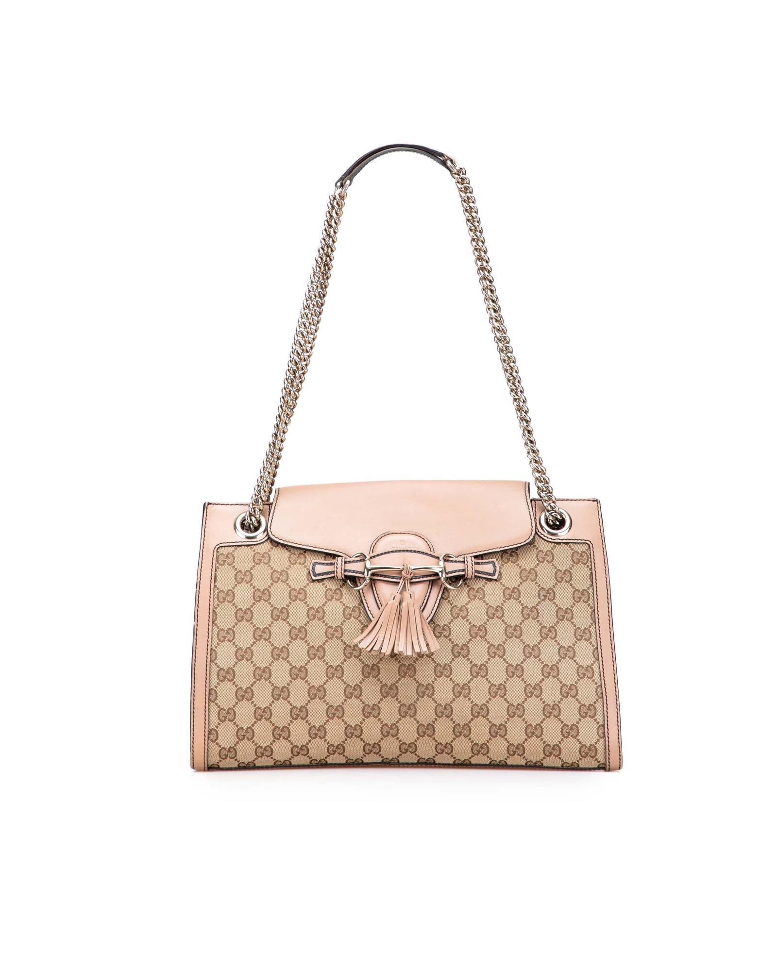 The Emily shoulder bag features a canvas body with leather trim chain straps with flat leather shoulder guards a front flap with slip through closure and interior zip and open pockets.Brand: Gucci Vintage