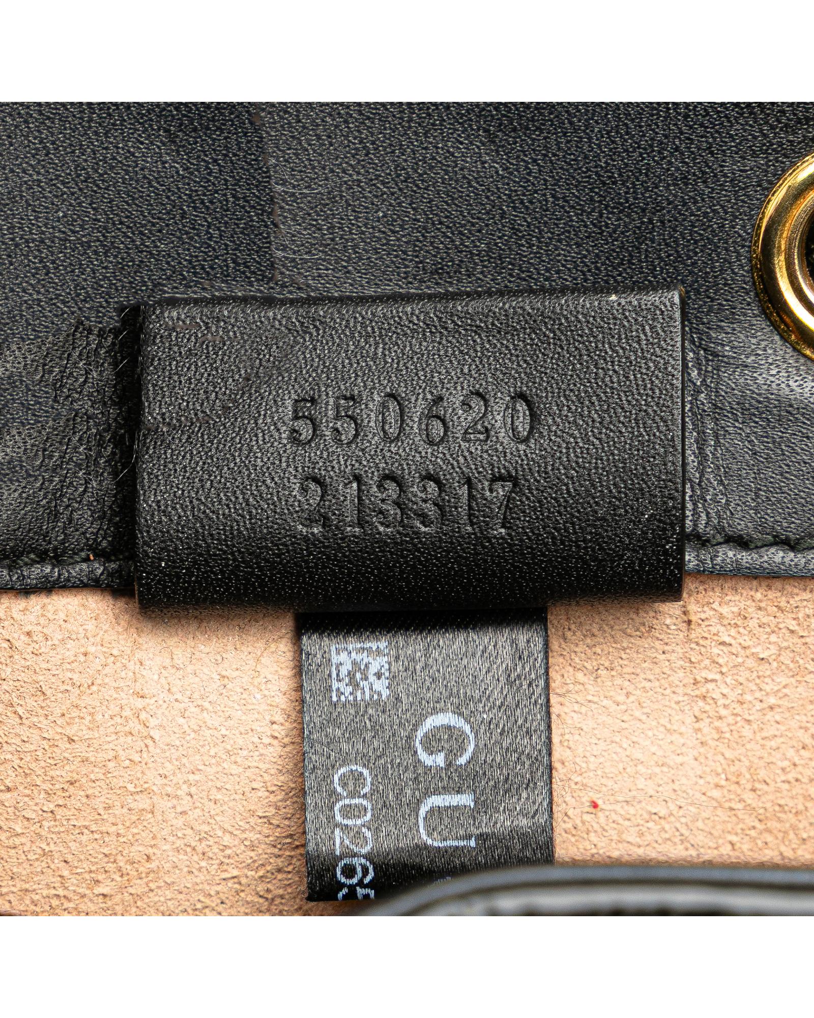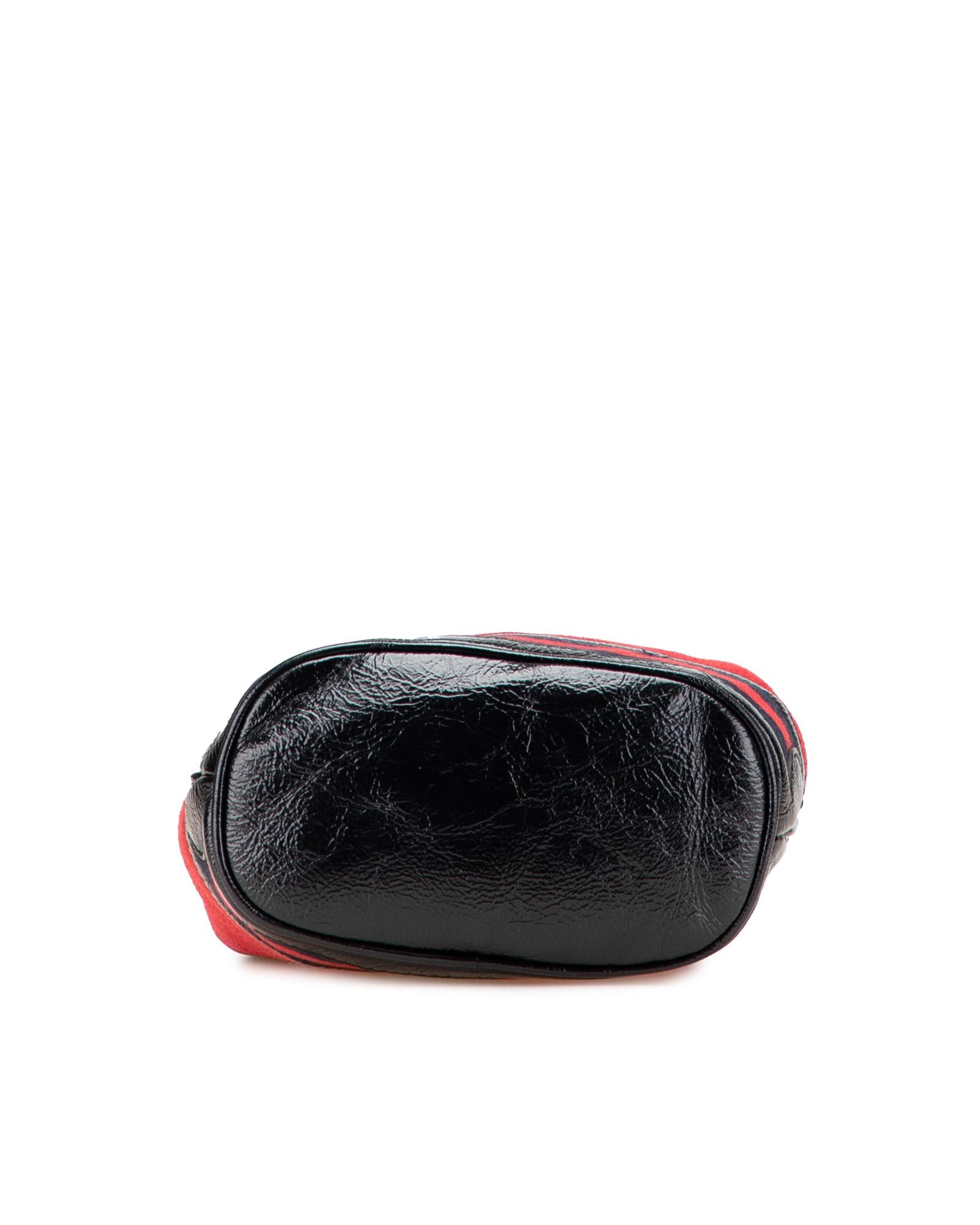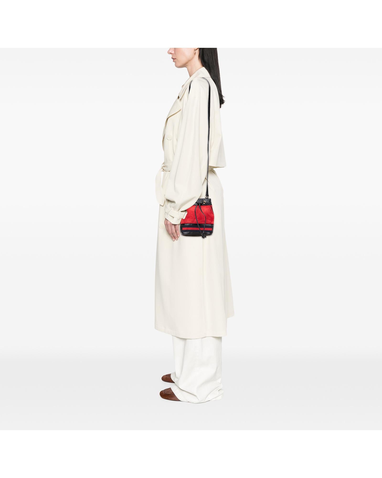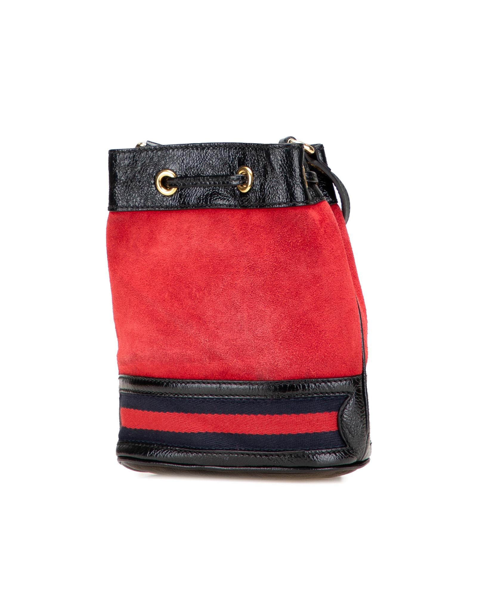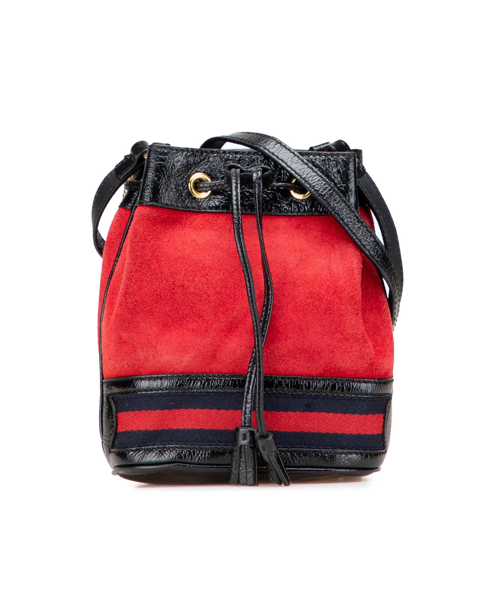The Ophidia bucket bag features a suede body with patent leather trim an adjustable flat leather strap and a top drawstring closure.Brand: Gucci Vintage