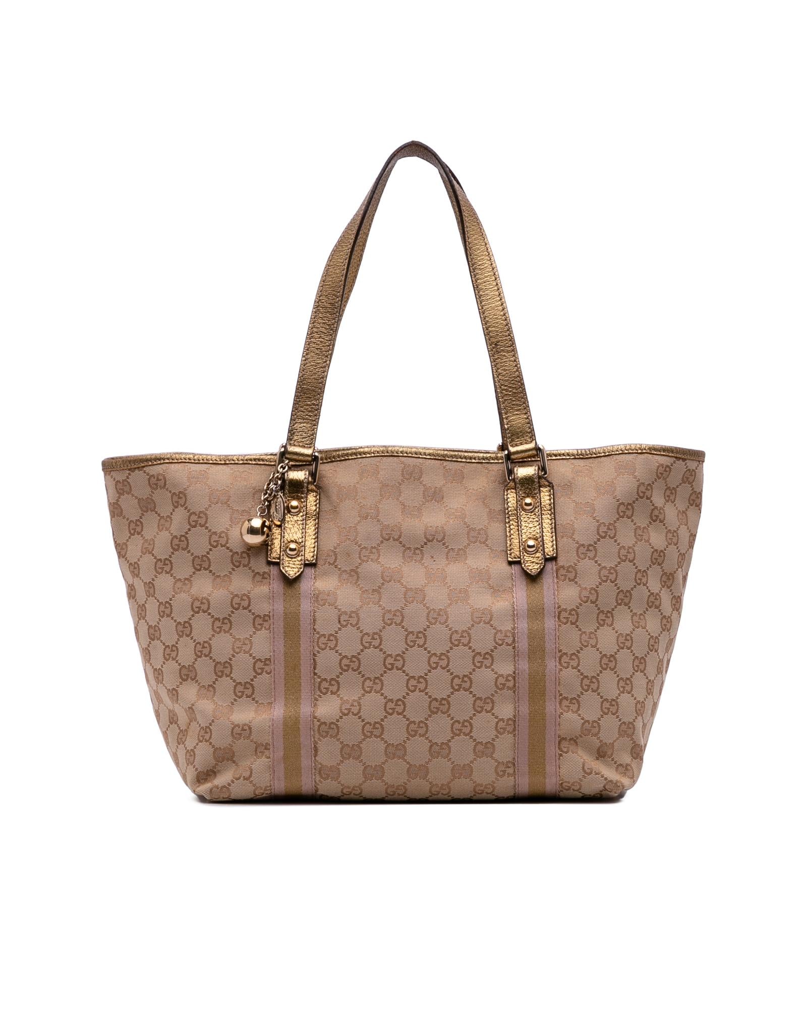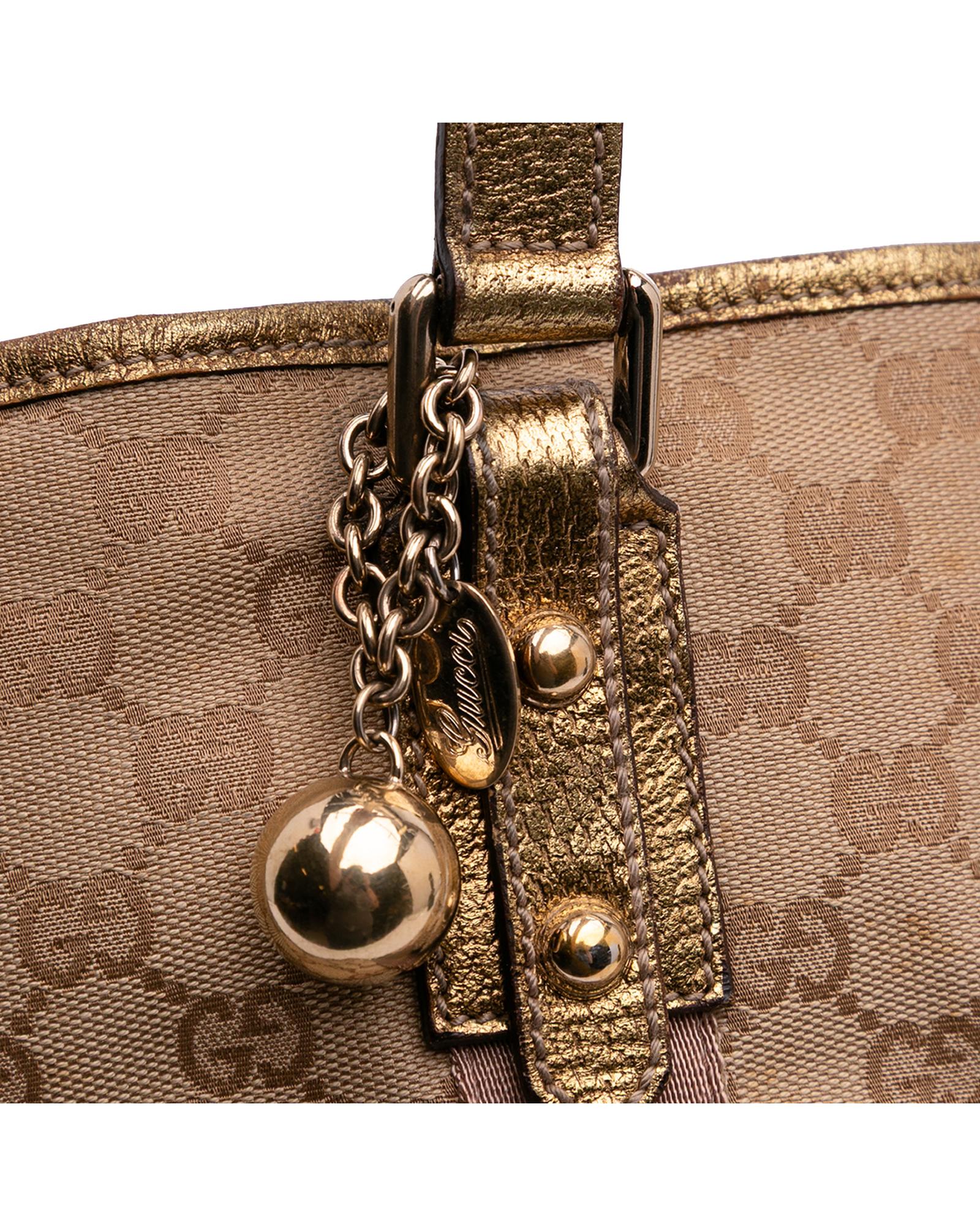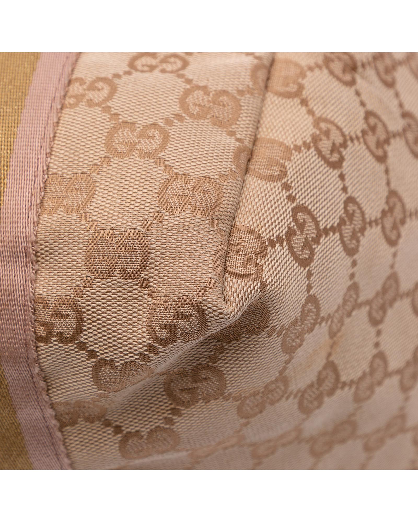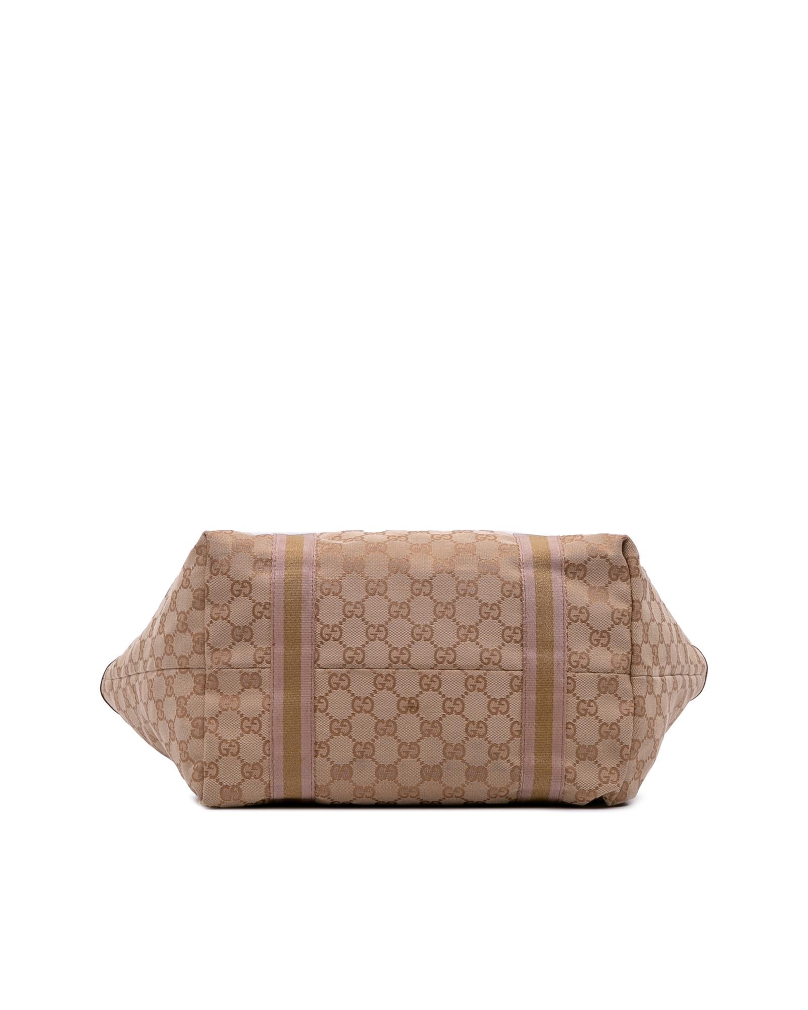 This tote bag features a canvas body with metallic leather trim flat leather straps an open top and interior zip and slip pockets.Brand: Gucci Vintage