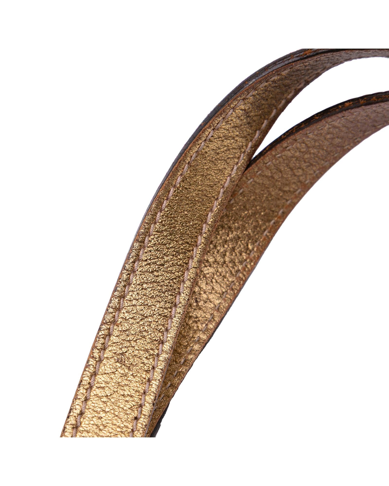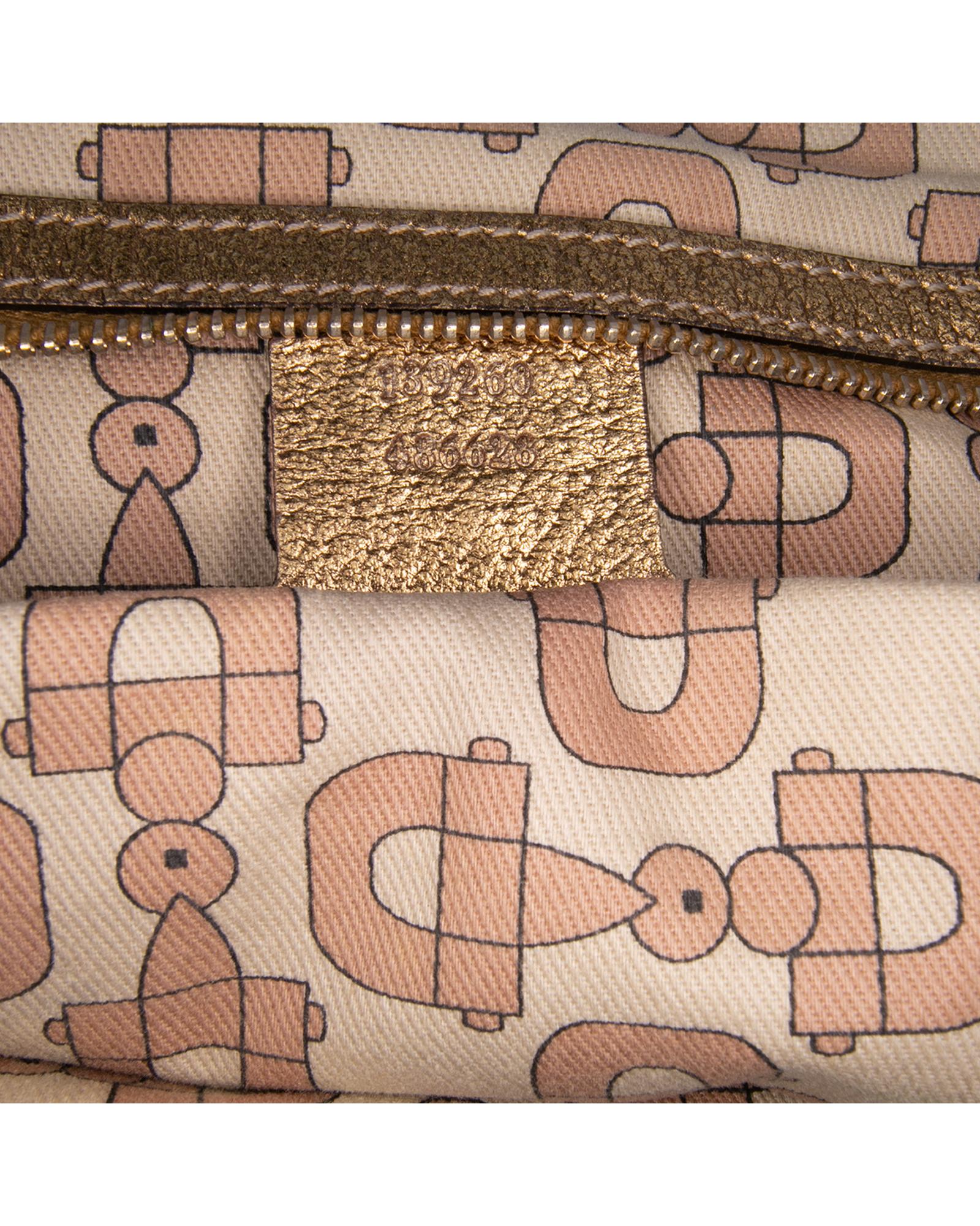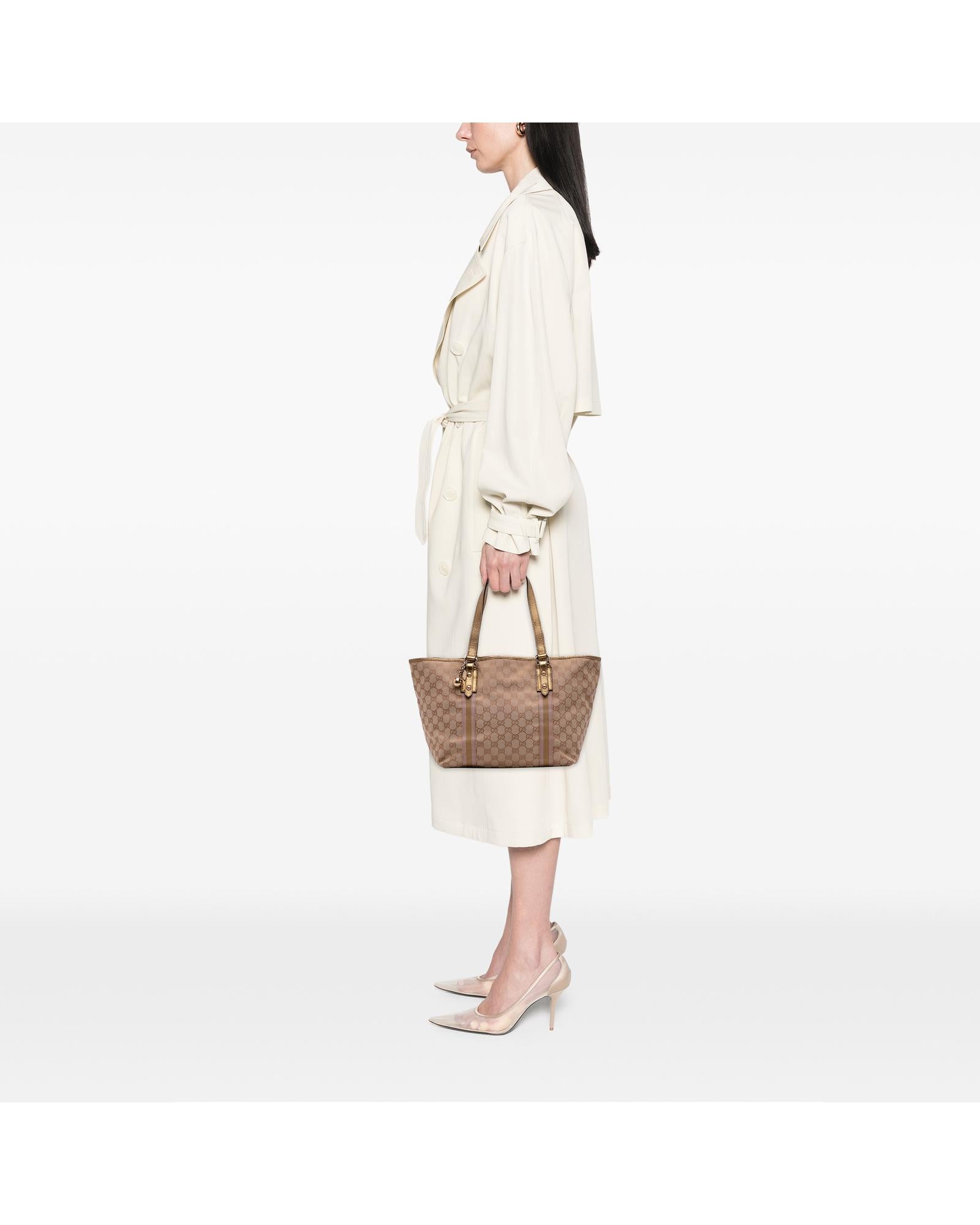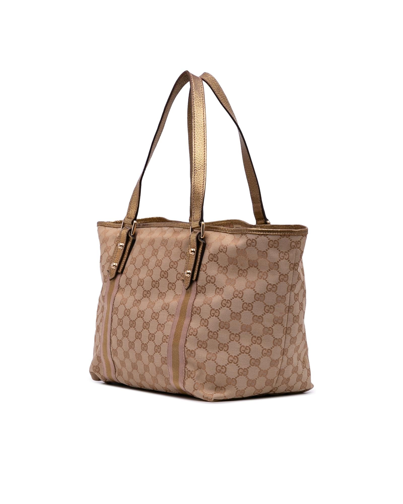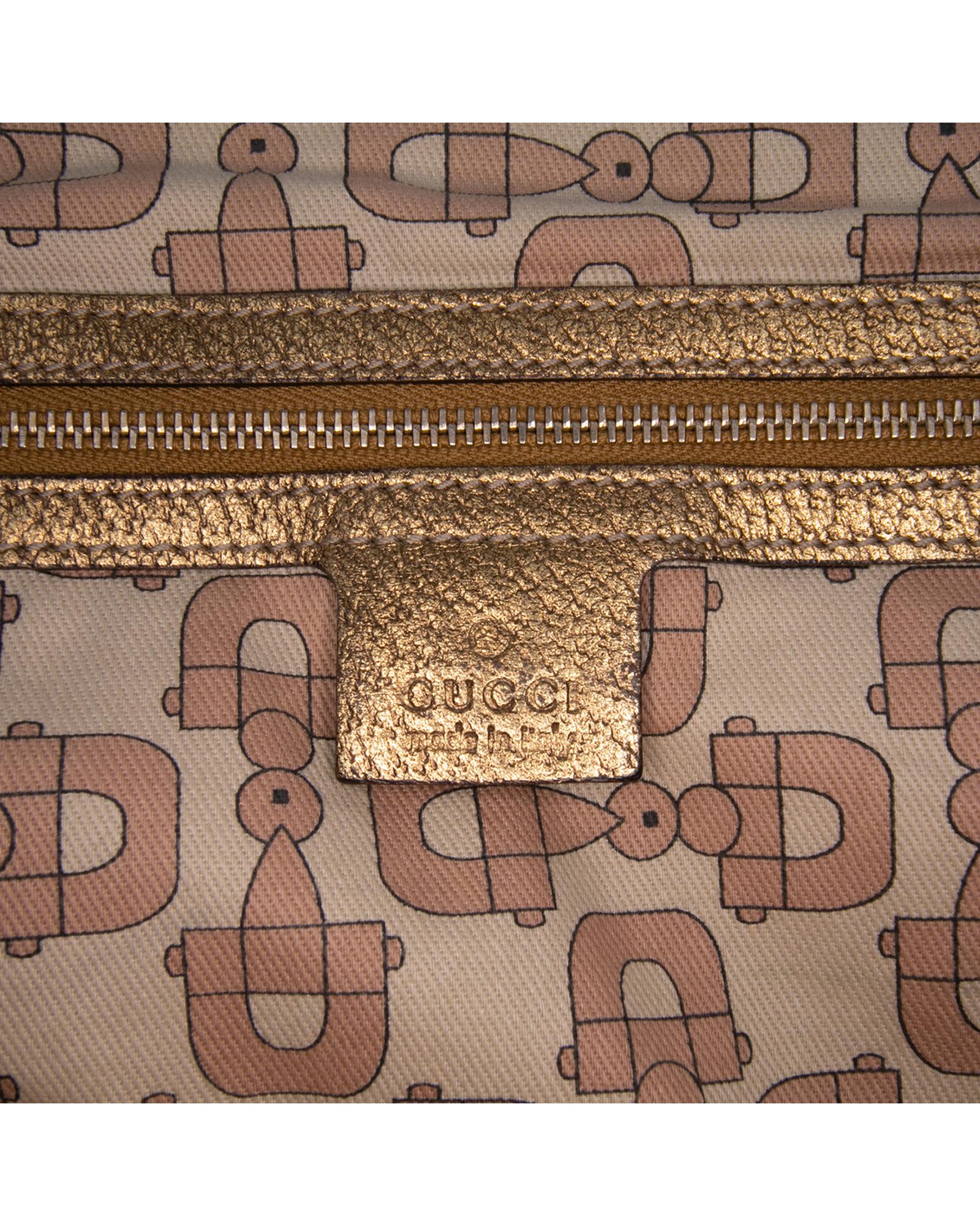 This tote bag features a canvas body with metallic leather trim flat leather straps an open top and interior zip and slip pockets.Brand: Gucci Vintage