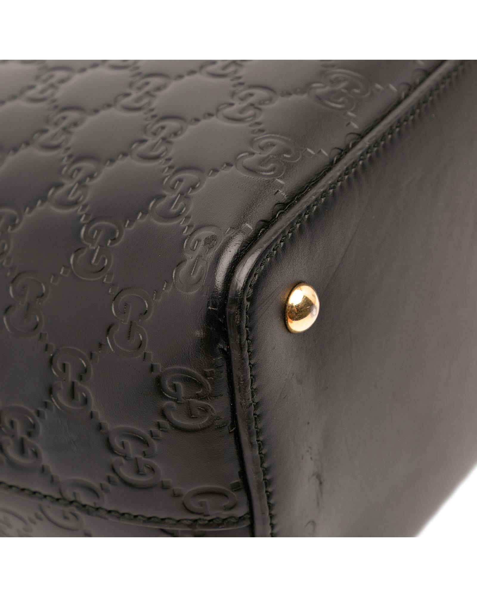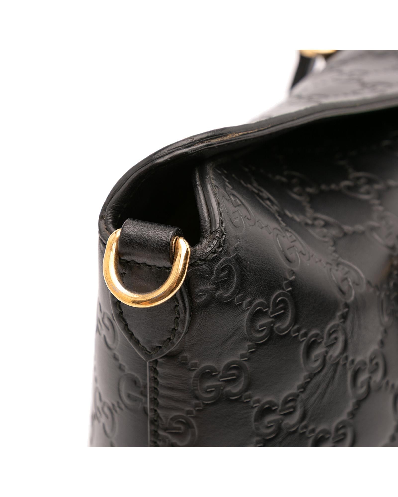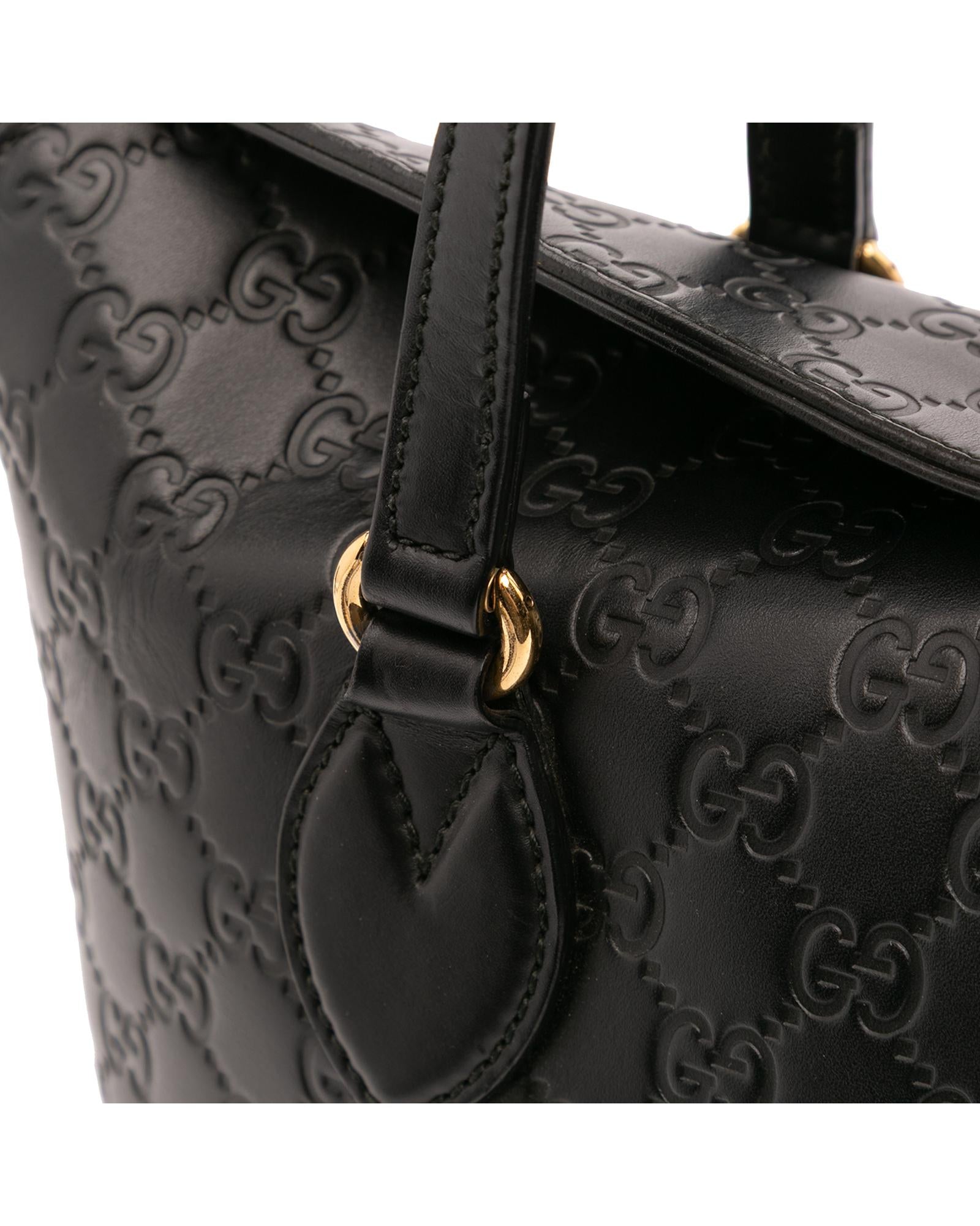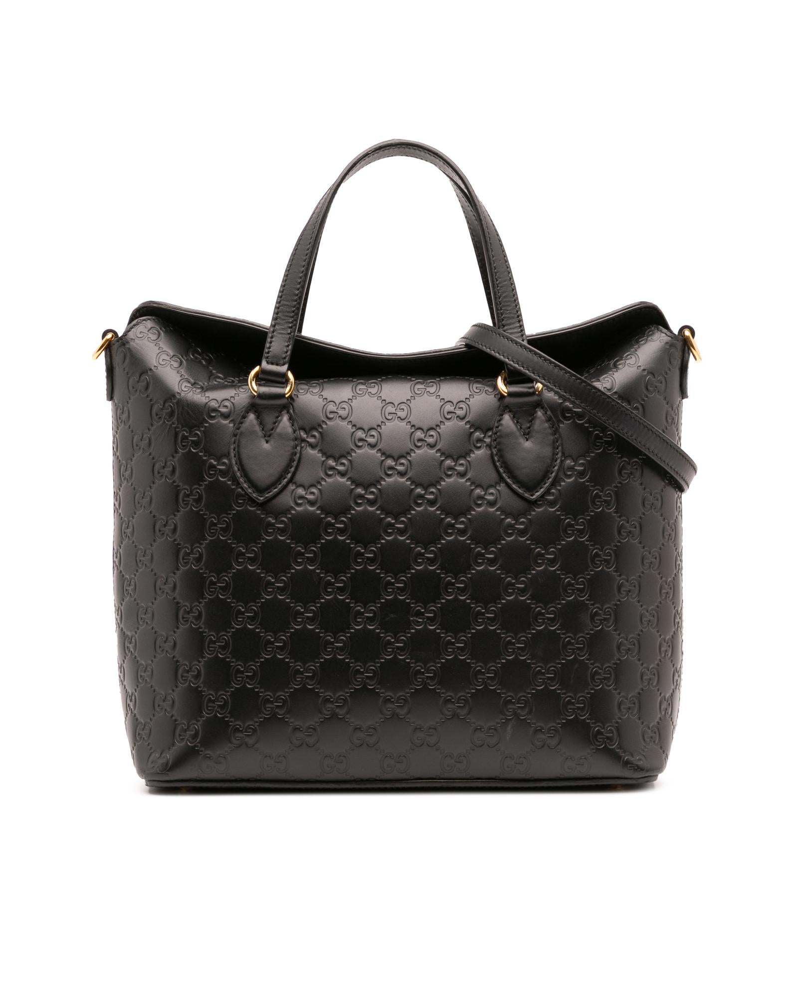 This satchel features an embossed leather body flat leather handles a detachable flat leather strap a fold-over top with magnetic snap closure and interior zip and slip pockets.Brand: Gucci Vintage