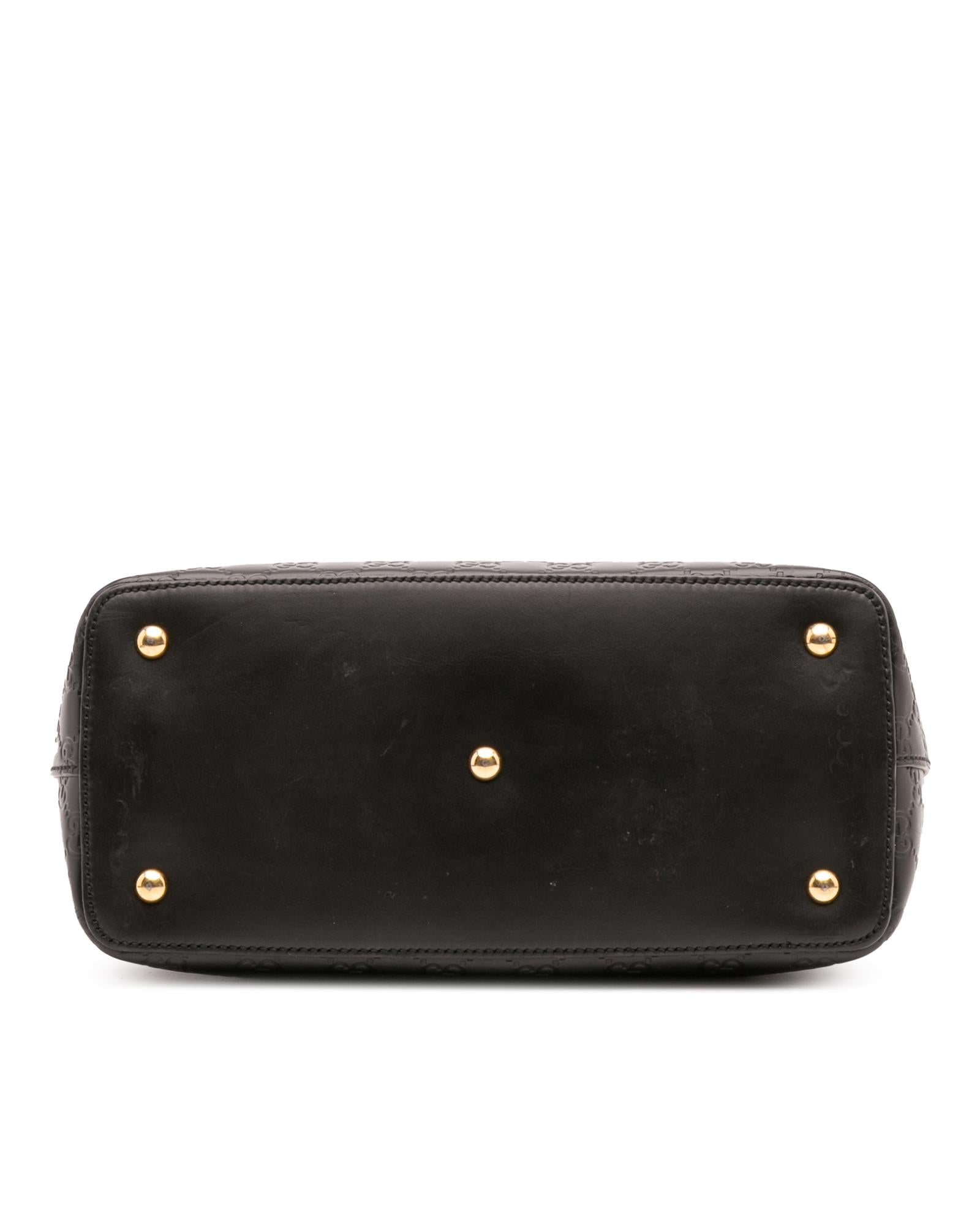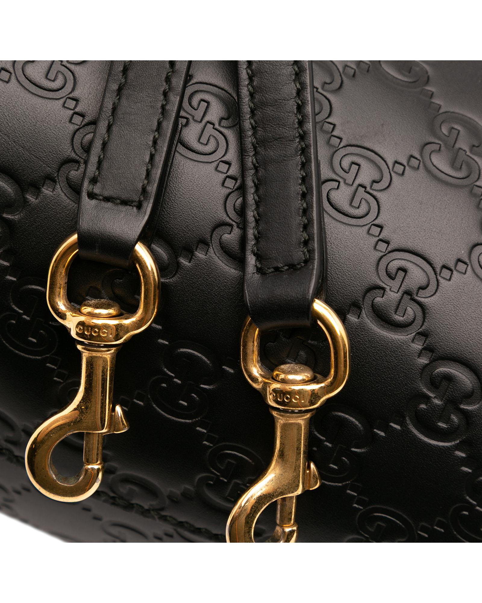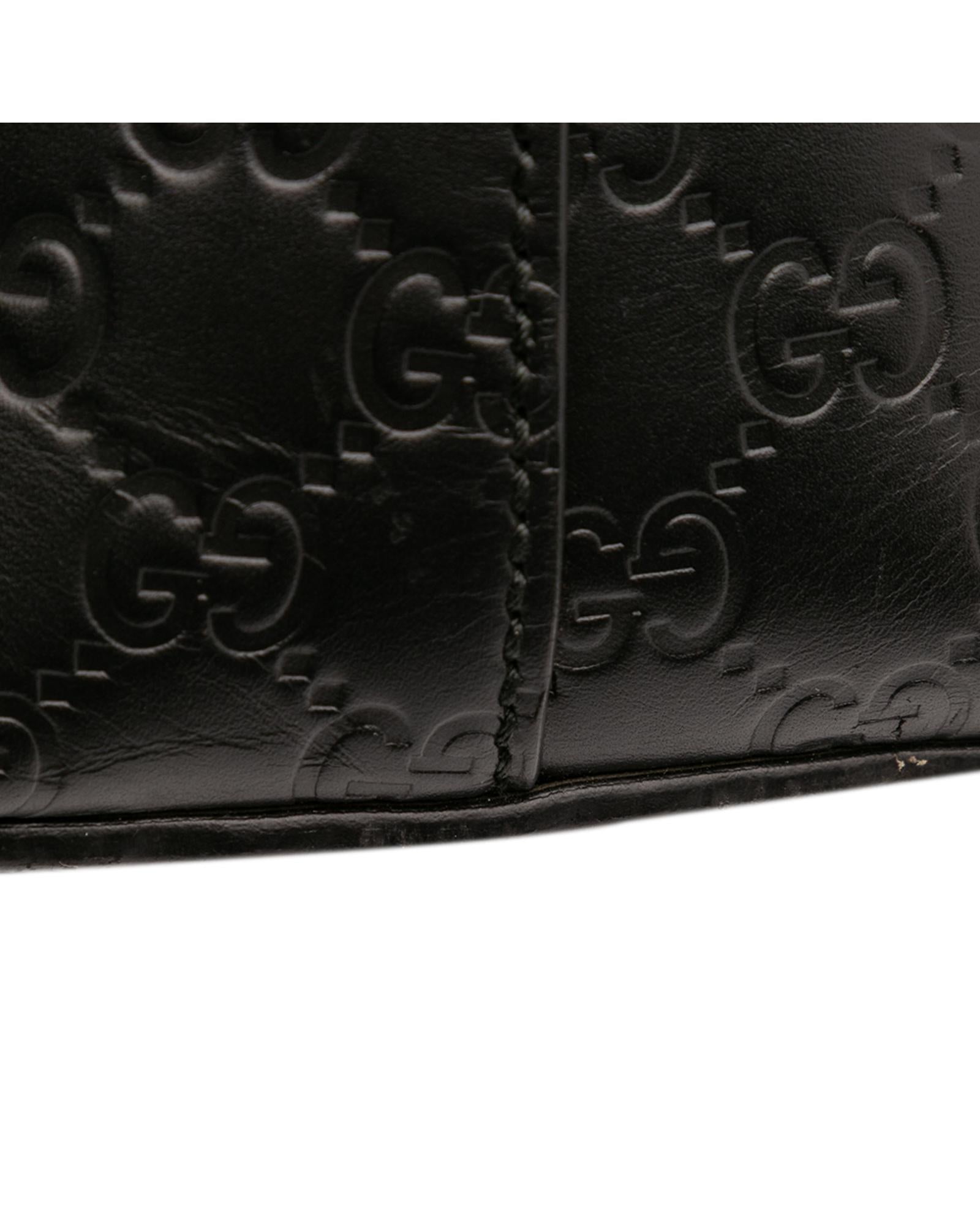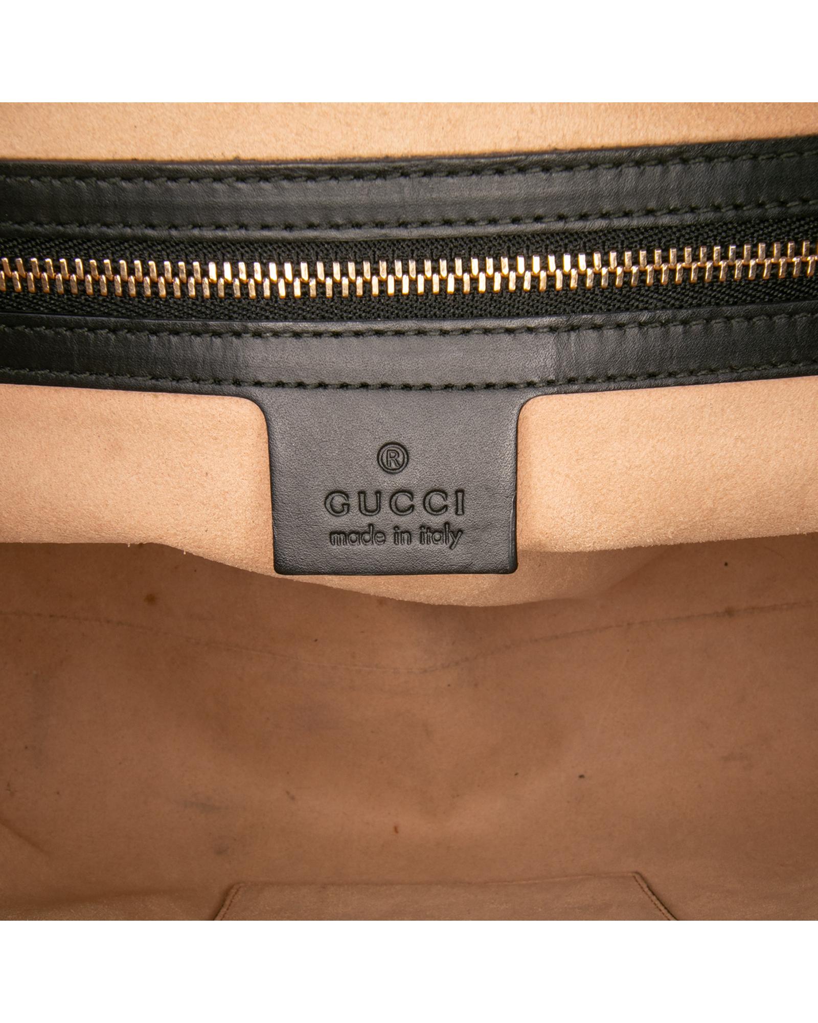 This satchel features an embossed leather body flat leather handles a detachable flat leather strap a fold-over top with magnetic snap closure and interior zip and slip pockets.Brand: Gucci Vintage