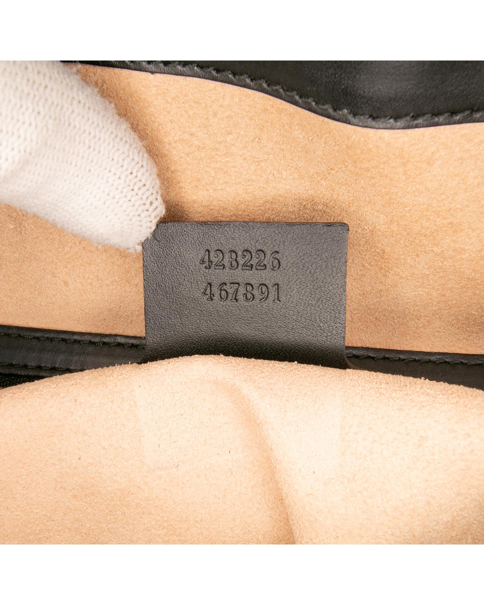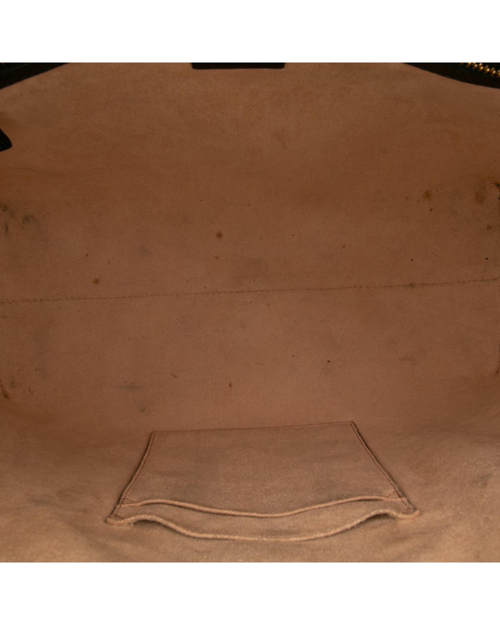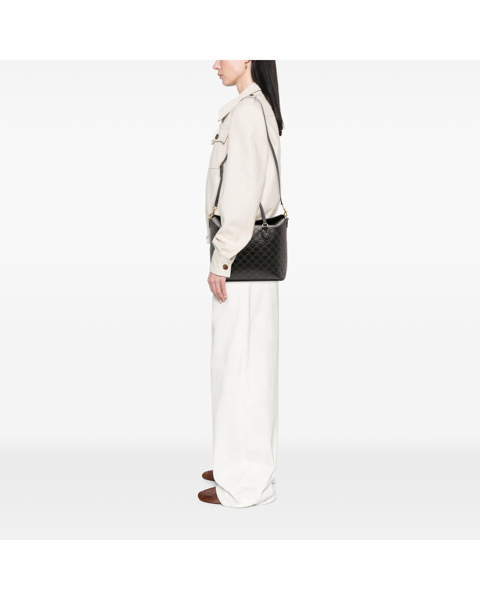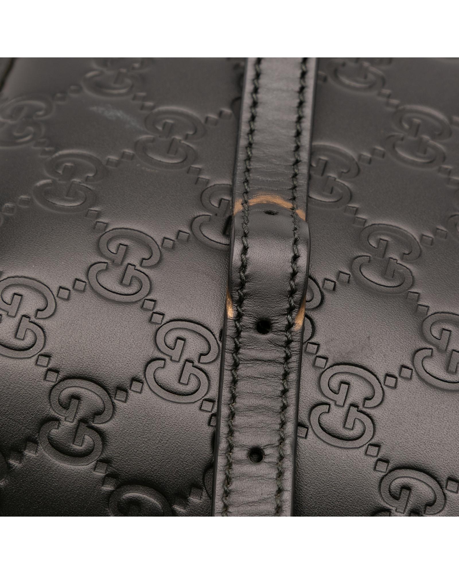 This satchel features an embossed leather body flat leather handles a detachable flat leather strap a fold-over top with magnetic snap closure and interior zip and slip pockets.Brand: Gucci Vintage