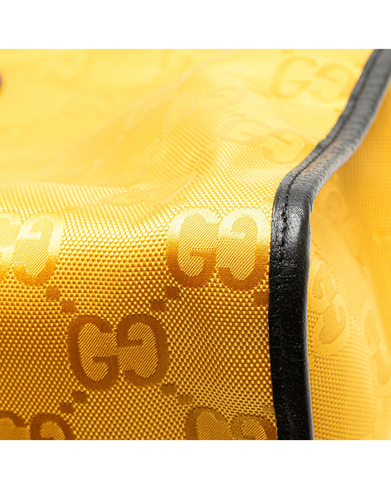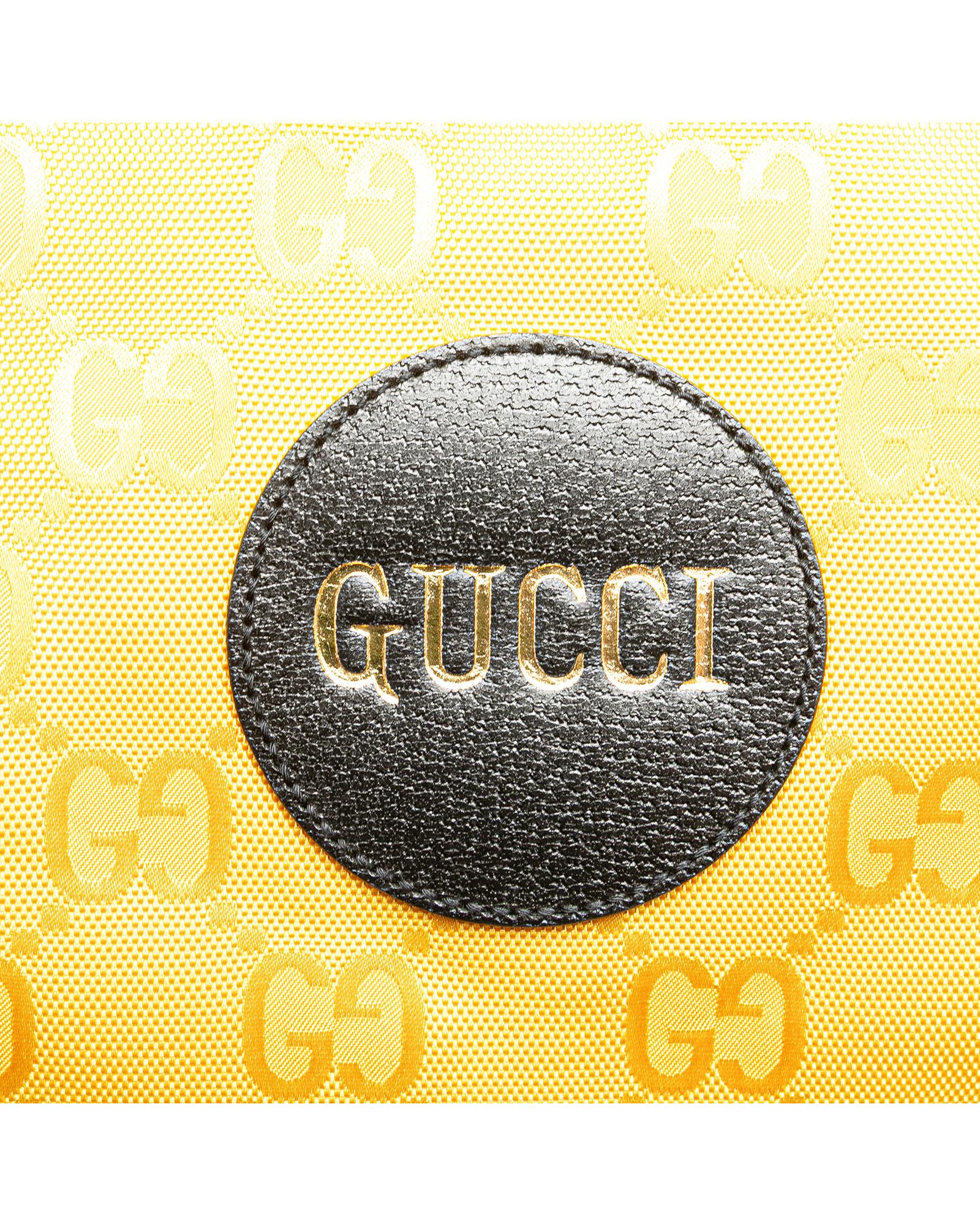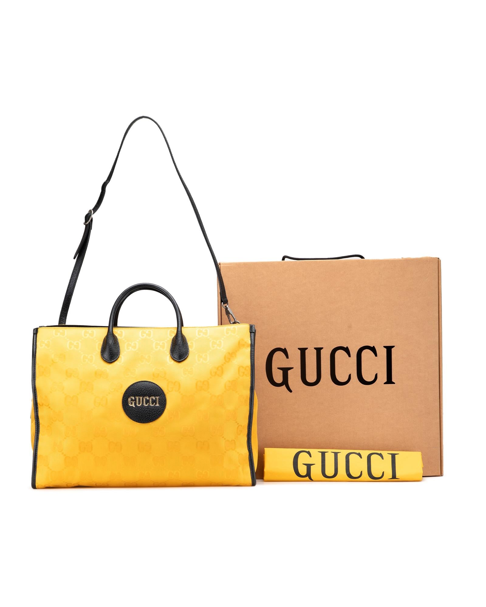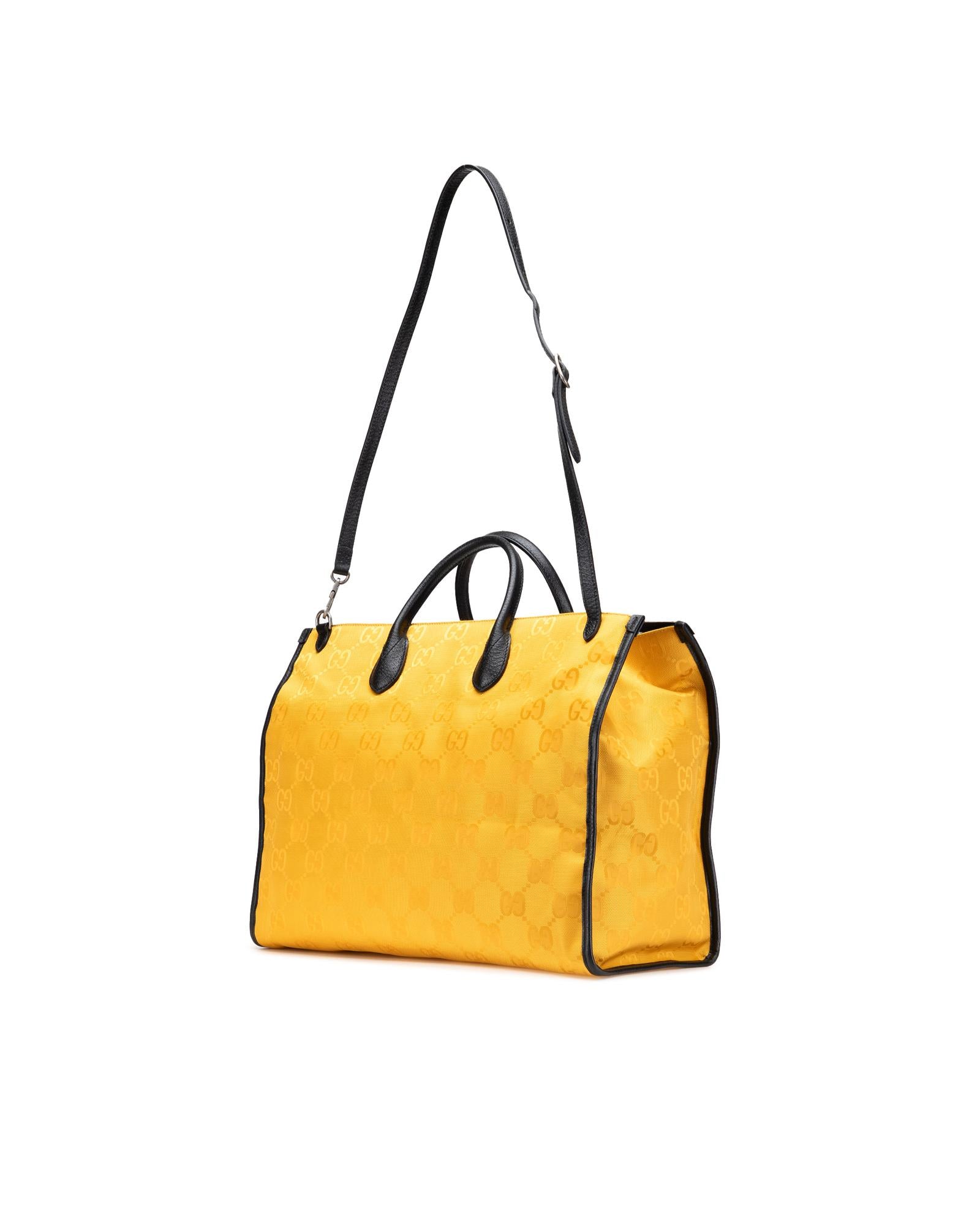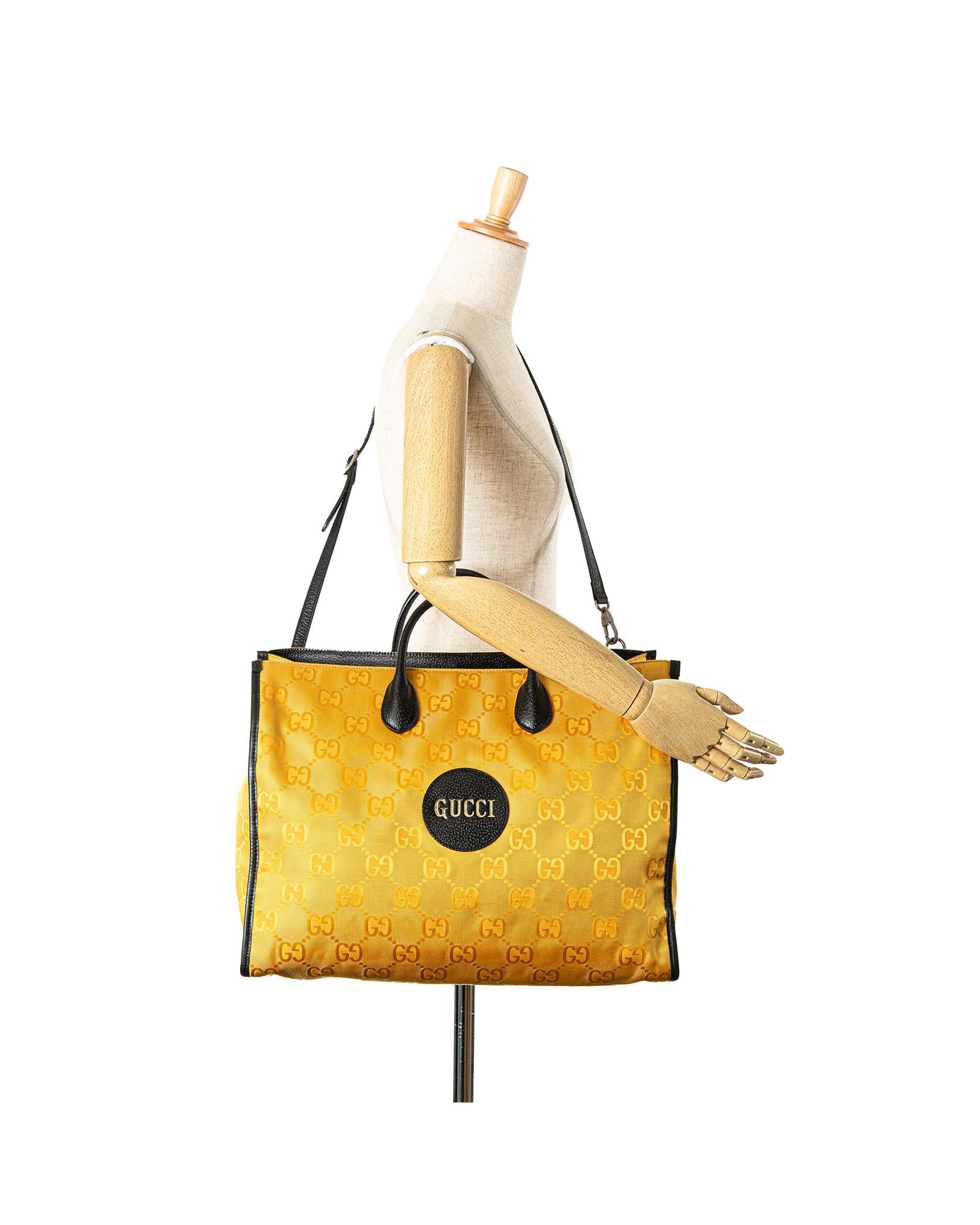 The Off the Grid features a nylon body with leather trim rolled leather handles a detachable flat leather strap an open top with hook closure and interior zip pockets.Brand: Gucci Vintage