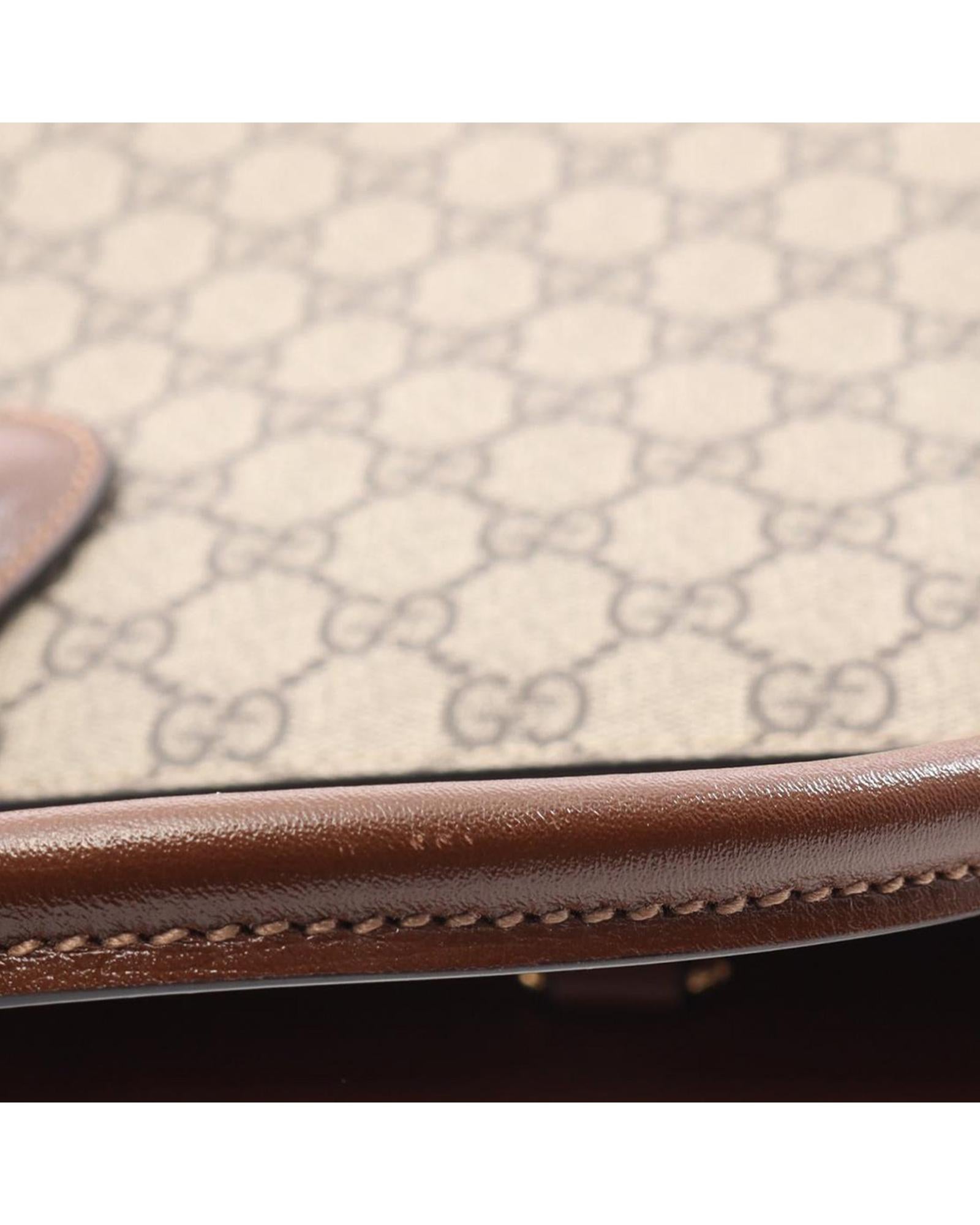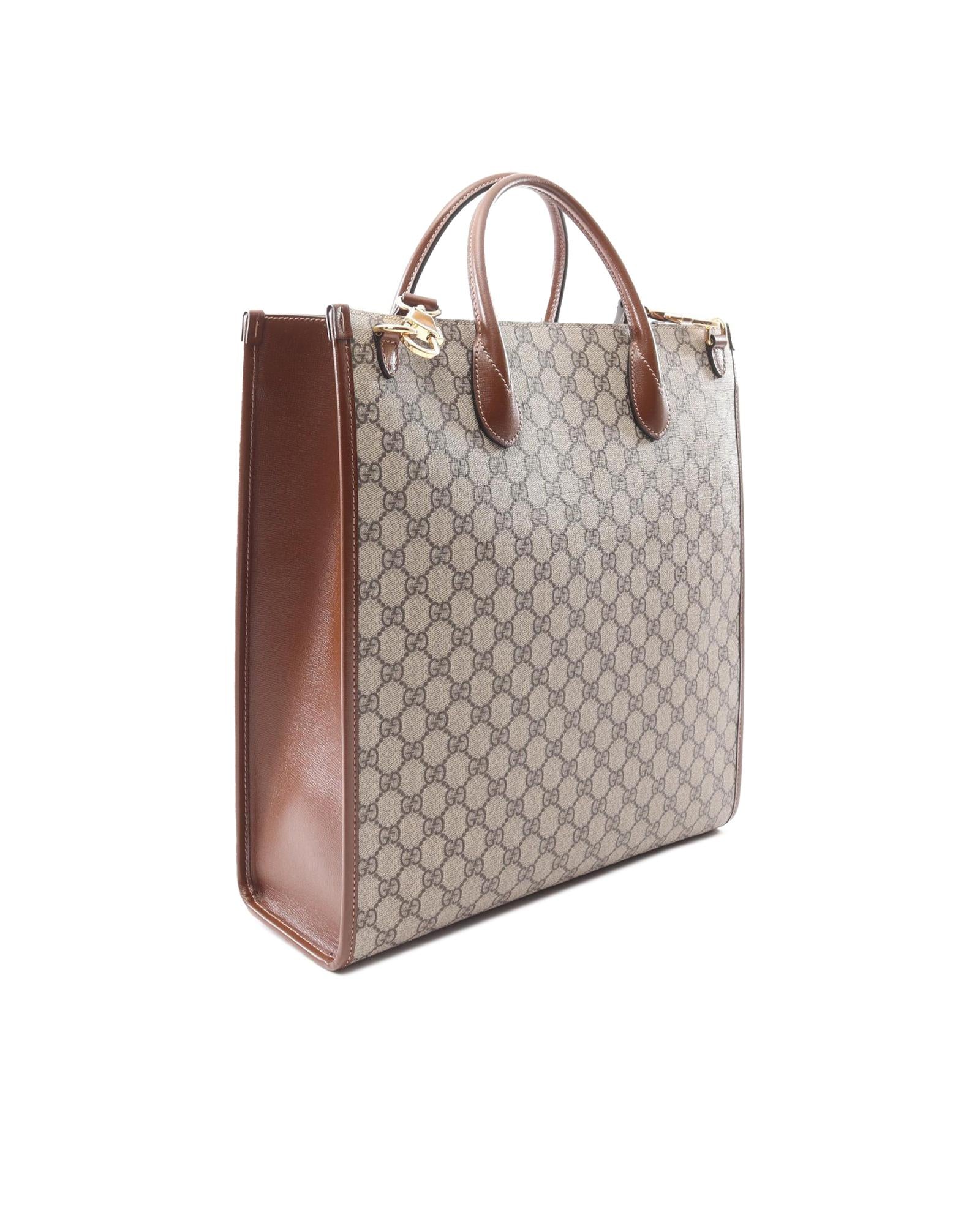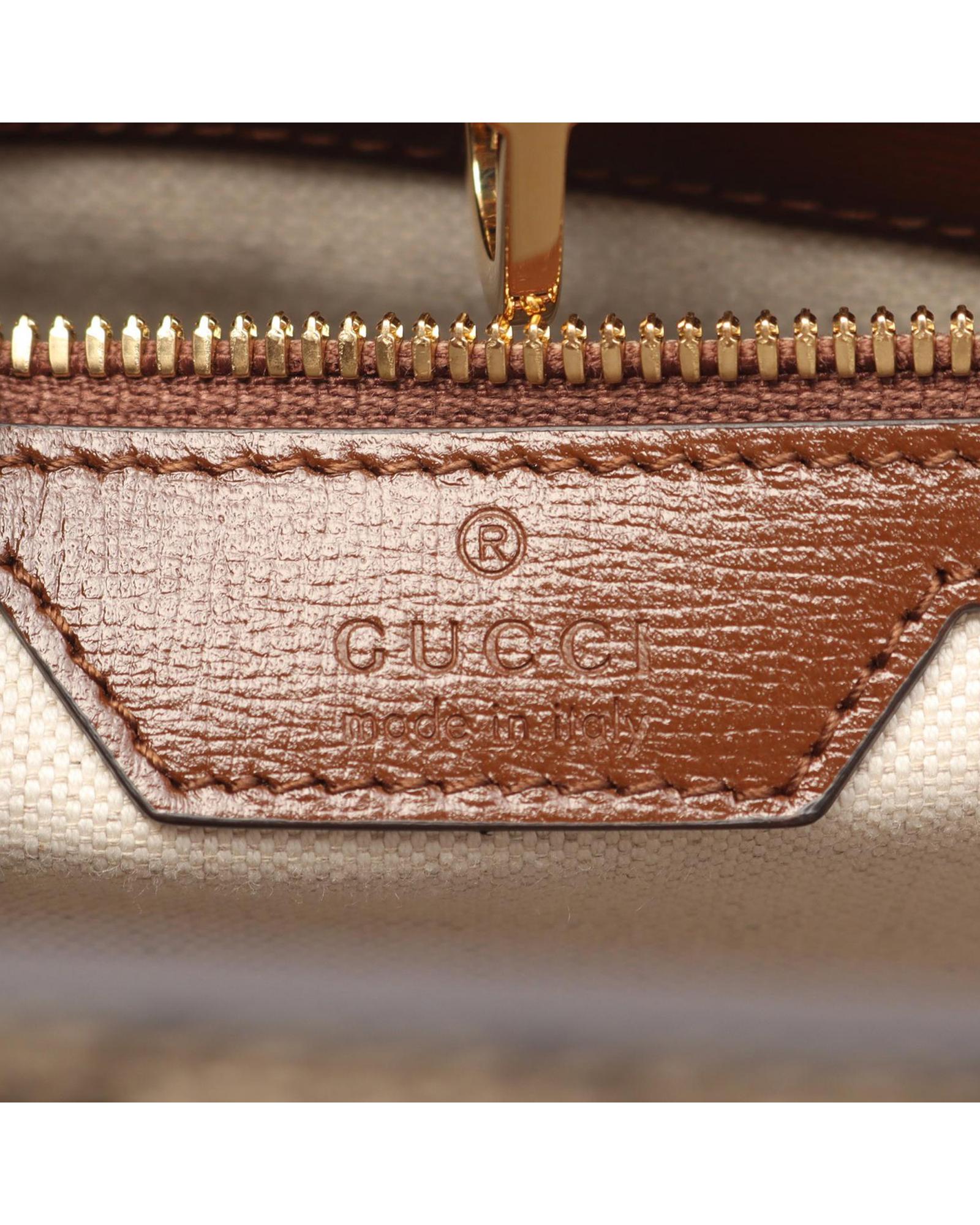 This satchel features a coated canvas body with leather trim rolled leather handles an open top with lobster claw clasp closure and an interior zip pocket.Brand: Gucci Vintage