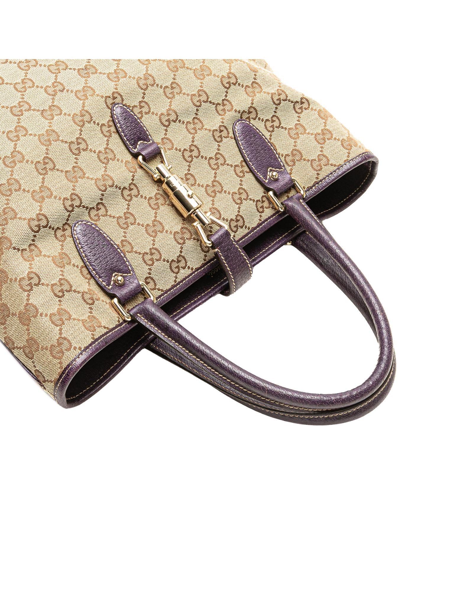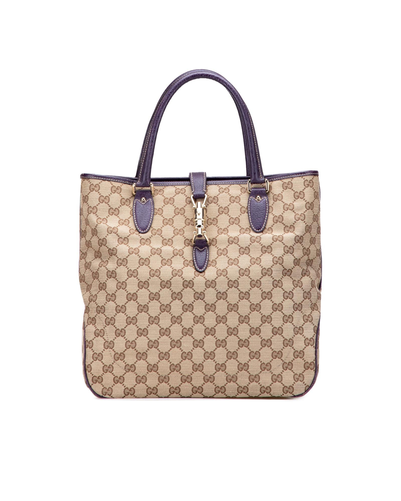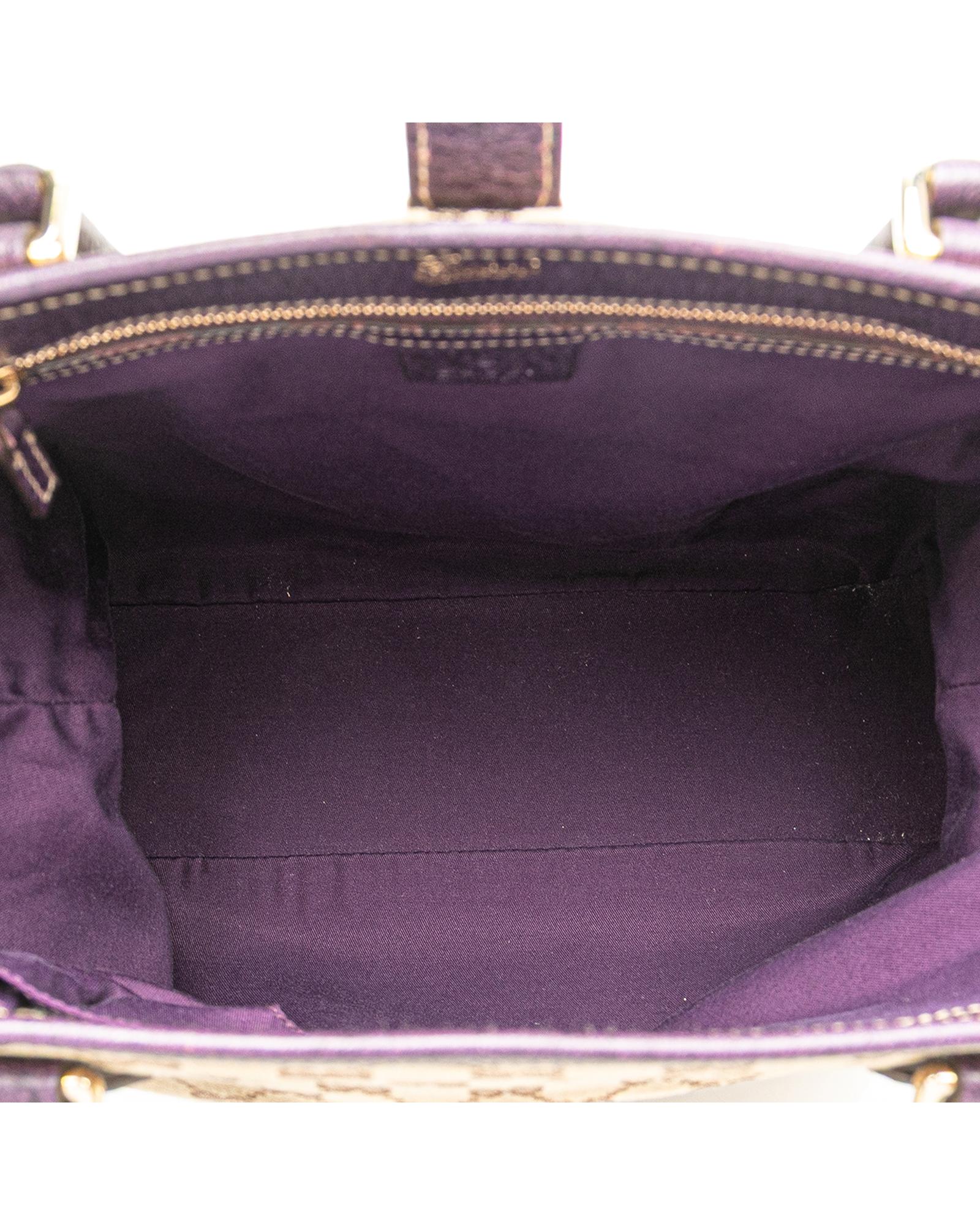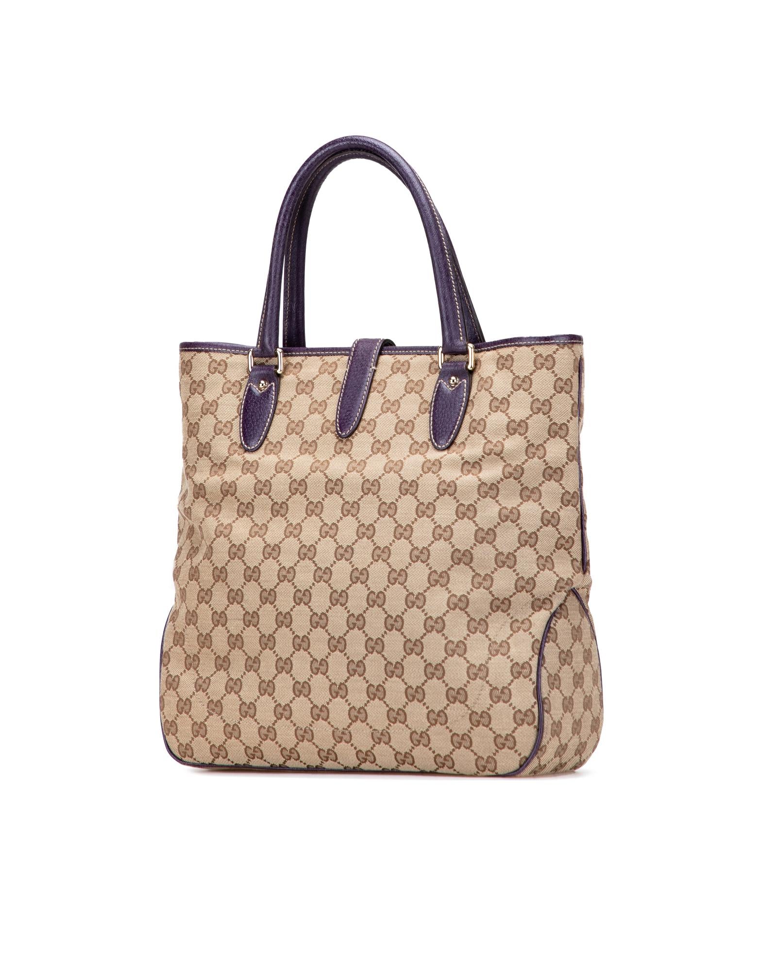 This tote bag features a canvas body with leather trim rolled leather handles an open top with top strap and push lock closure and interior zip and slip pockets.Brand: Gucci Vintage