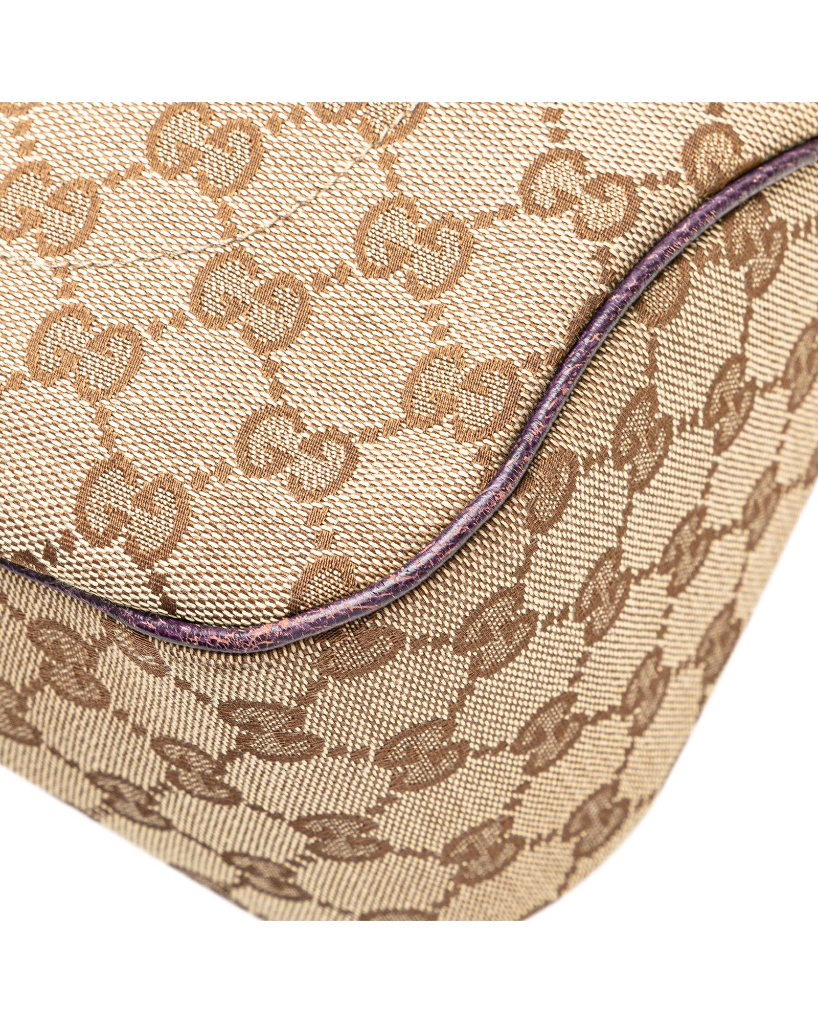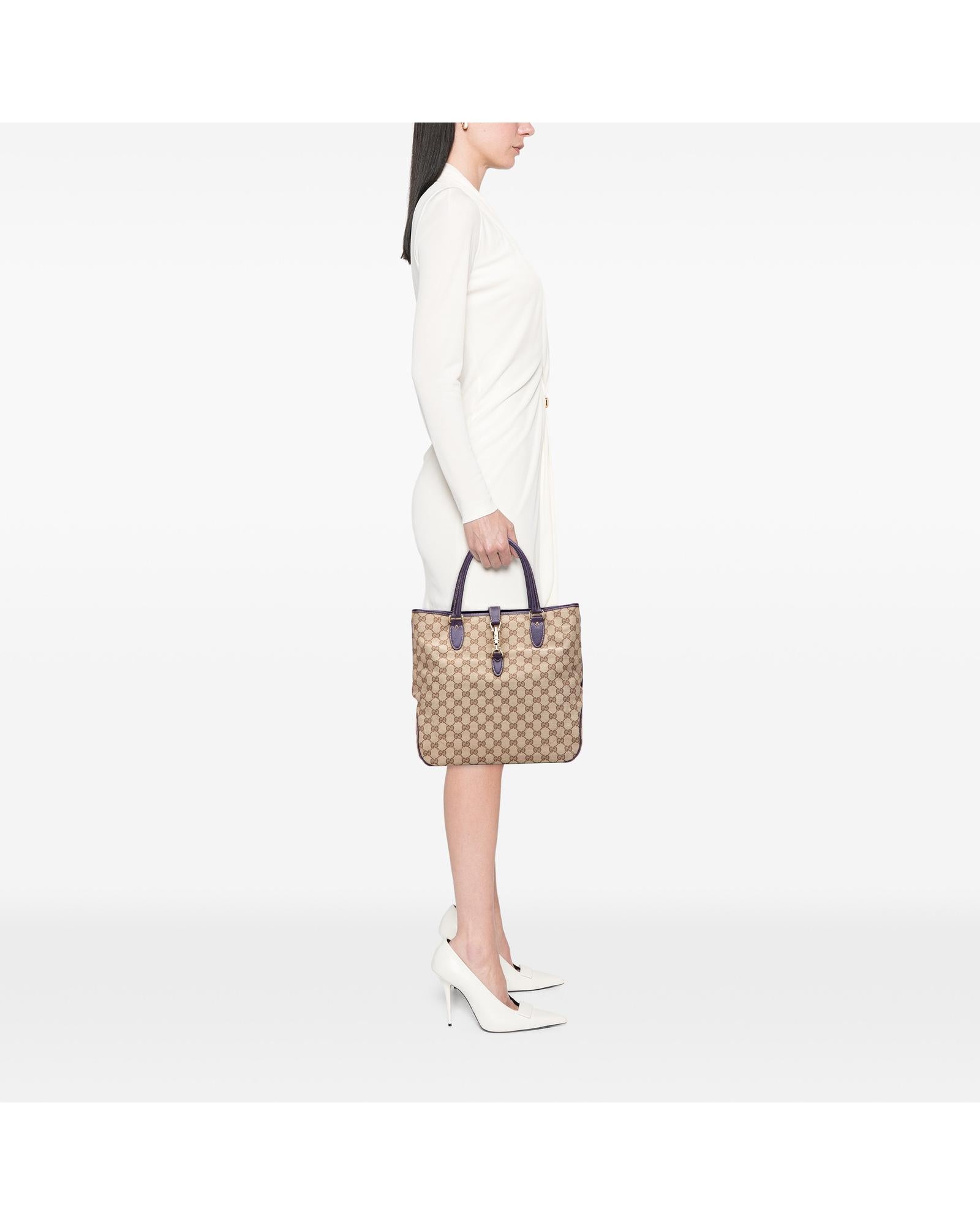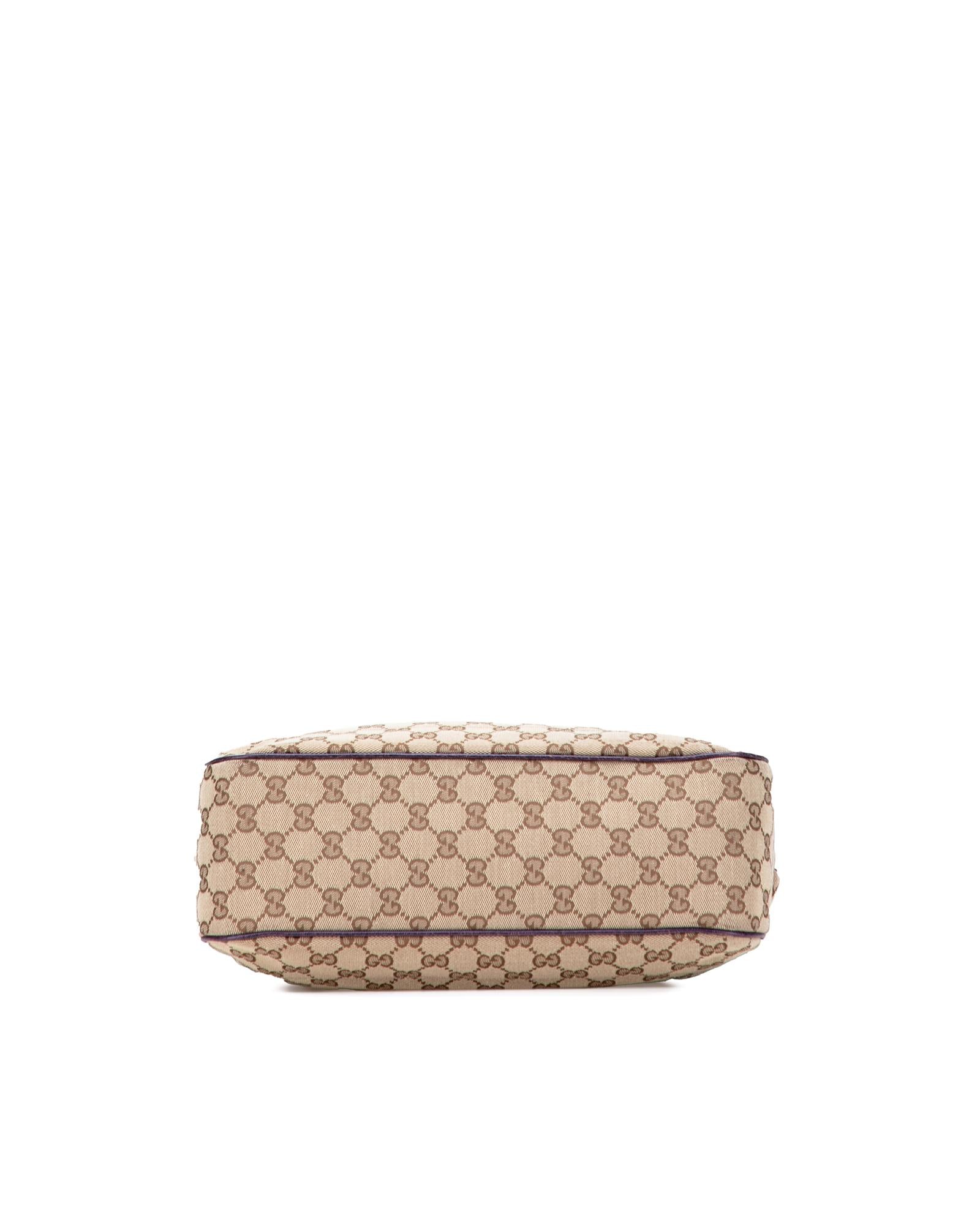 This tote bag features a canvas body with leather trim rolled leather handles an open top with top strap and push lock closure and interior zip and slip pockets.Brand: Gucci Vintage