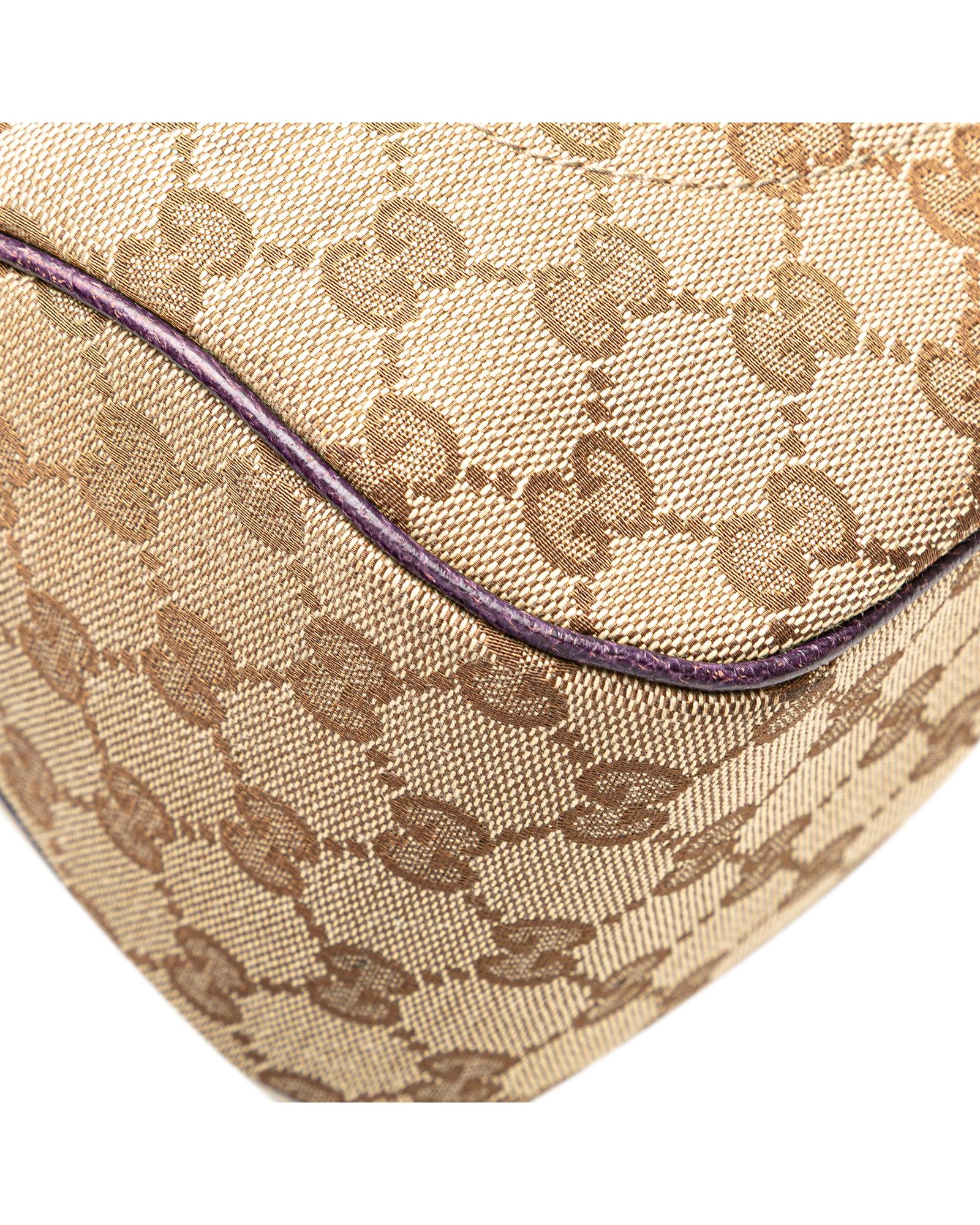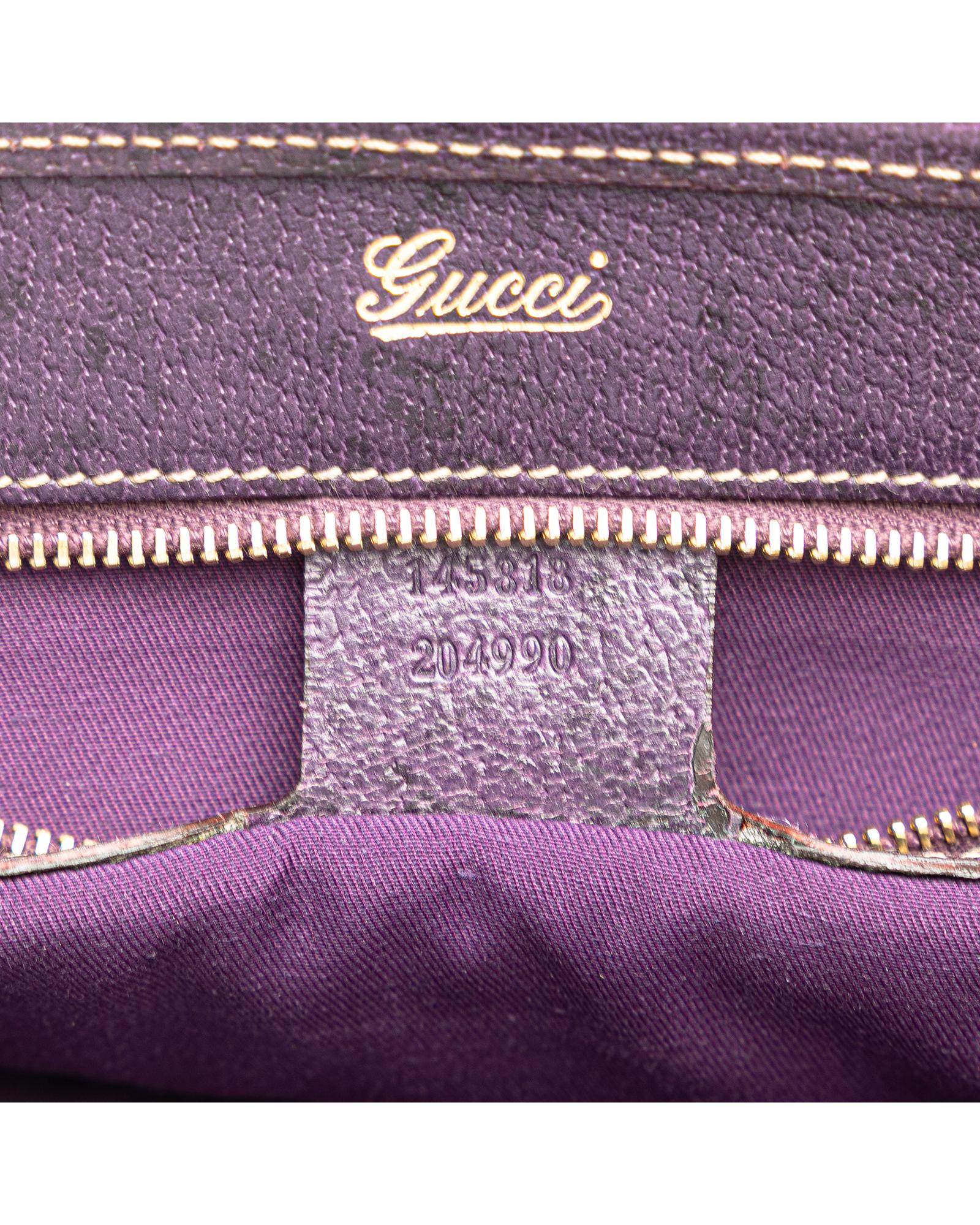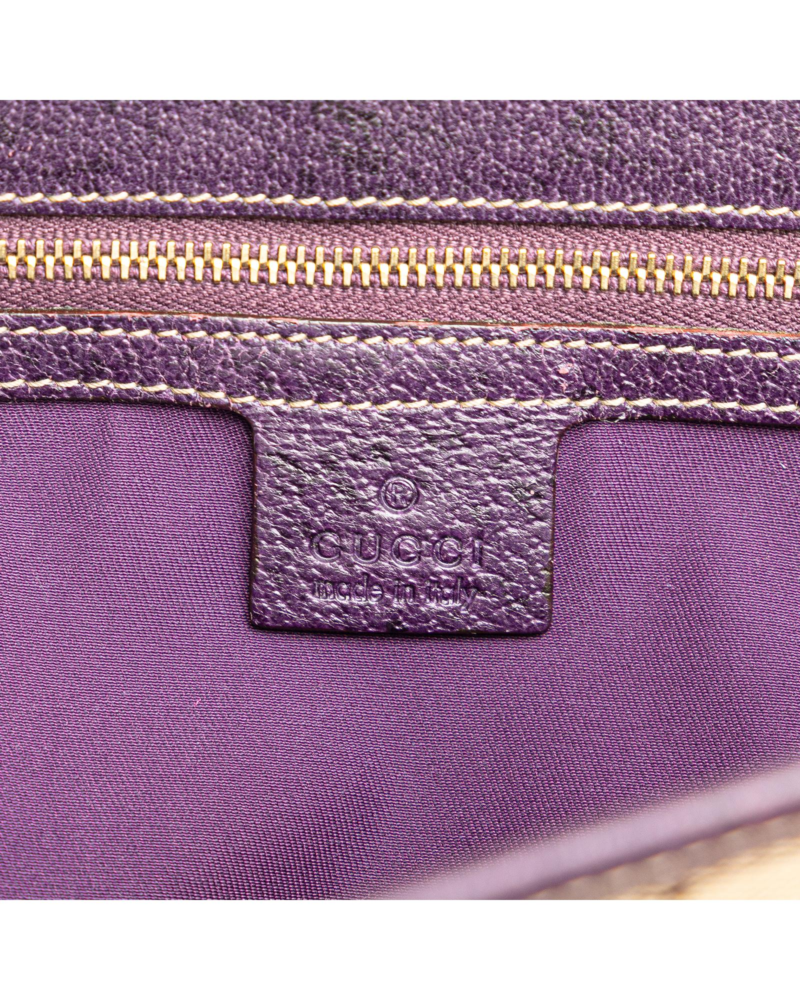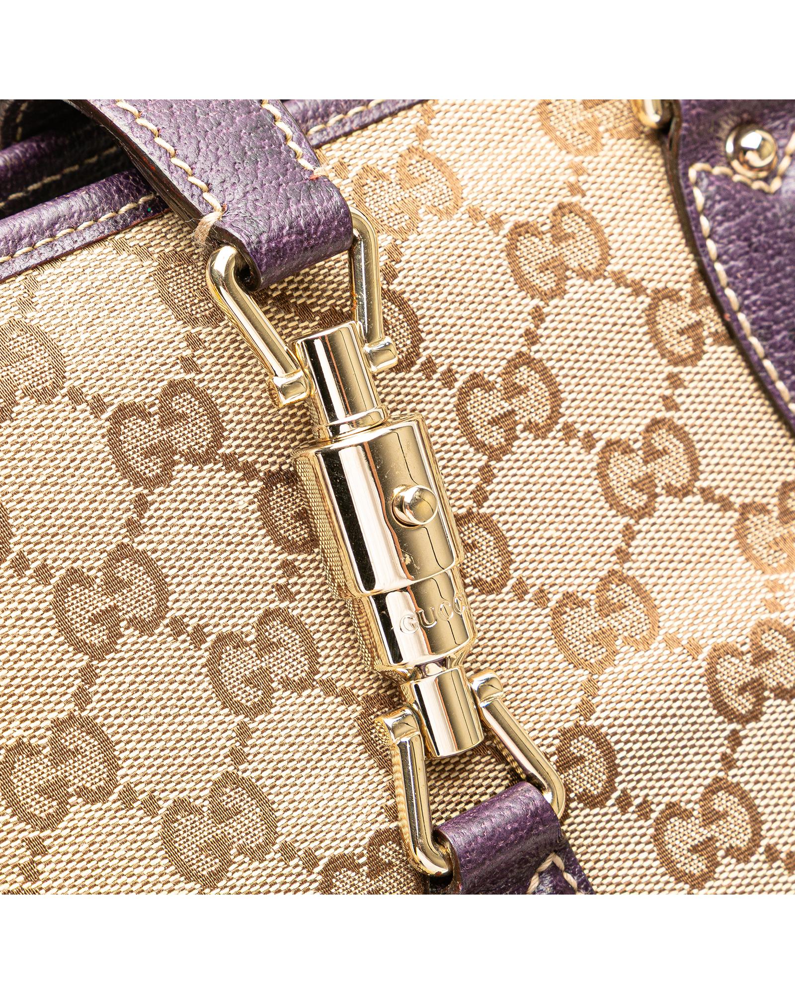 This tote bag features a canvas body with leather trim rolled leather handles an open top with top strap and push lock closure and interior zip and slip pockets.Brand: Gucci Vintage