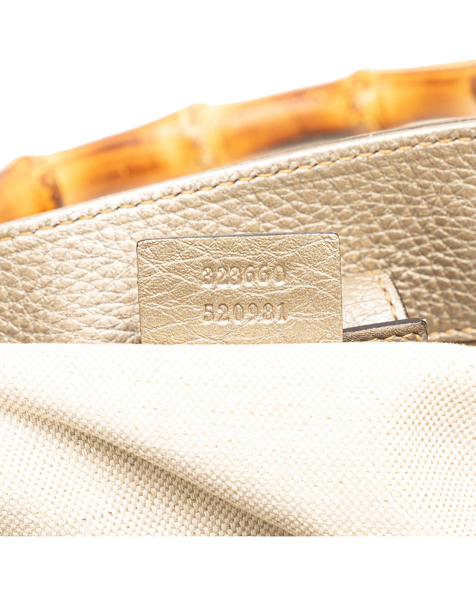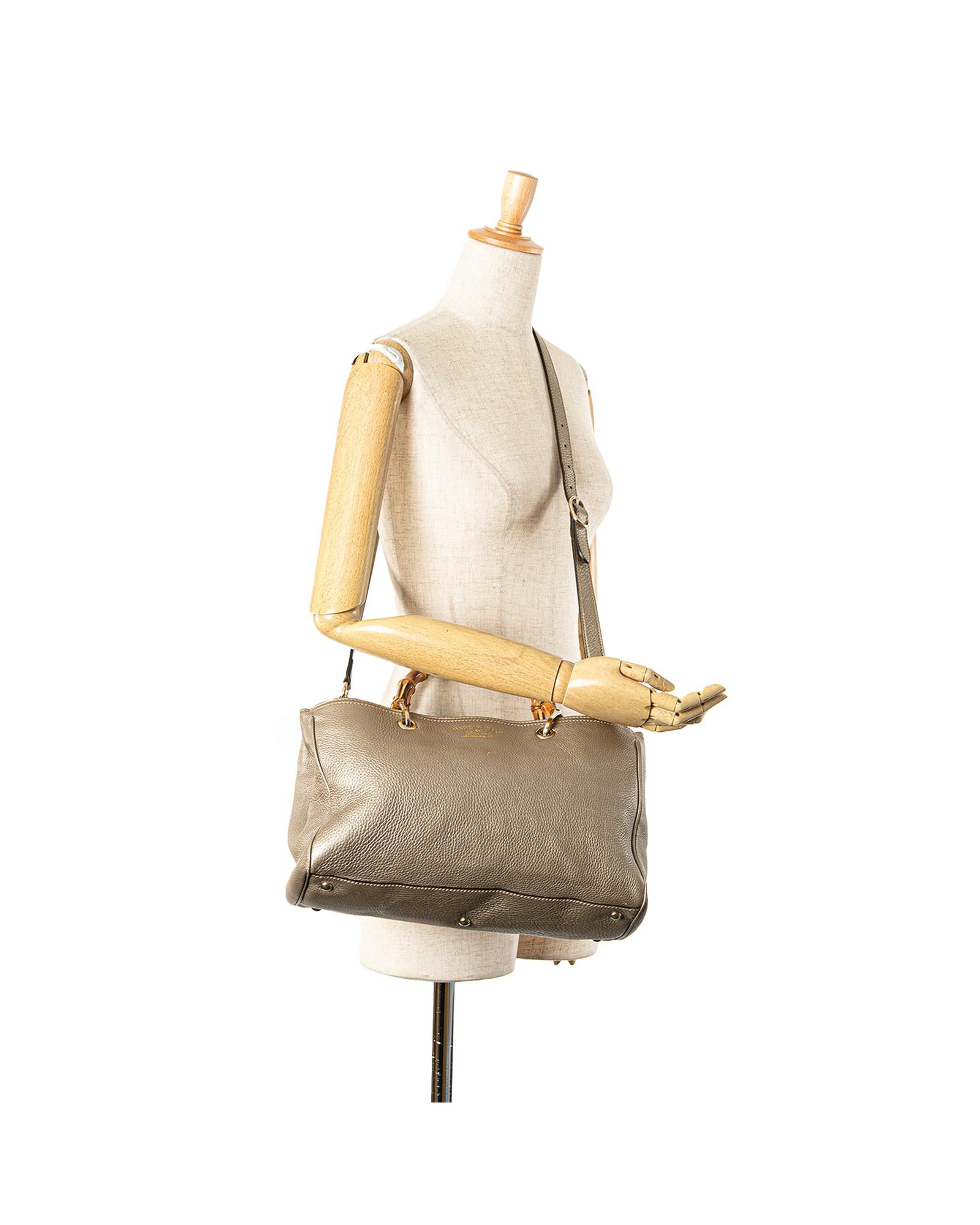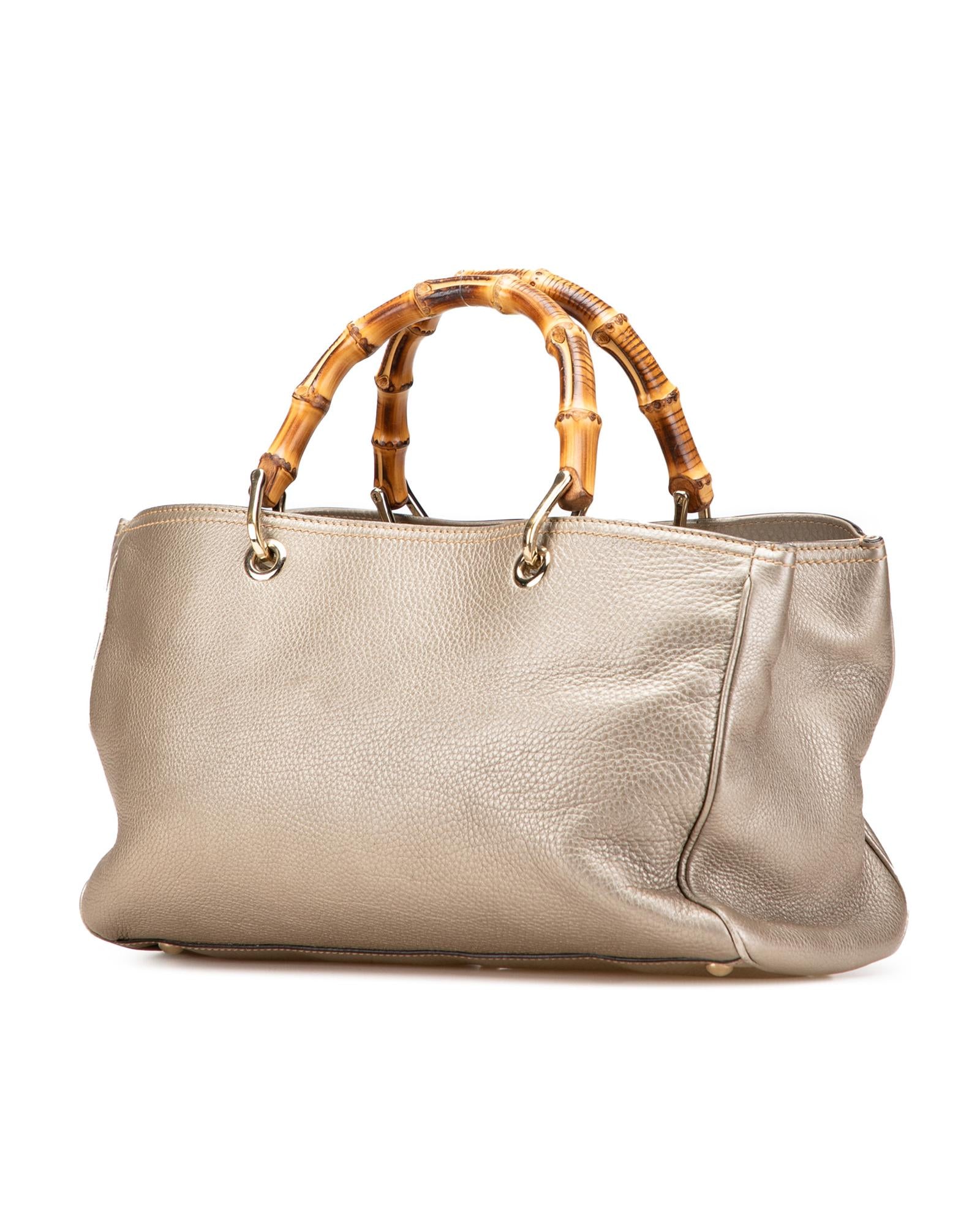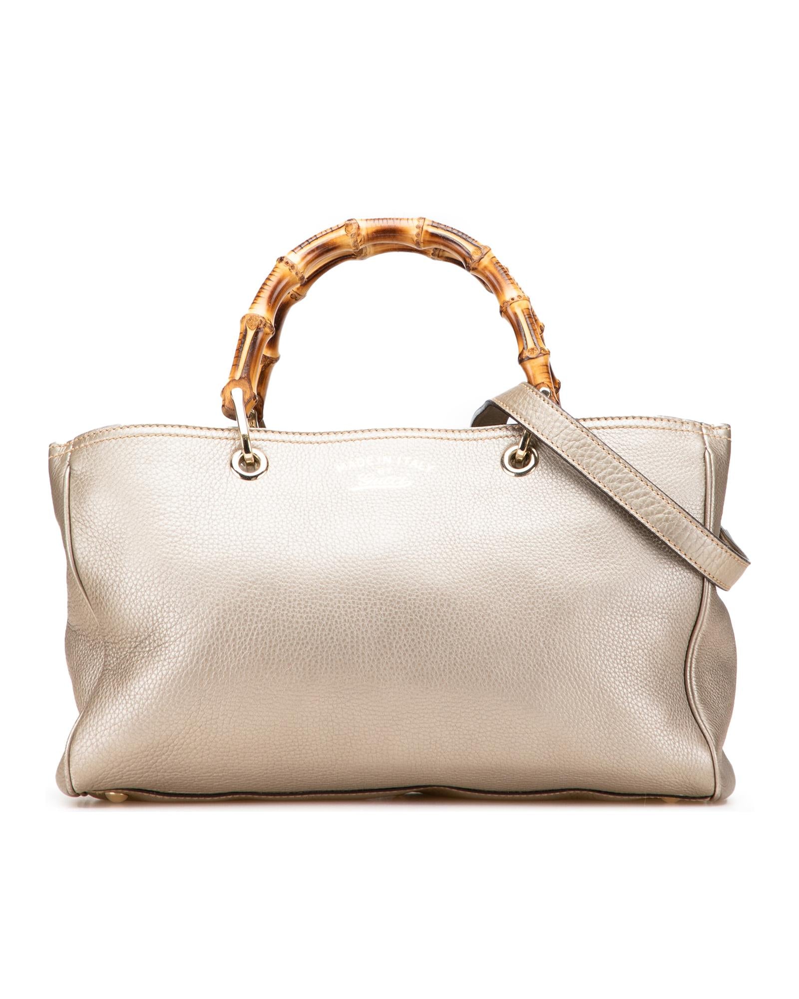 The Bamboo Shopper features a leather body bamboo top handles a detachable leather shoulder strap an open top with magnetic snap closure and interior zip and slip pockets.