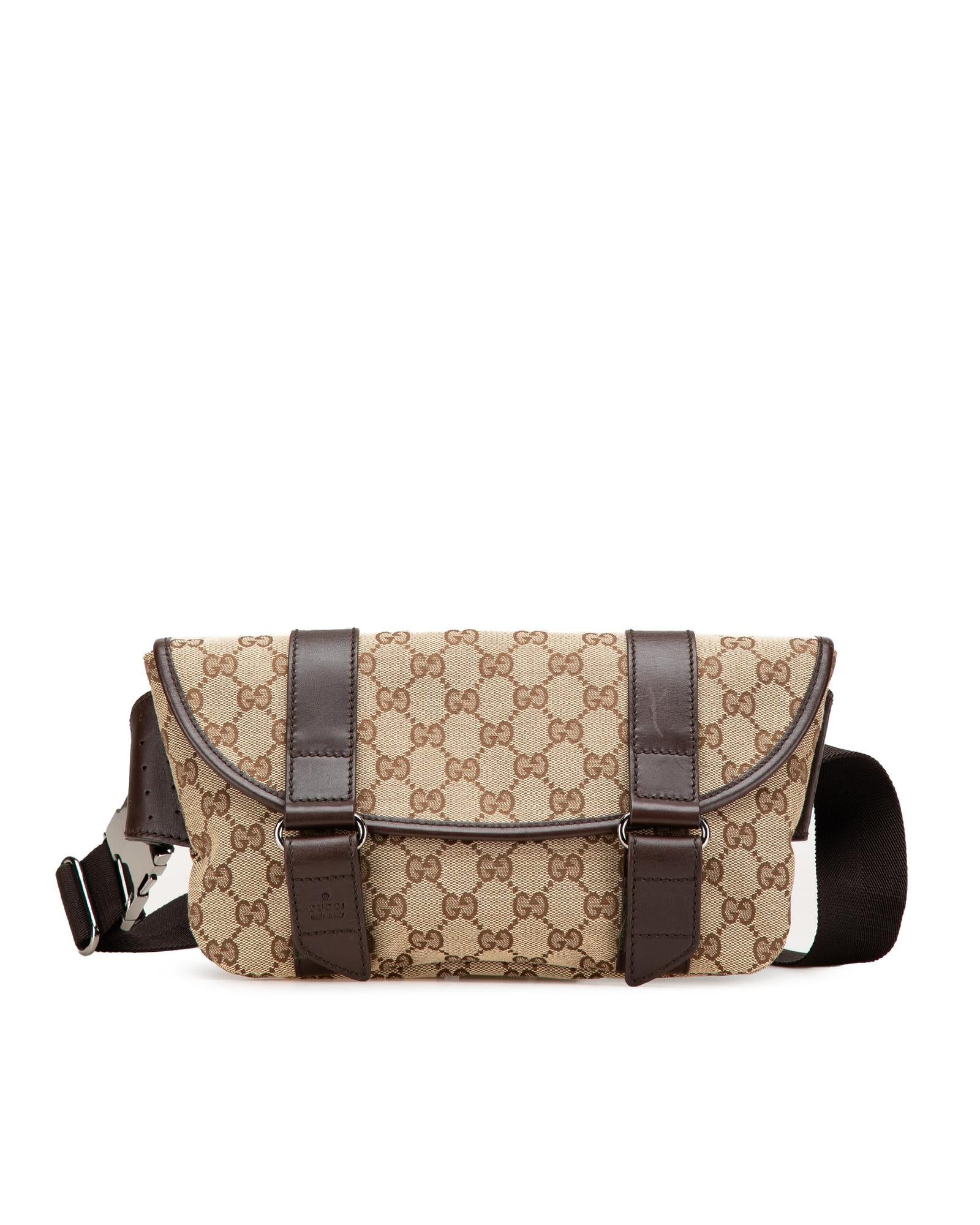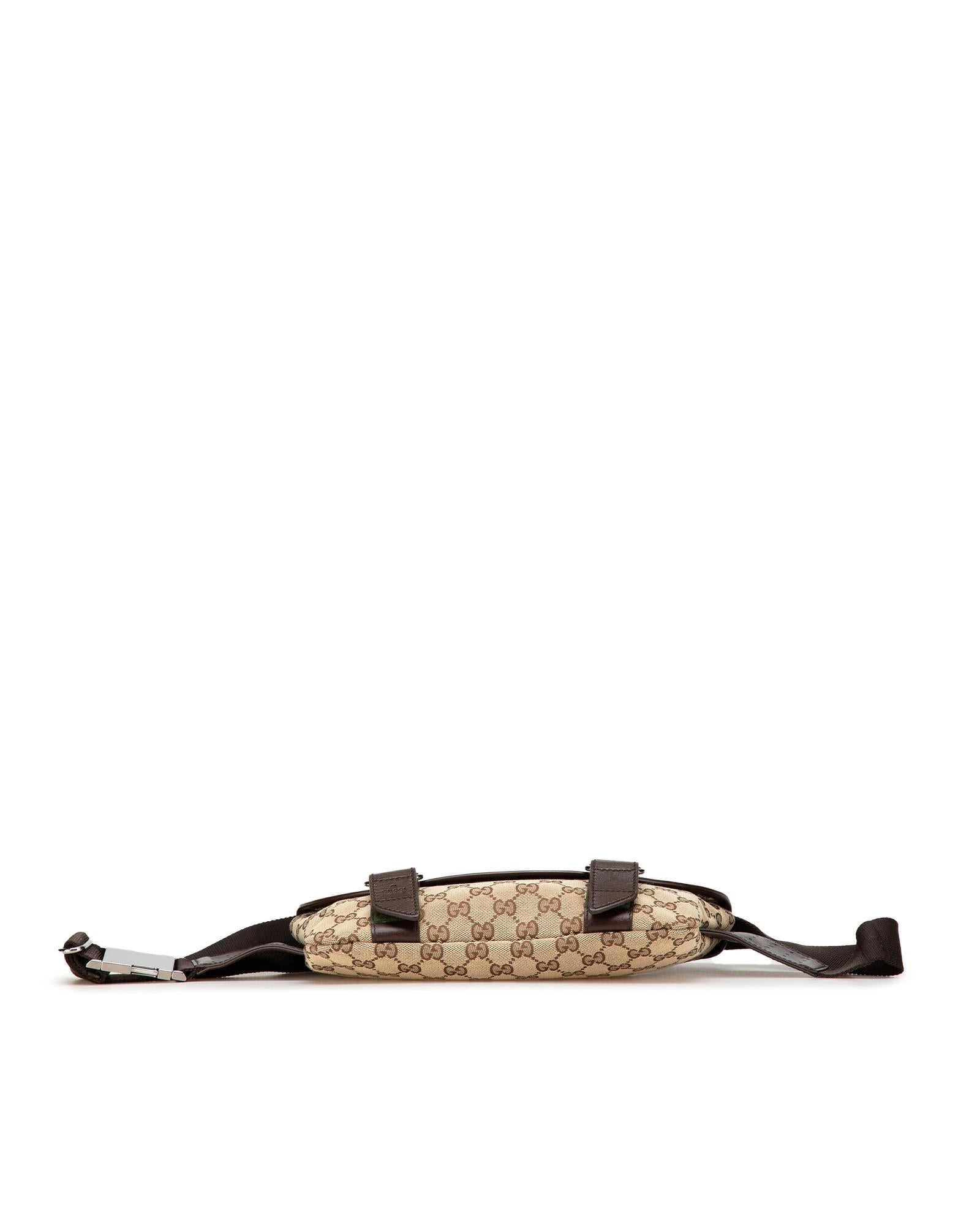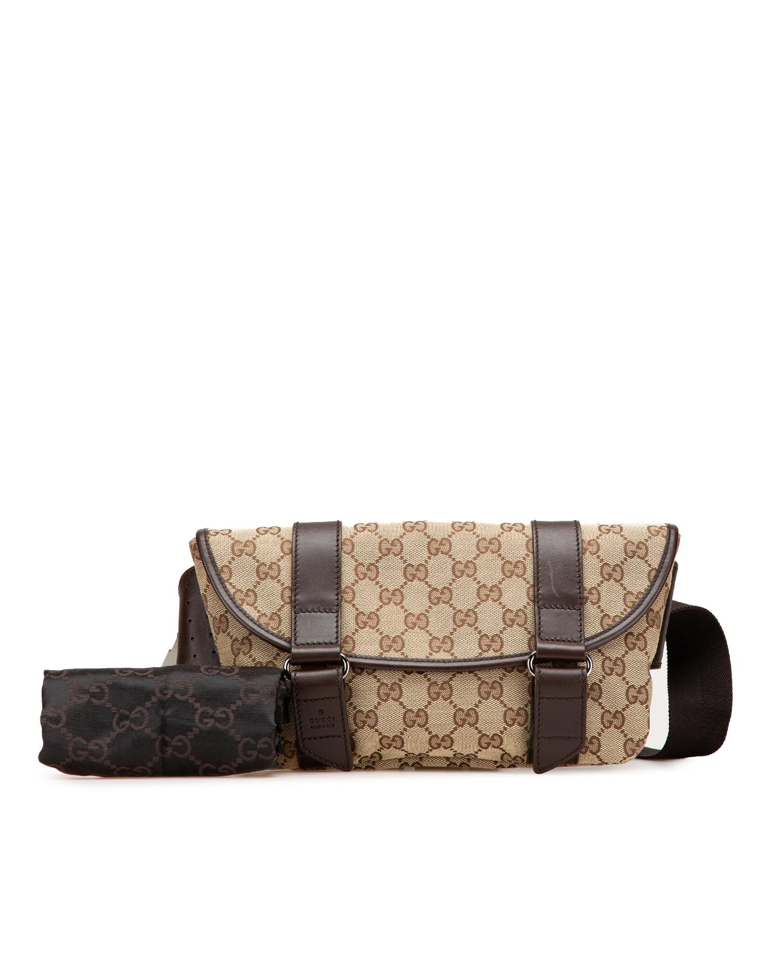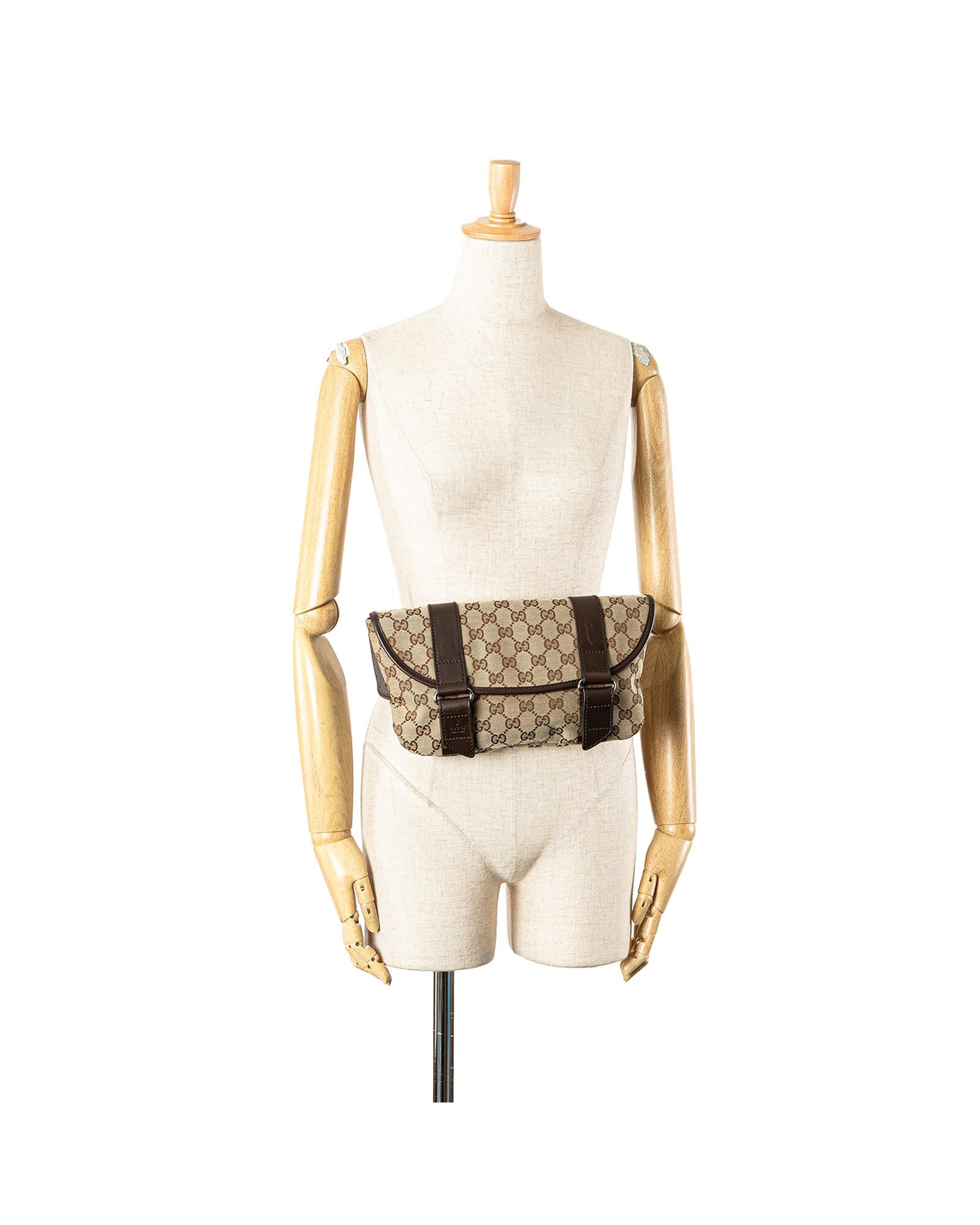 This belt bag features a canvas body with leather trim a flat canvas waist strap with buckle closure a top flap with velcro closures and an interior zip pocket.