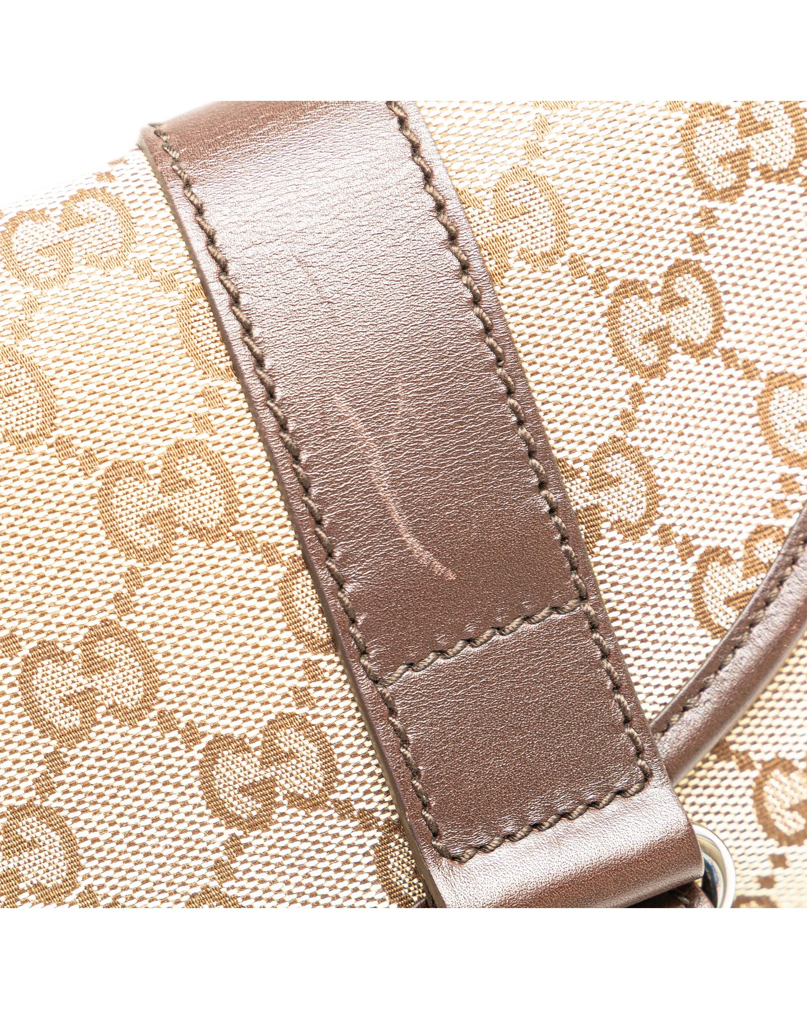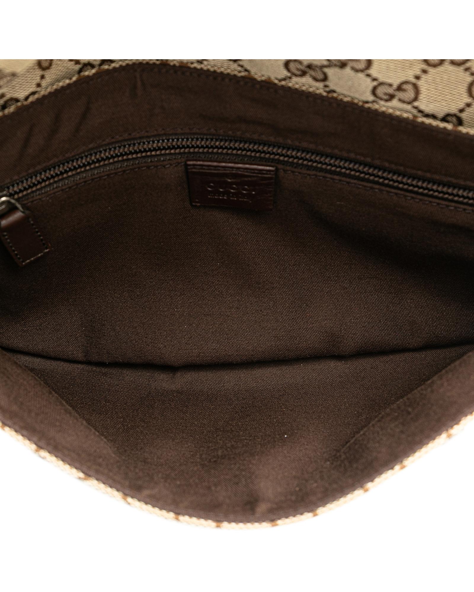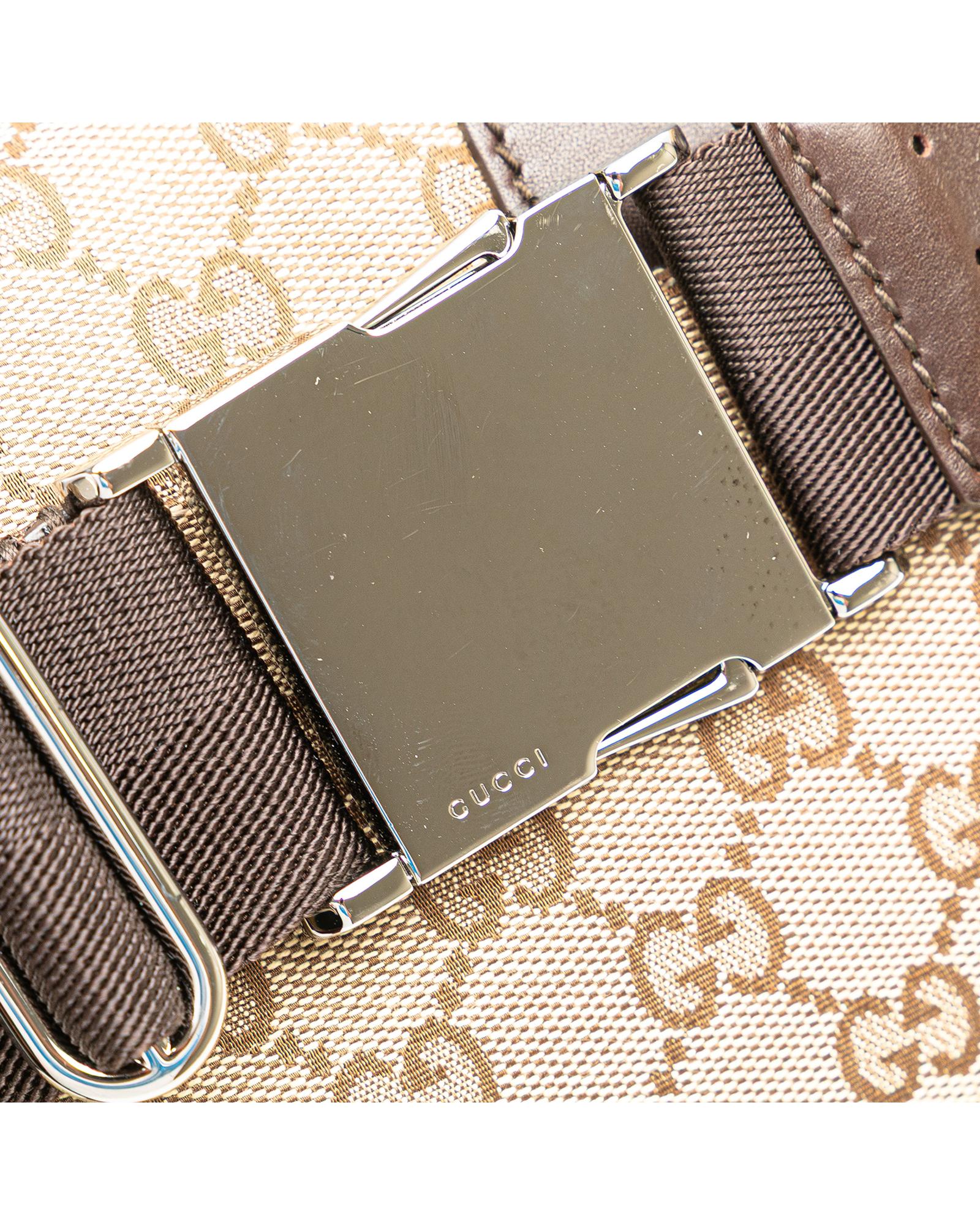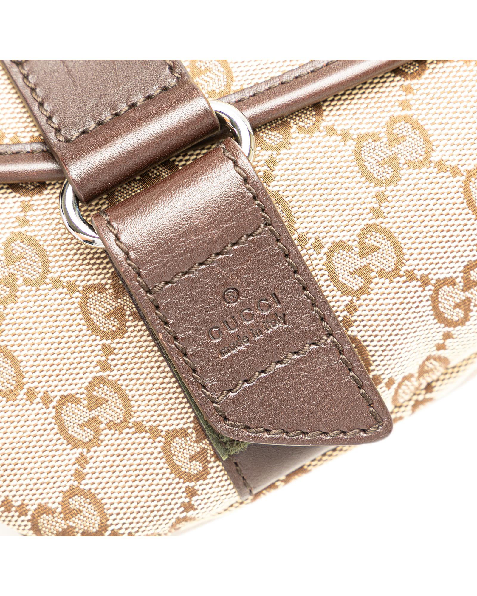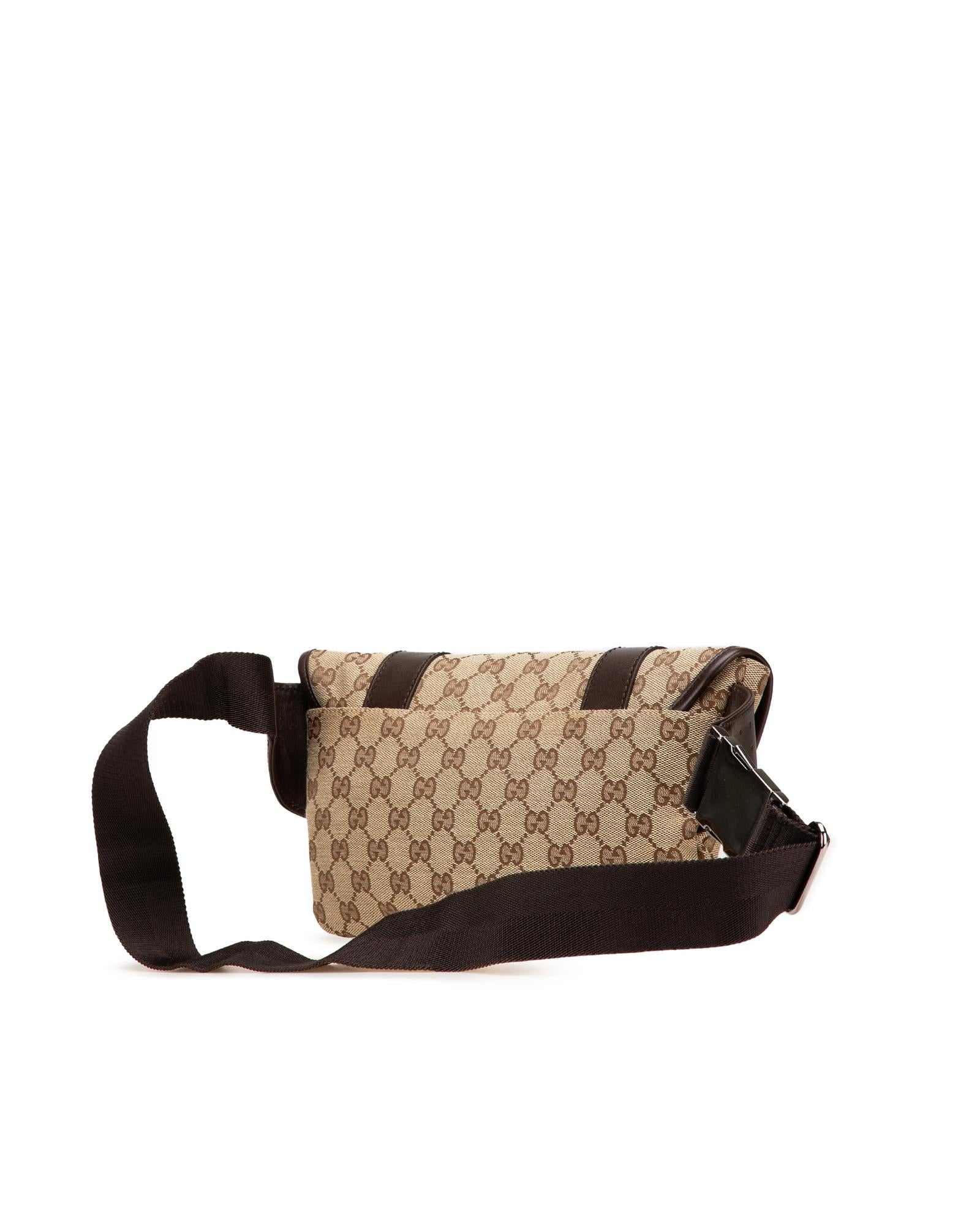 This belt bag features a canvas body with leather trim a flat canvas waist strap with buckle closure a top flap with velcro closures and an interior zip pocket.