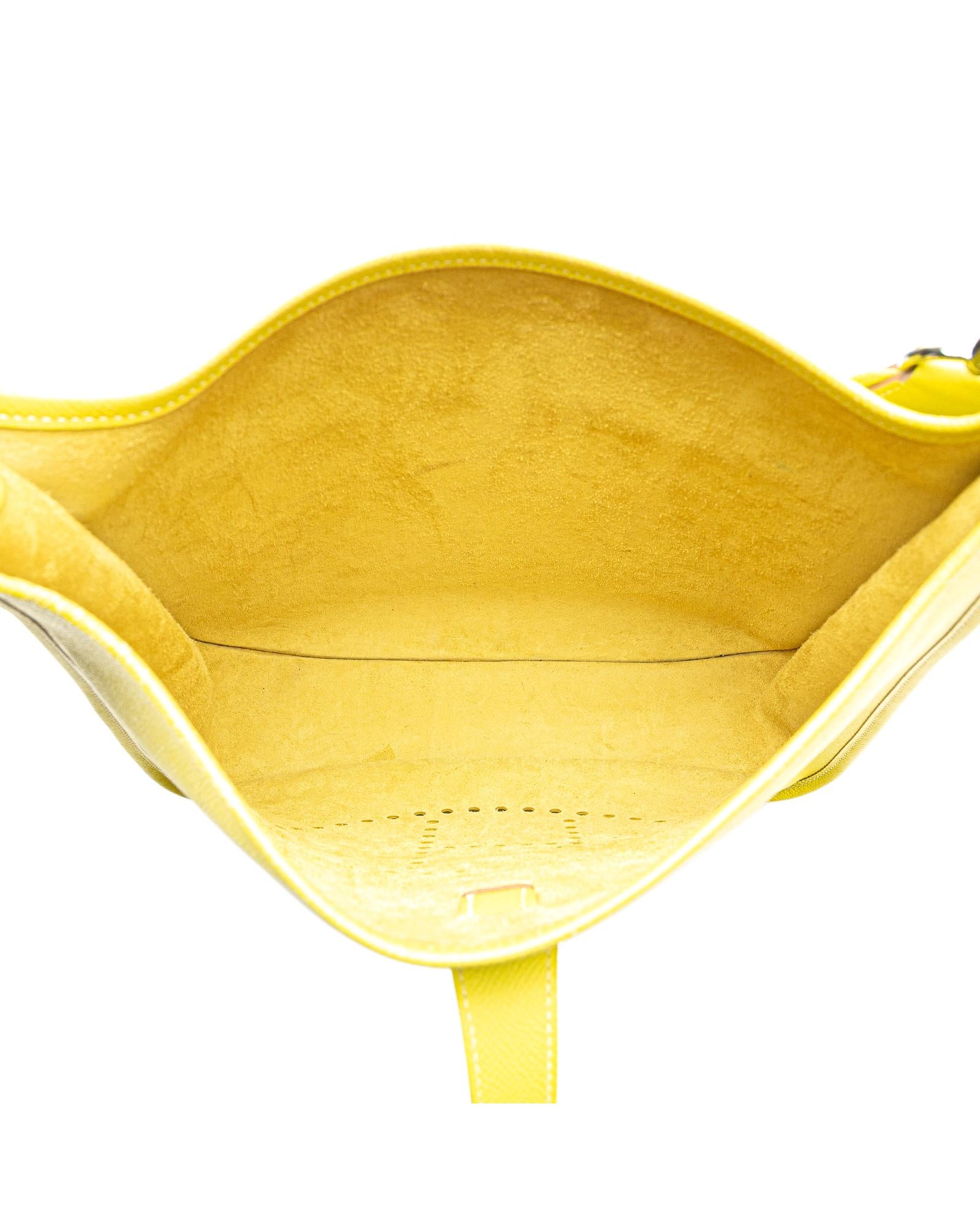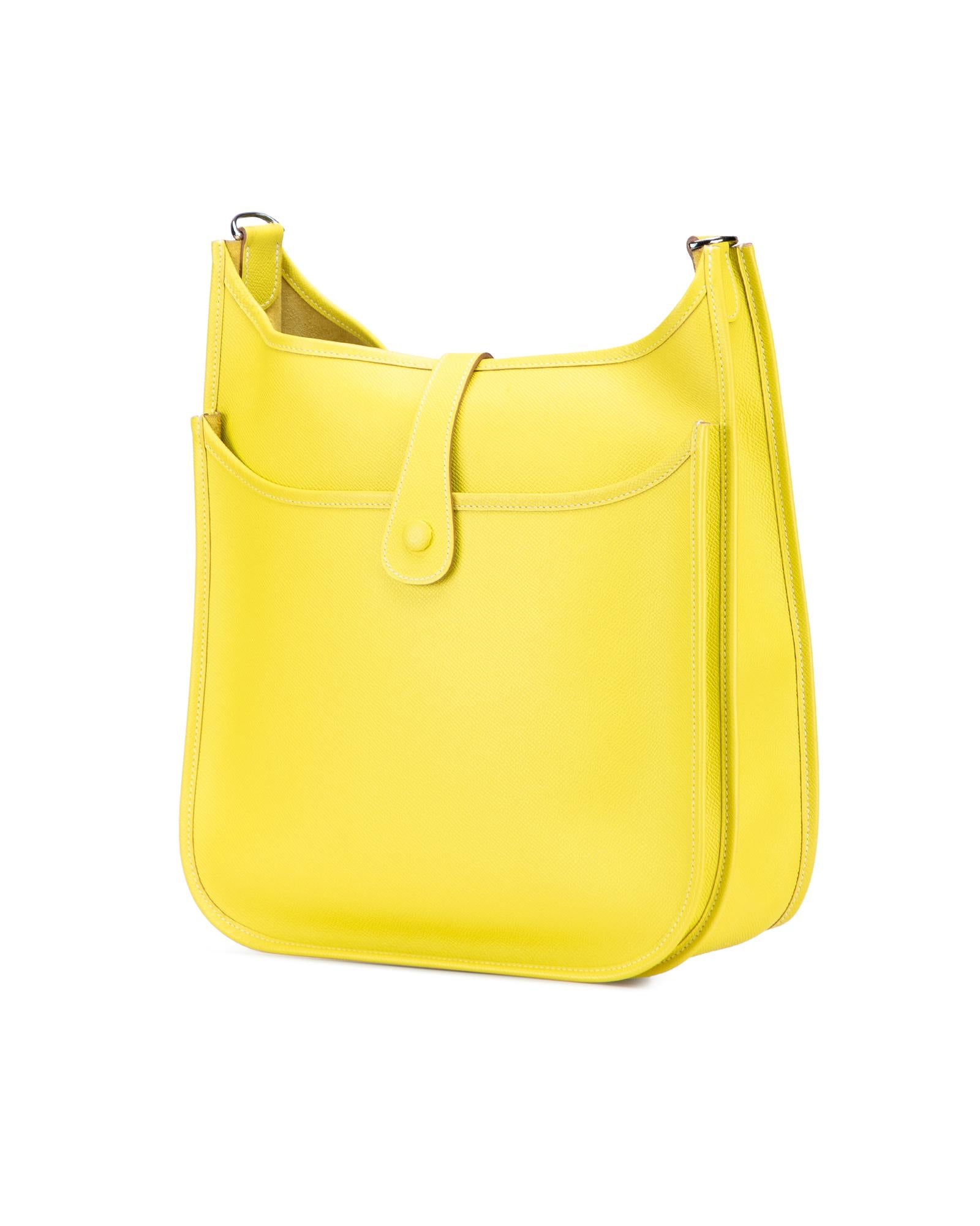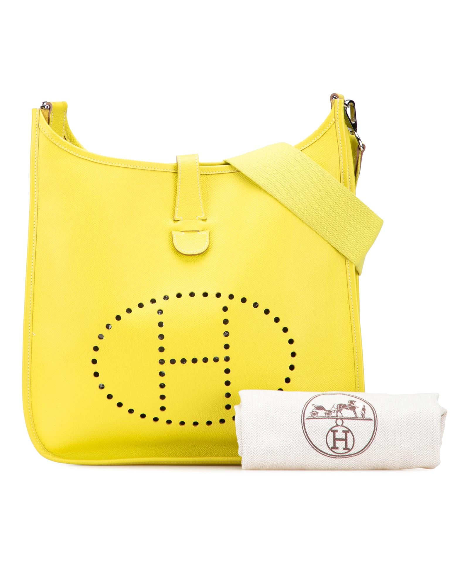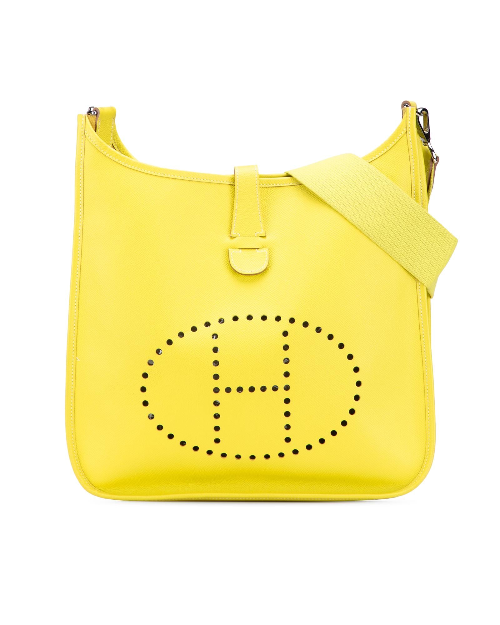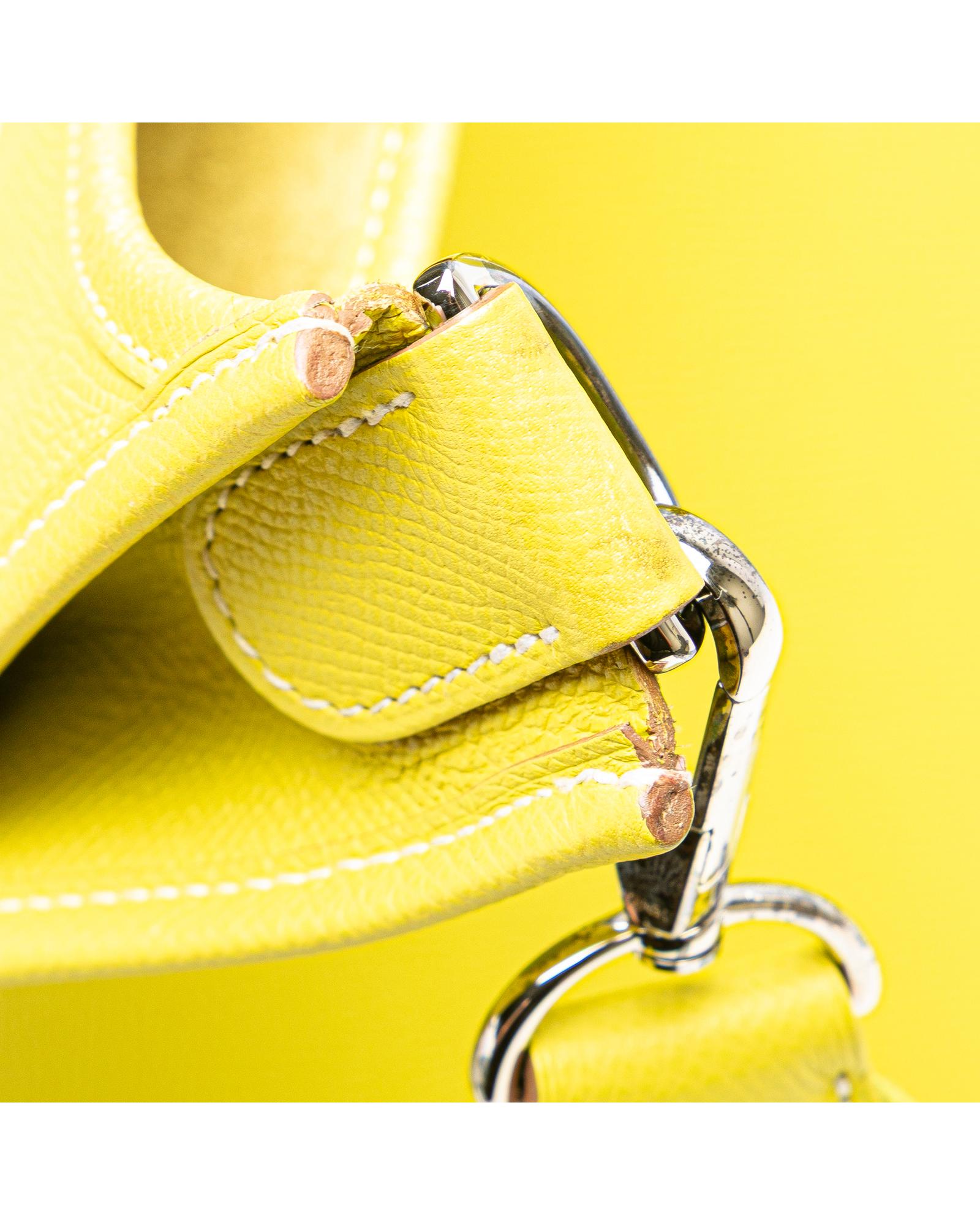 This Evelyne III features a Epsom leather body in Lime color adjustable flat strap a top strap and snap button closure an exterior back slip pocket and an interior slip pocket.Brand: Hermes Vintage