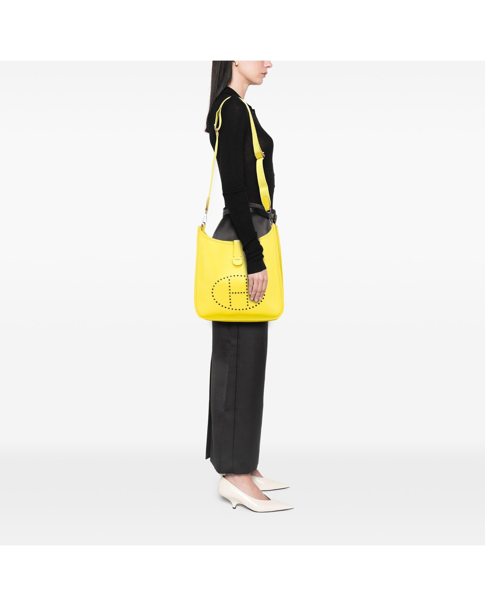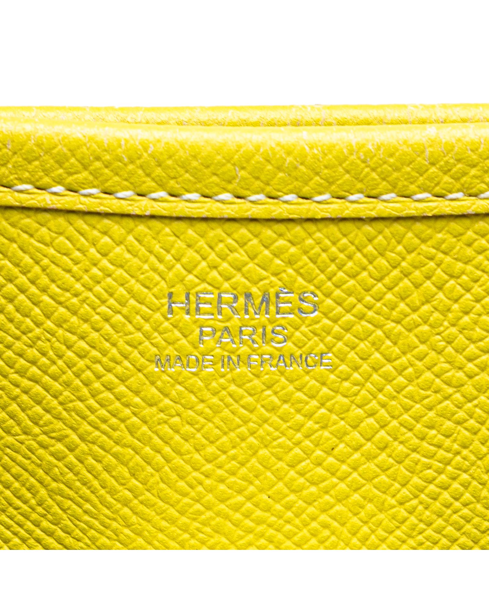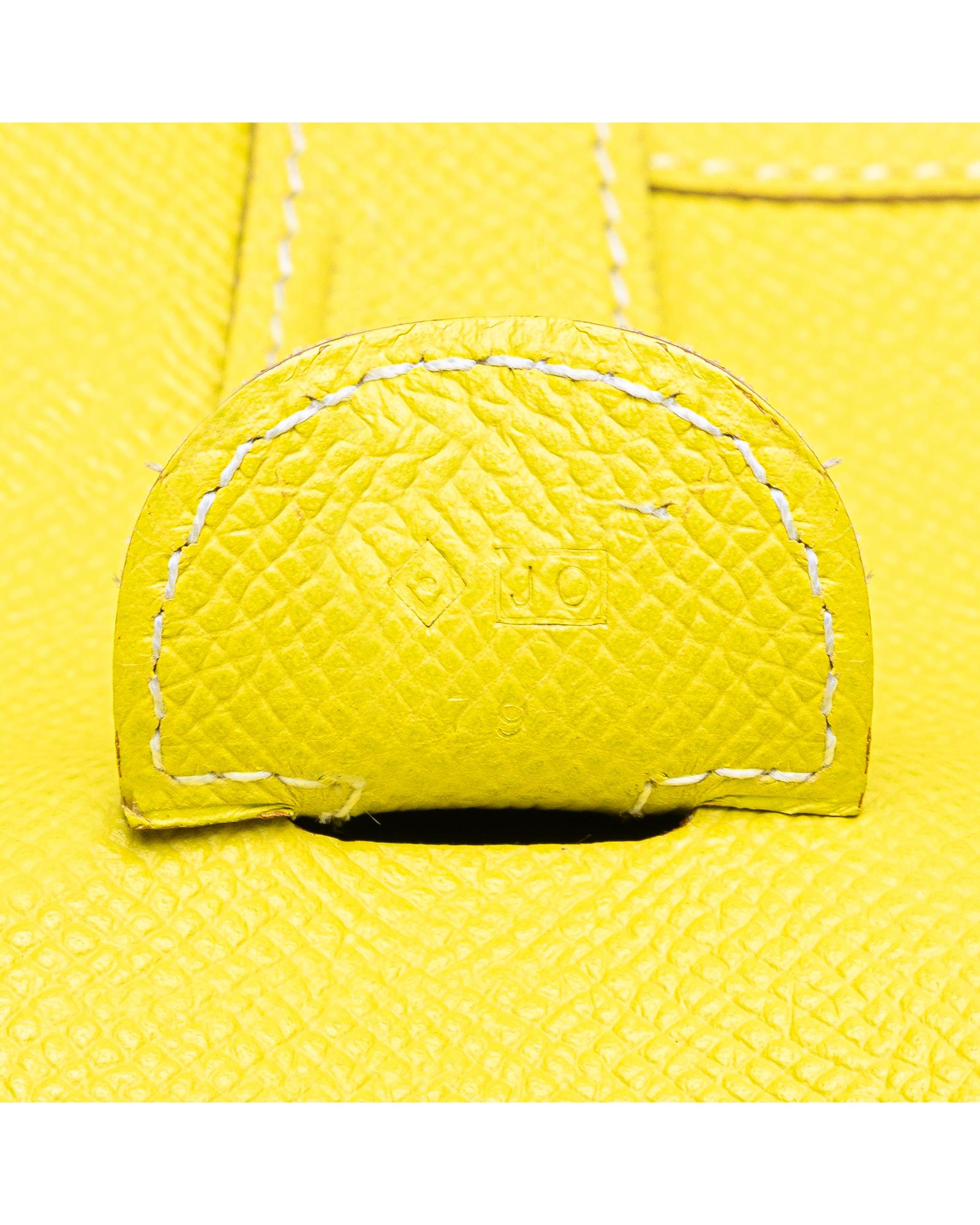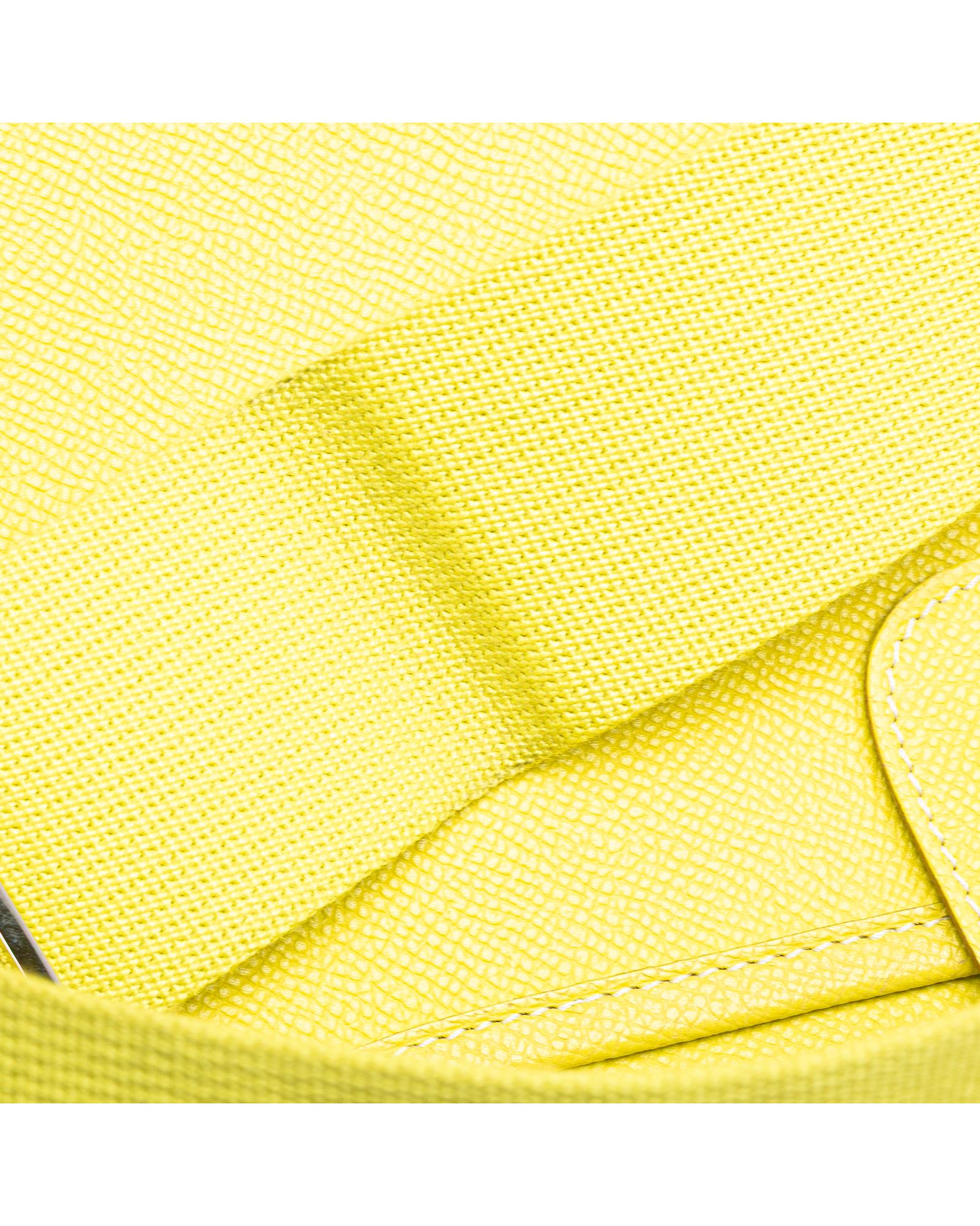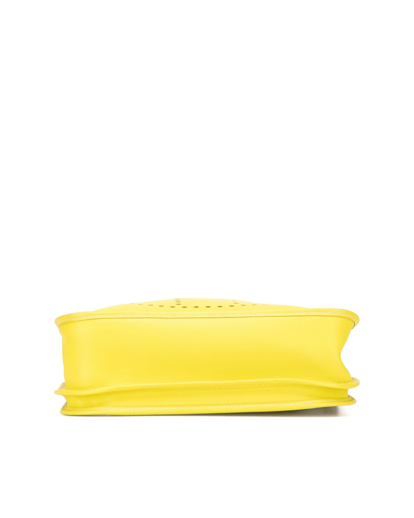 This Evelyne III features a Epsom leather body in Lime color adjustable flat strap a top strap and snap button closure an exterior back slip pocket and an interior slip pocket.Brand: Hermes Vintage