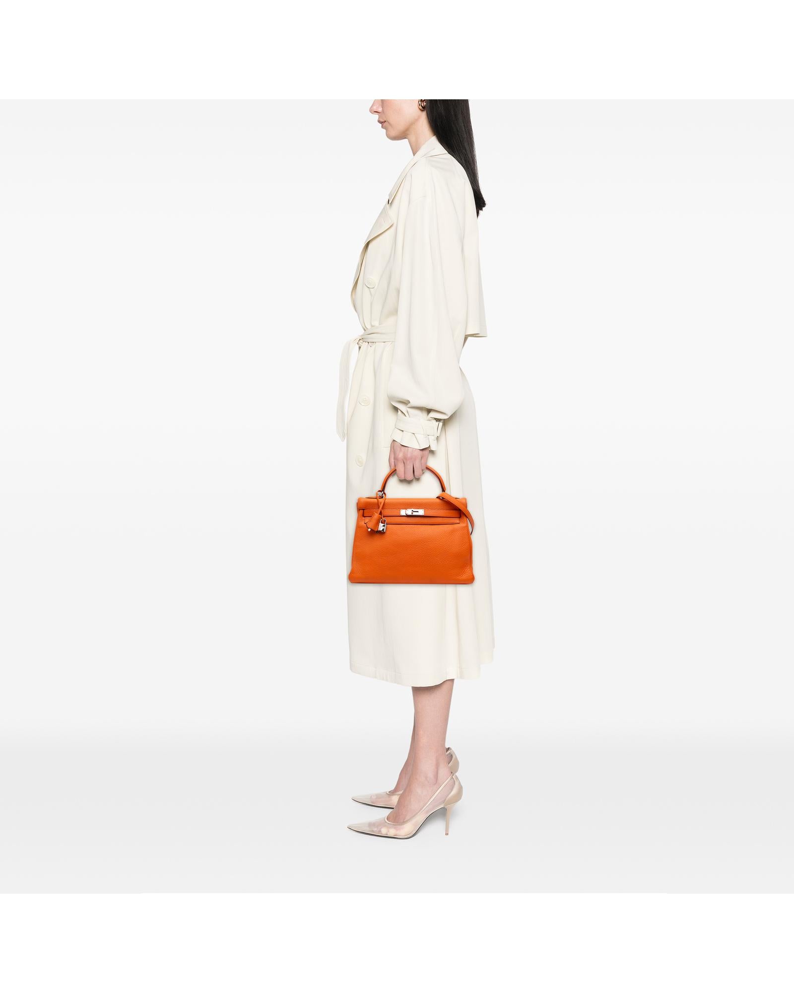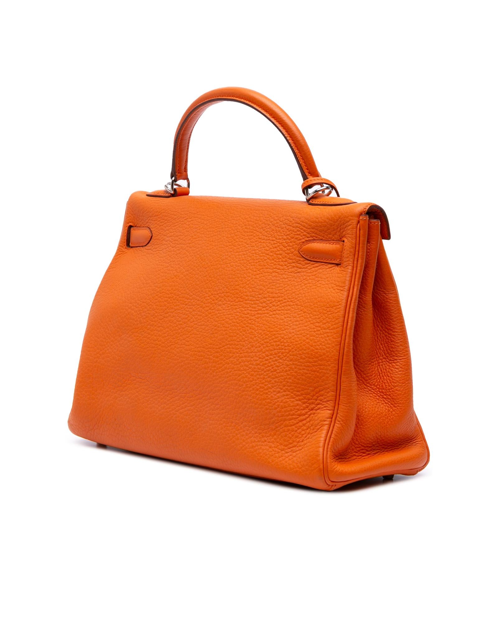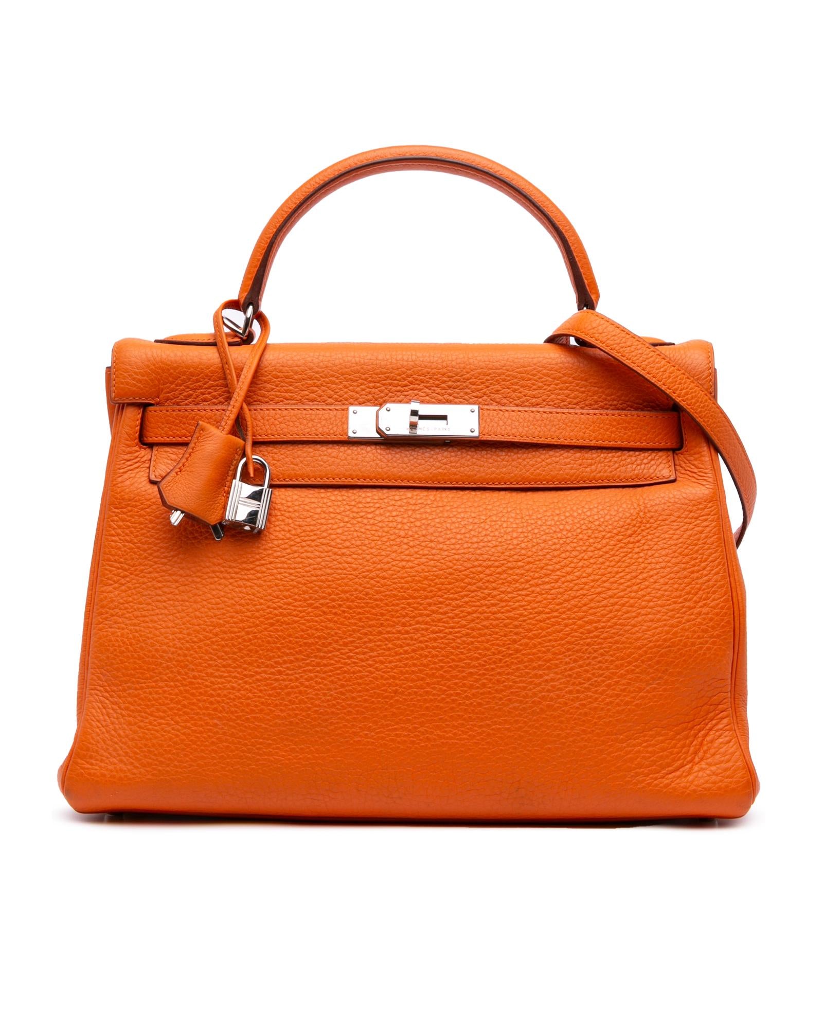 The Kelly Retourne 32 features a Clemence leather body a flat leather top handle a detachable flat leather shoulder strap a top flap with twist lock closure and padlock and interior zip and slip pockets.Brand: Hermes Vintage
