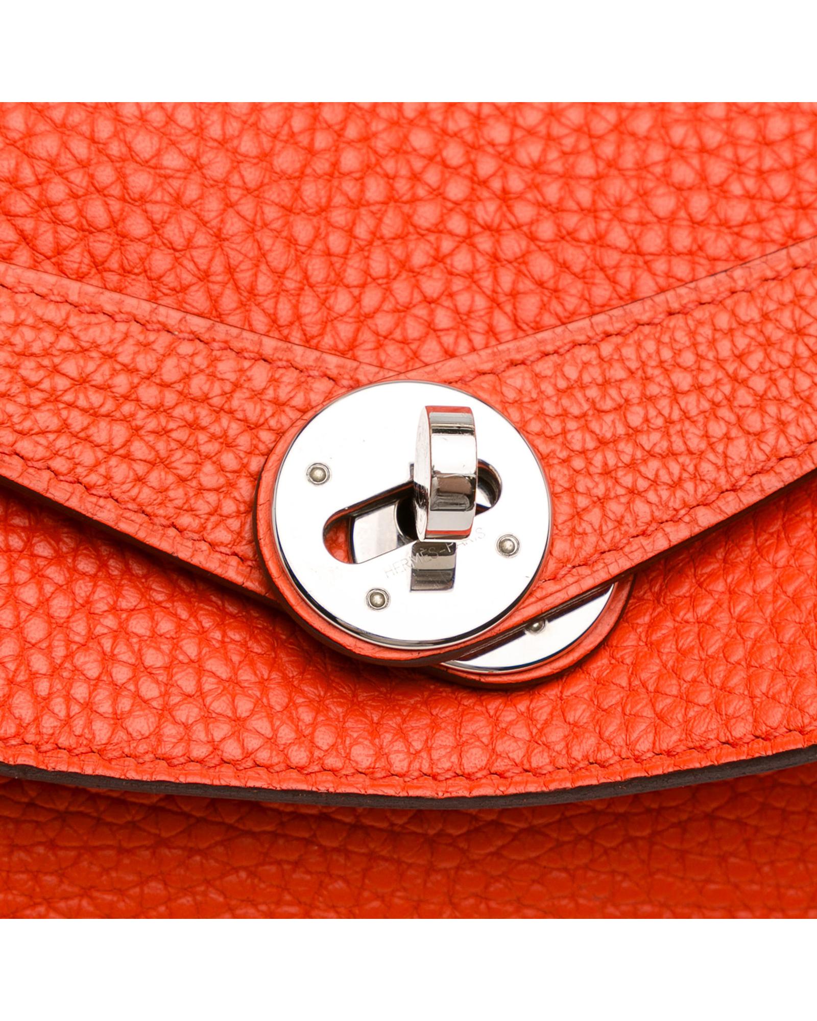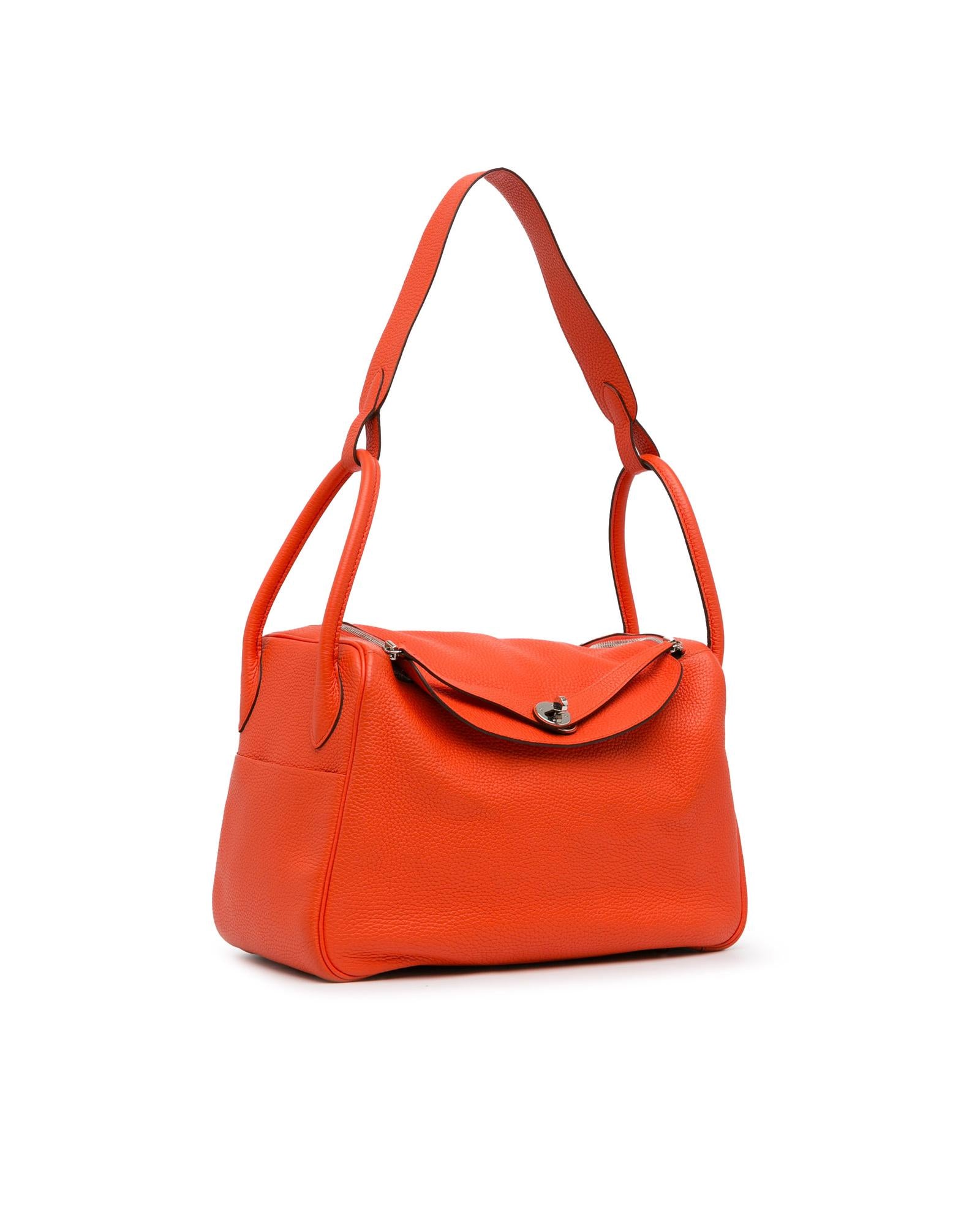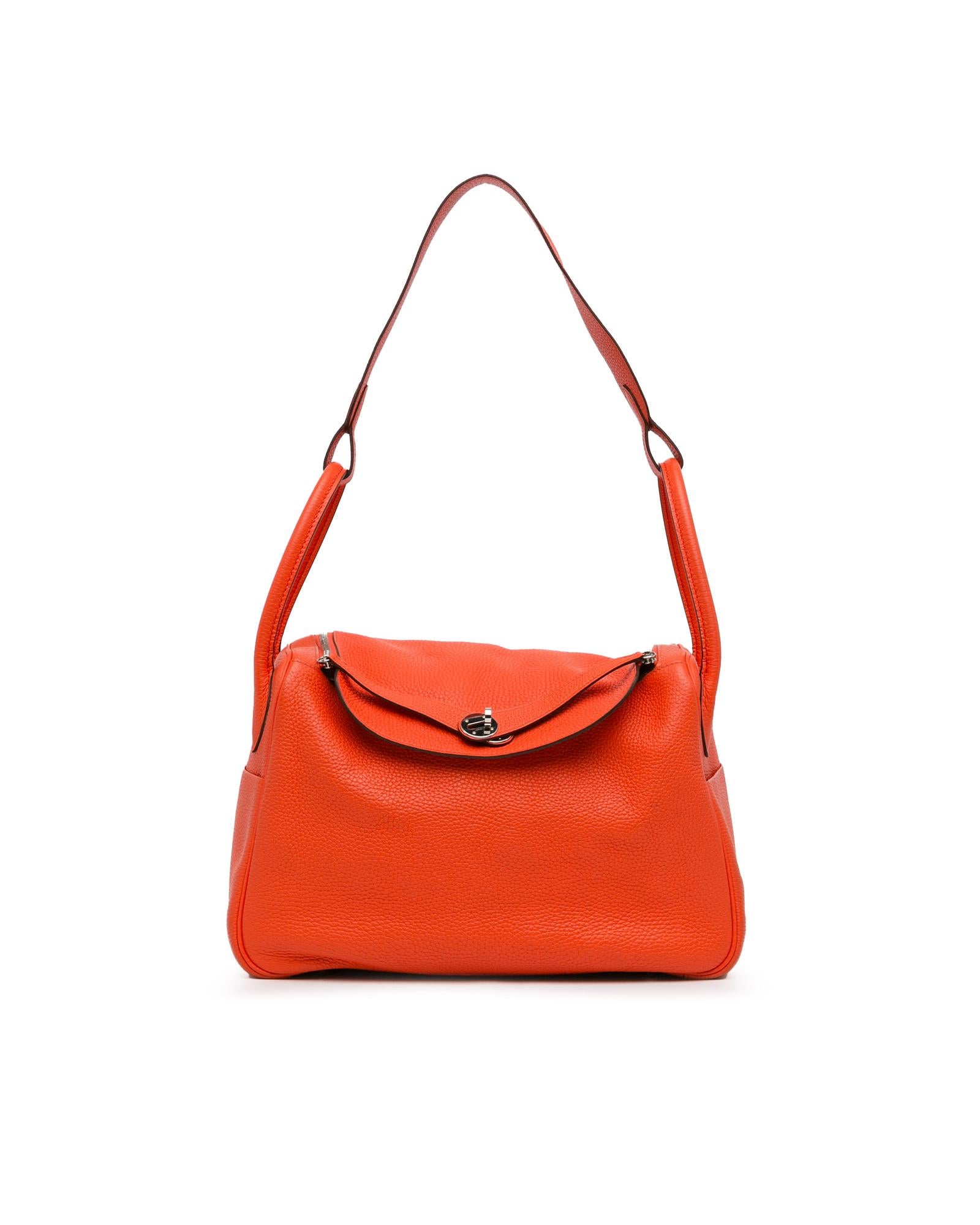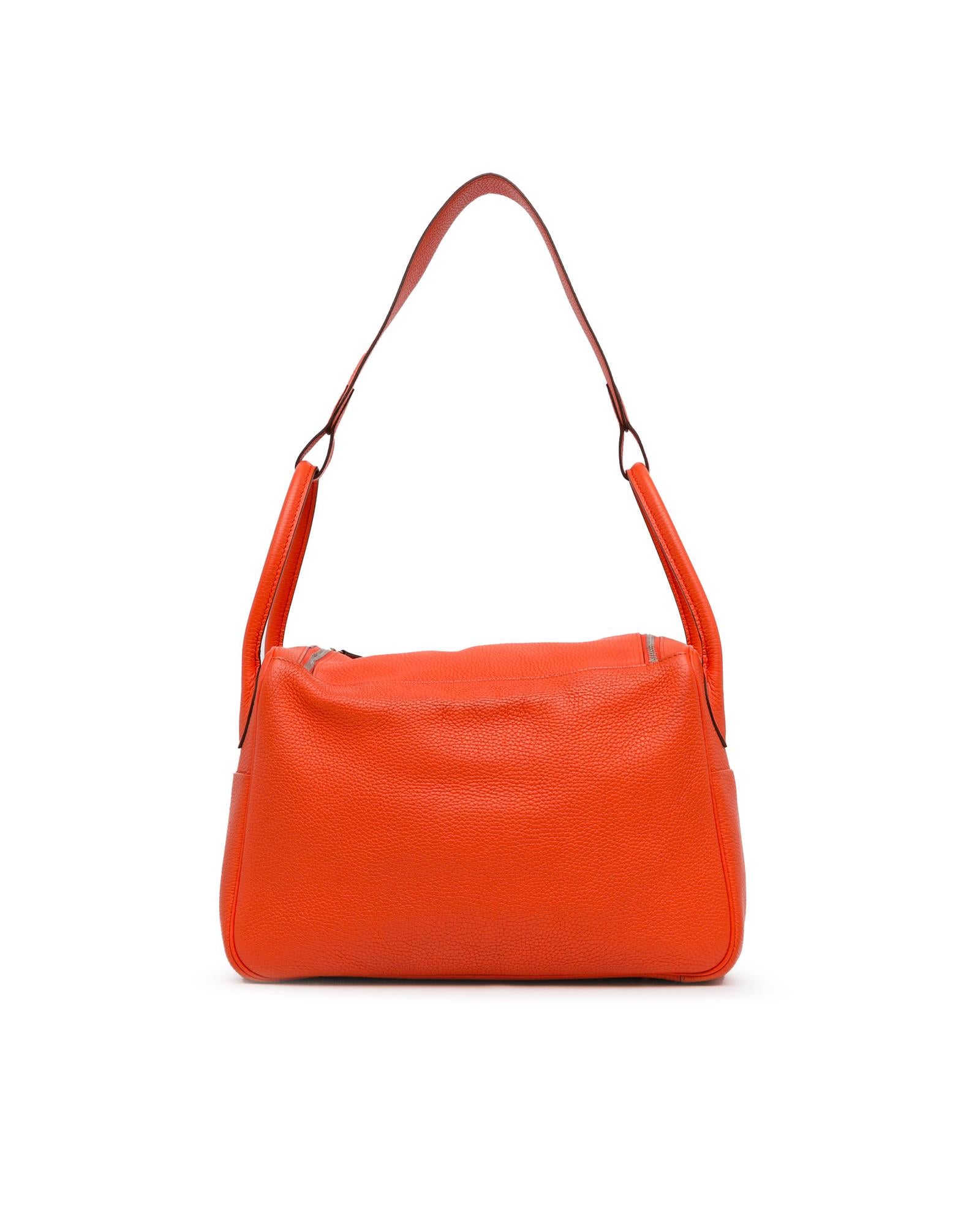 The Lindy features a Clemence leather body in Capucine color rolled leather handles a flat leather strap and double top zip closures with a top flap and metal turnlock closure.Brand: Hermes Vintage