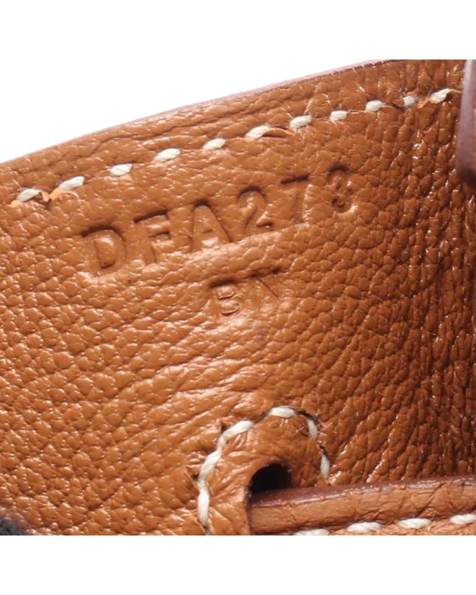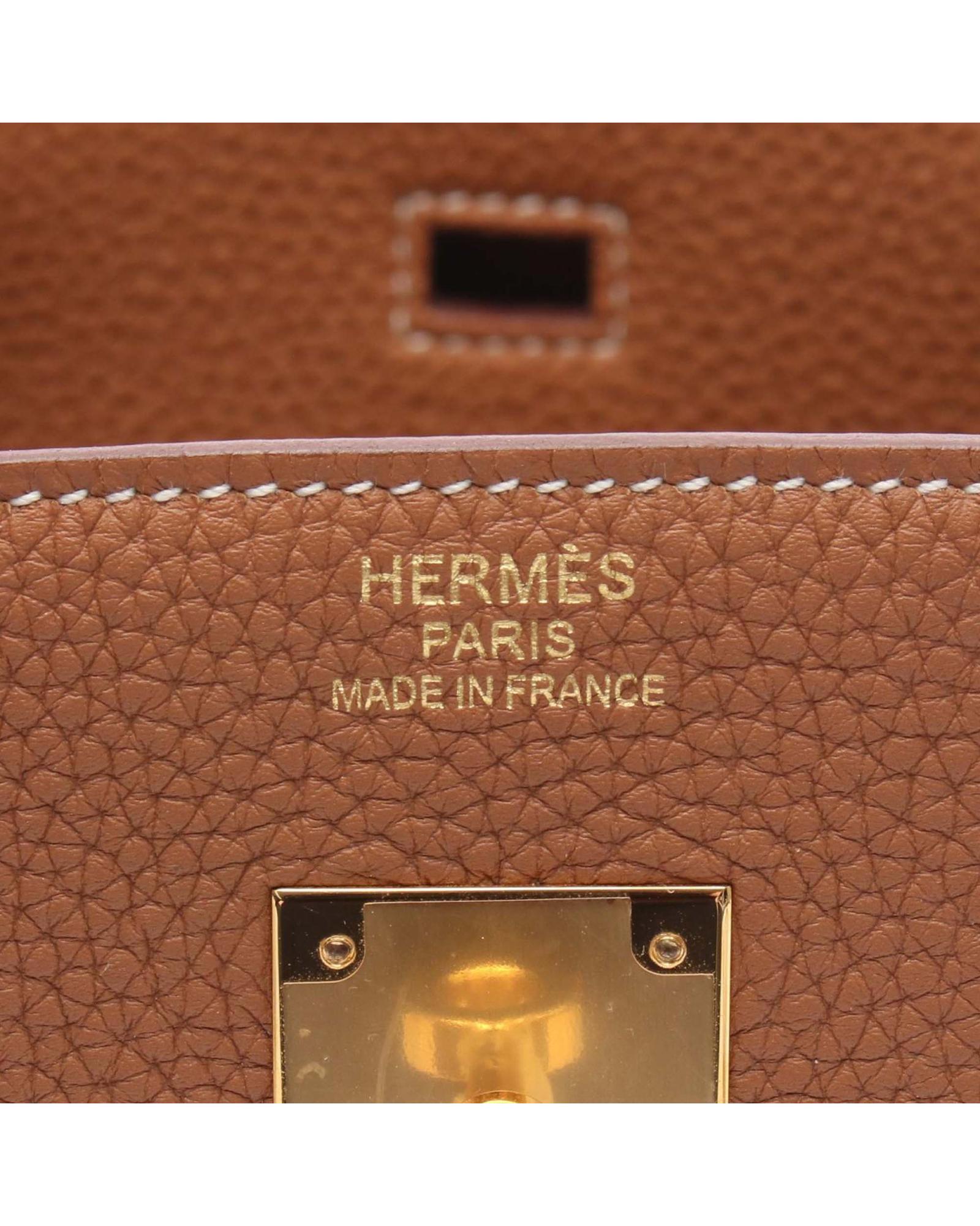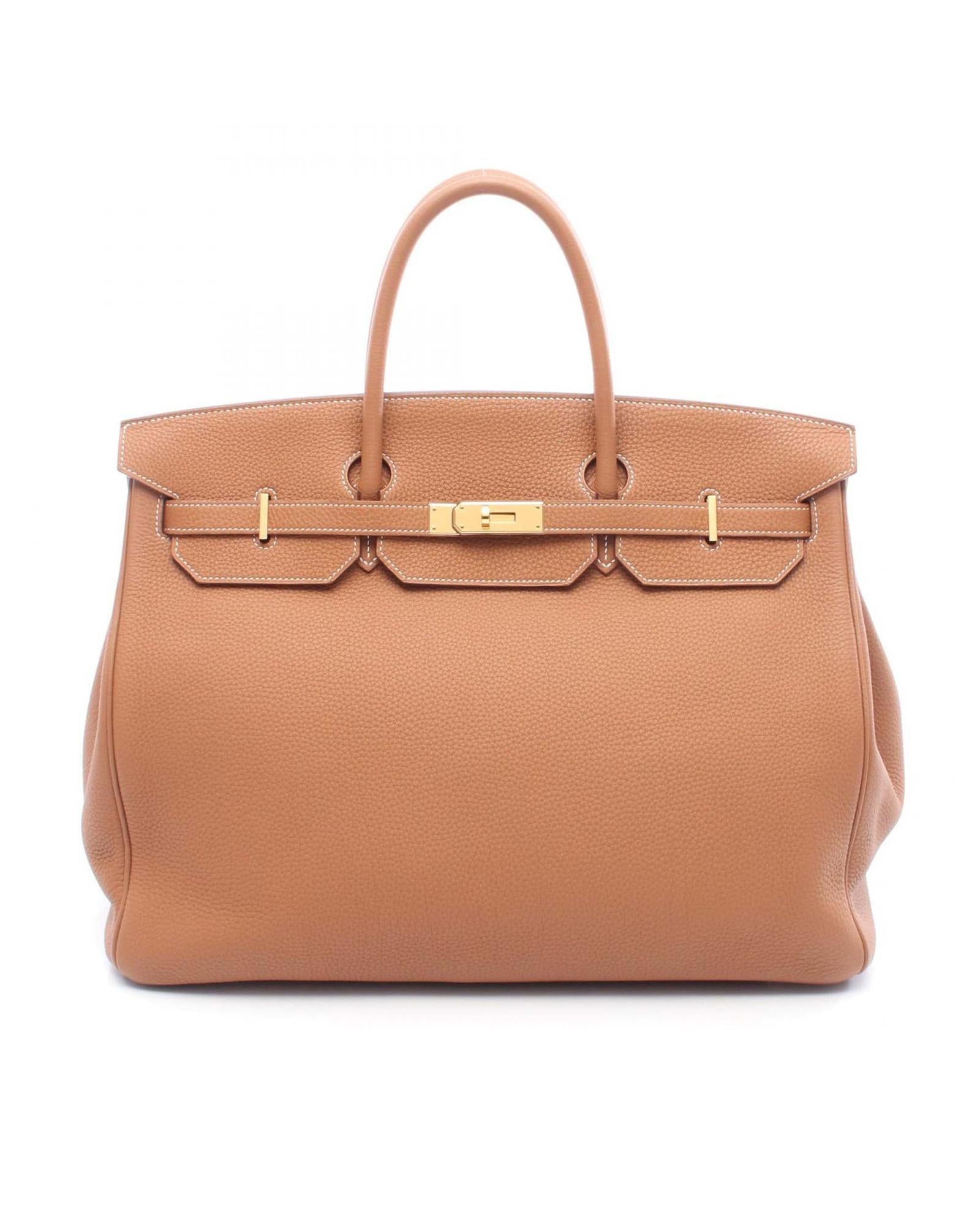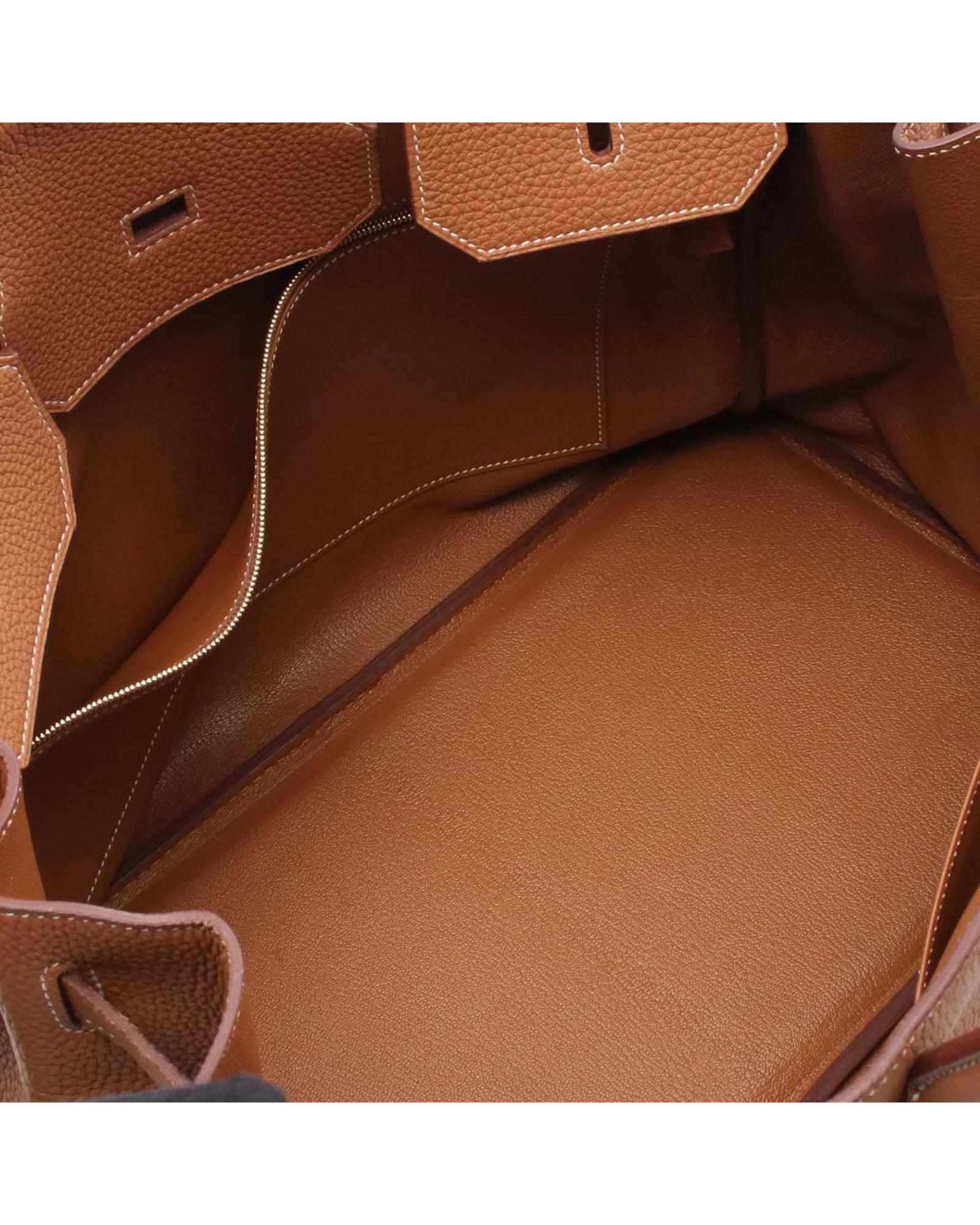 This Birkin 40 features a leather body in Gold color rolled leather handles a front flap with turn-lock closure gold-tone hardware and interior open and zip pockets.