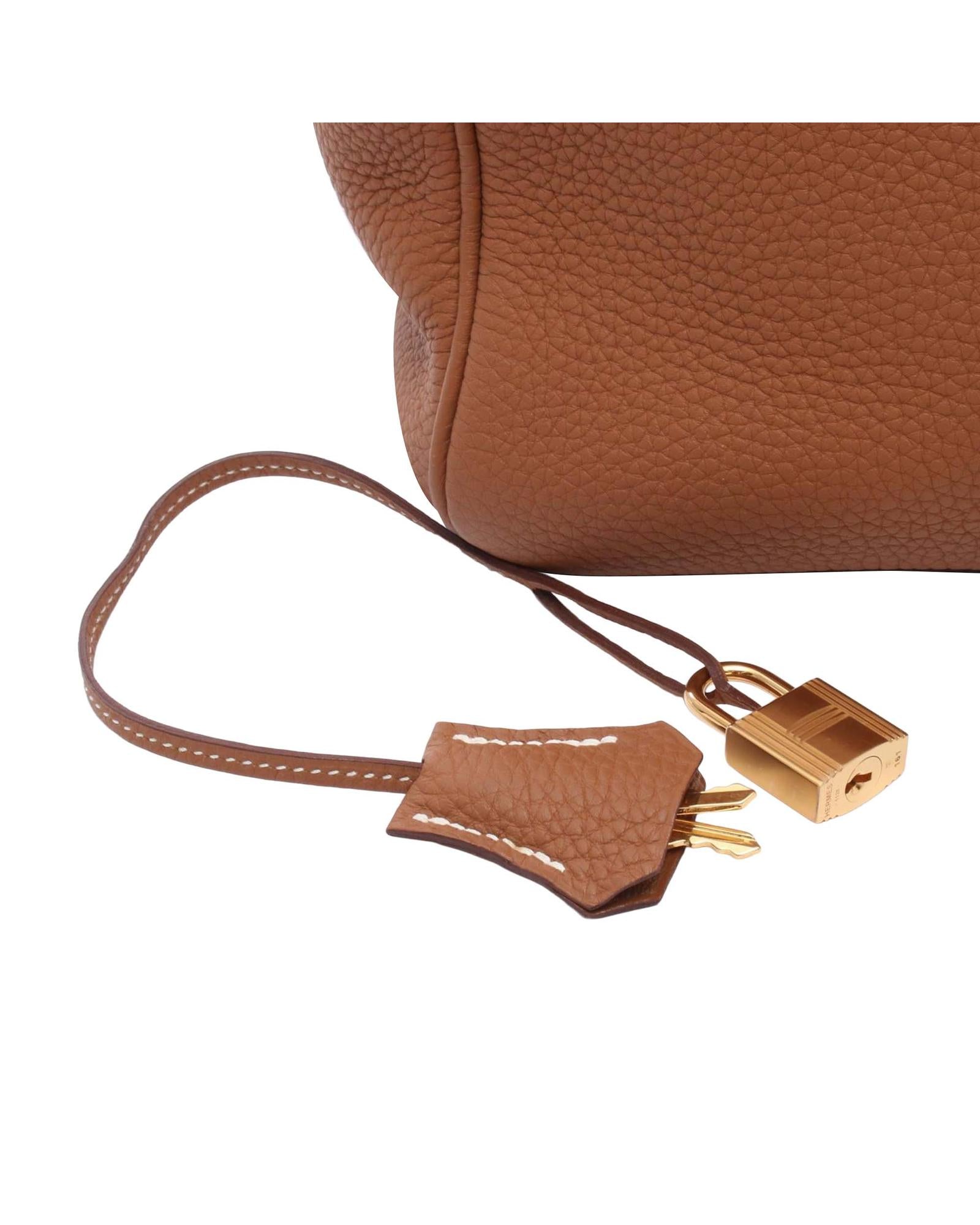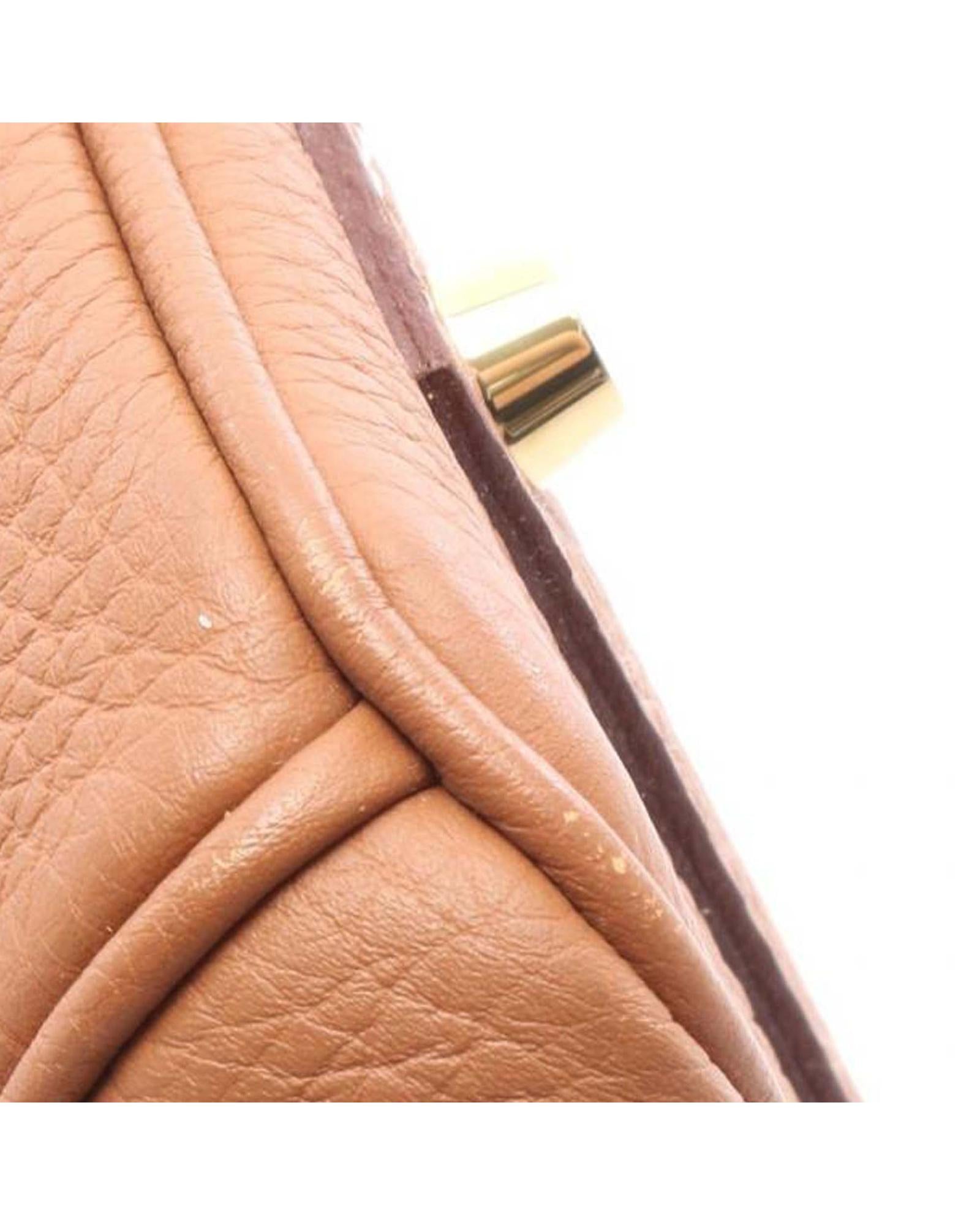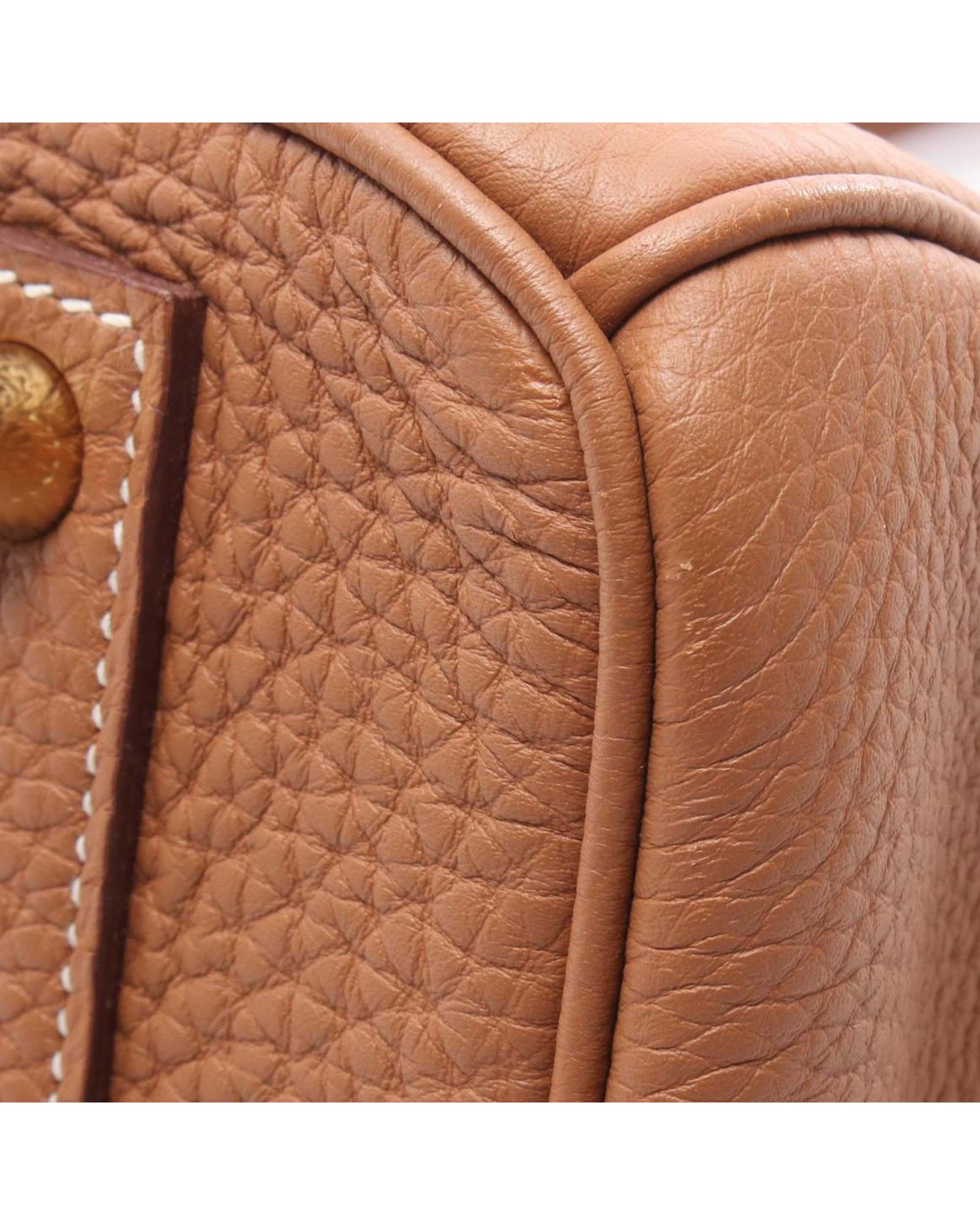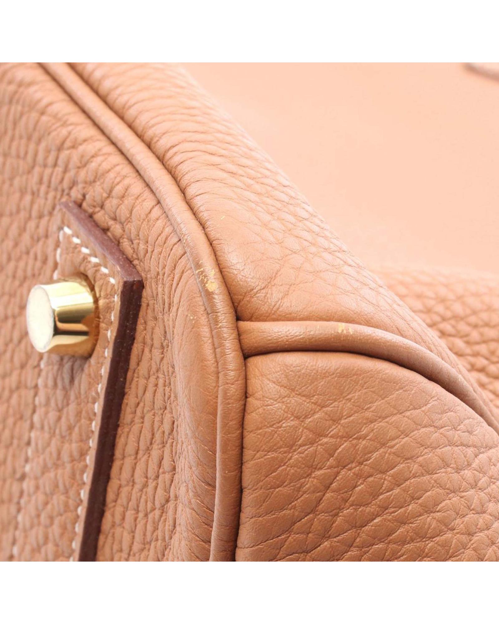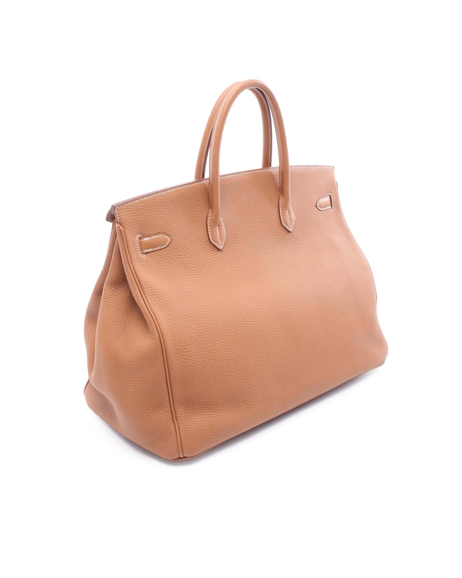 This Birkin 40 features a leather body in Gold color rolled leather handles a front flap with turn-lock closure gold-tone hardware and interior open and zip pockets.