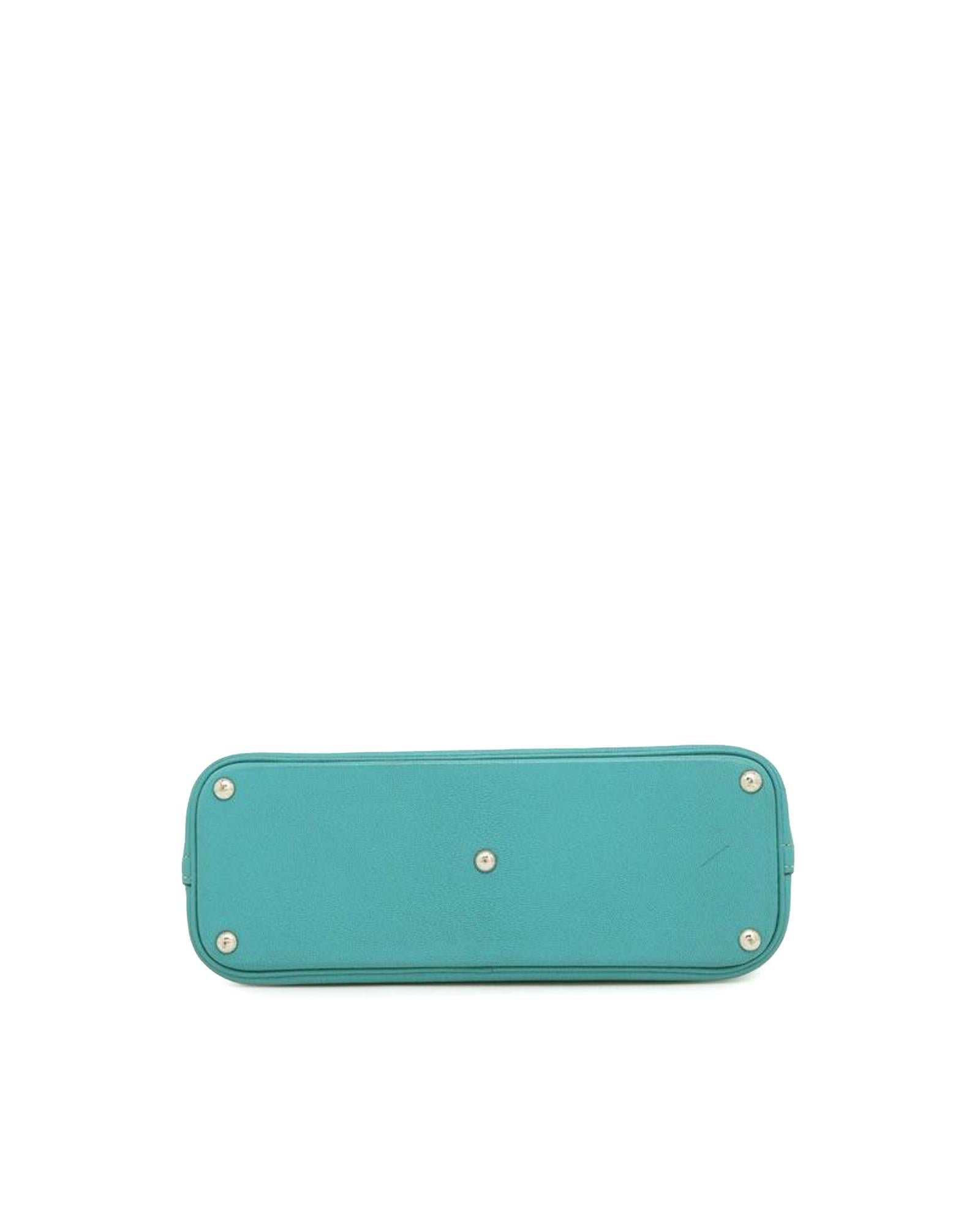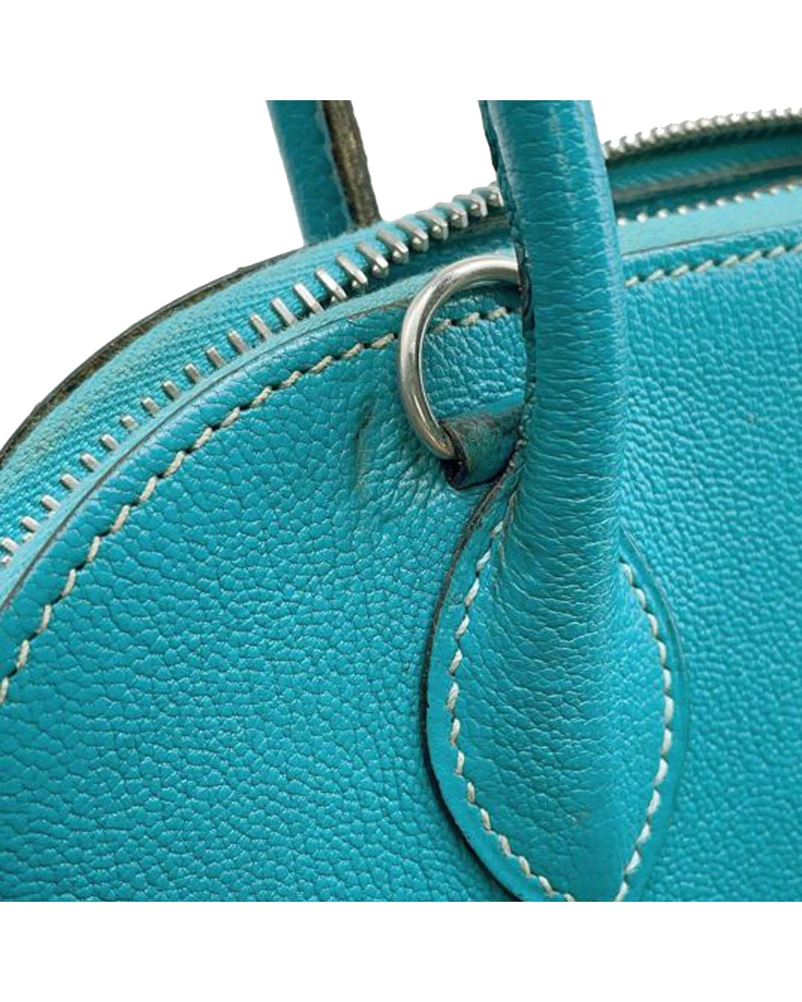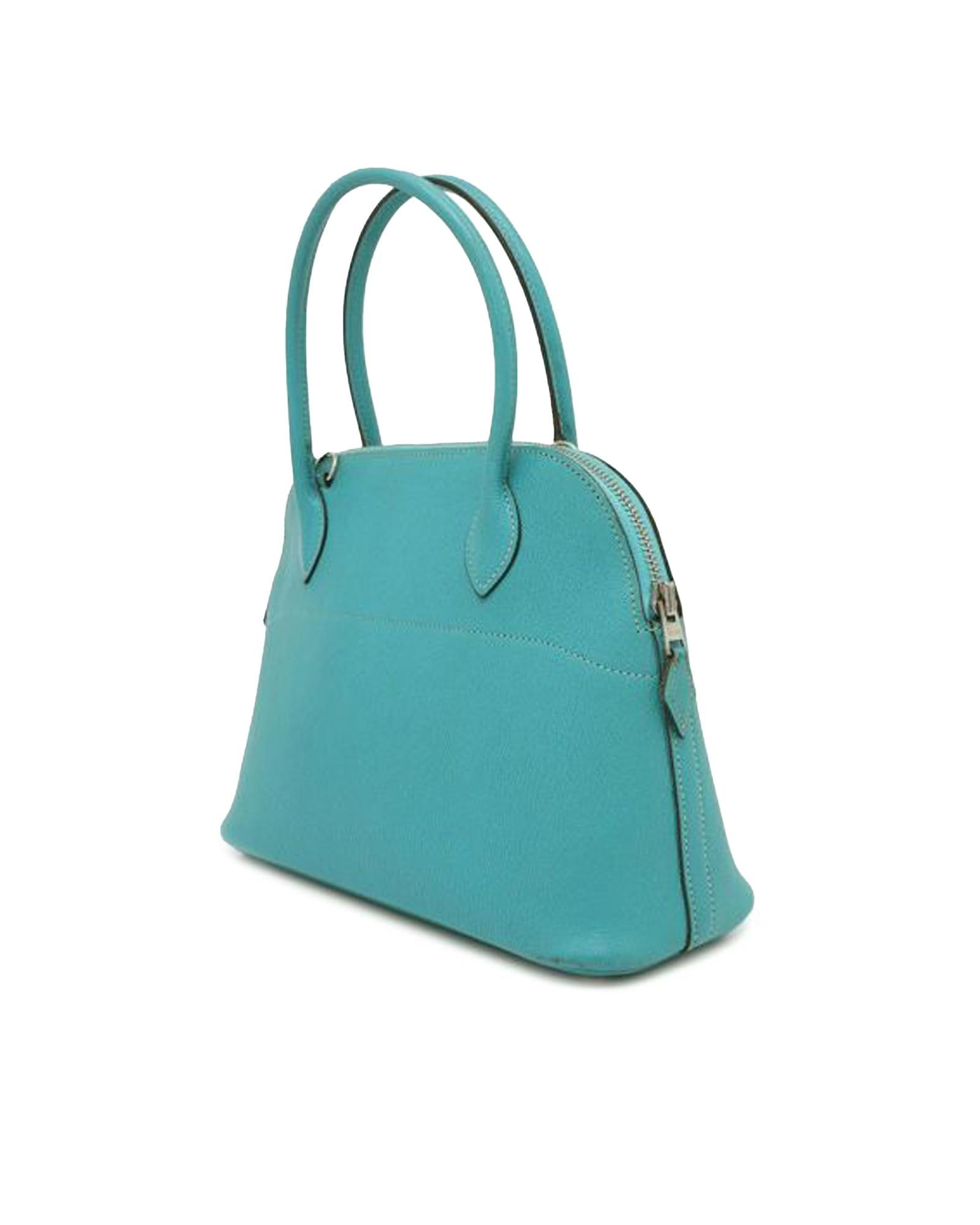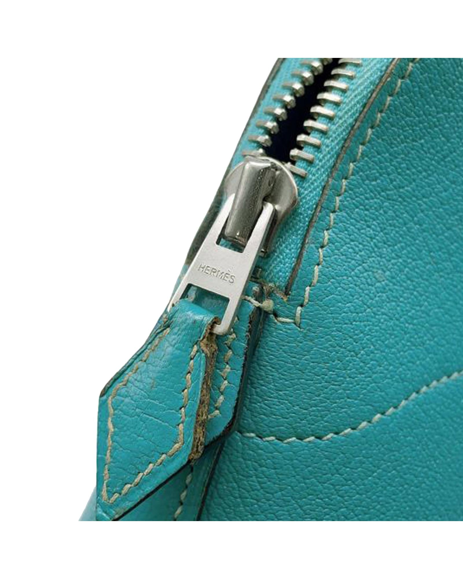 This Bolide 27 features a Chevre Mysore leather body in Lagoon color rolled leather handles a detachable flat leather strap a top zip closure and an interior slip pocket.Brand: Hermes Vintage