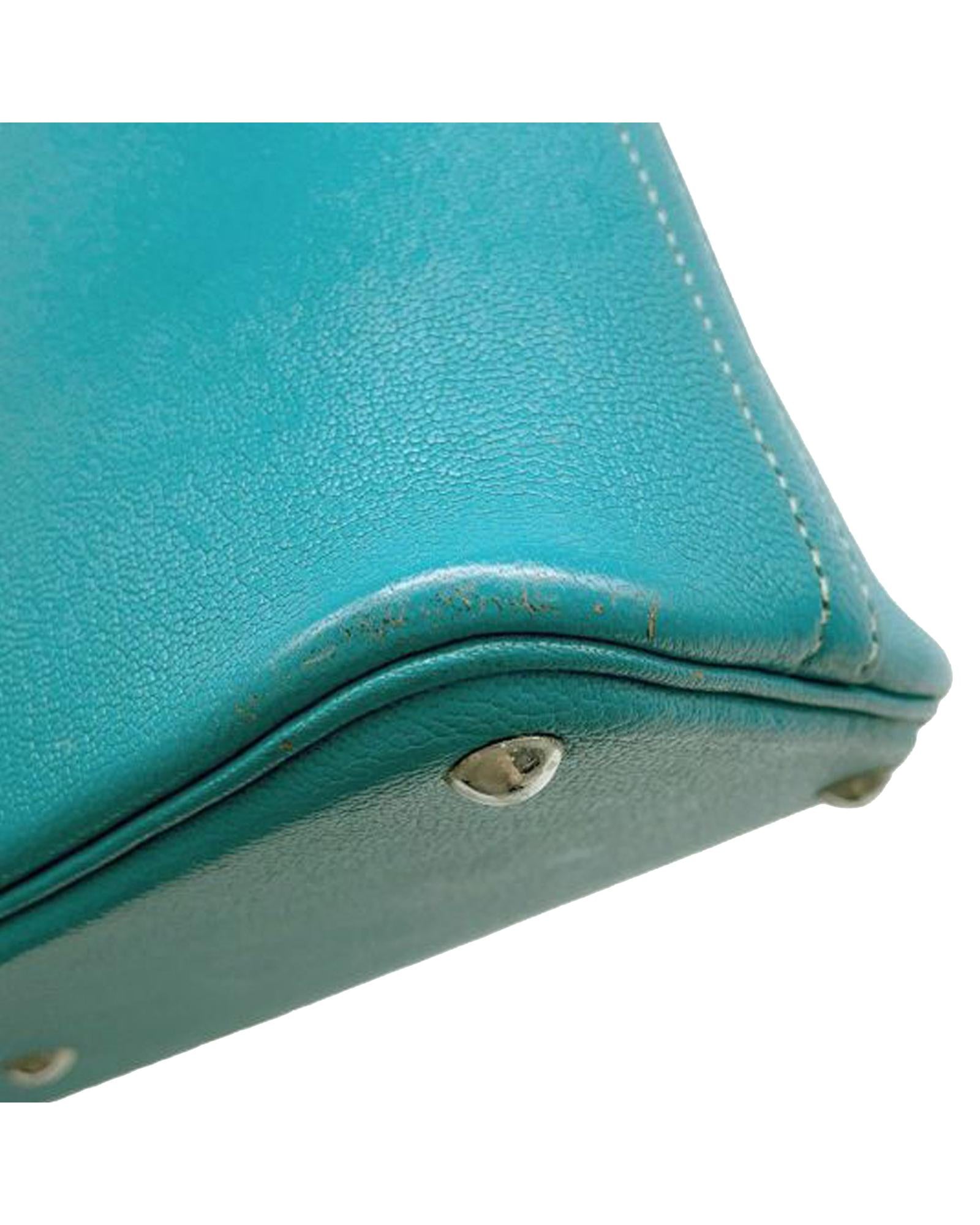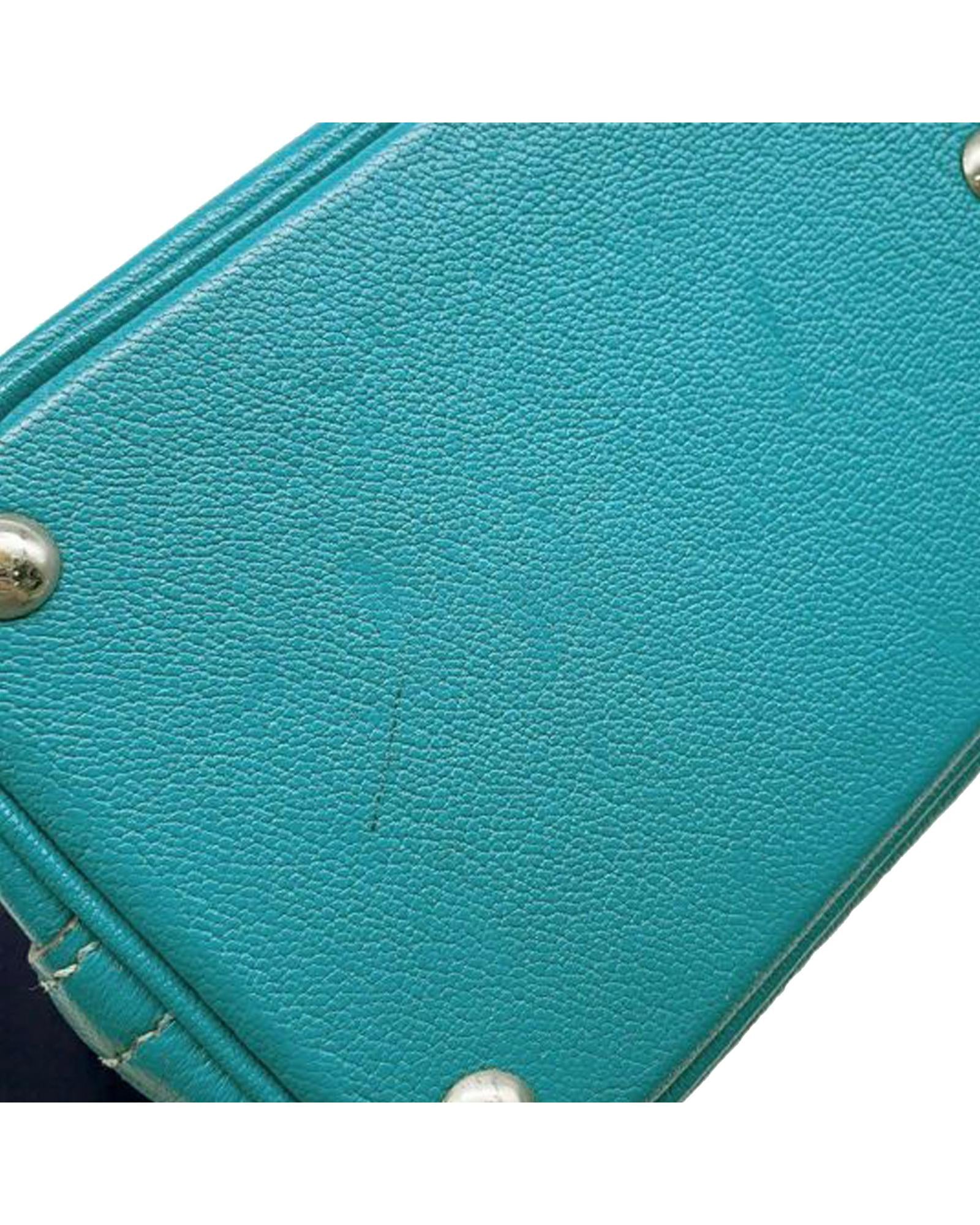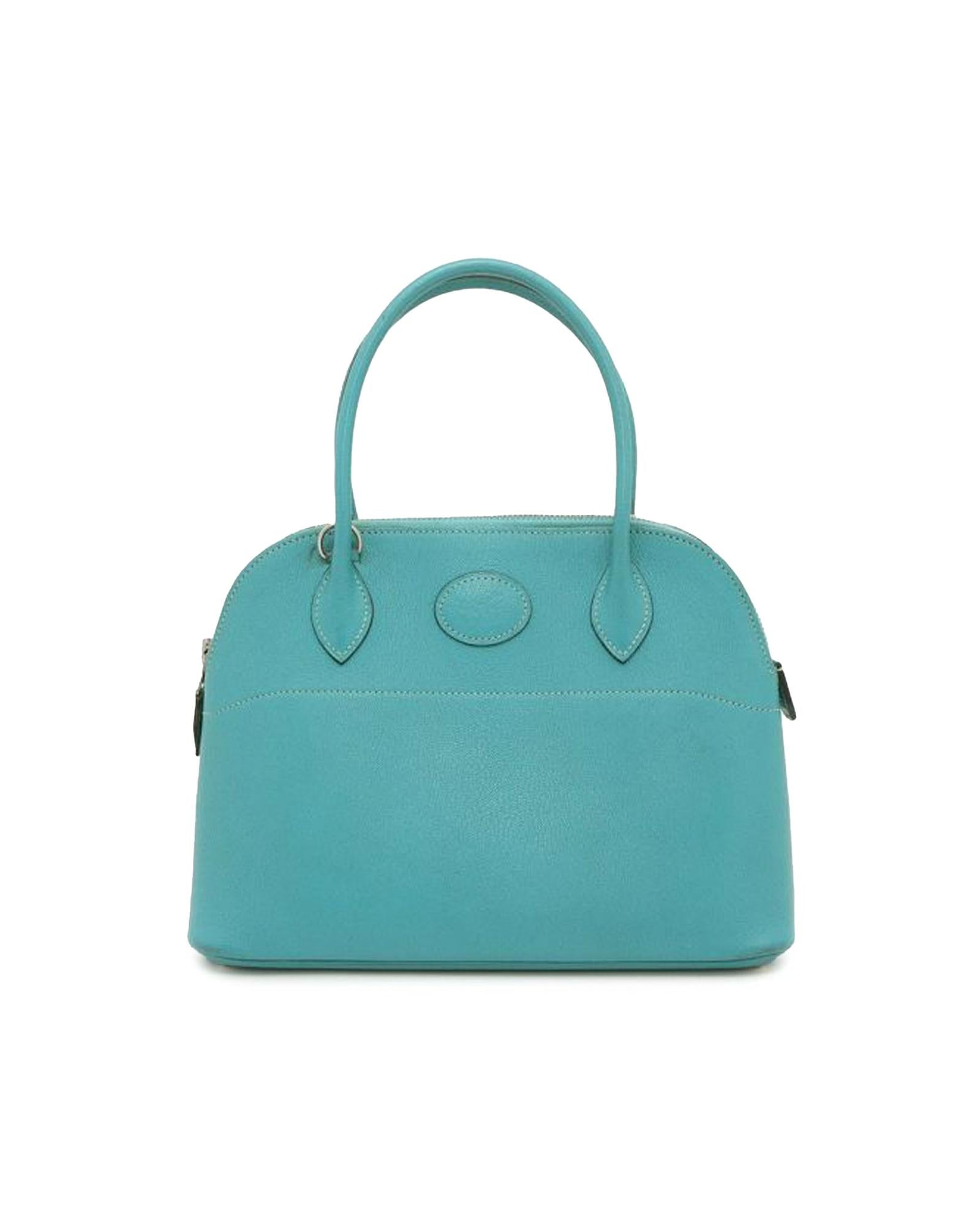 This Bolide 27 features a Chevre Mysore leather body in Lagoon color rolled leather handles a detachable flat leather strap a top zip closure and an interior slip pocket.Brand: Hermes Vintage