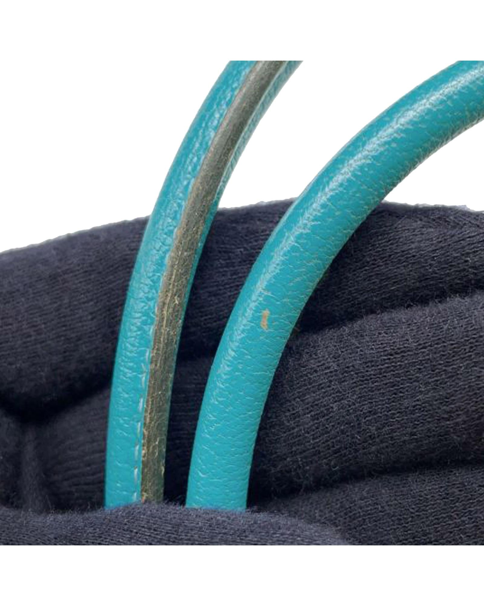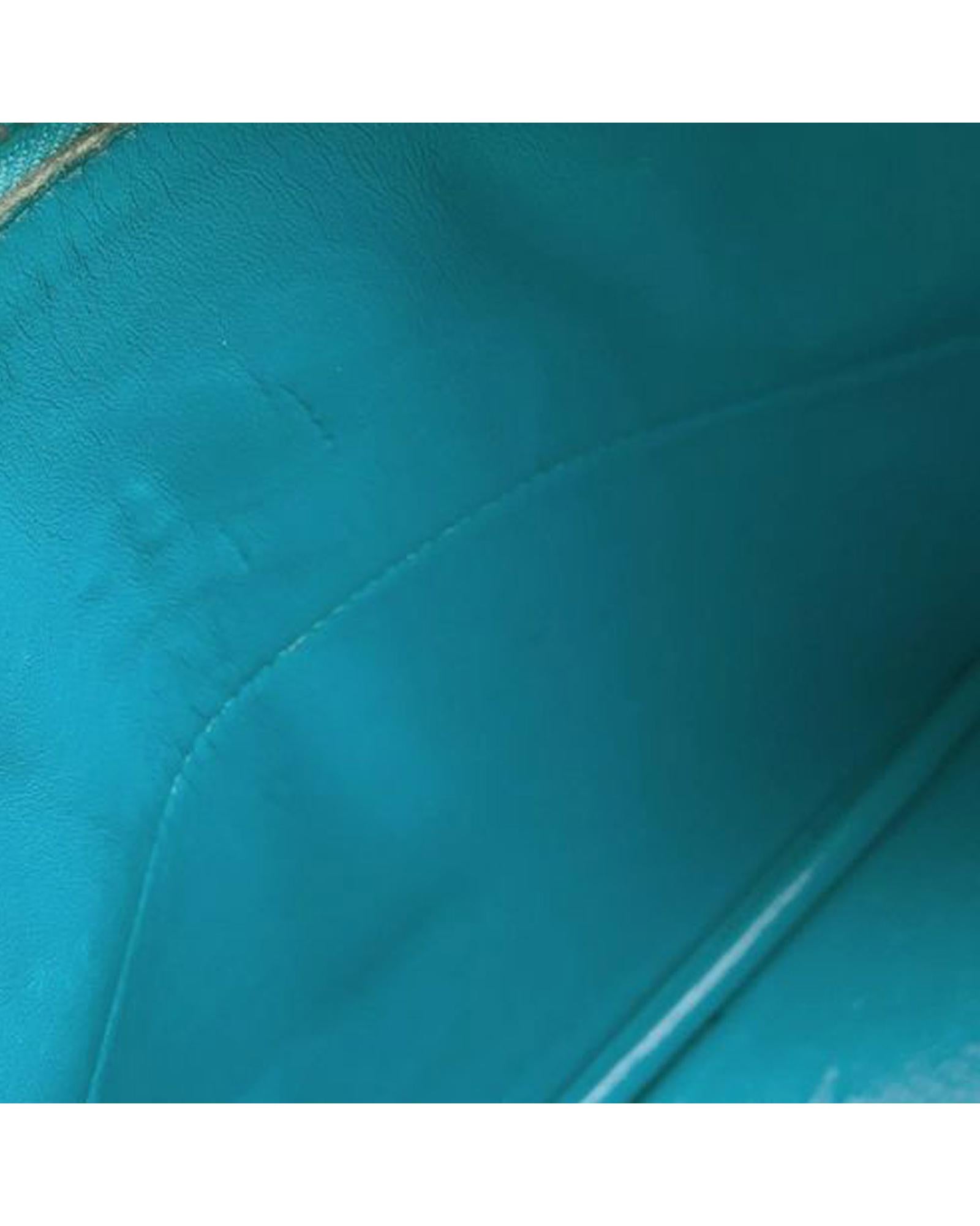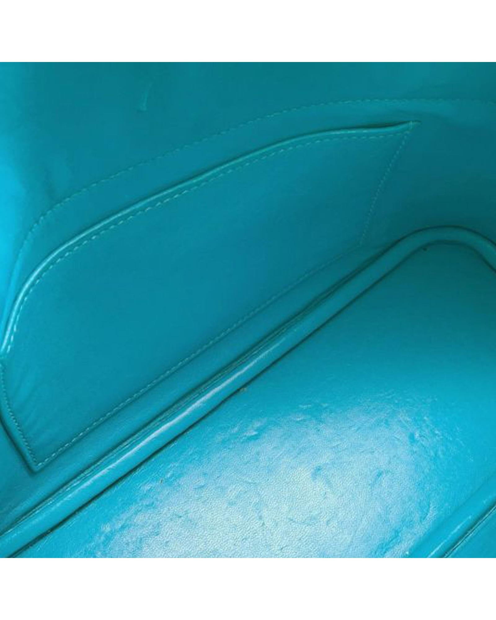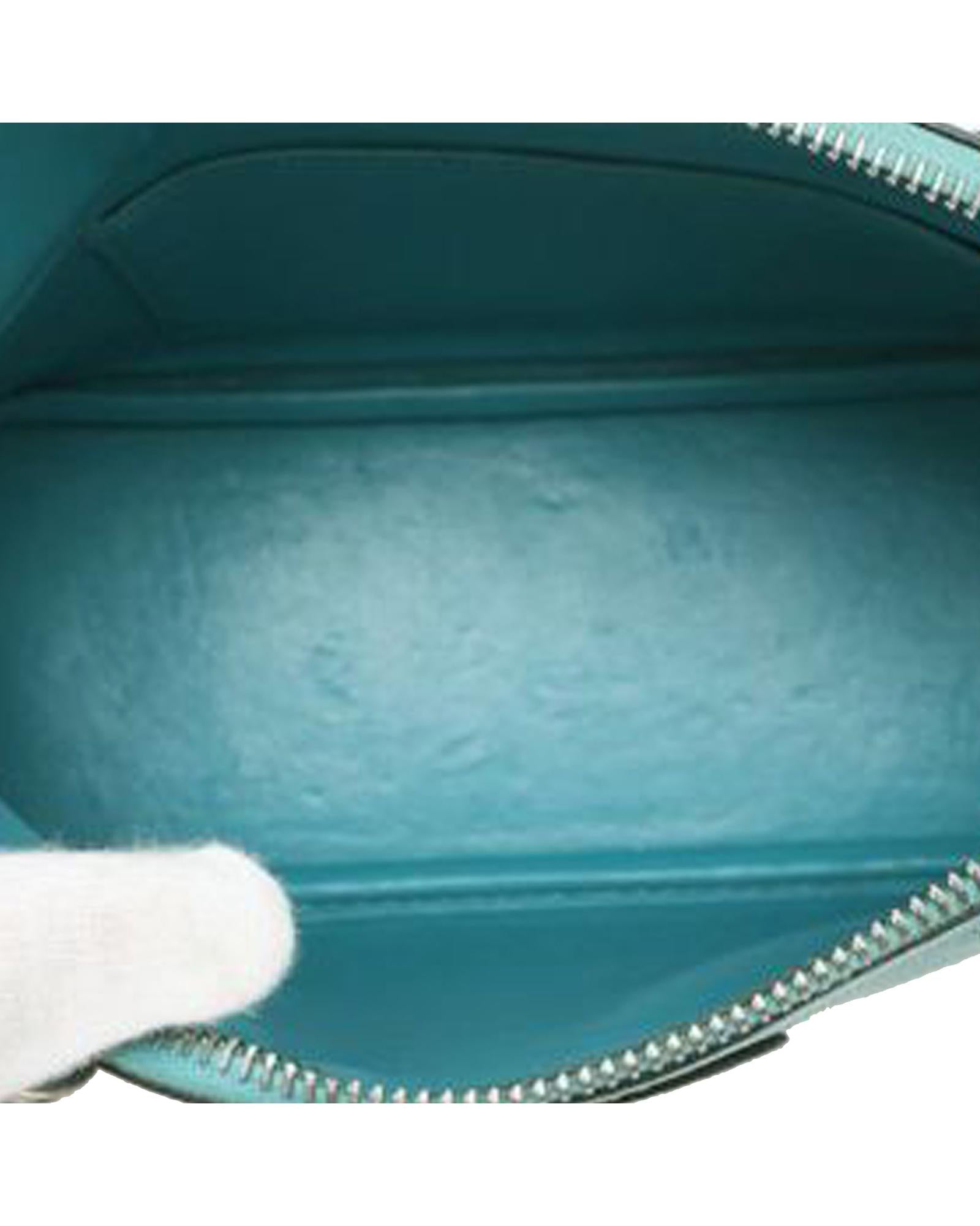 This Bolide 27 features a Chevre Mysore leather body in Lagoon color rolled leather handles a detachable flat leather strap a top zip closure and an interior slip pocket.Brand: Hermes Vintage