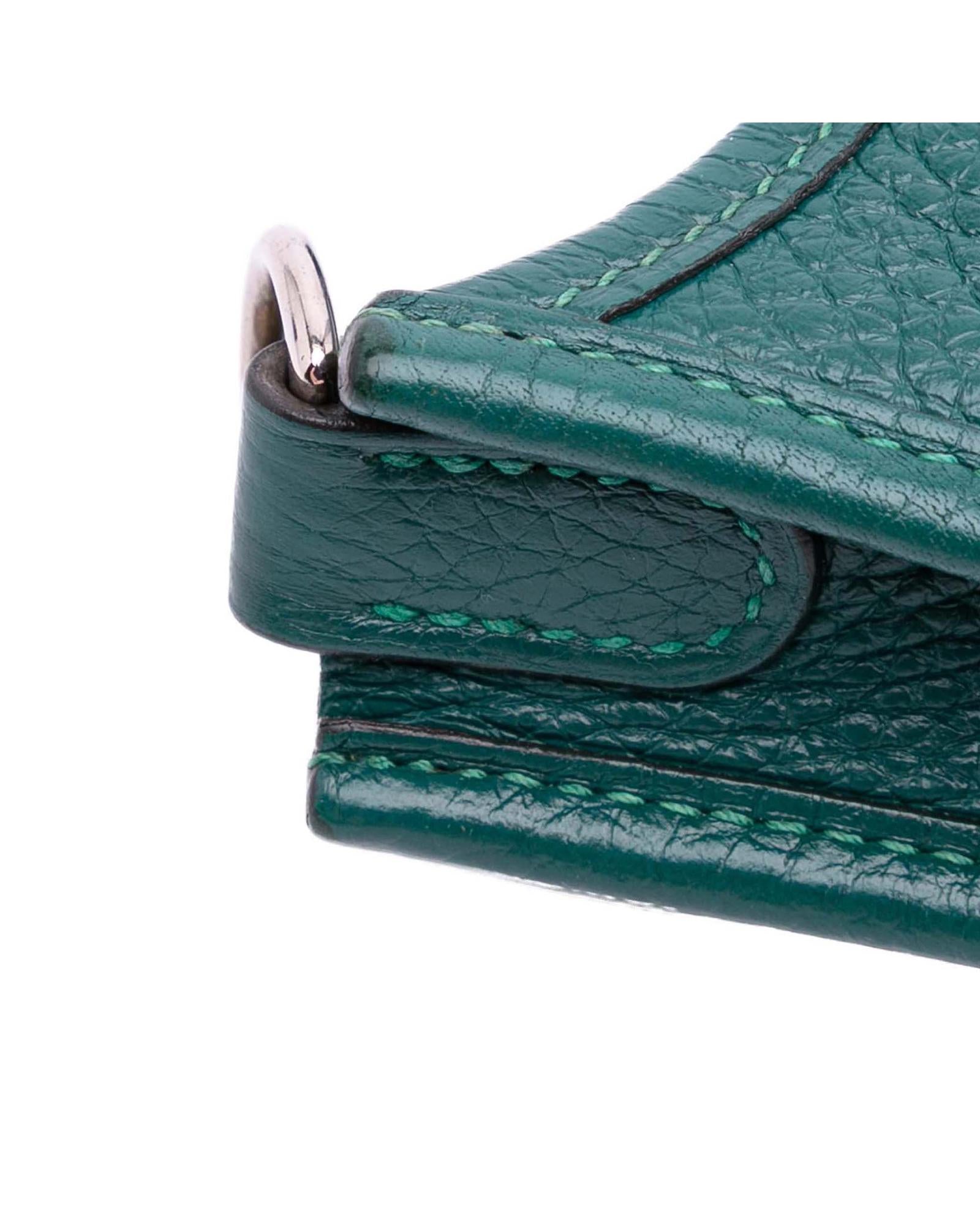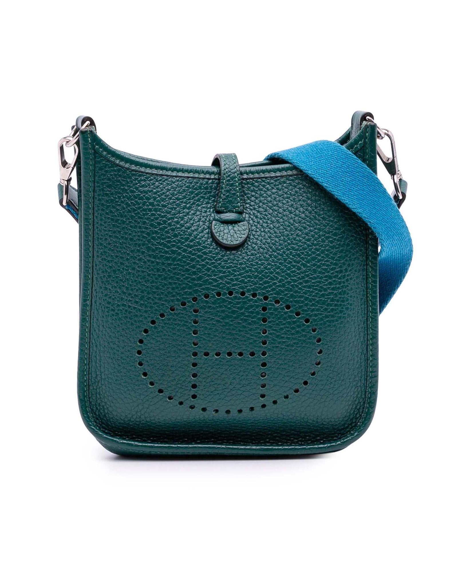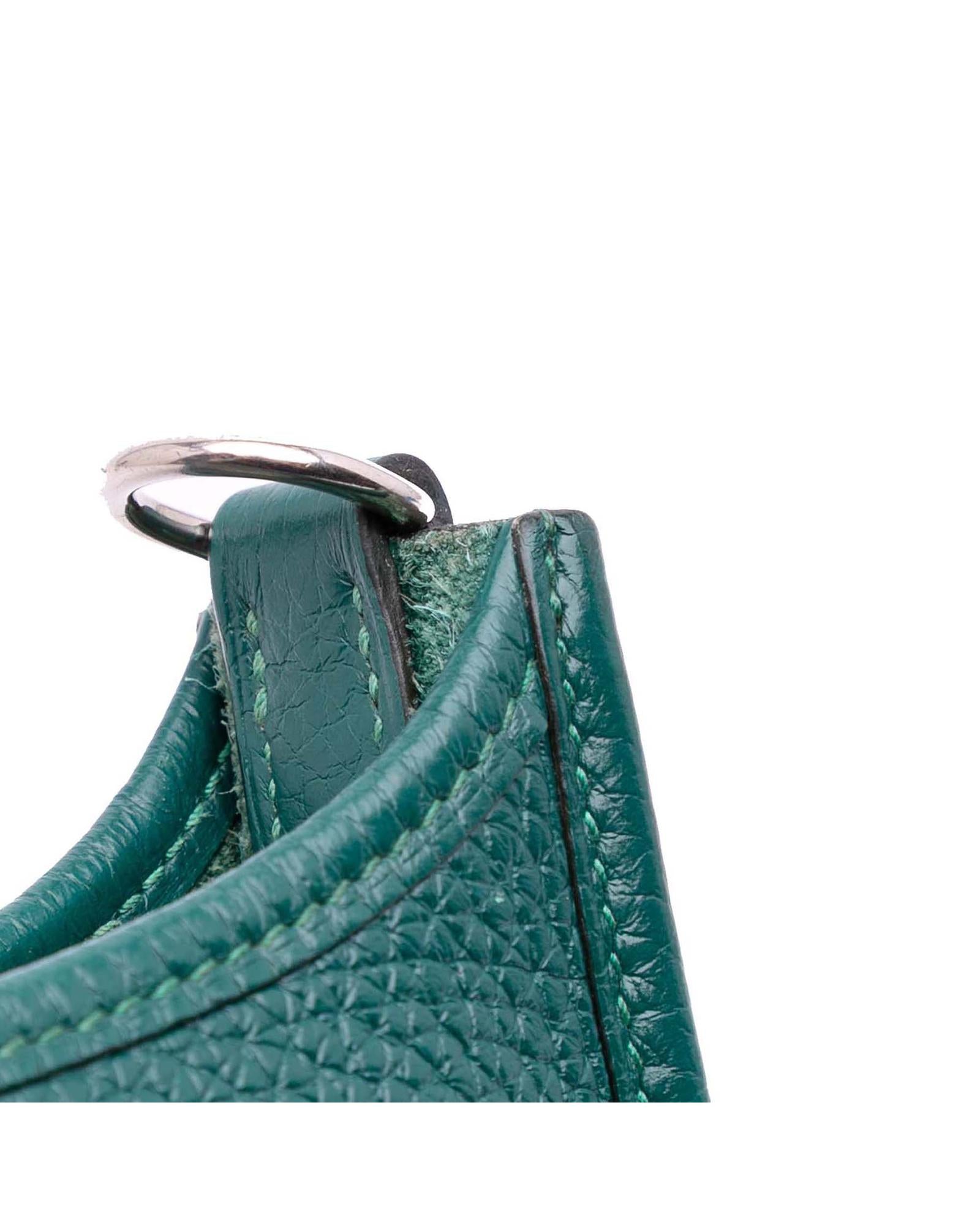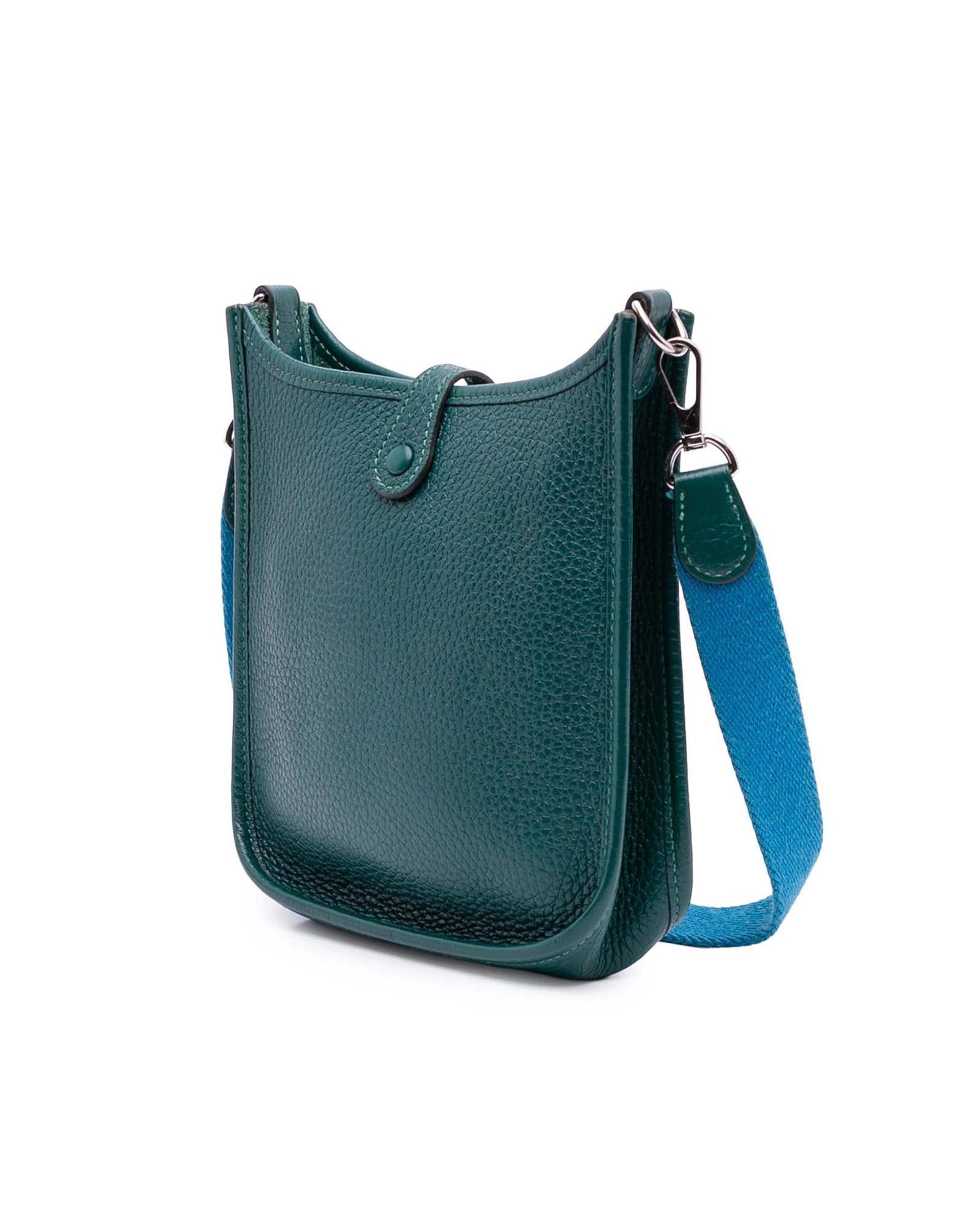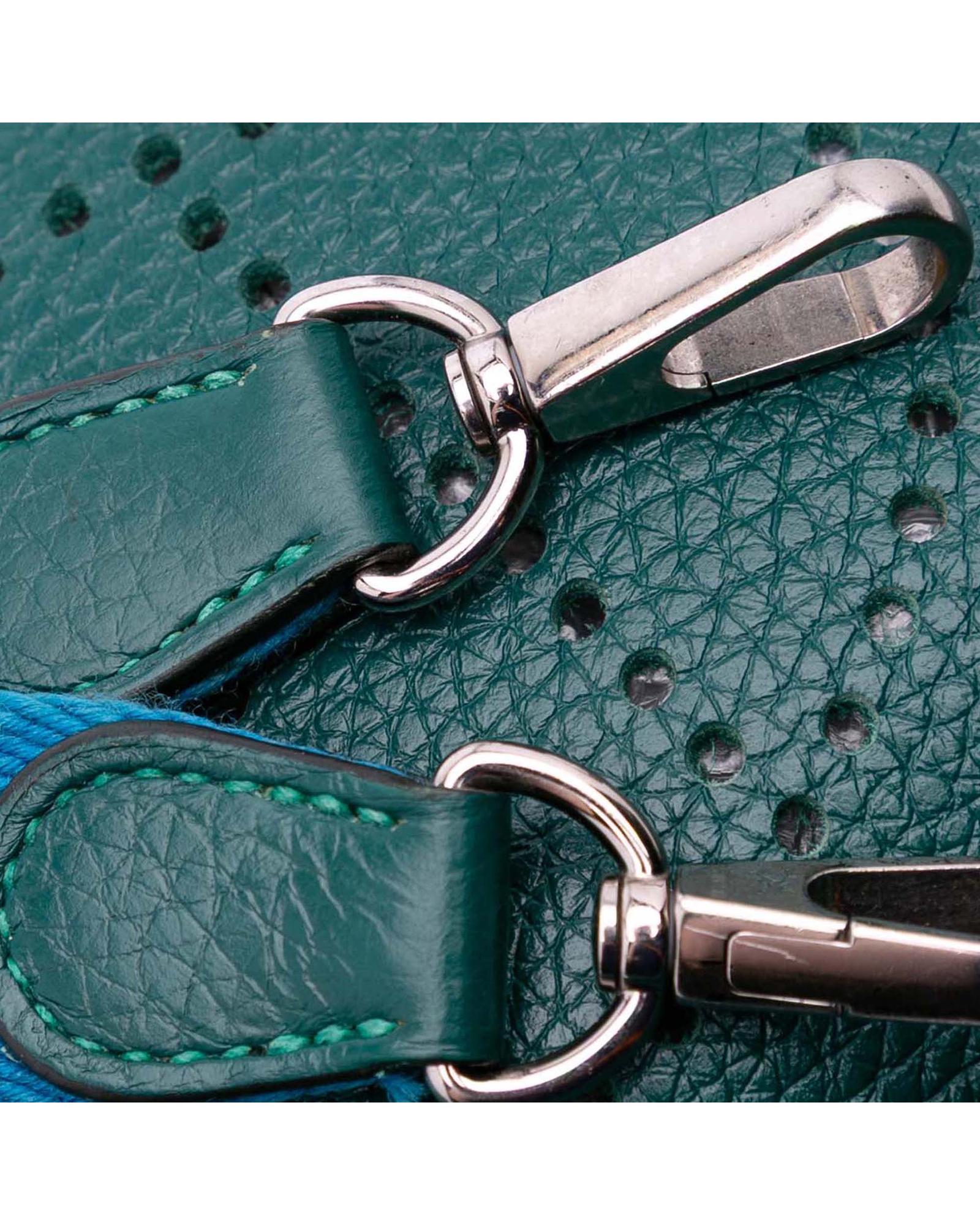 This Evelyne TPM features a Clemence leather body in Malachite color a detachable flat canvas strap in Blue Izmir color and an open top with a strap closure.Brand: Hermes Vintage