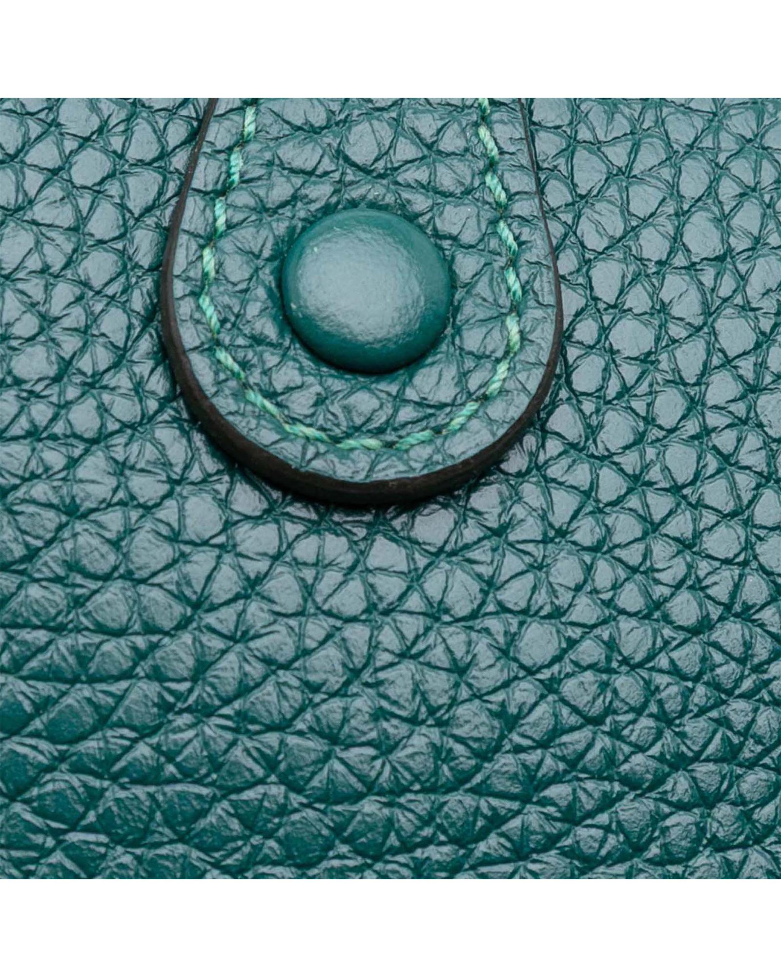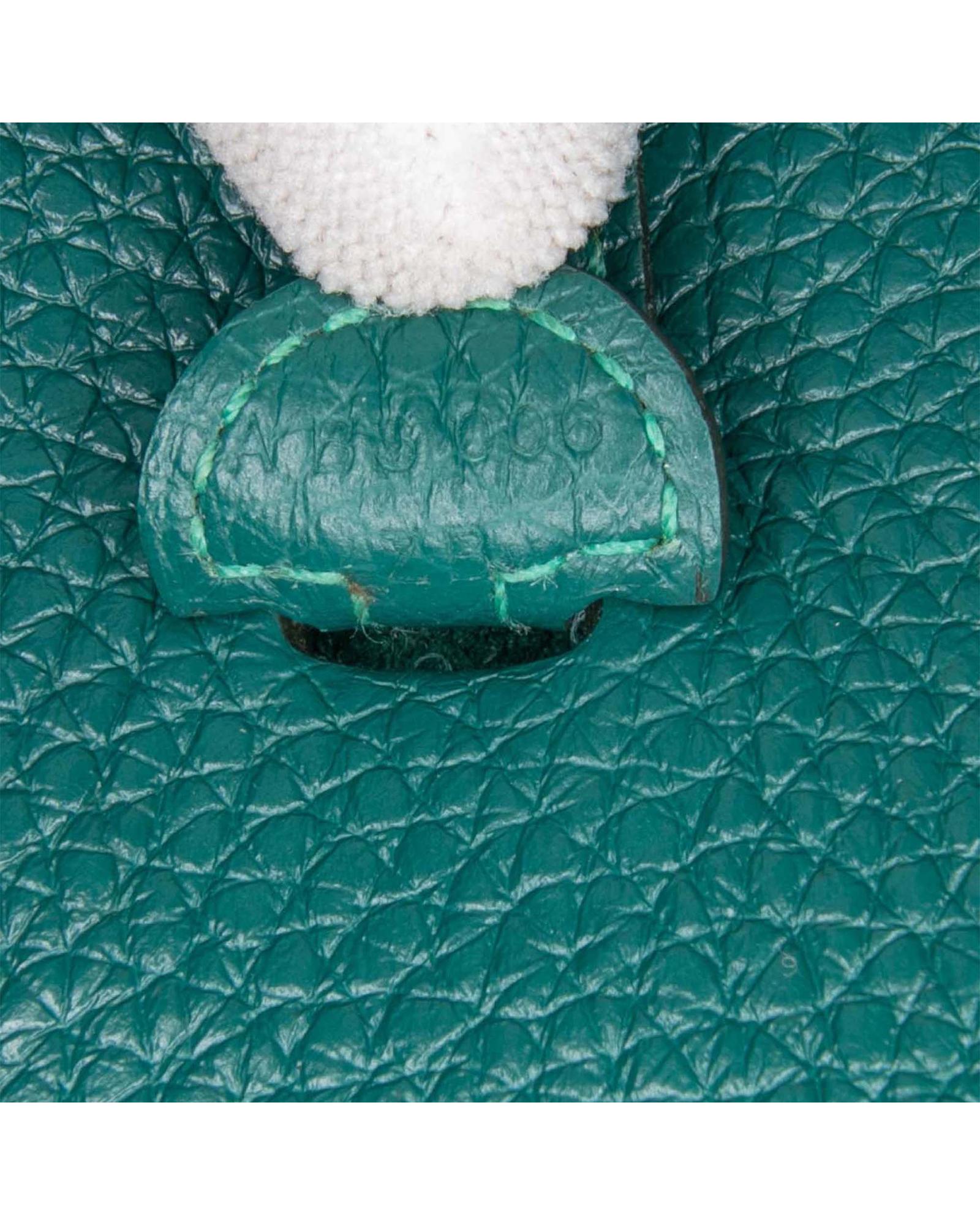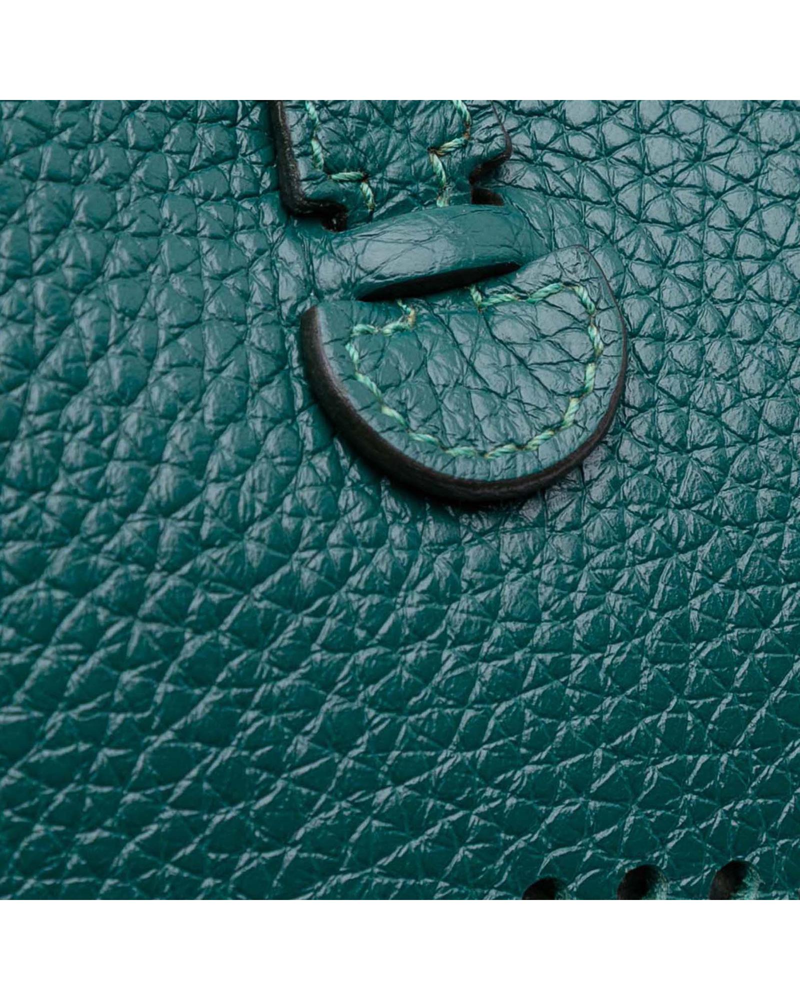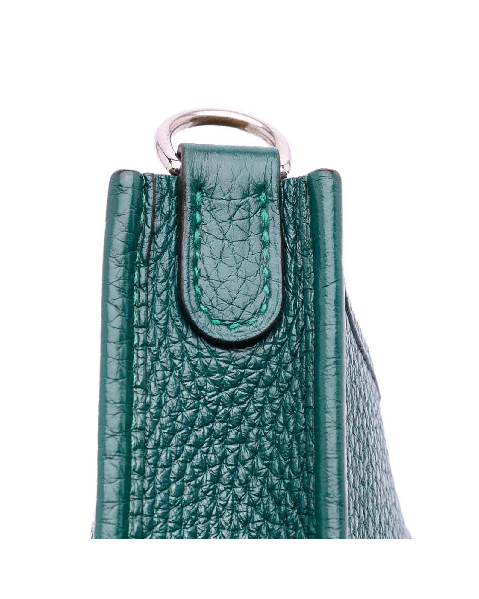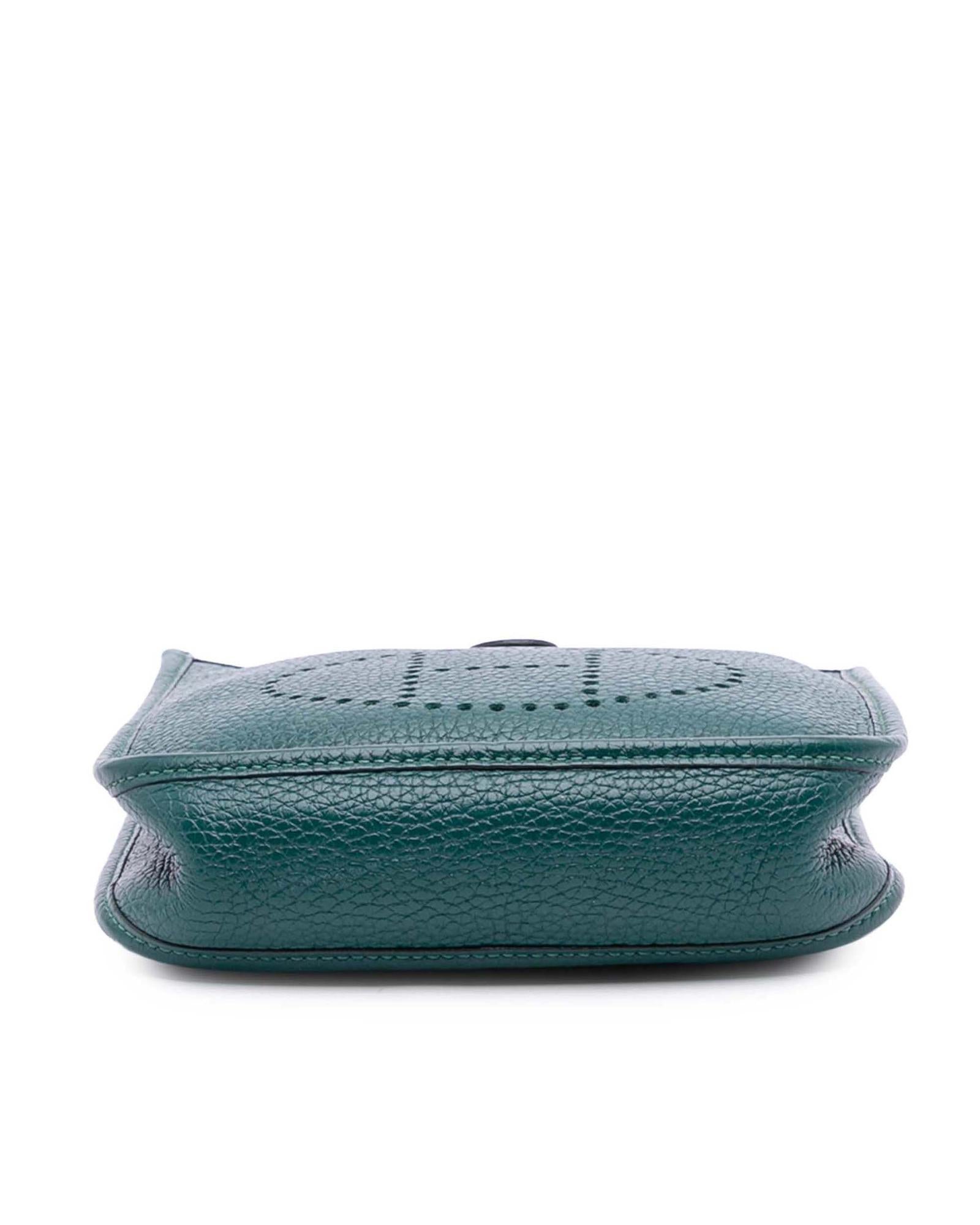 This Evelyne TPM features a Clemence leather body in Malachite color a detachable flat canvas strap in Blue Izmir color and an open top with a strap closure.Brand: Hermes Vintage