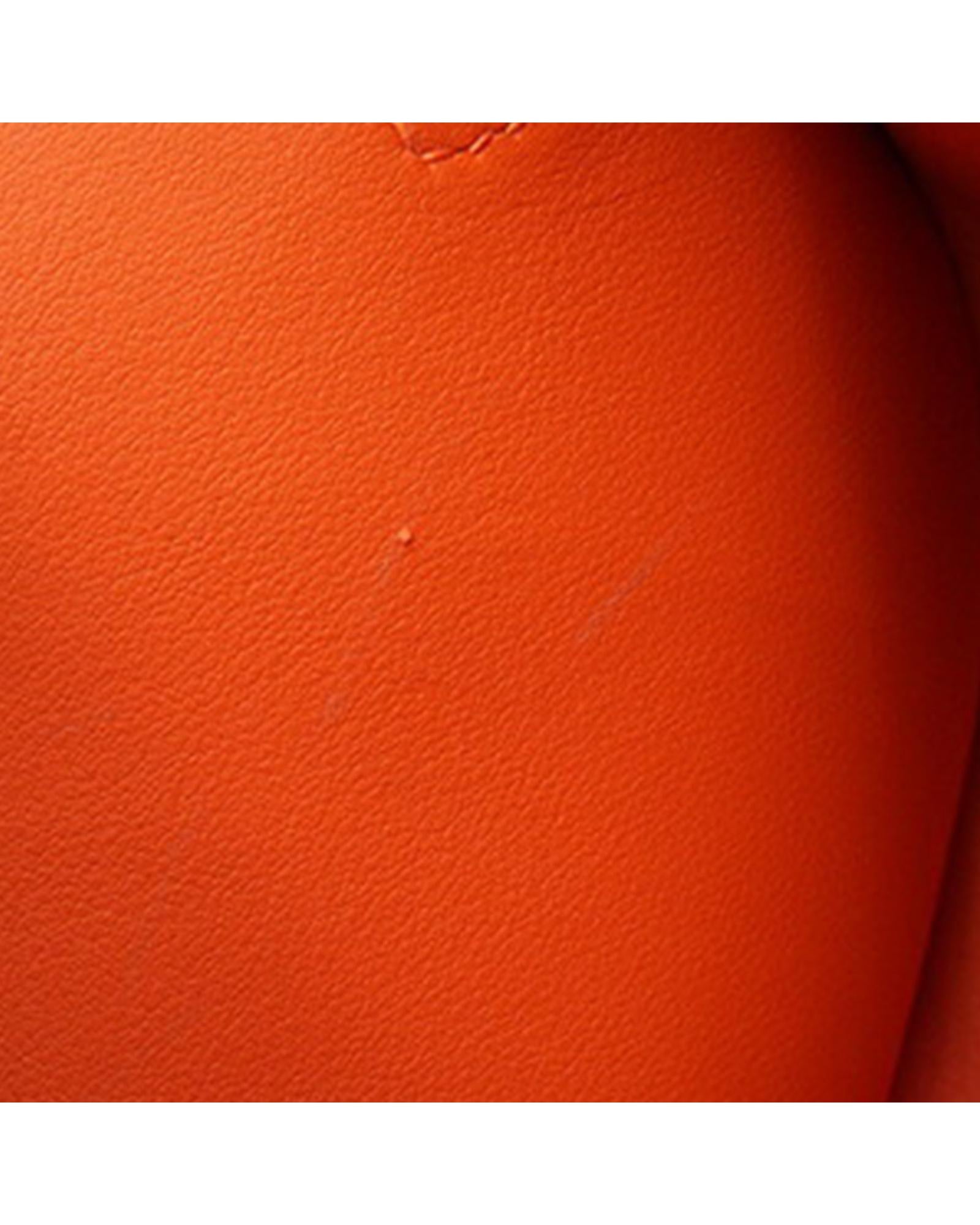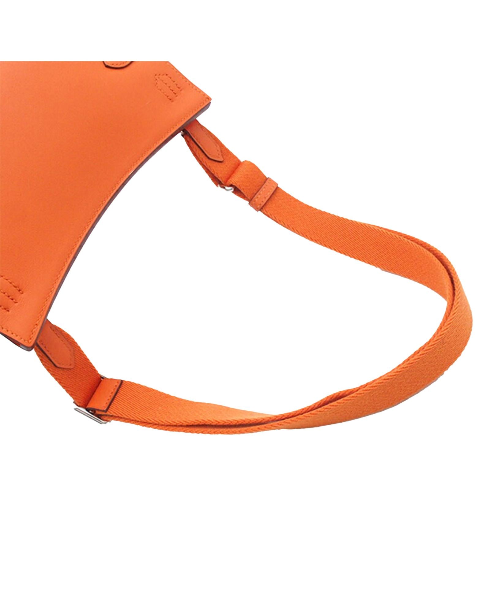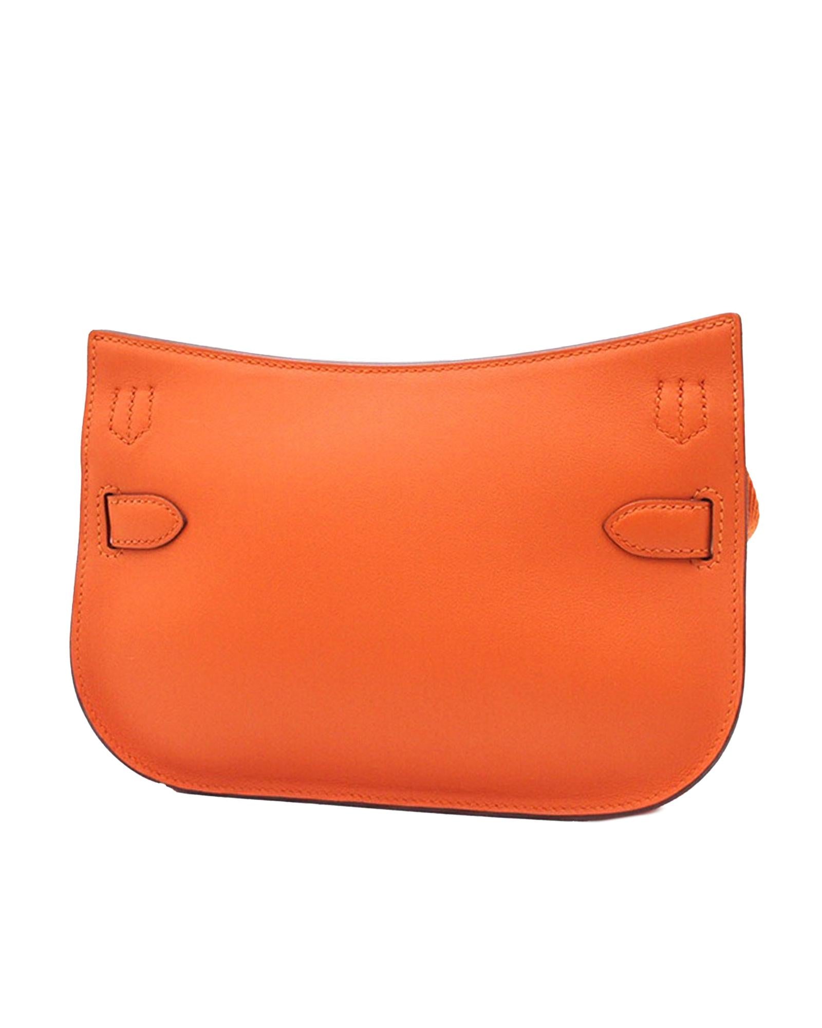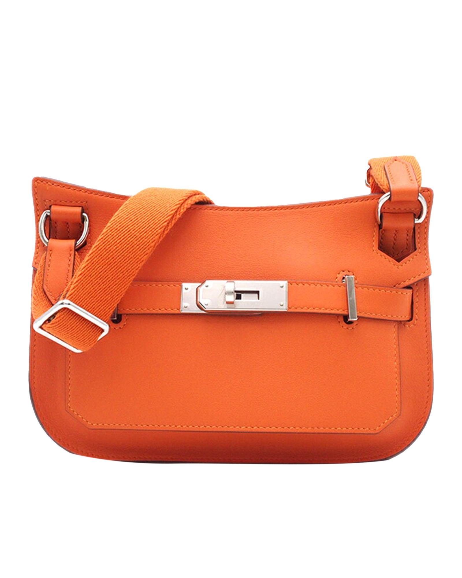 The Mini Jypsiere features a Swift leather body in Orange color a detachable flat leather strap a front flap with belt and twist lock closure and interior zip and slip pockets.Brand: Hermes Vintage