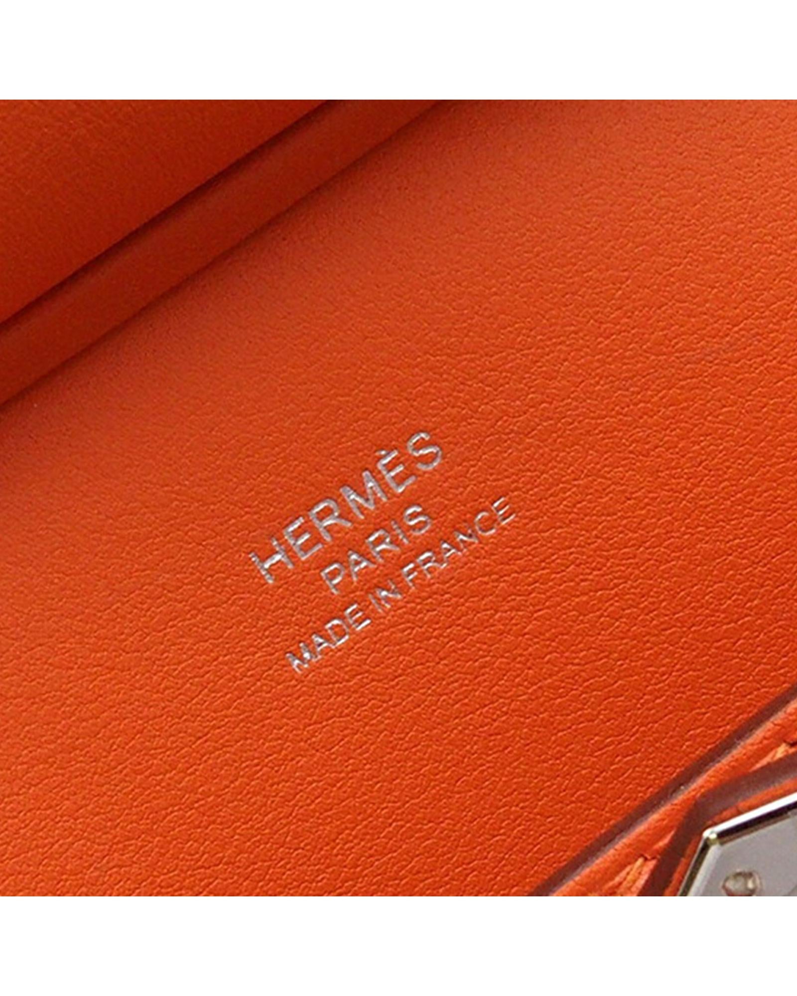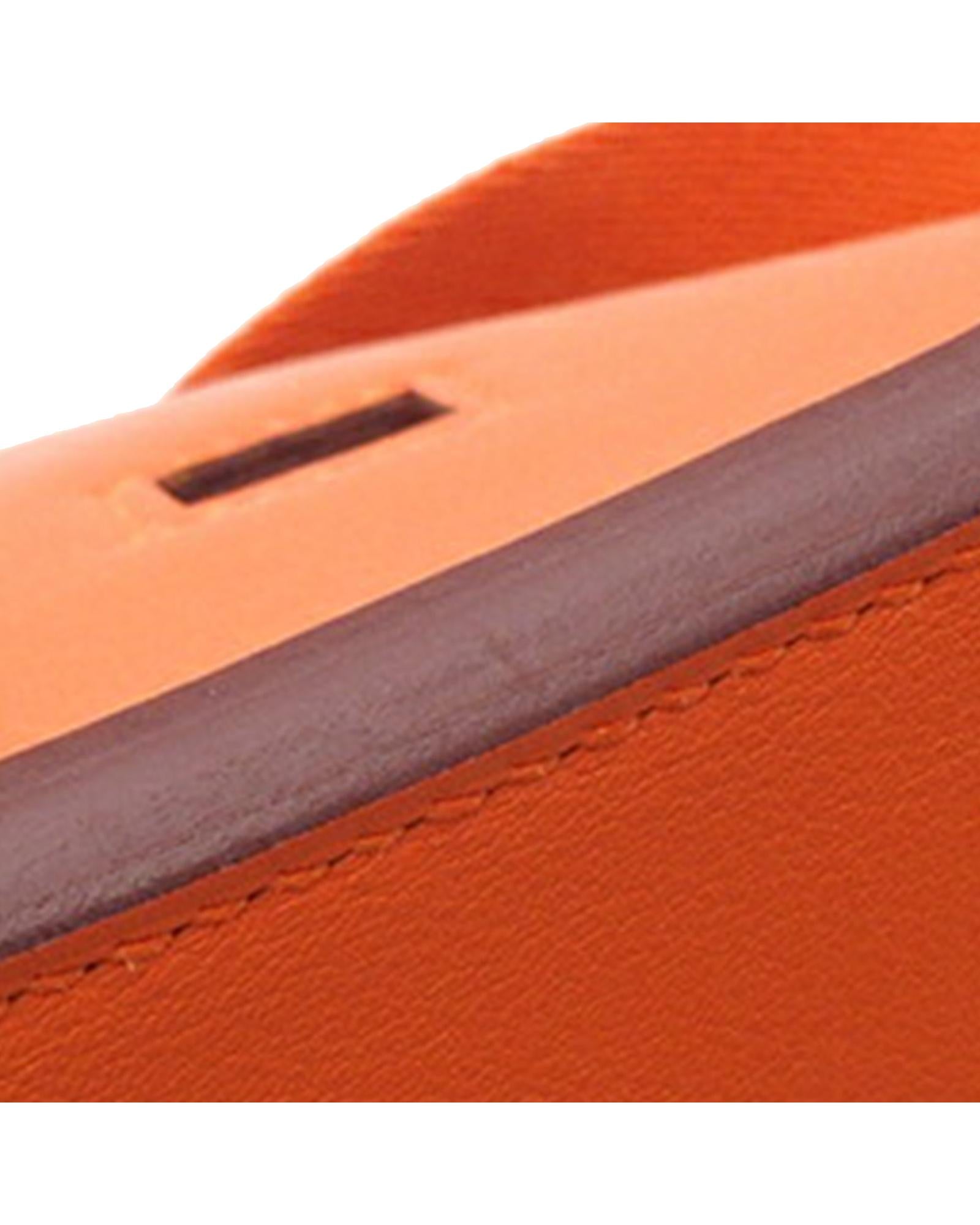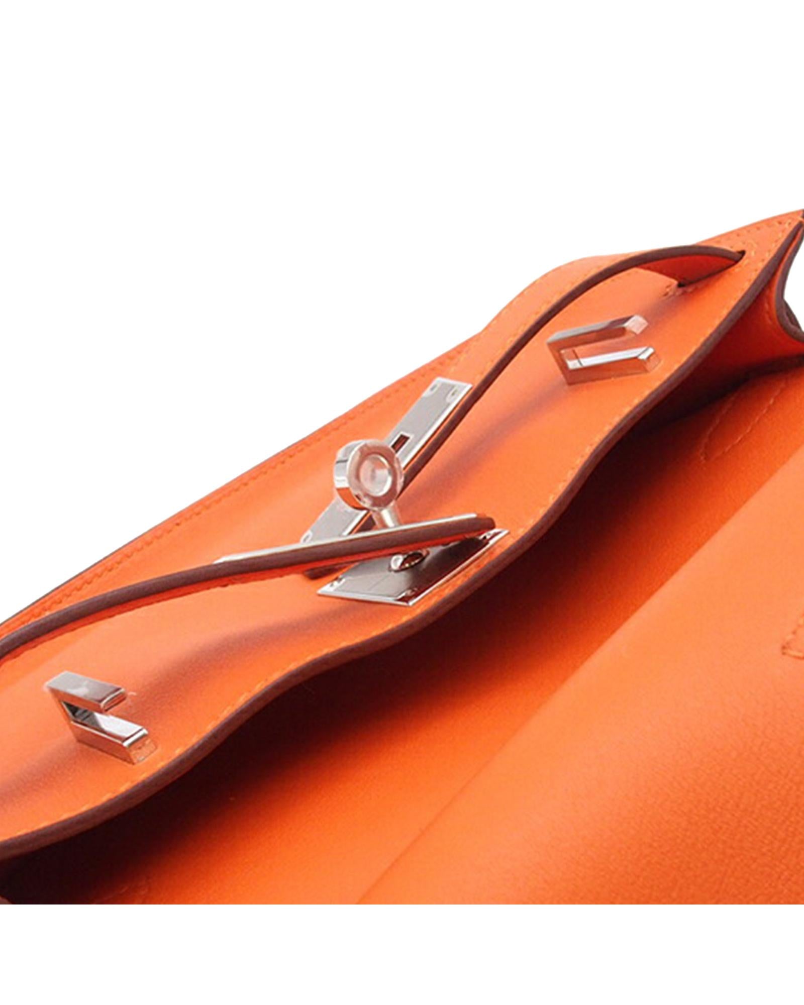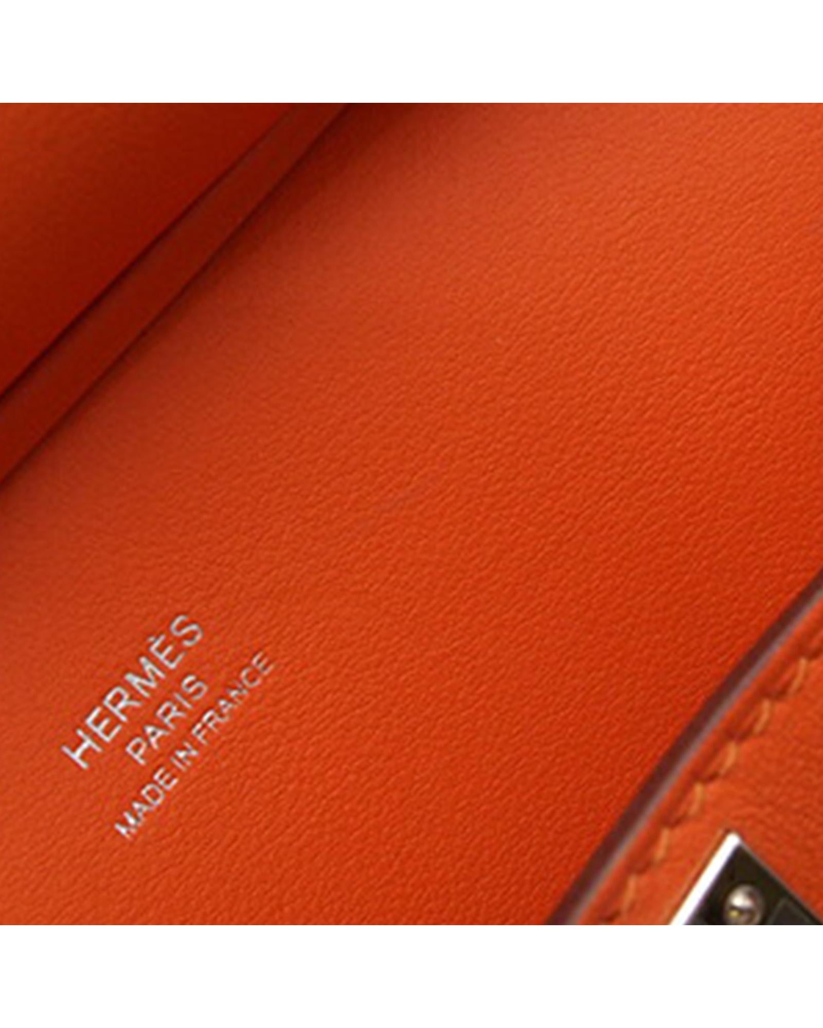 The Mini Jypsiere features a Swift leather body in Orange color a detachable flat leather strap a front flap with belt and twist lock closure and interior zip and slip pockets.Brand: Hermes Vintage